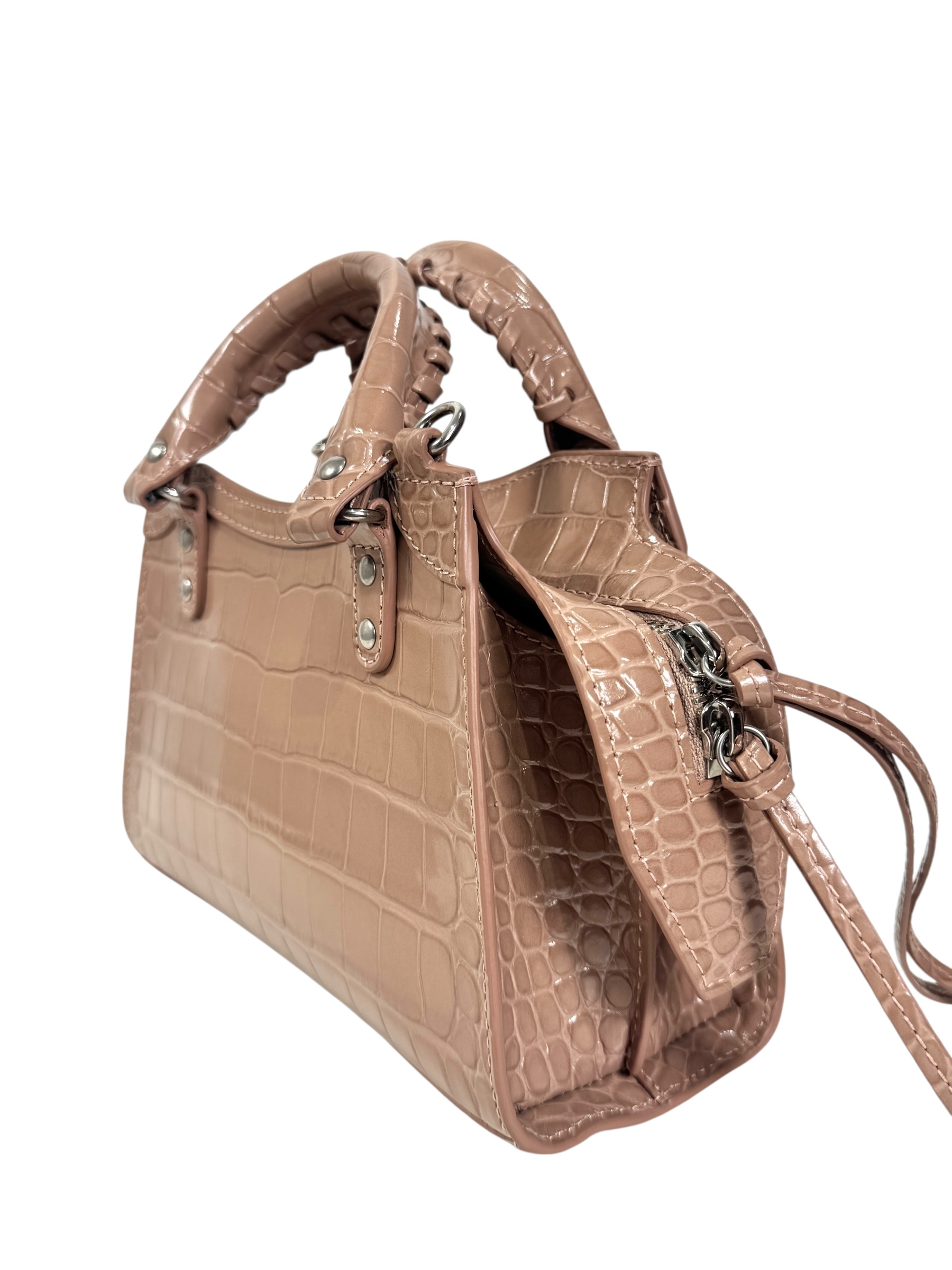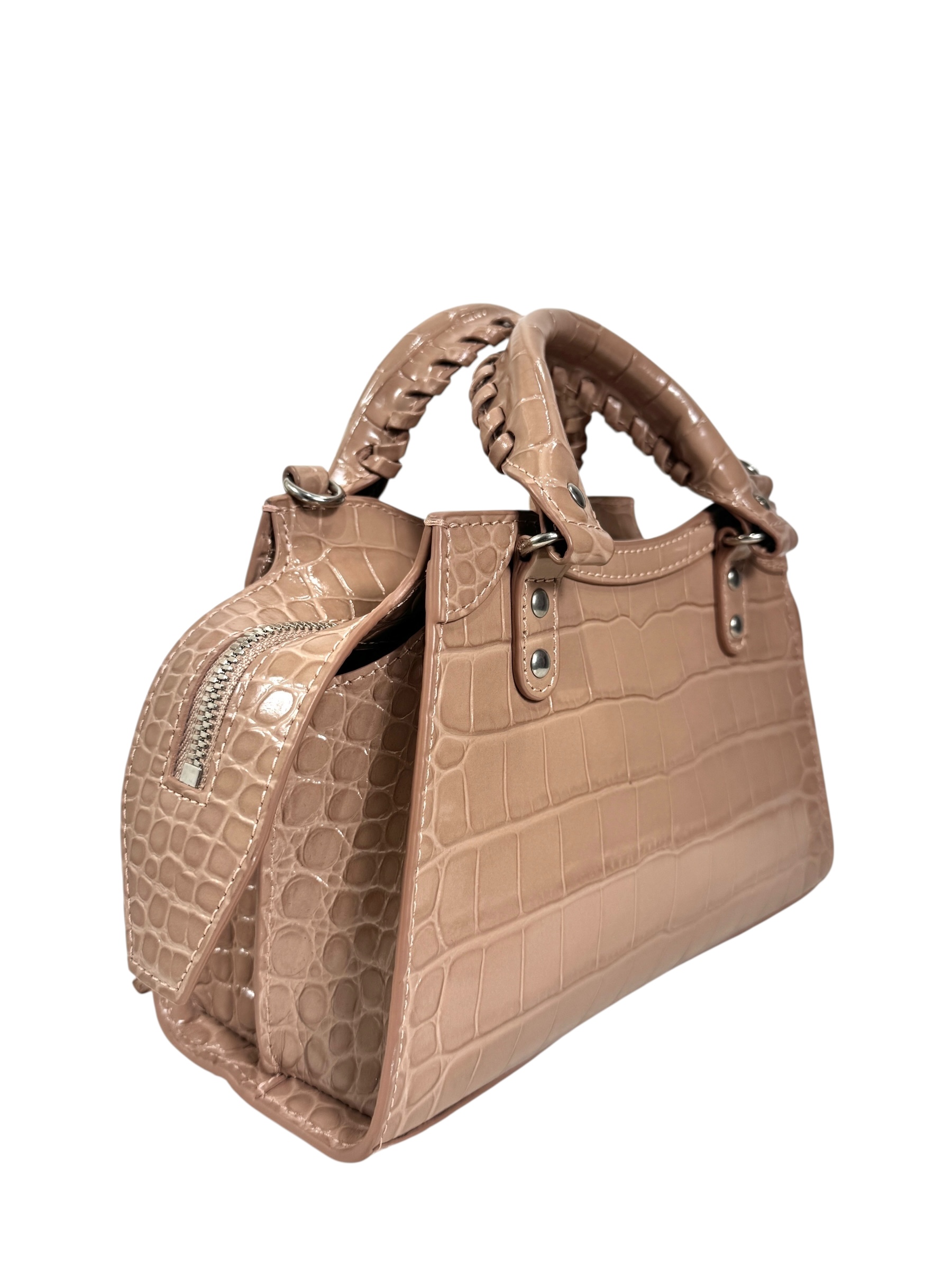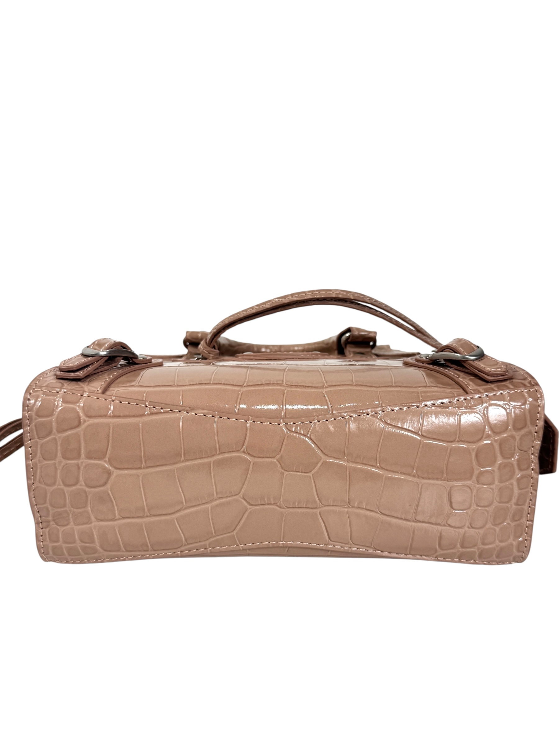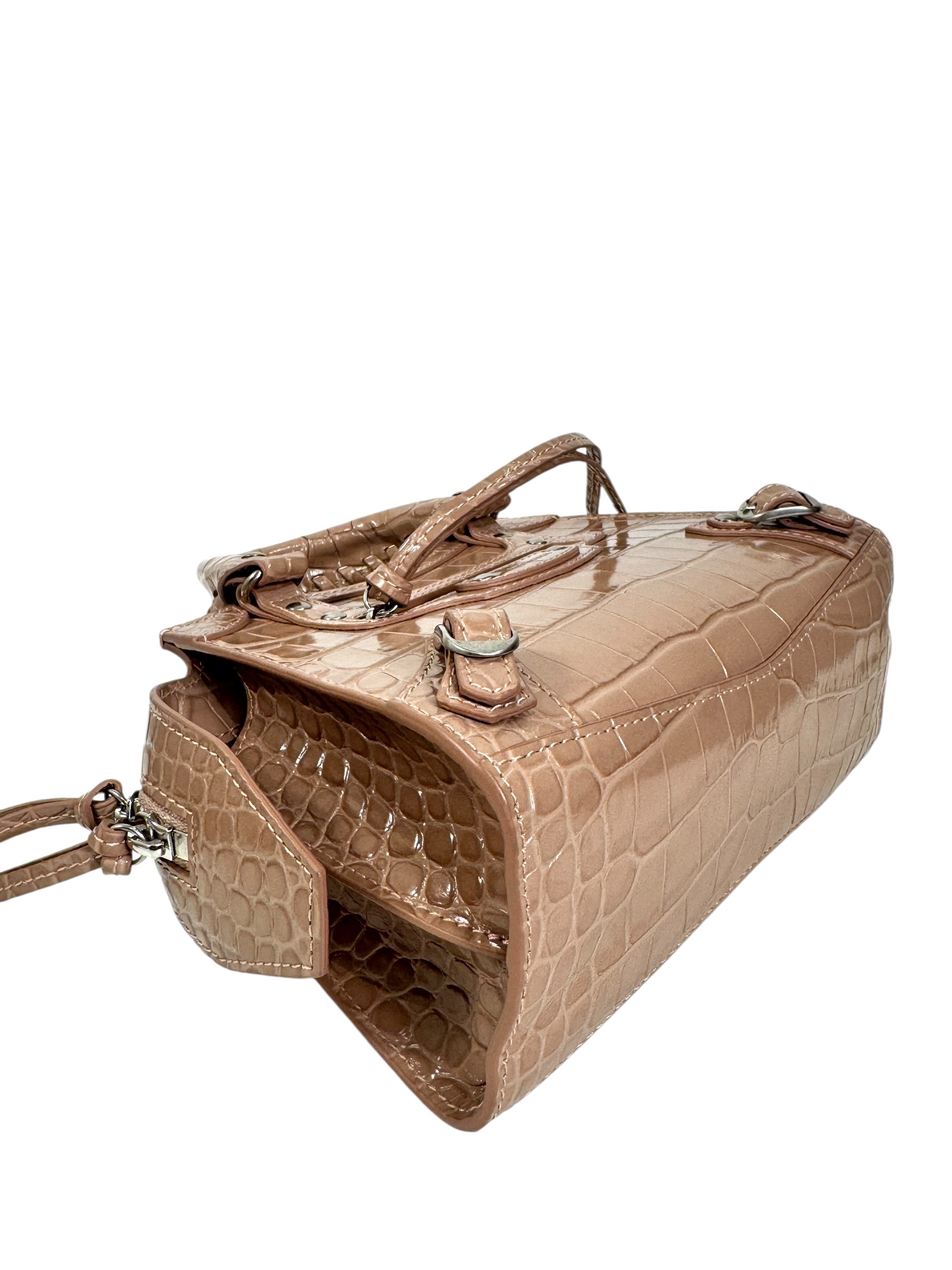 Sac « City Mini » en veau embossé façon crocodile nude, fermeture éclair à double curseur, double poignée lacée, anse bandoulière amovible réglable. Provenance des ventes du personnel.