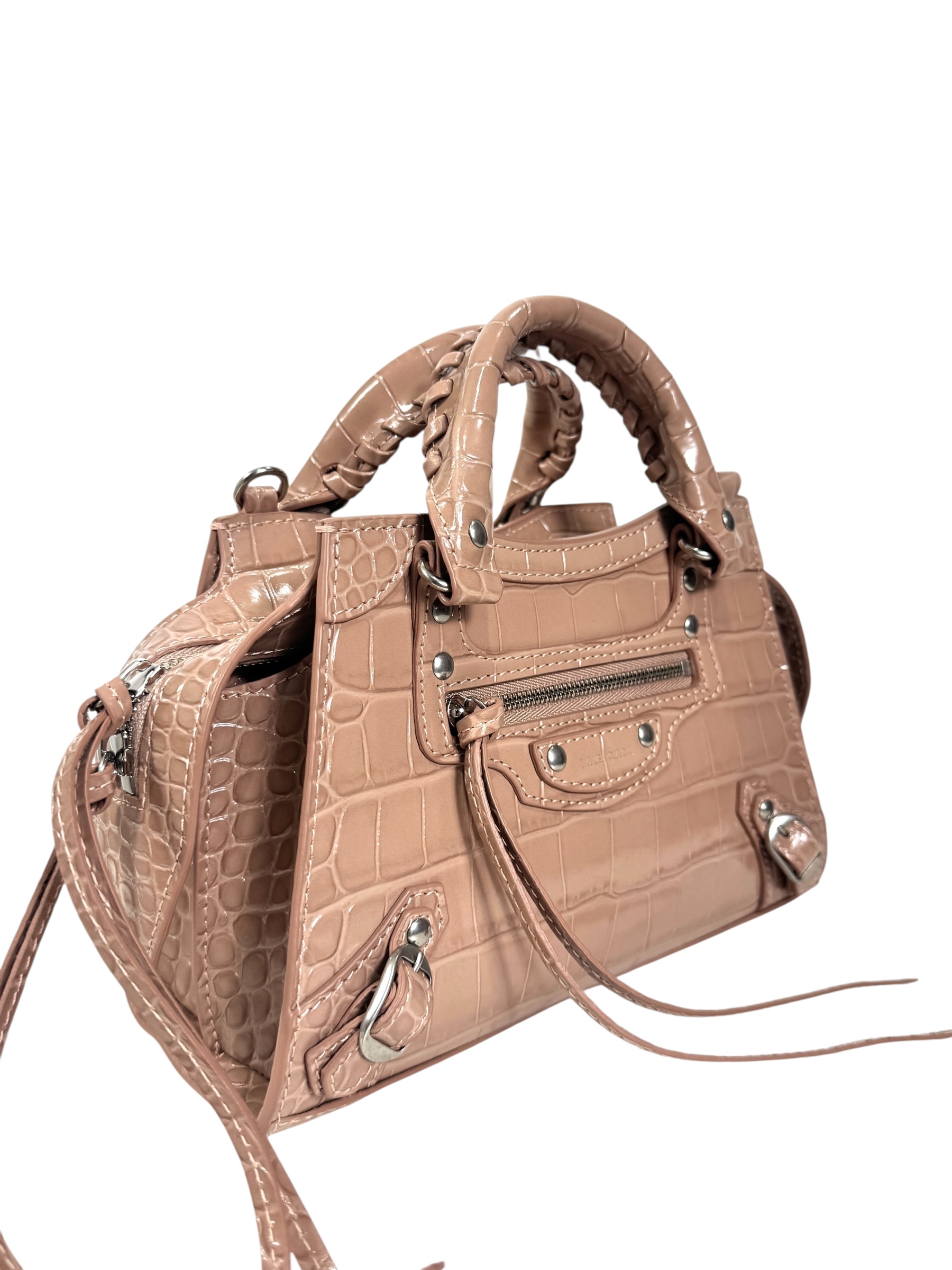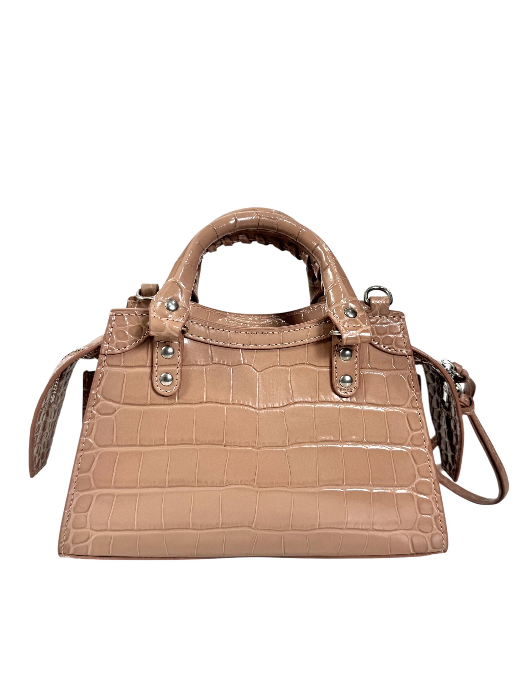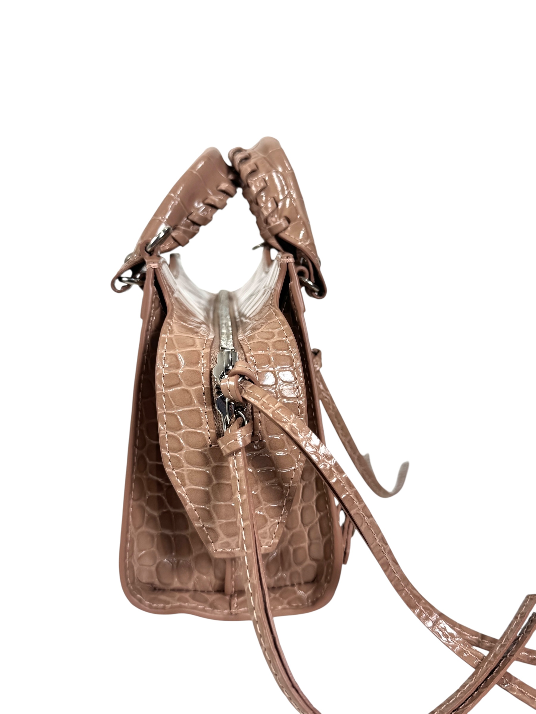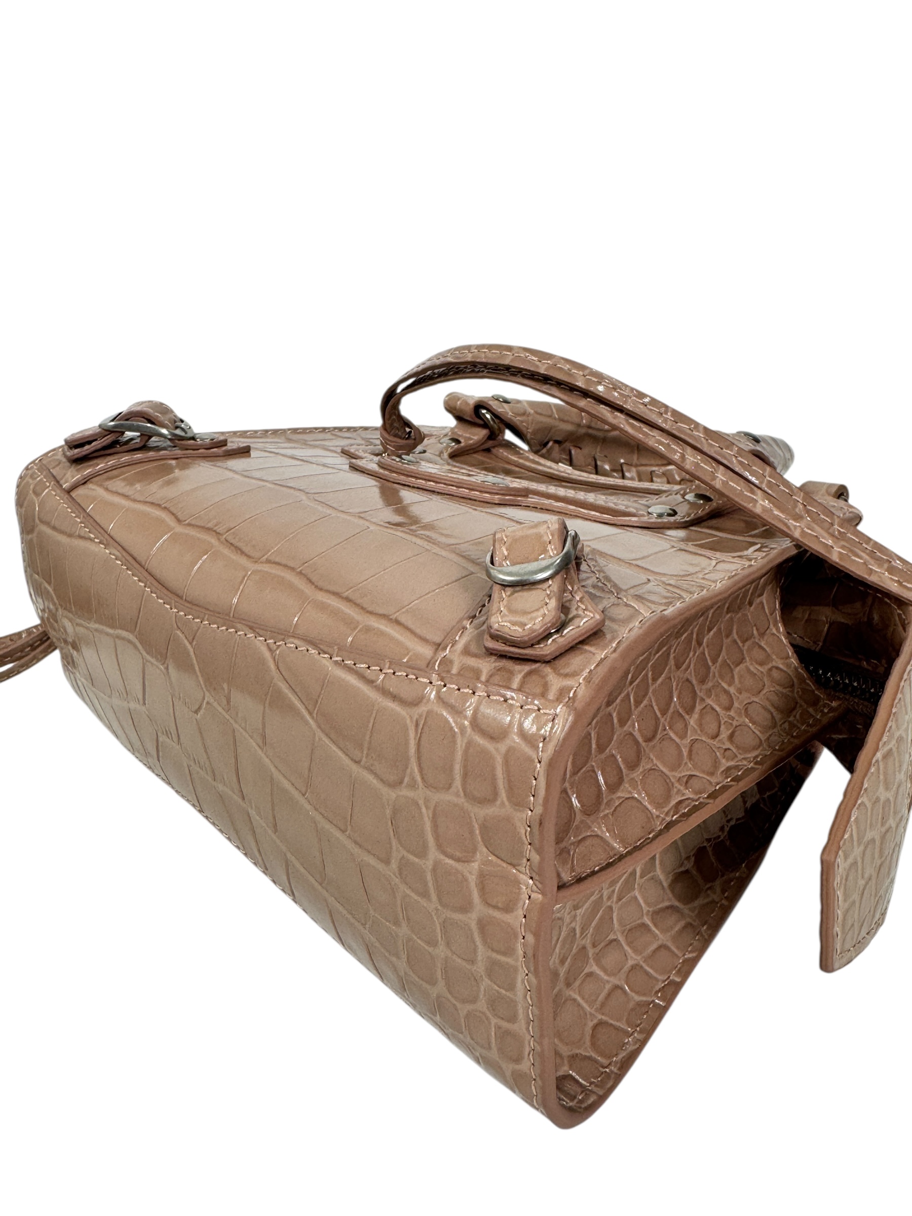 Sac « City Mini » en veau embossé façon crocodile nude, fermeture éclair à double curseur, double poignée lacée, anse bandoulière amovible réglable. Provenance des ventes du personnel.