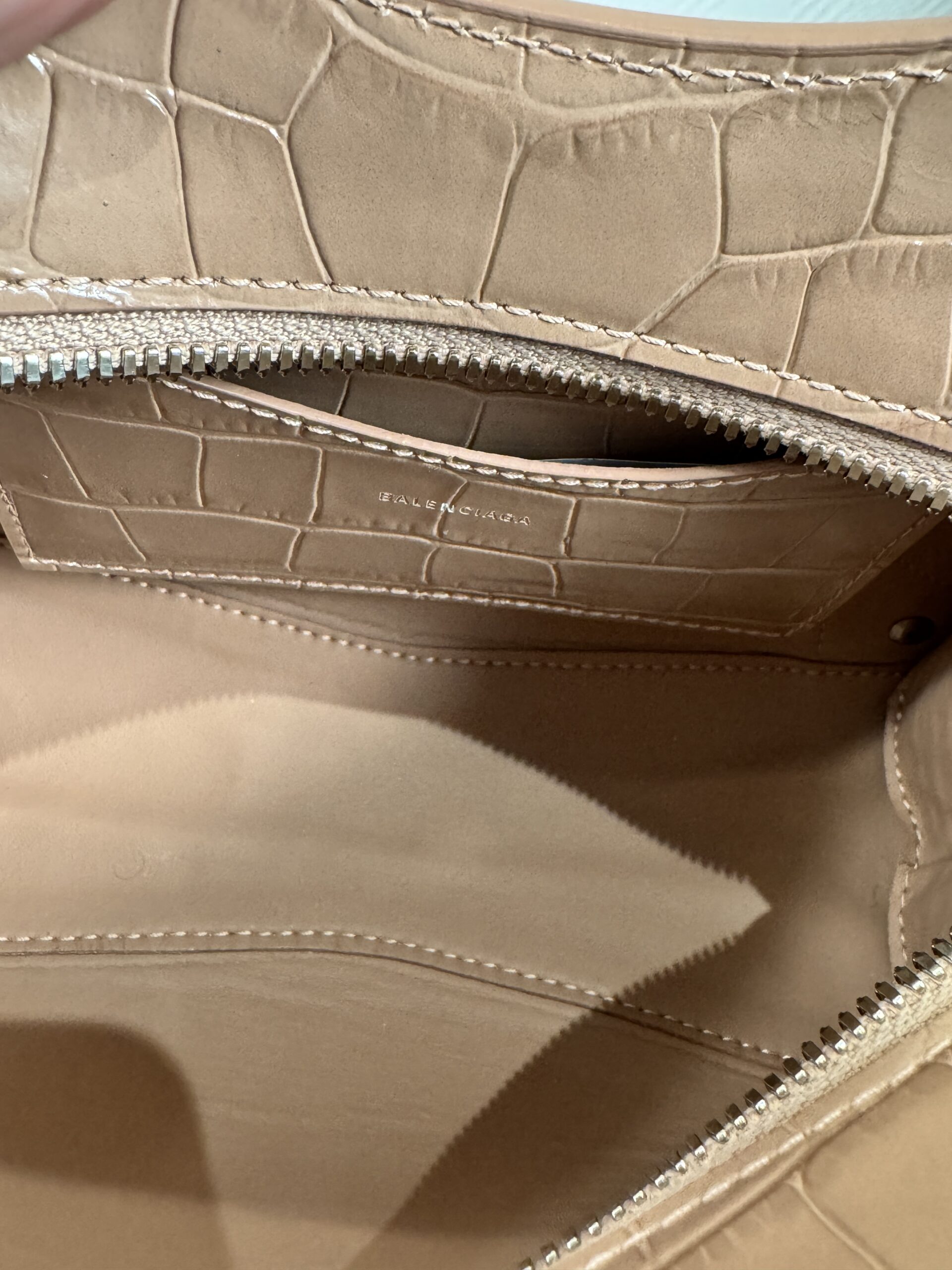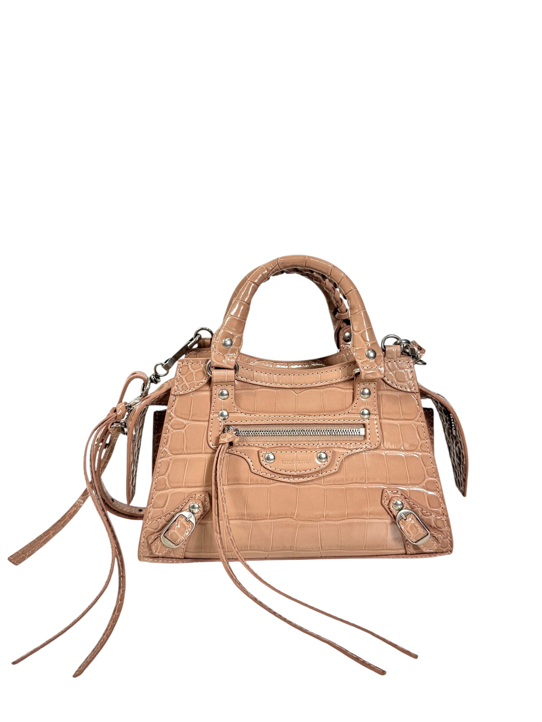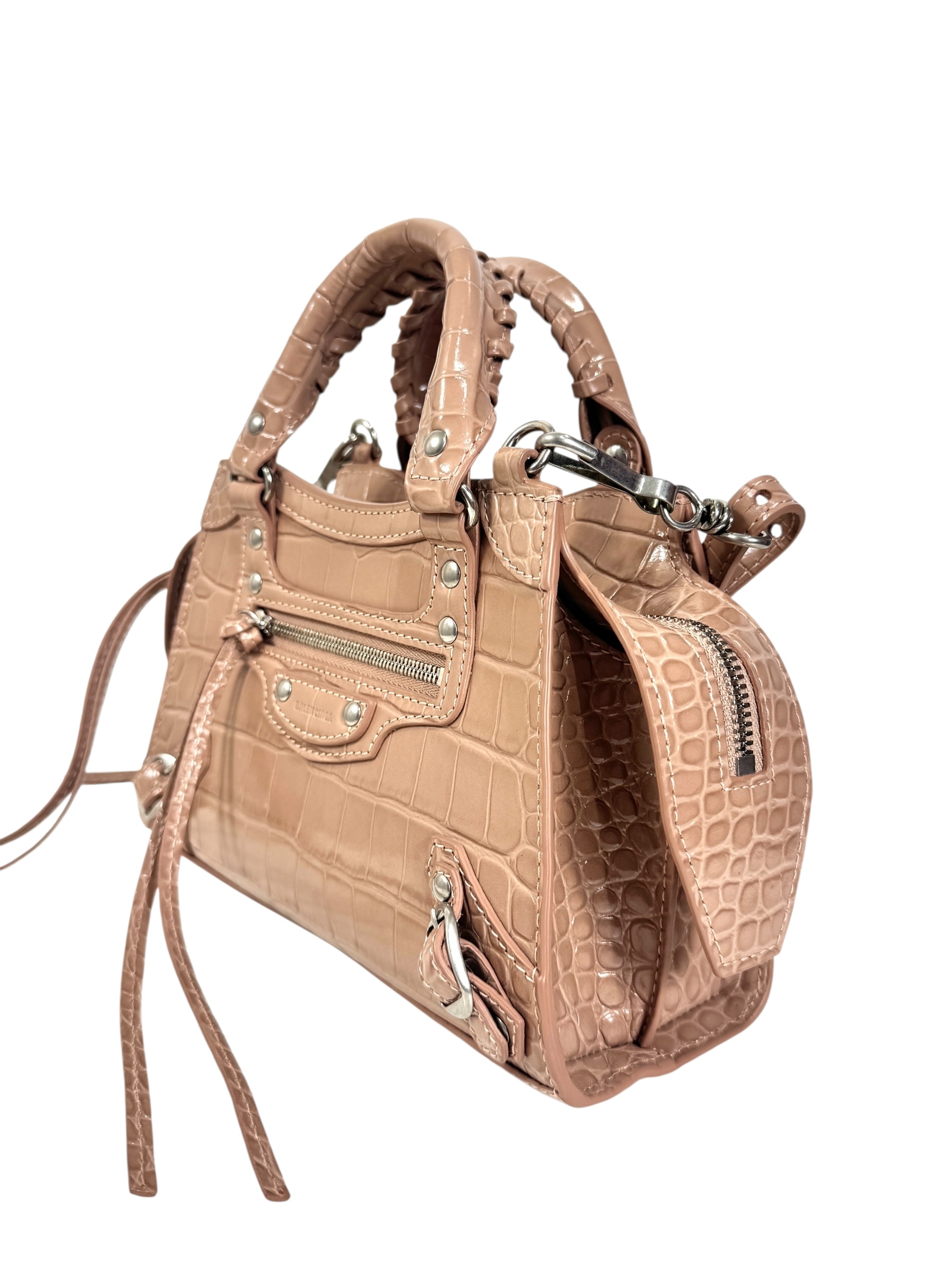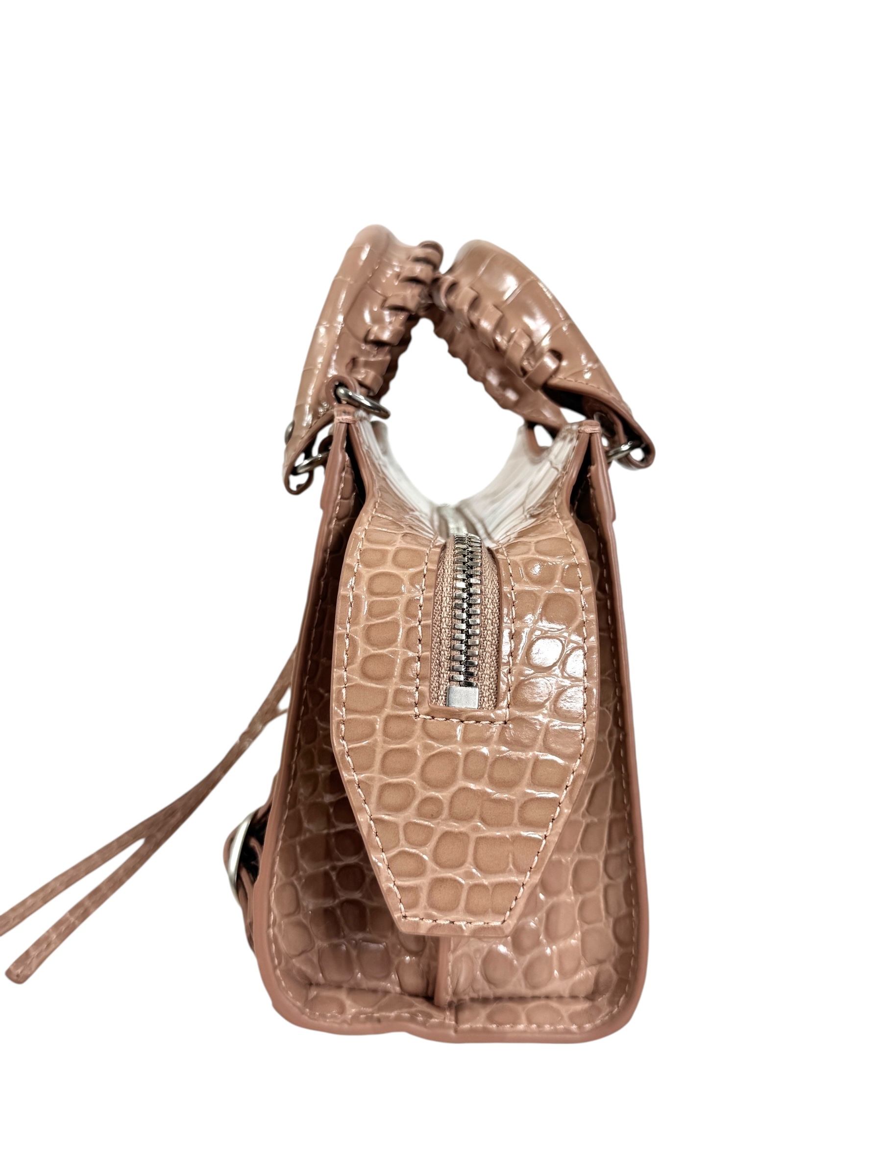 Sac « City Mini » en veau embossé façon crocodile nude, fermeture éclair à double curseur, double poignée lacée, anse bandoulière amovible réglable. Provenance des ventes du personnel.