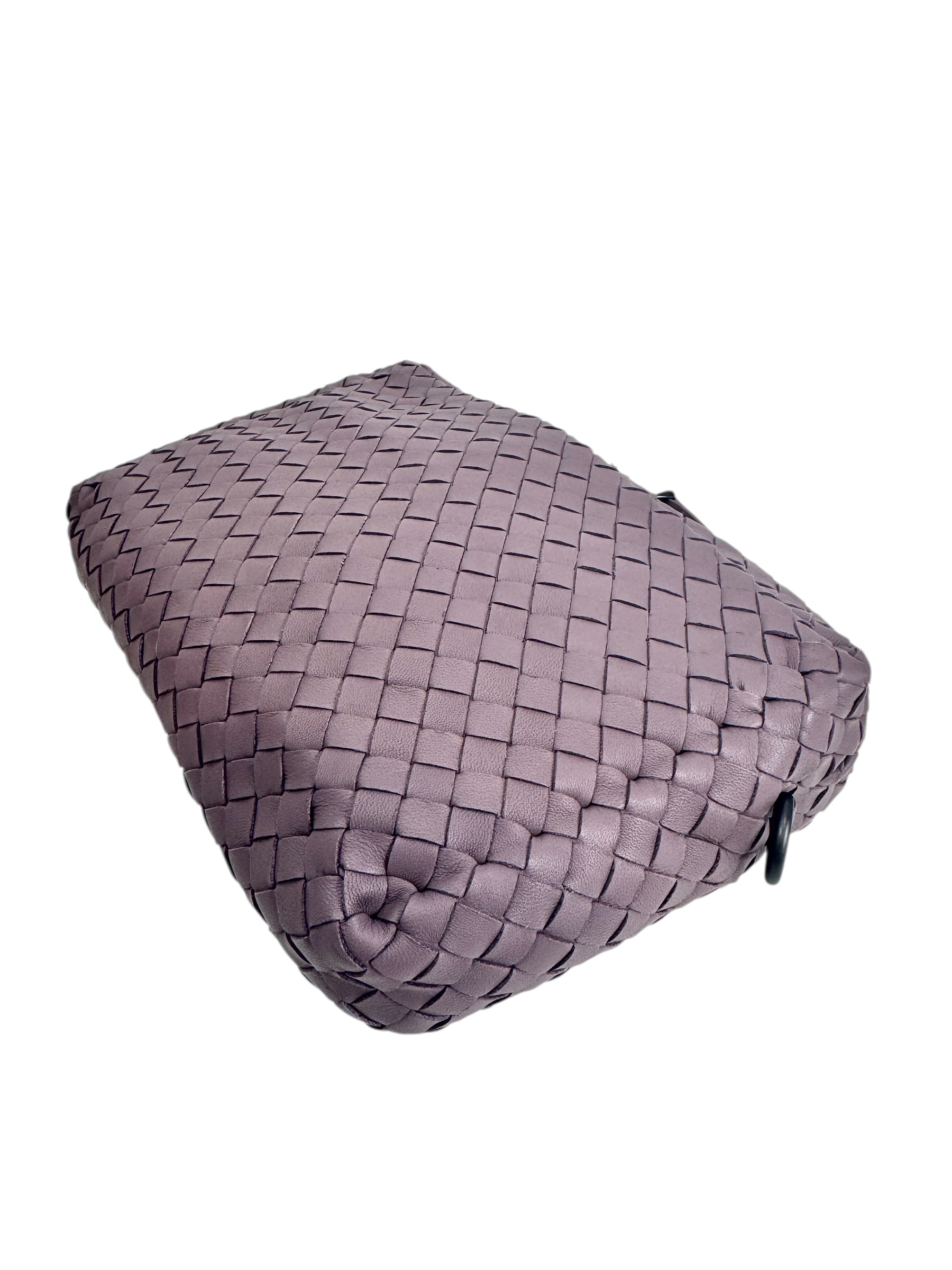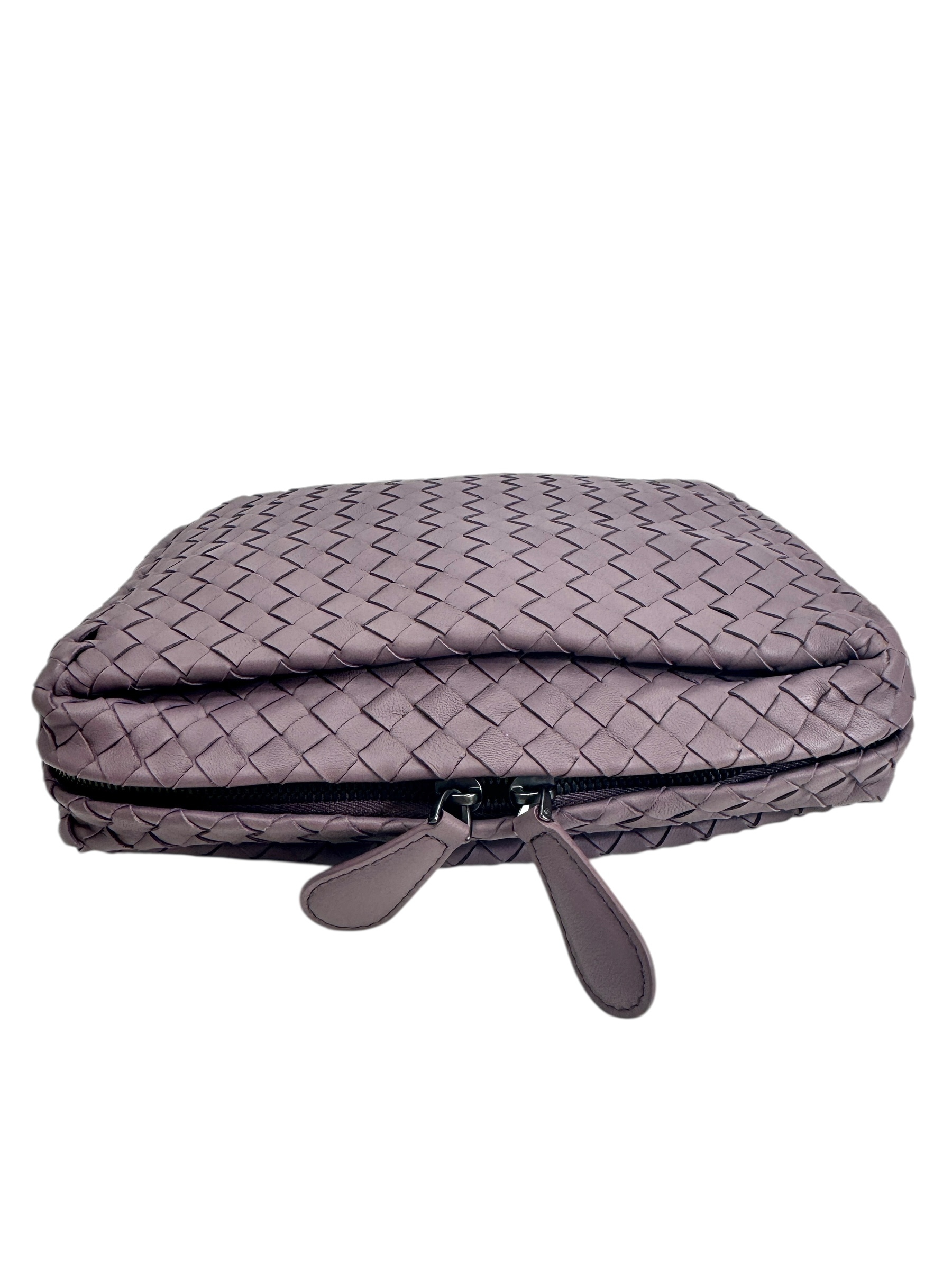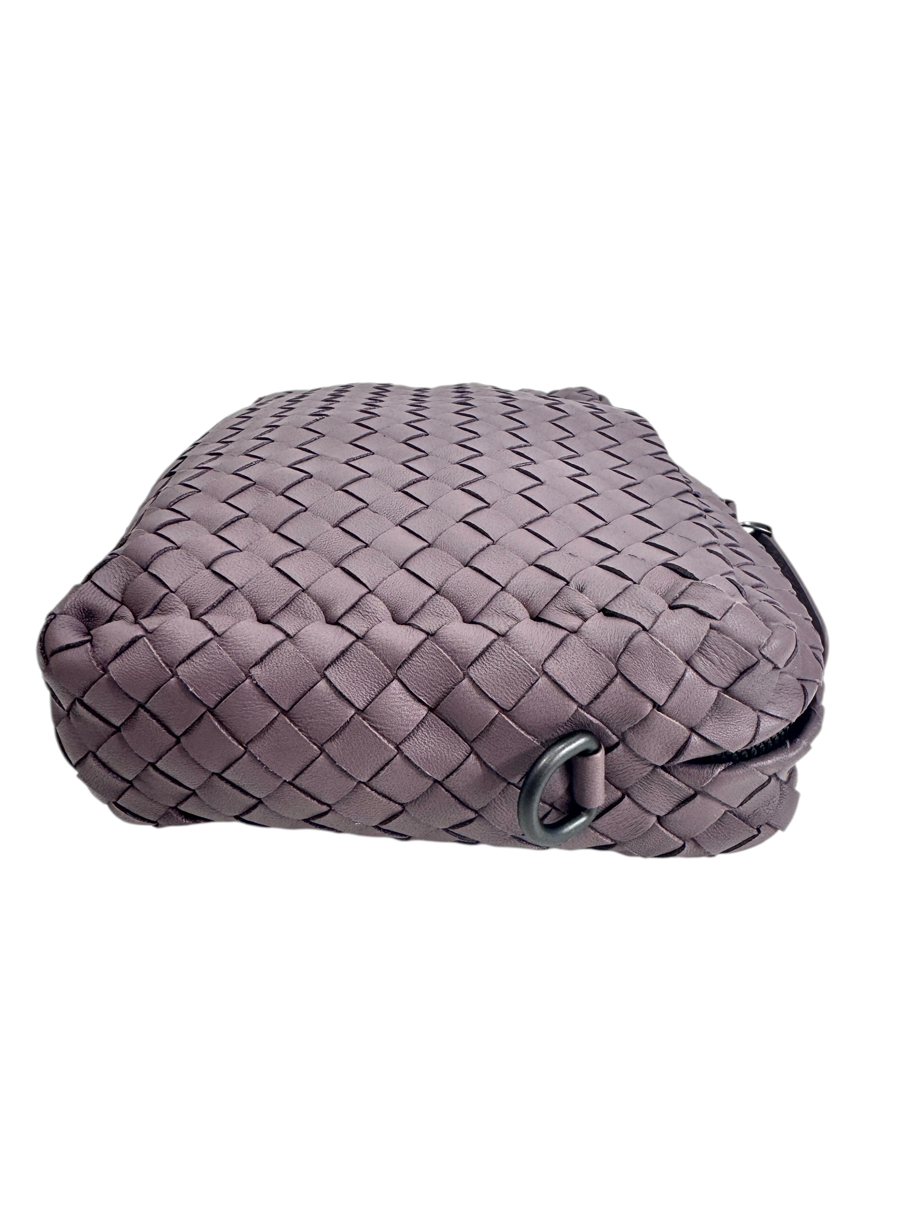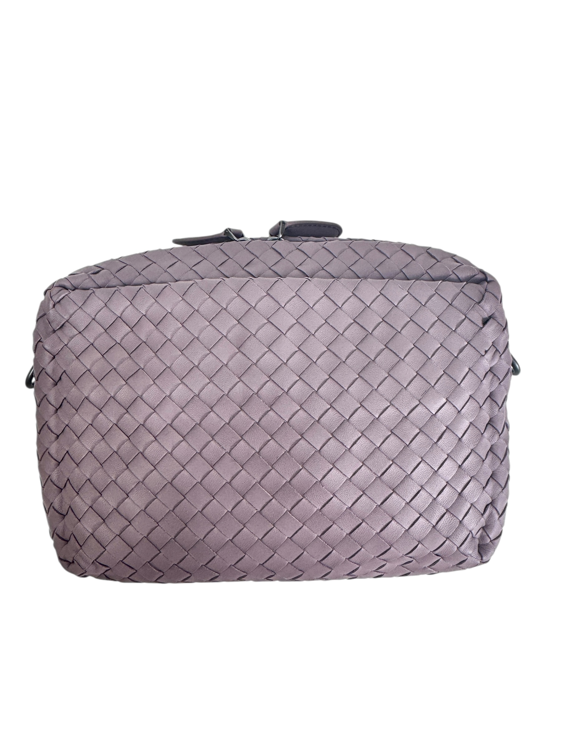 Sac en cuir agneau Intrecciato parme, fermeture éclair, poches extérieures, anse bandoulière amovible.