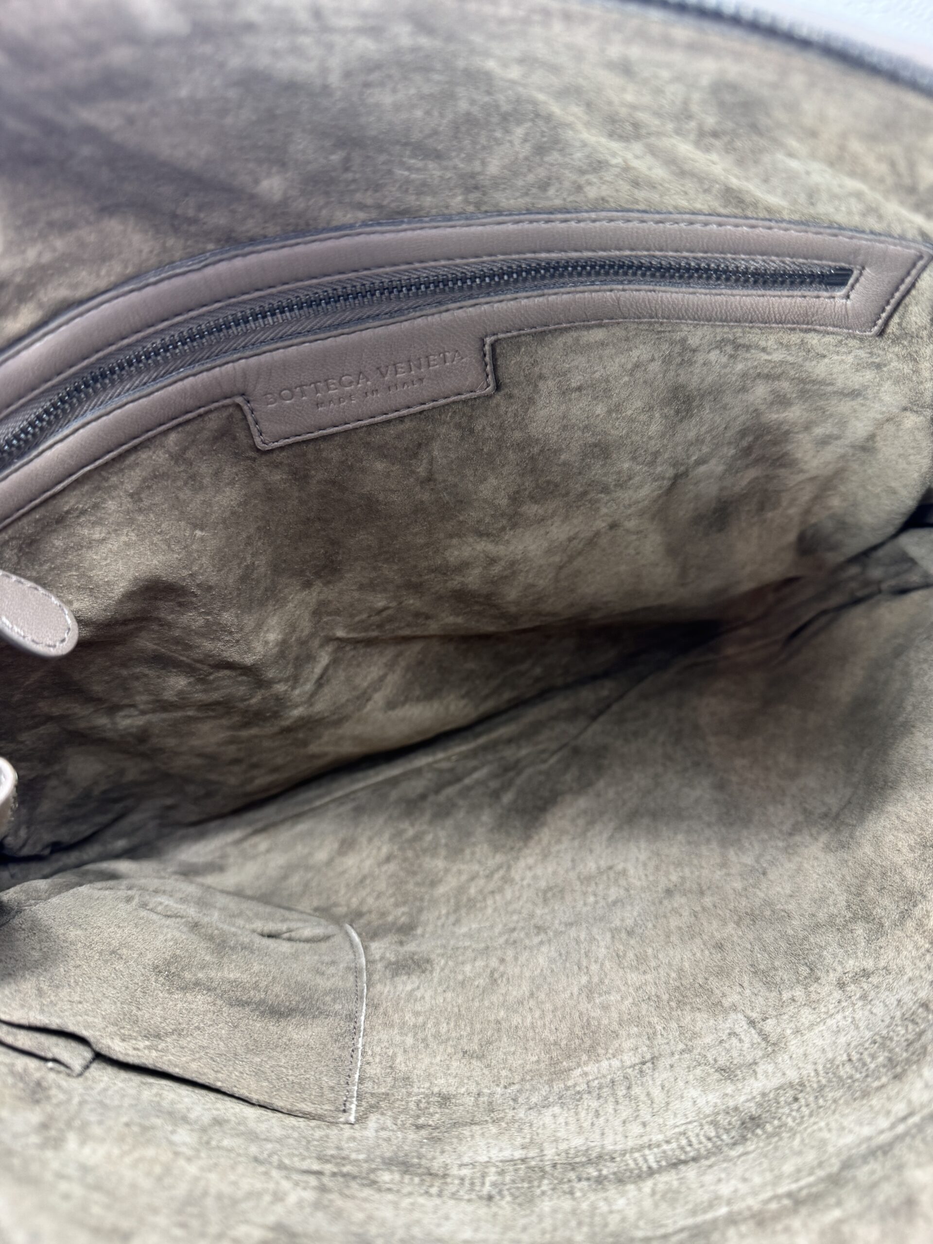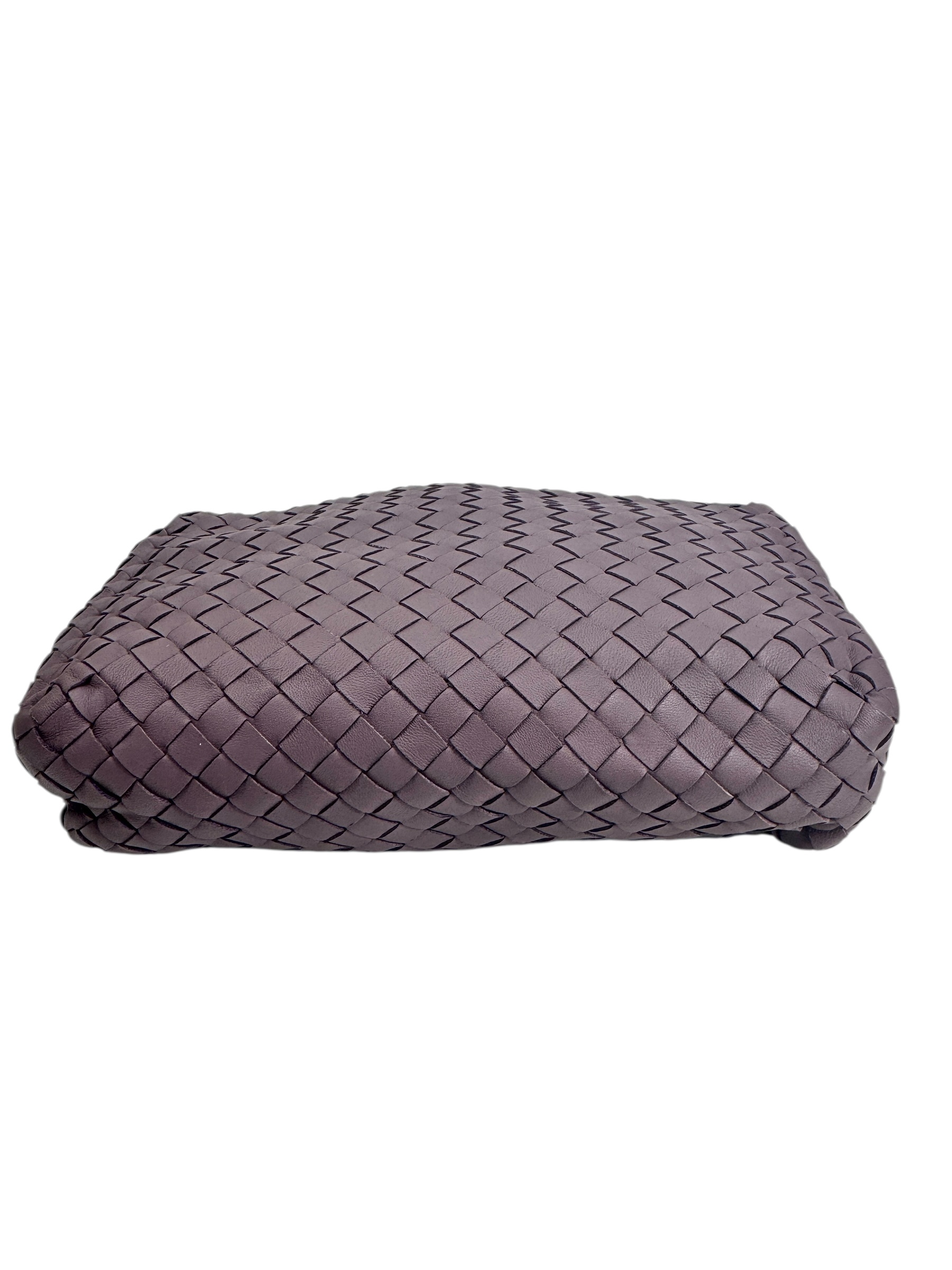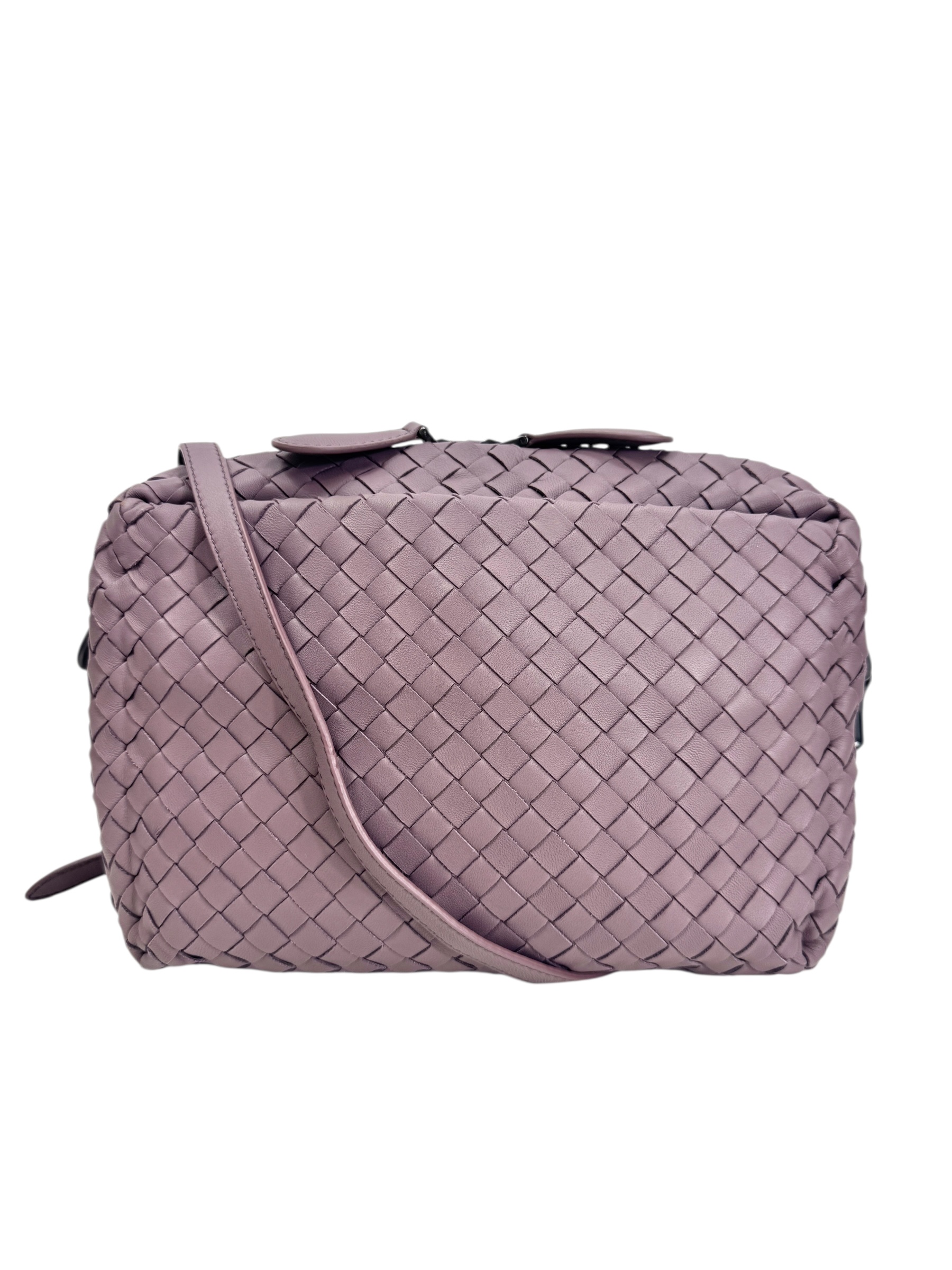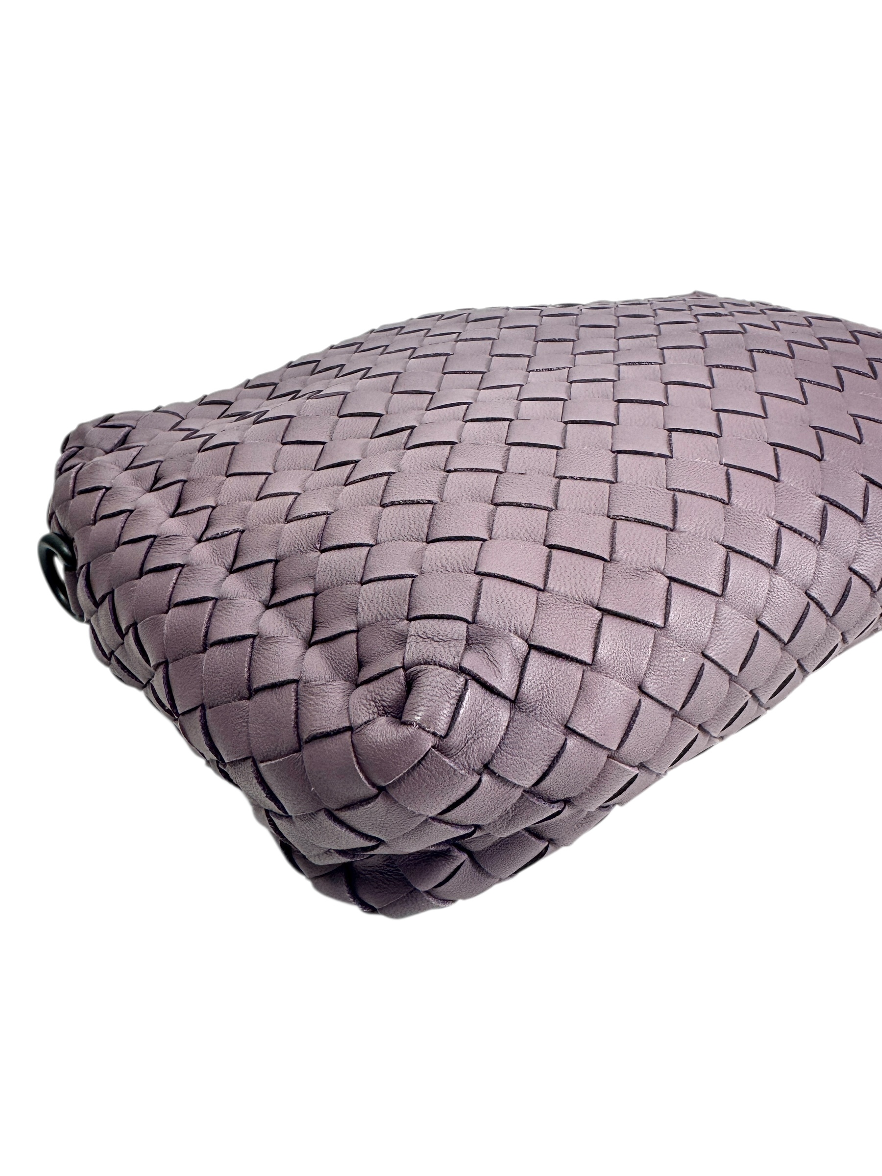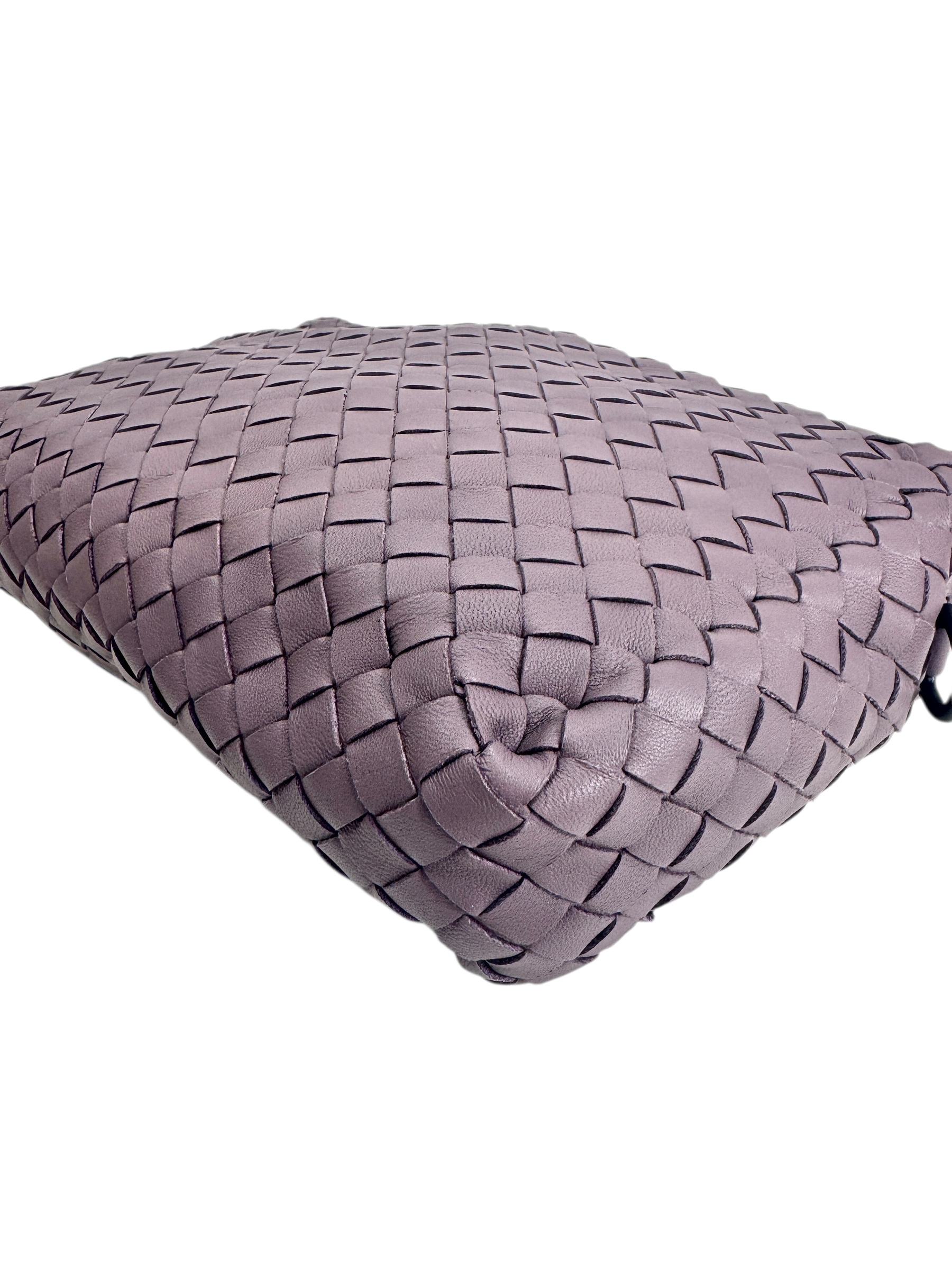 Sac en cuir agneau Intrecciato parme, fermeture éclair, poches extérieures, anse bandoulière amovible.