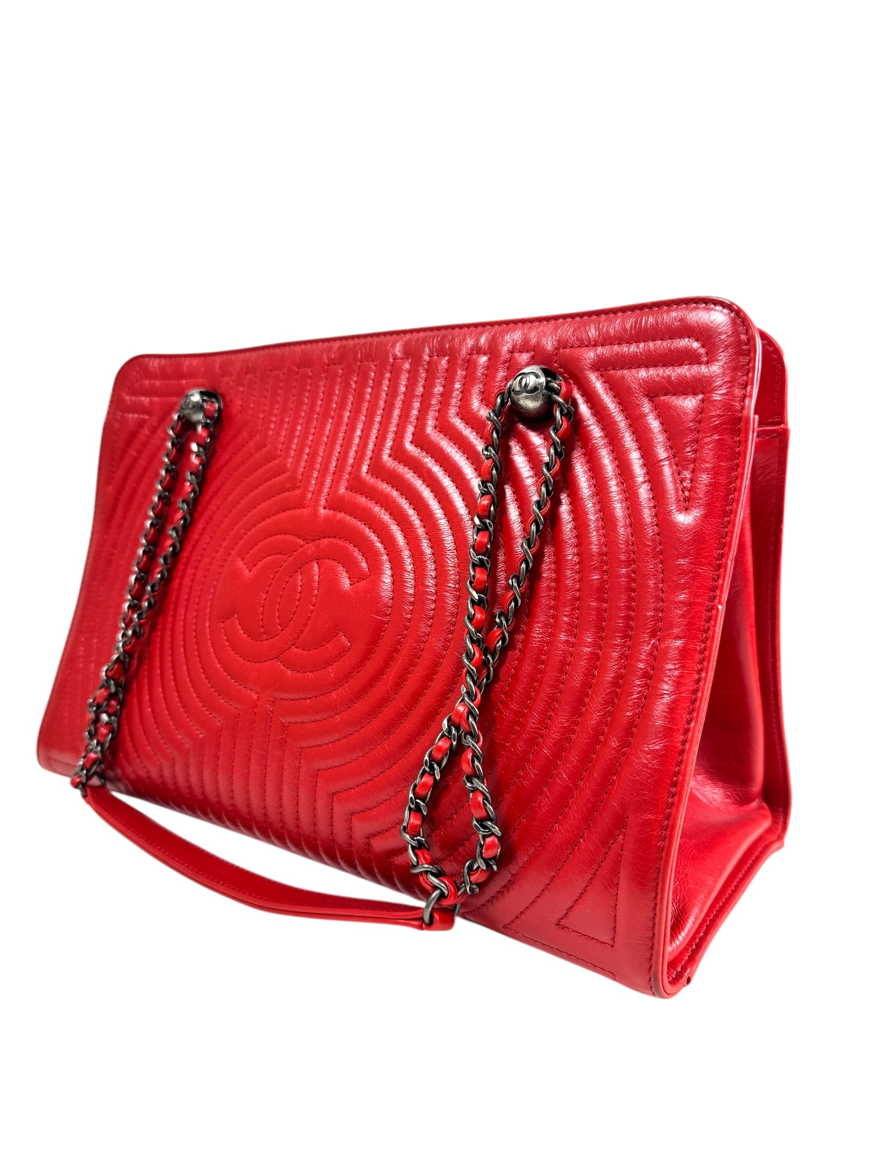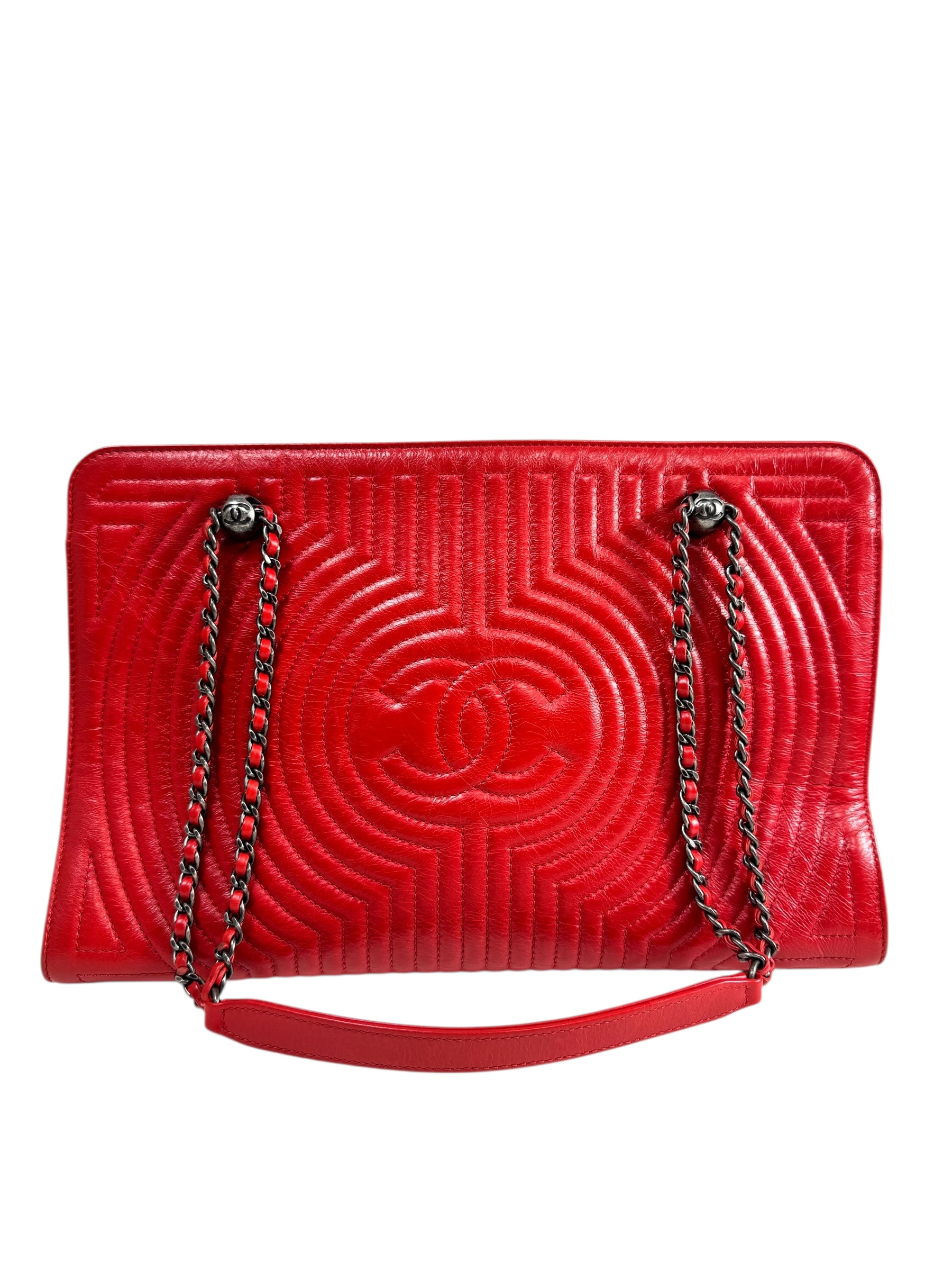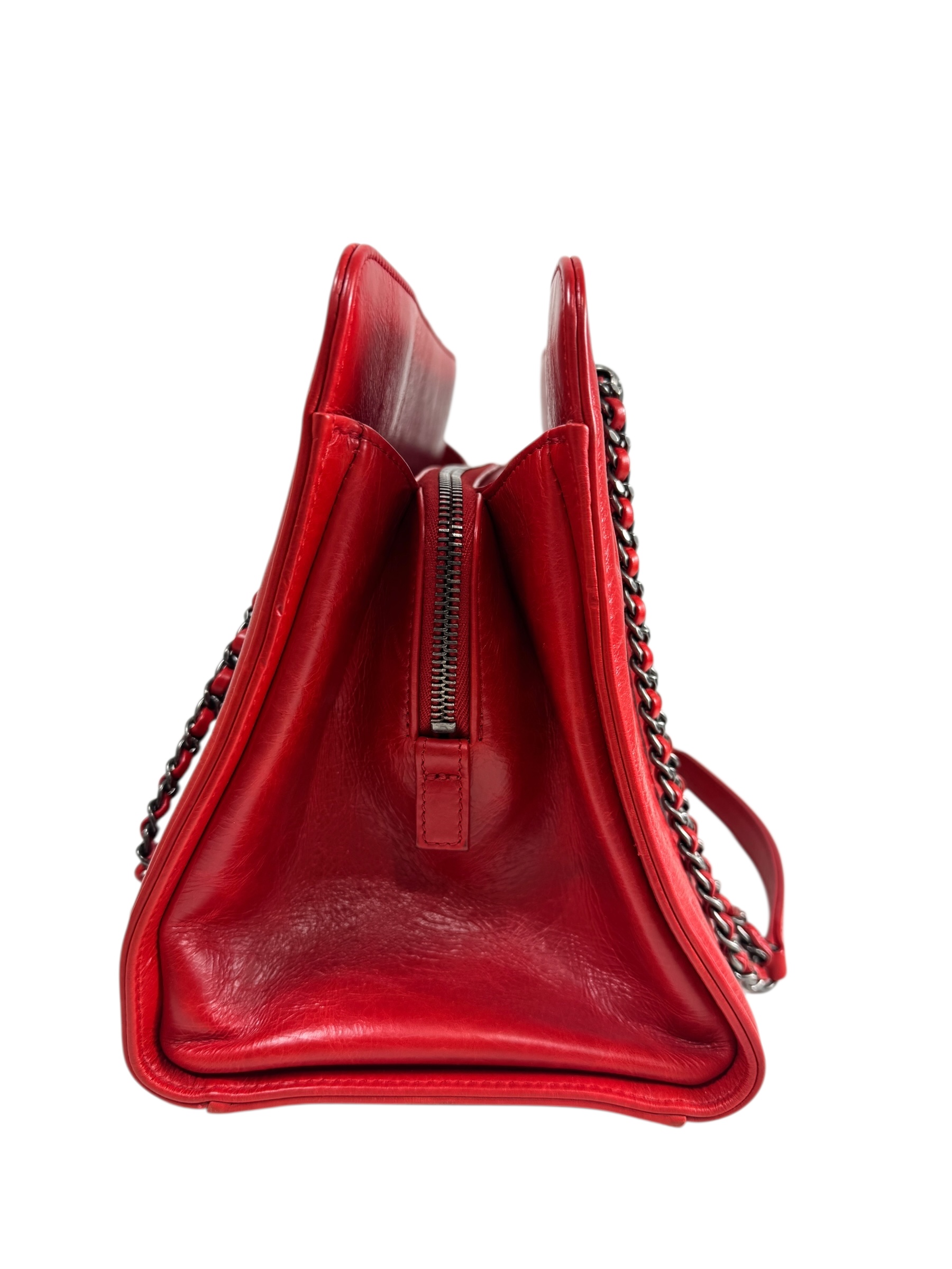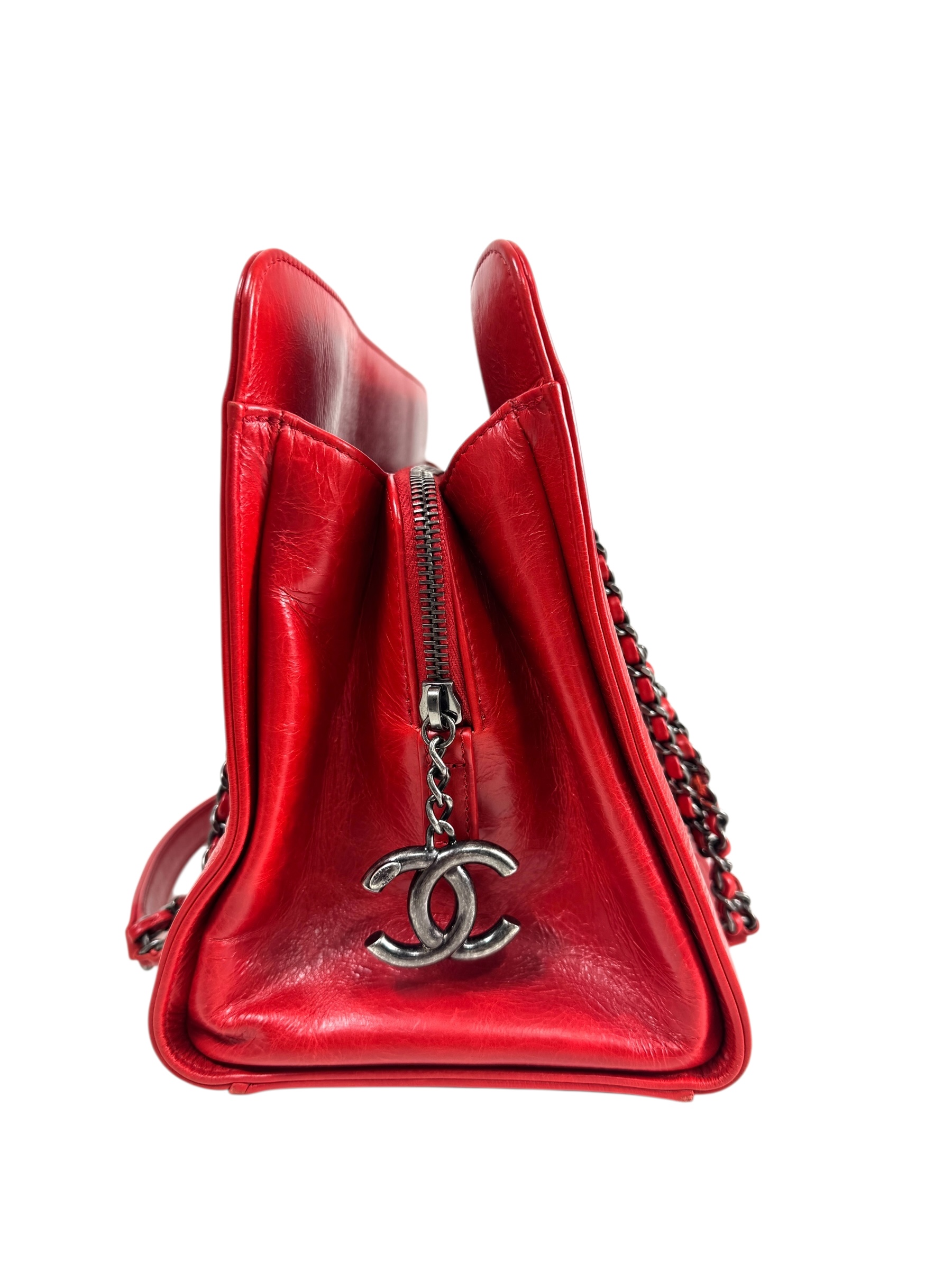 Sac cabas en cuir vieilli rouge à surpiqures géométriques, double anse chaîne en métal rhuténié entrelacé de cuir en coordonné, pattes d’épaule. Hologramme.