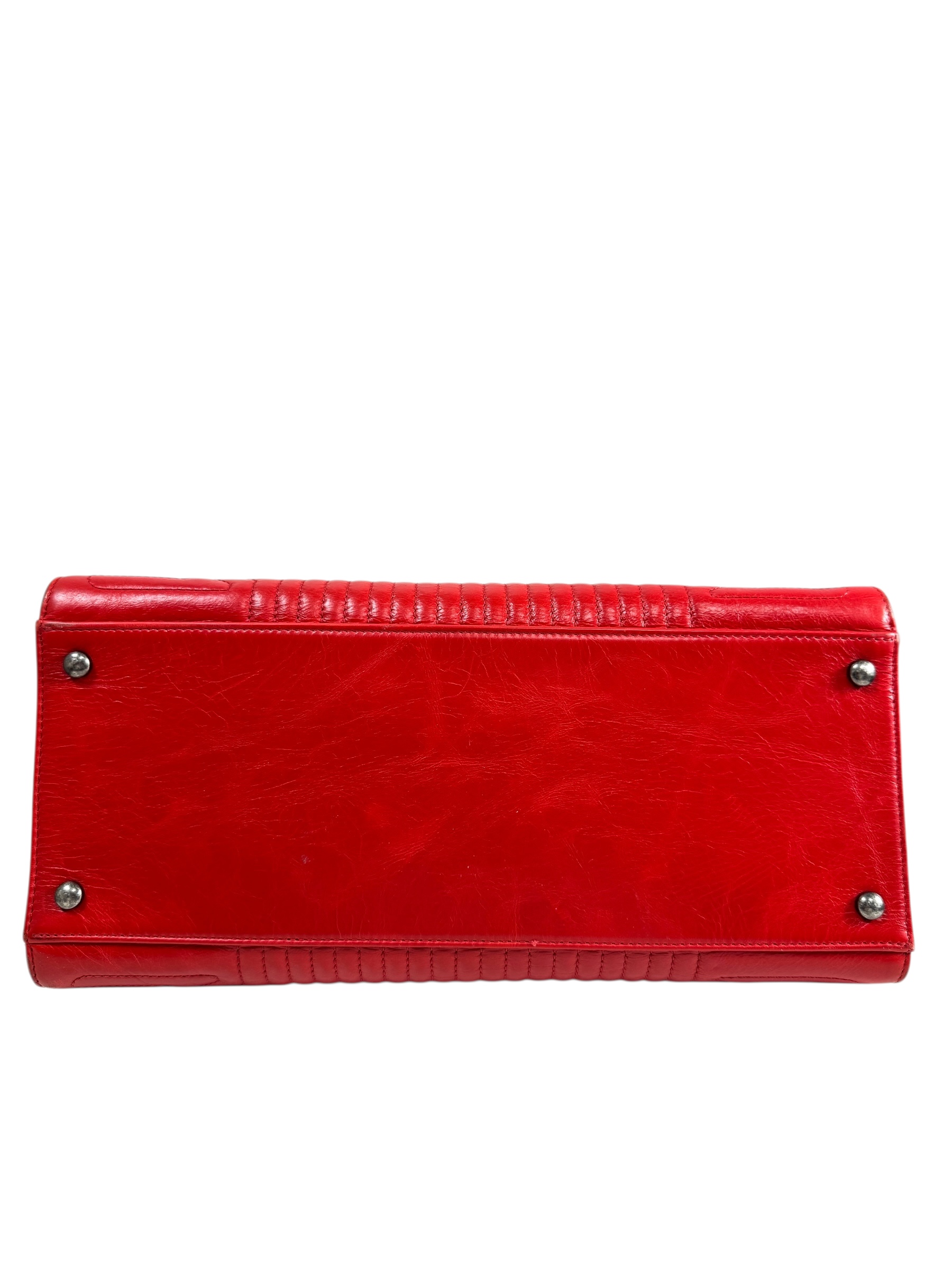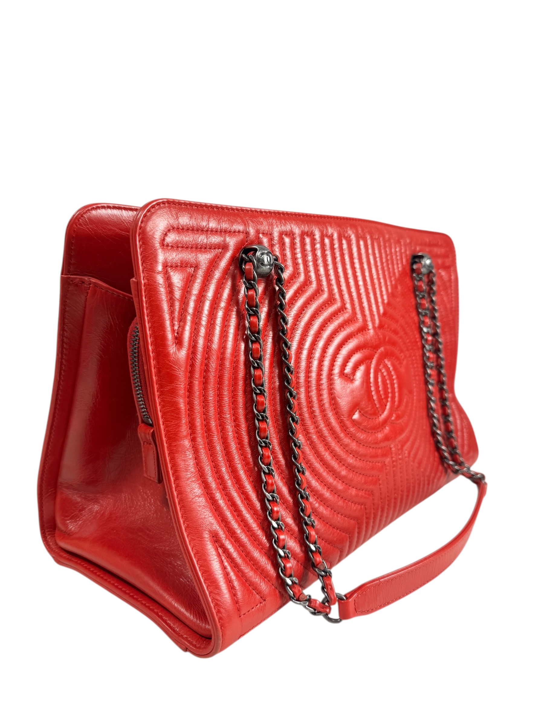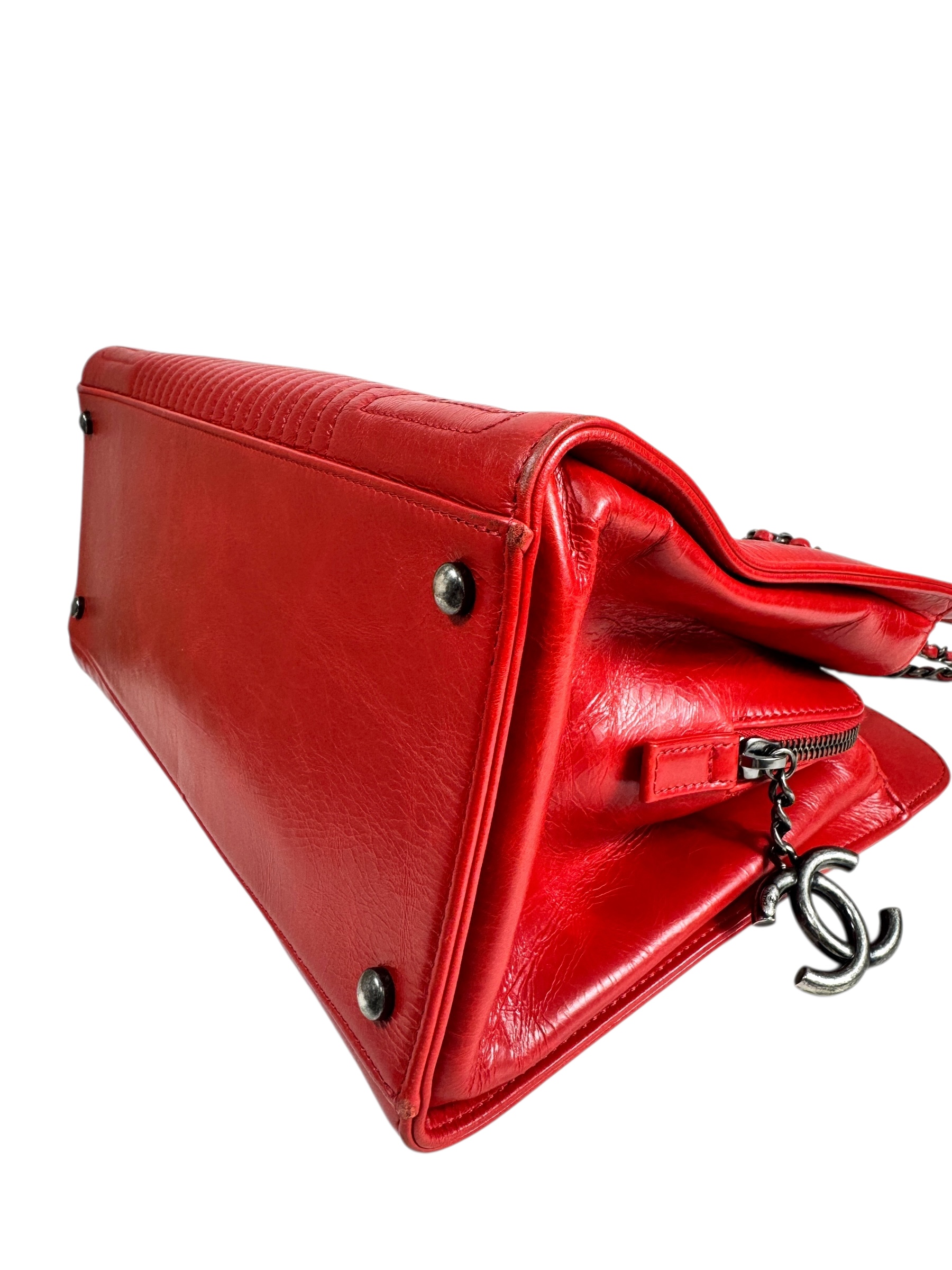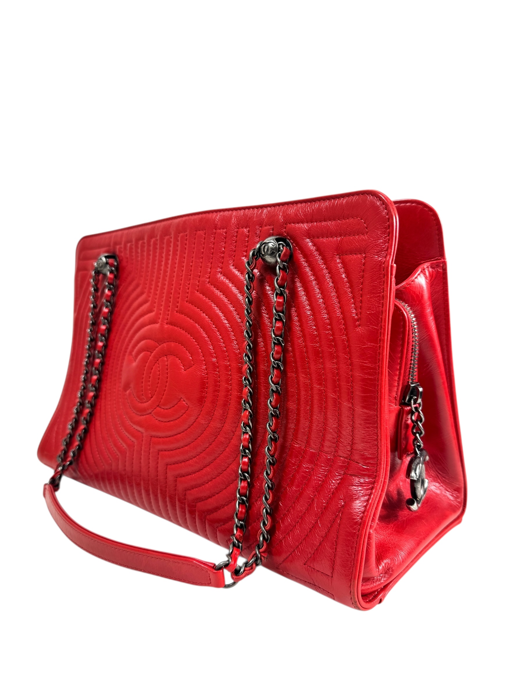 Sac cabas en cuir vieilli rouge à surpiqures géométriques, double anse chaîne en métal rhuténié entrelacé de cuir en coordonné, pattes d’épaule. Hologramme.