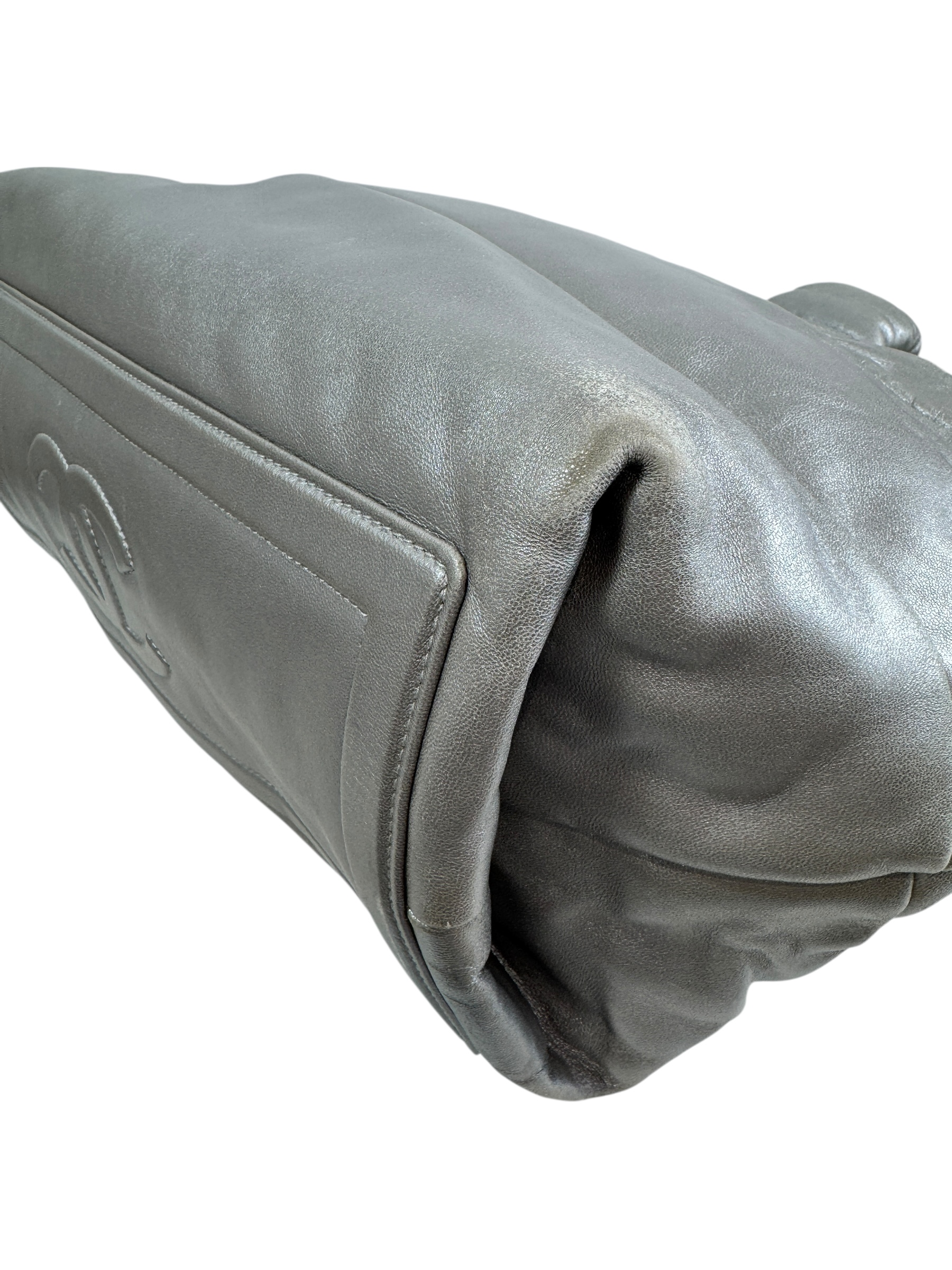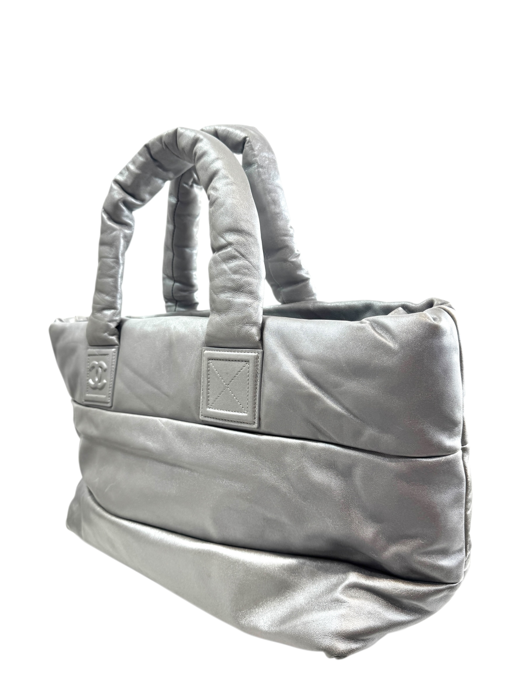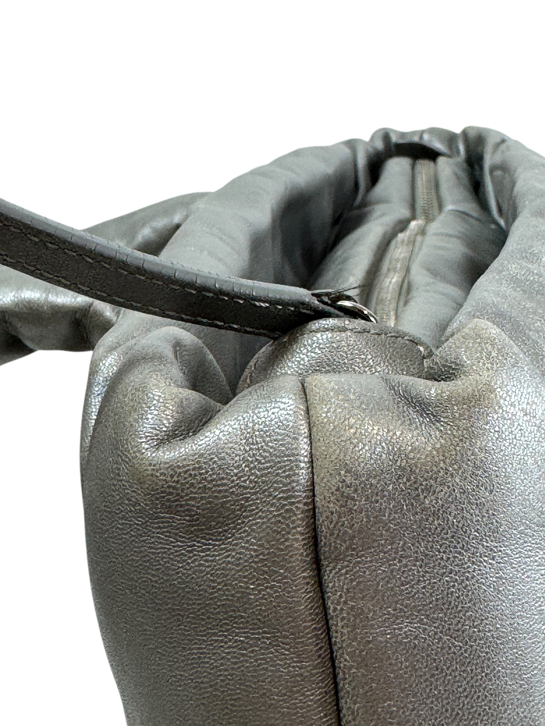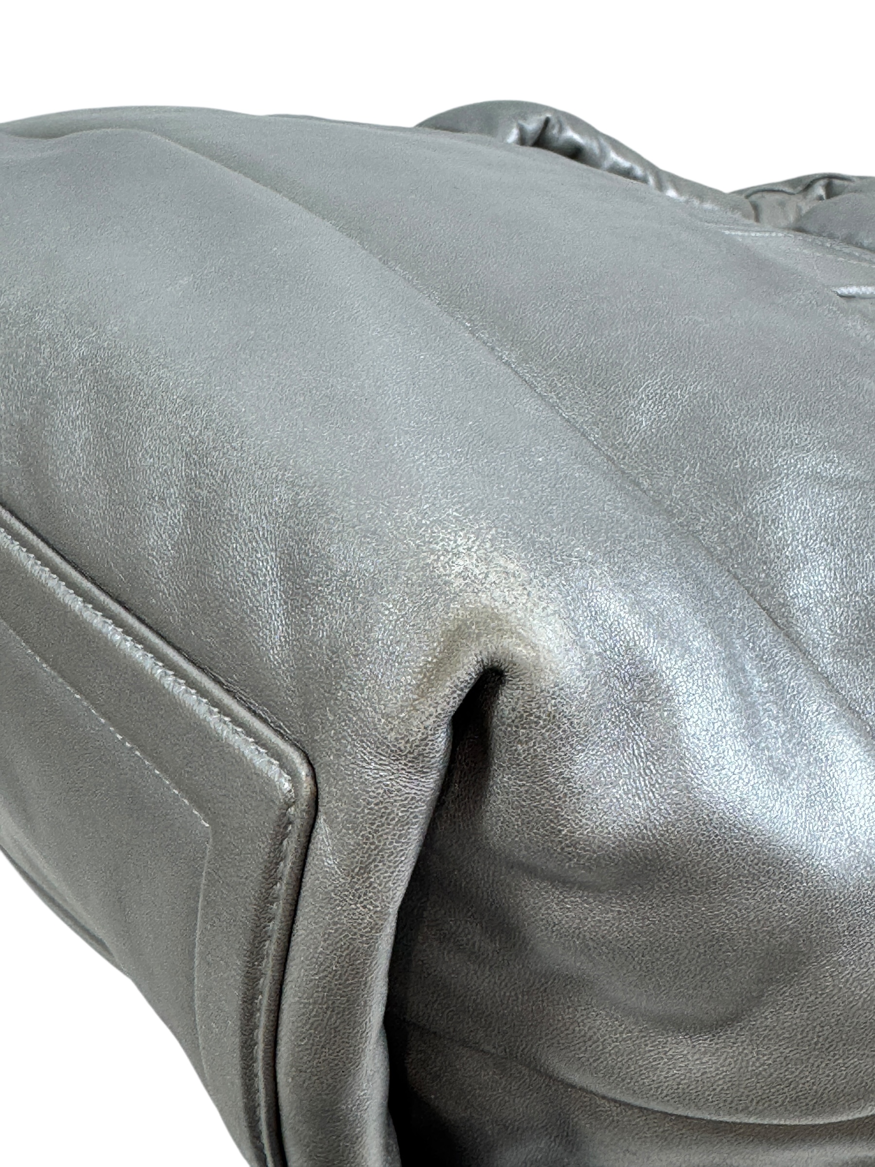 Sac « Coco cocoon » en cuir agneau métallisé argenté, double poignée. Hologramme.