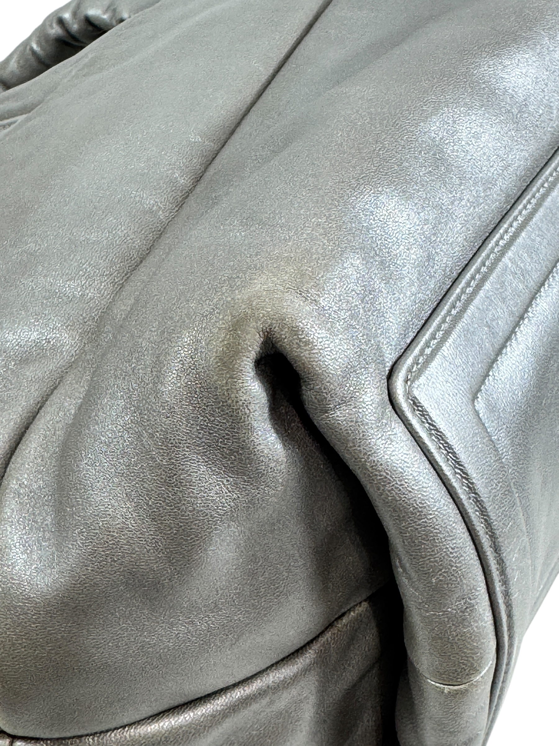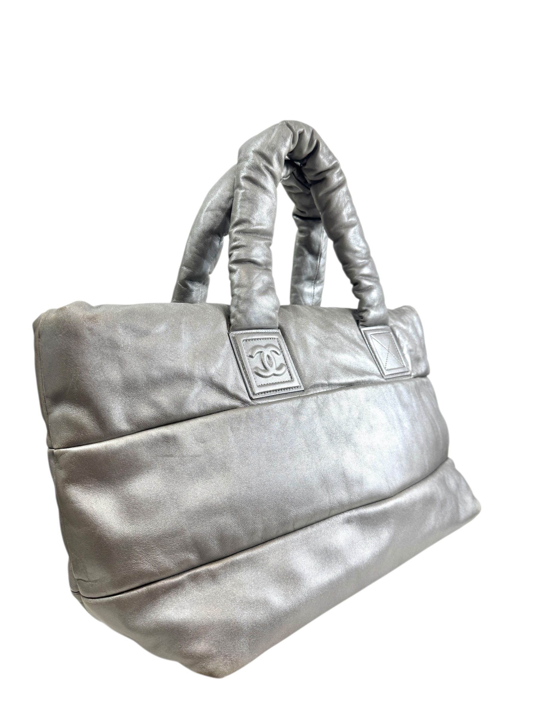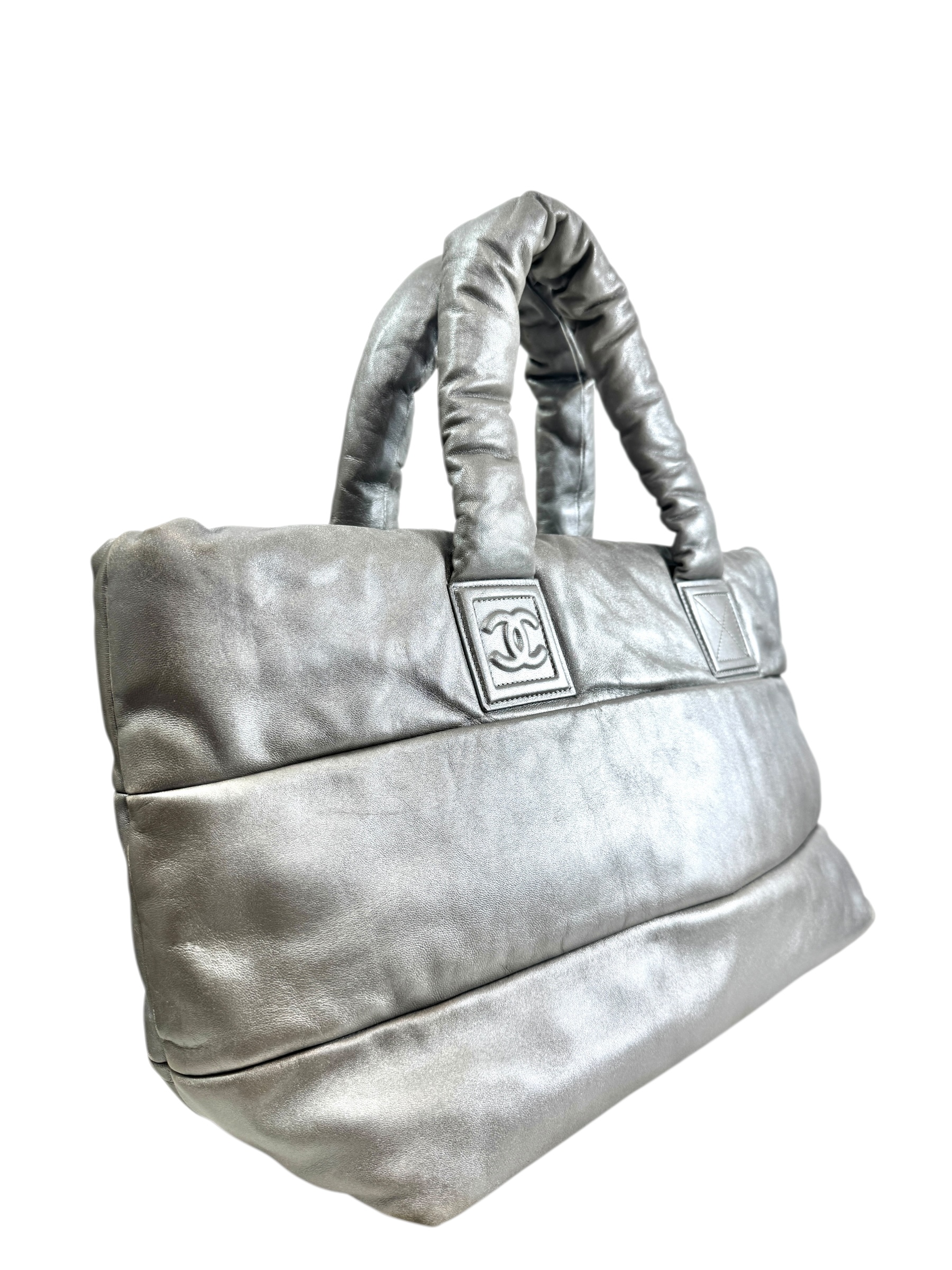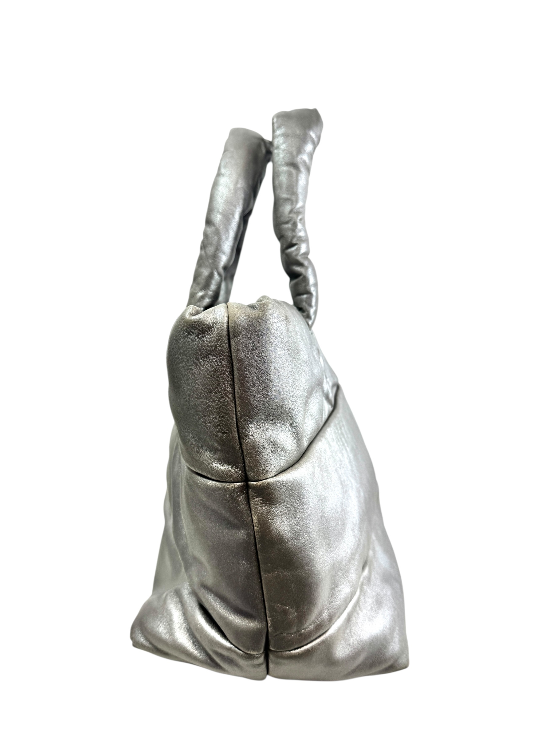 Sac « Coco cocoon » en cuir agneau métallisé argenté, double poignée. Hologramme.
