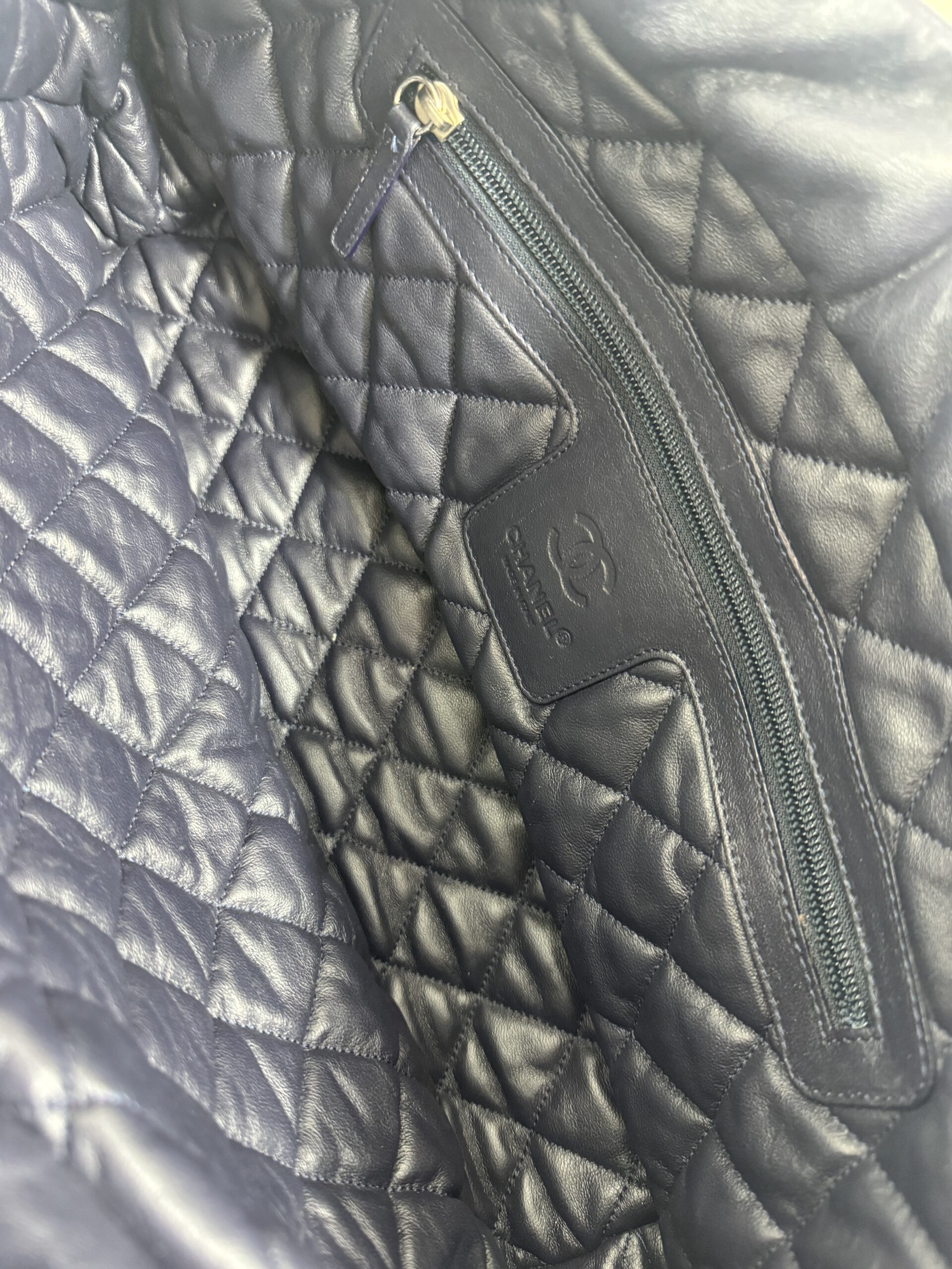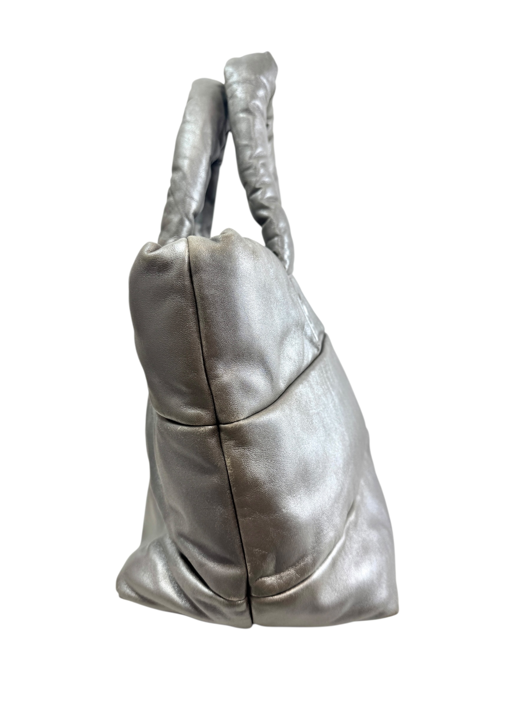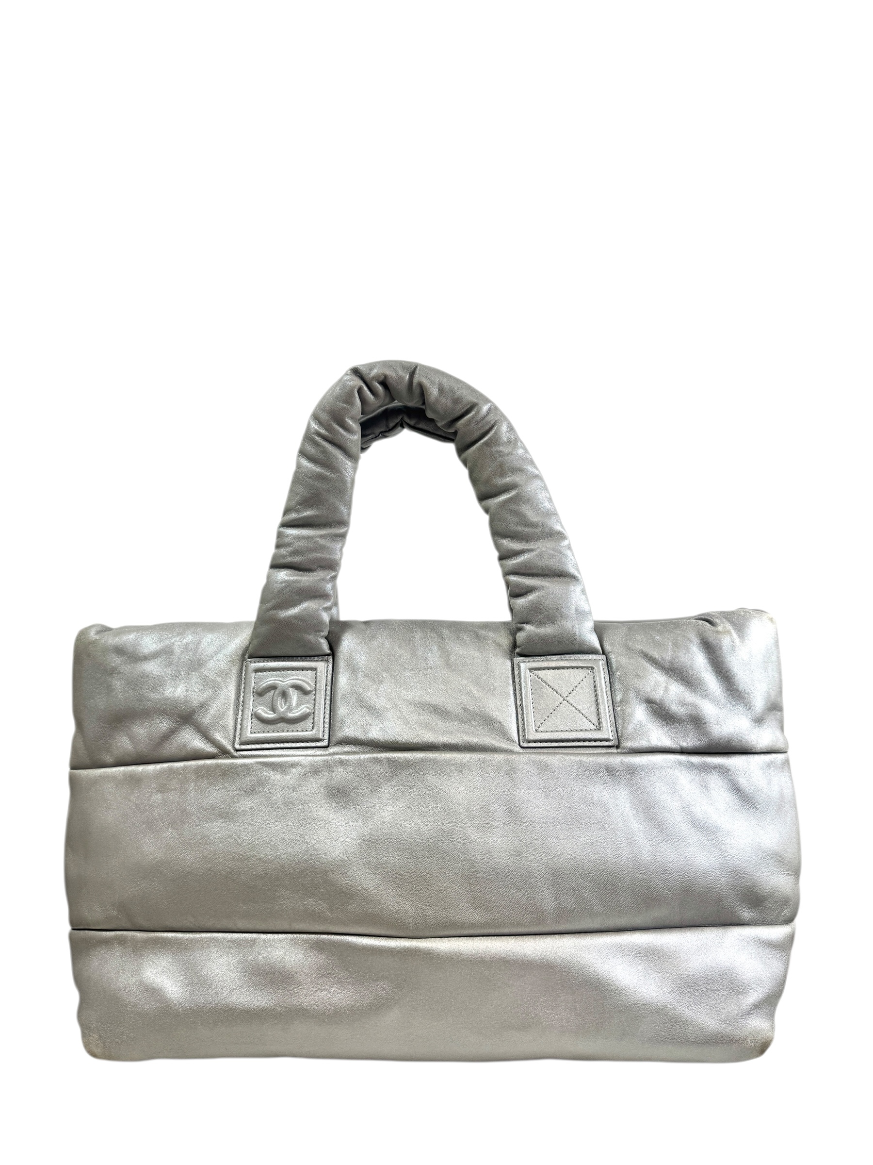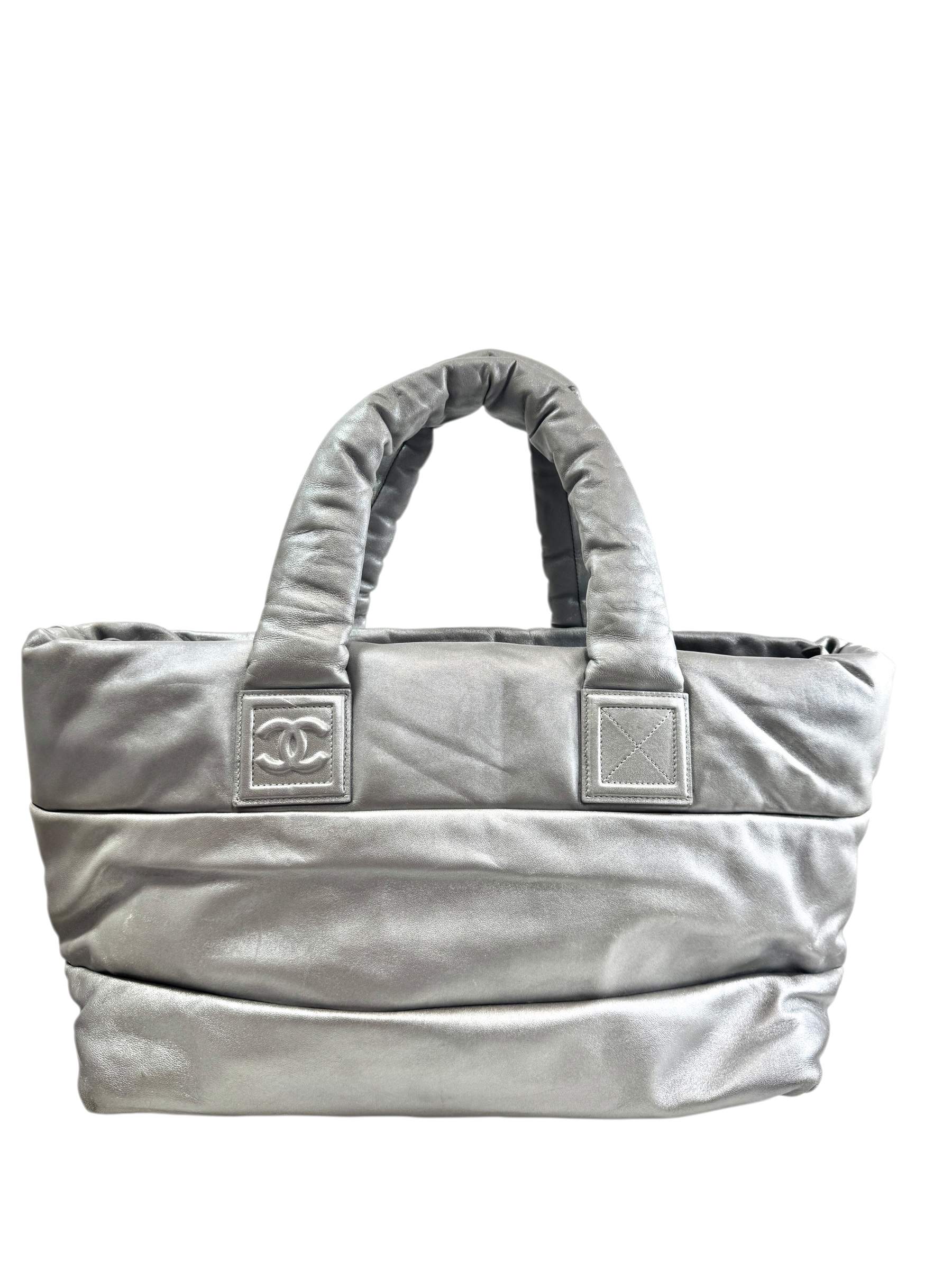 Sac « Coco cocoon » en cuir agneau métallisé argenté, double poignée. Hologramme.