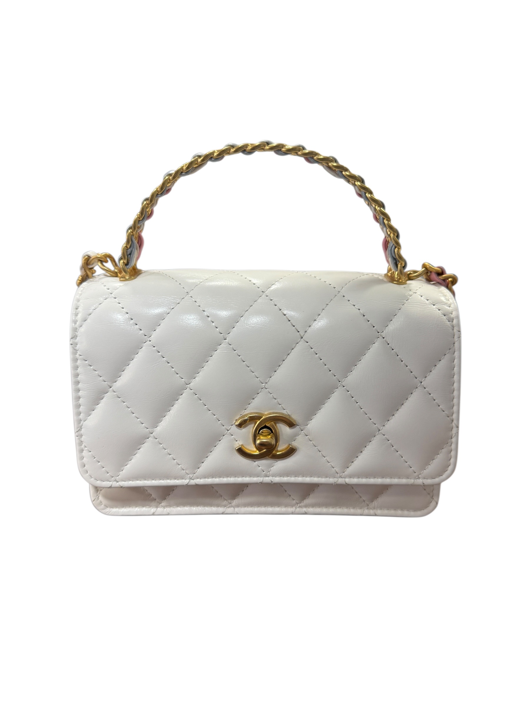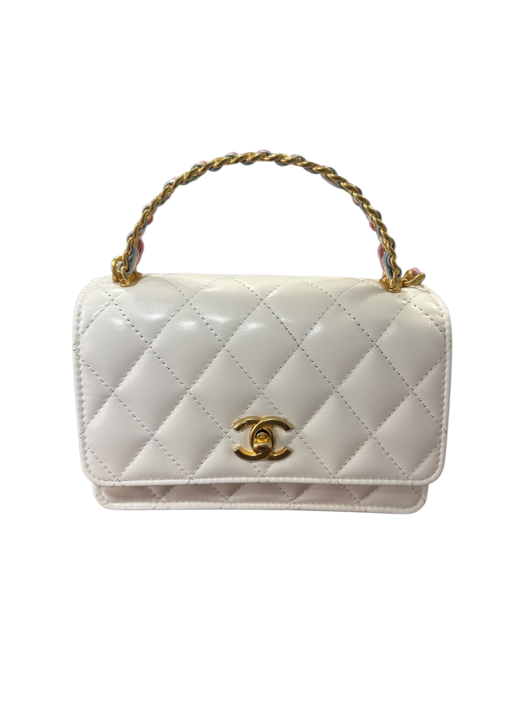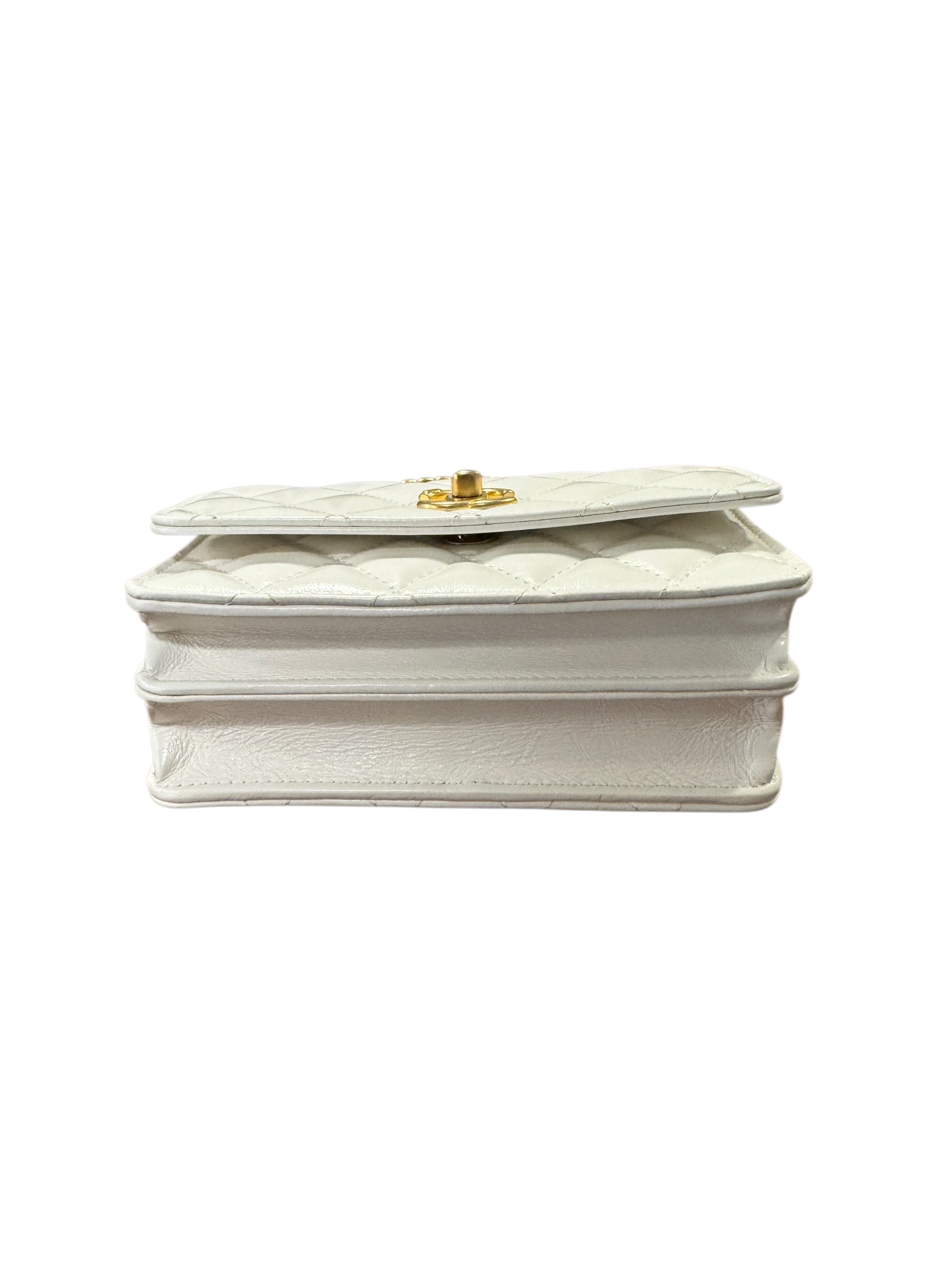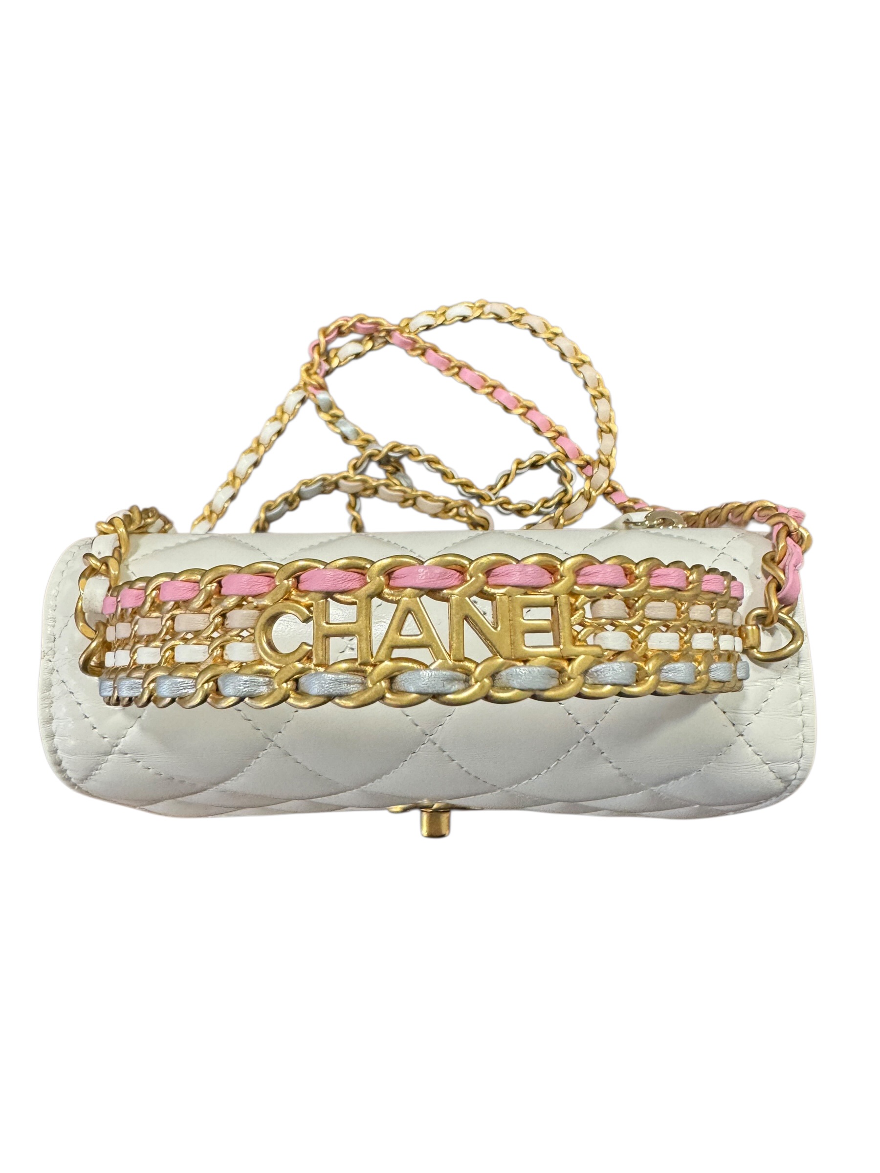 Sac en cuir matelassé blanc, fermoir « CC » en métal doré amati sur rabat, poignée chaîne entrelacée au nom de la Maison, anse bandoulière en coordonné. Hologramme.