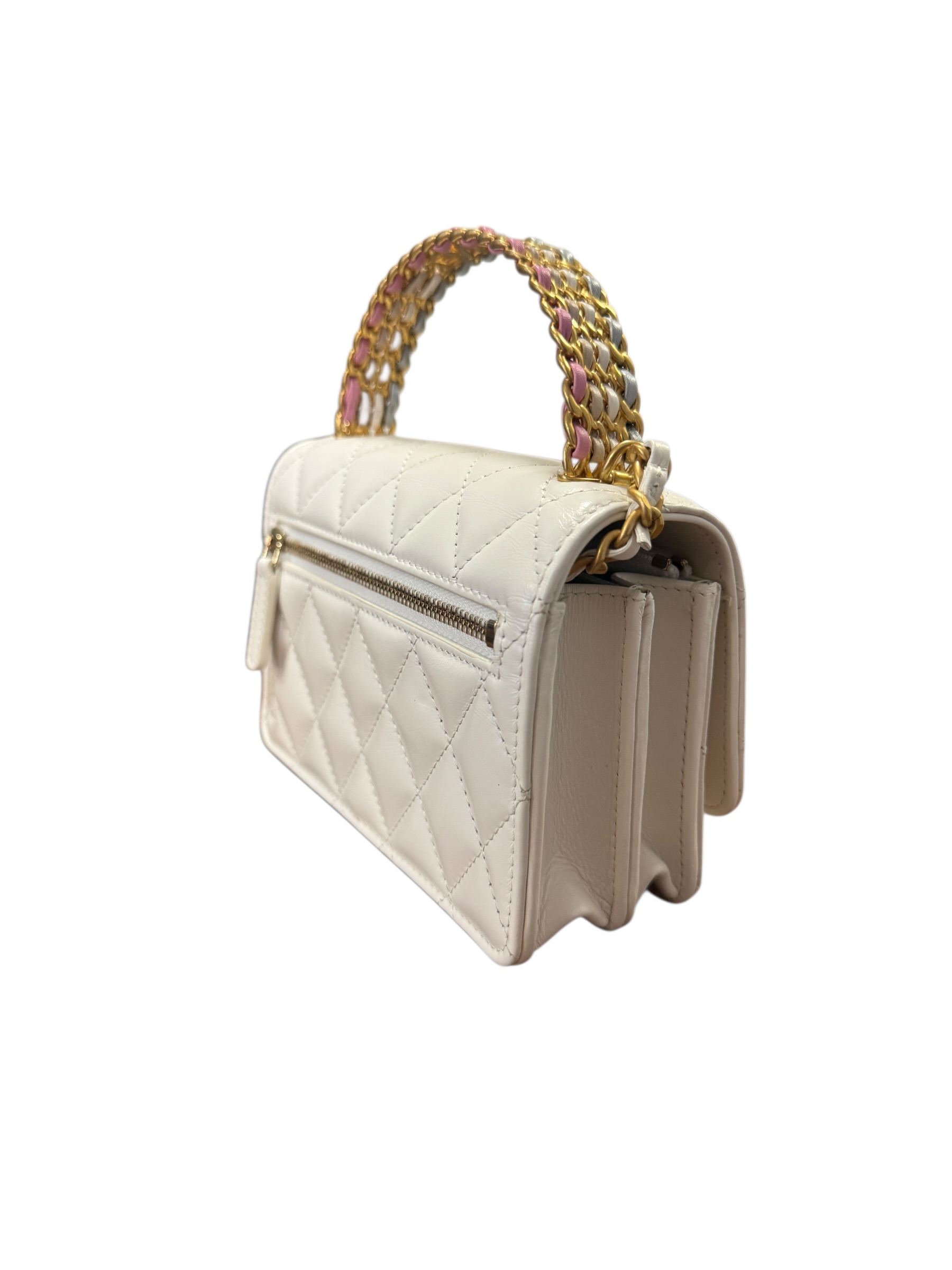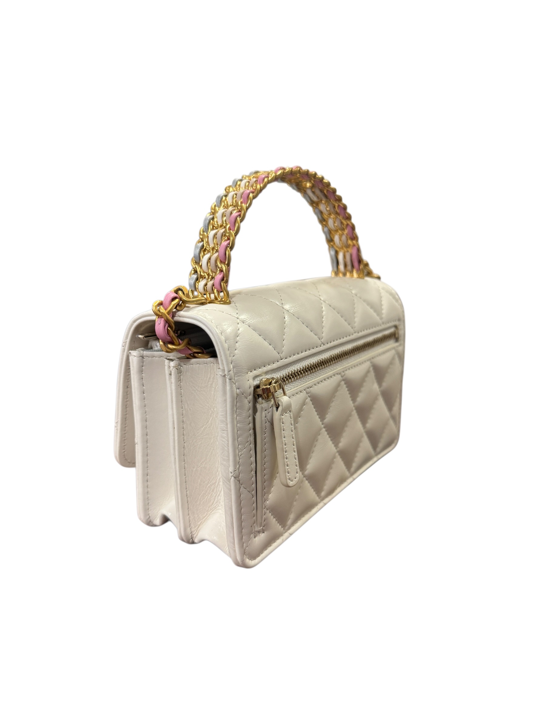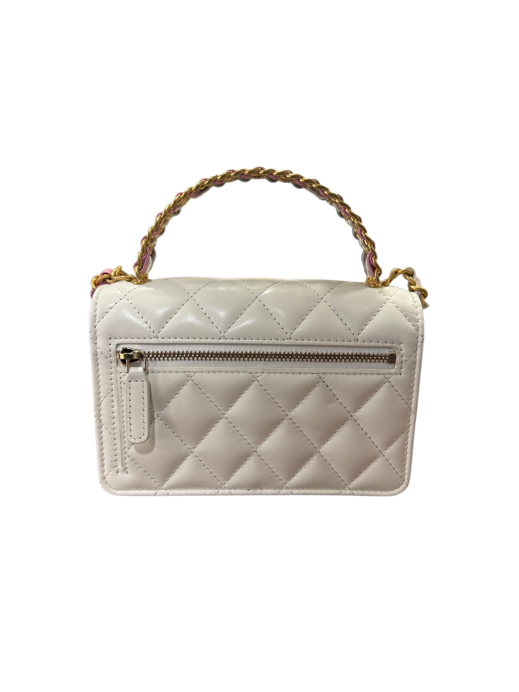 Sac en cuir matelassé blanc, fermoir « CC » en métal doré amati sur rabat, poignée chaîne entrelacée au nom de la Maison, anse bandoulière en coordonné. Hologramme.