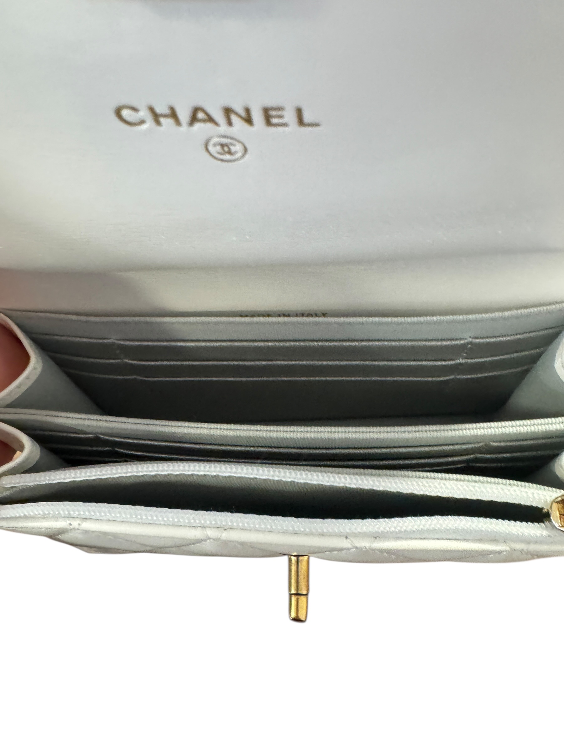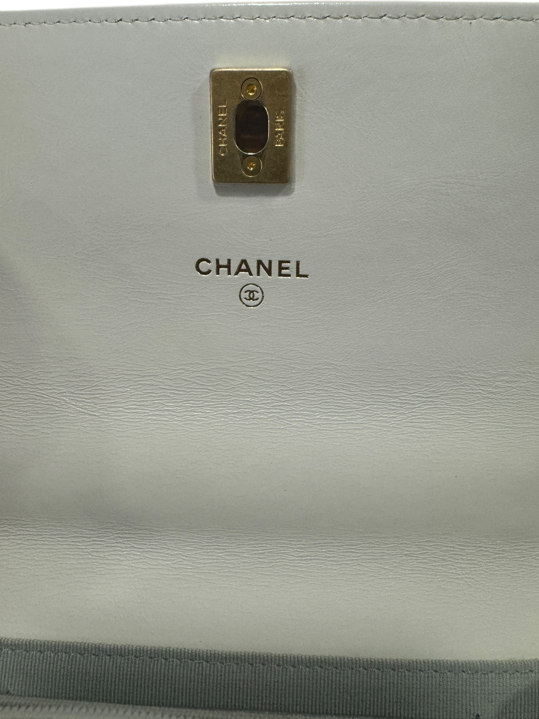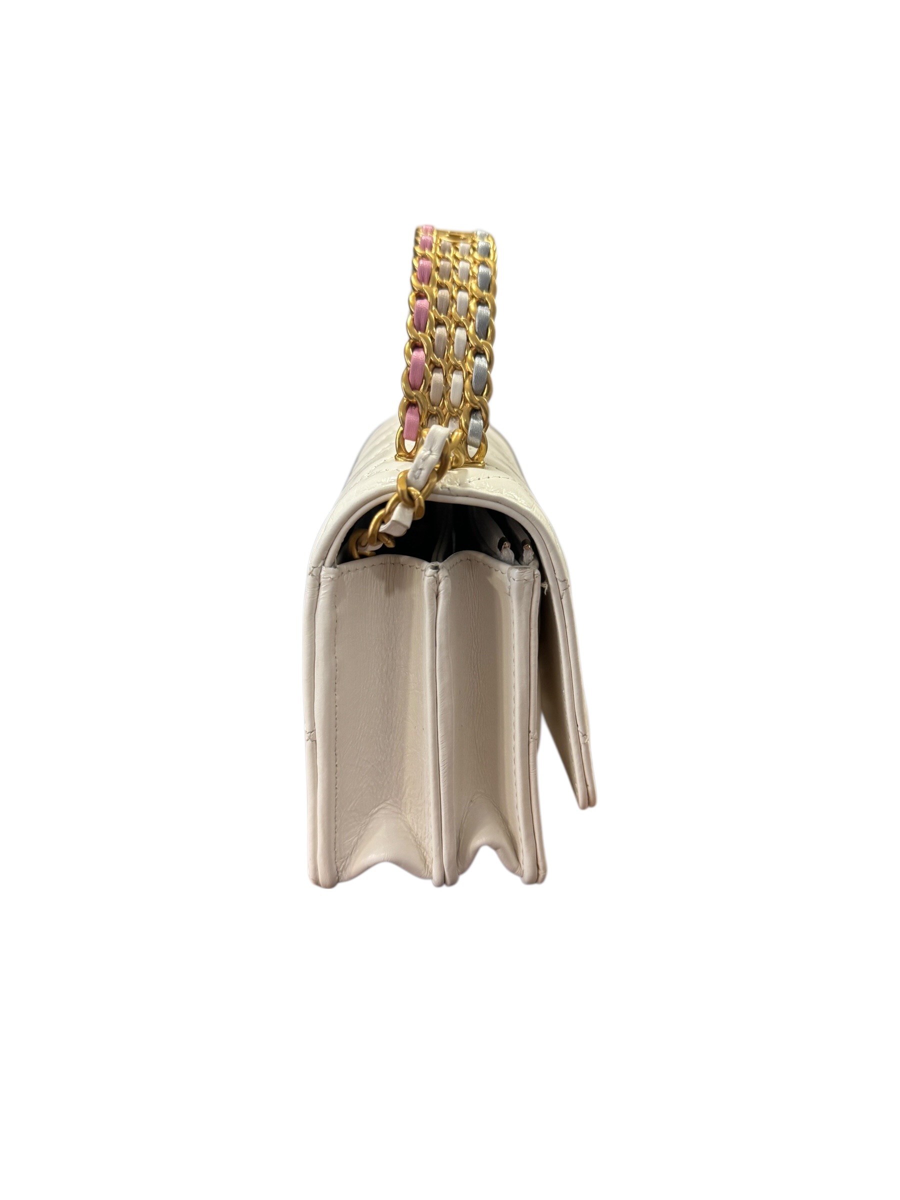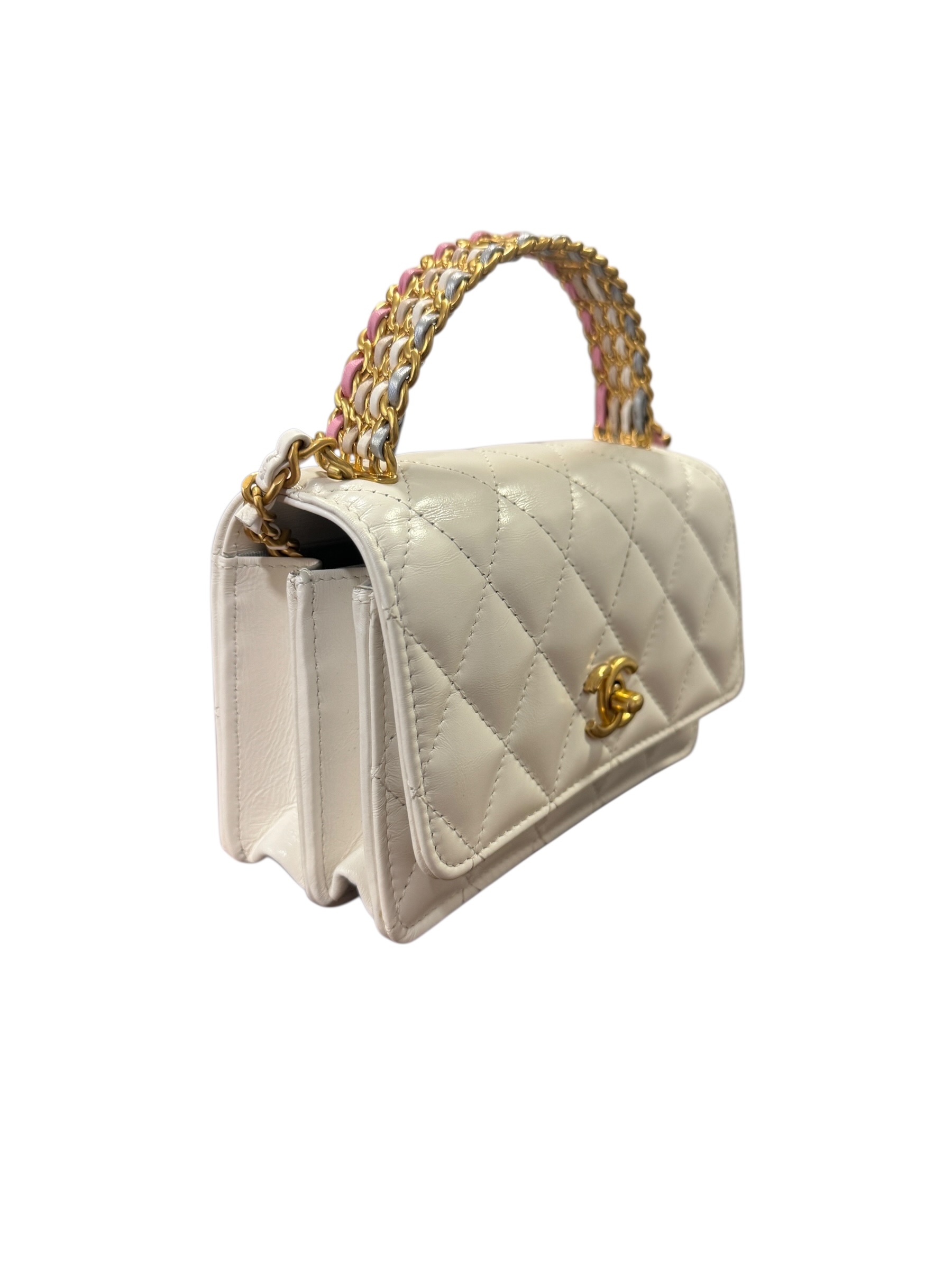 Sac en cuir matelassé blanc, fermoir « CC » en métal doré amati sur rabat, poignée chaîne entrelacée au nom de la Maison, anse bandoulière en coordonné. Hologramme.