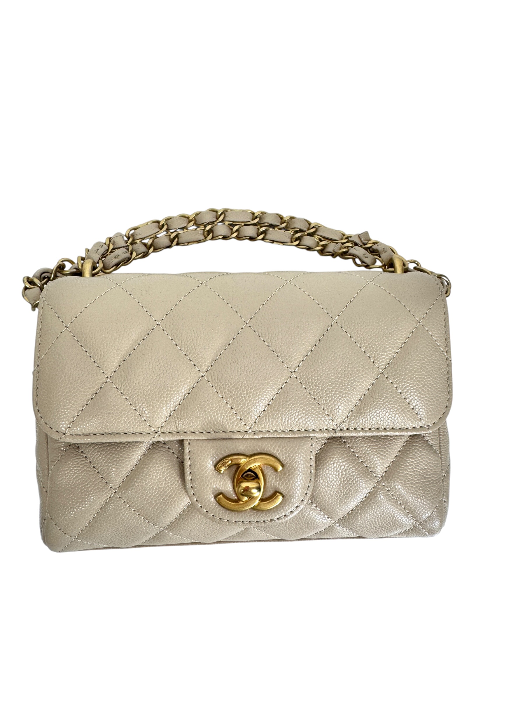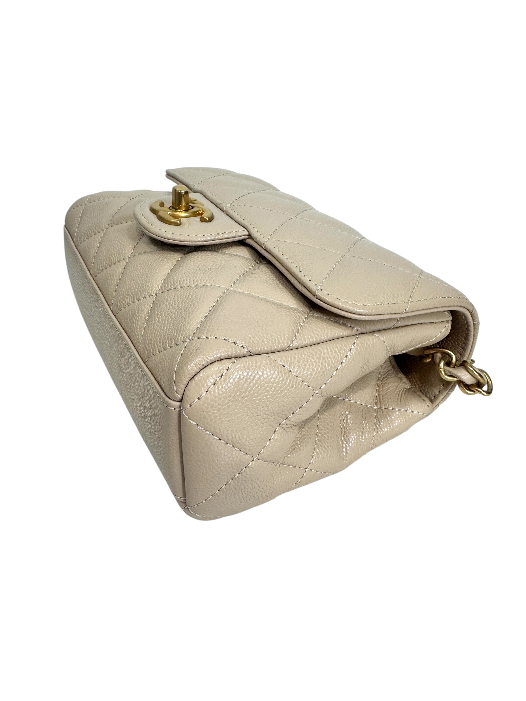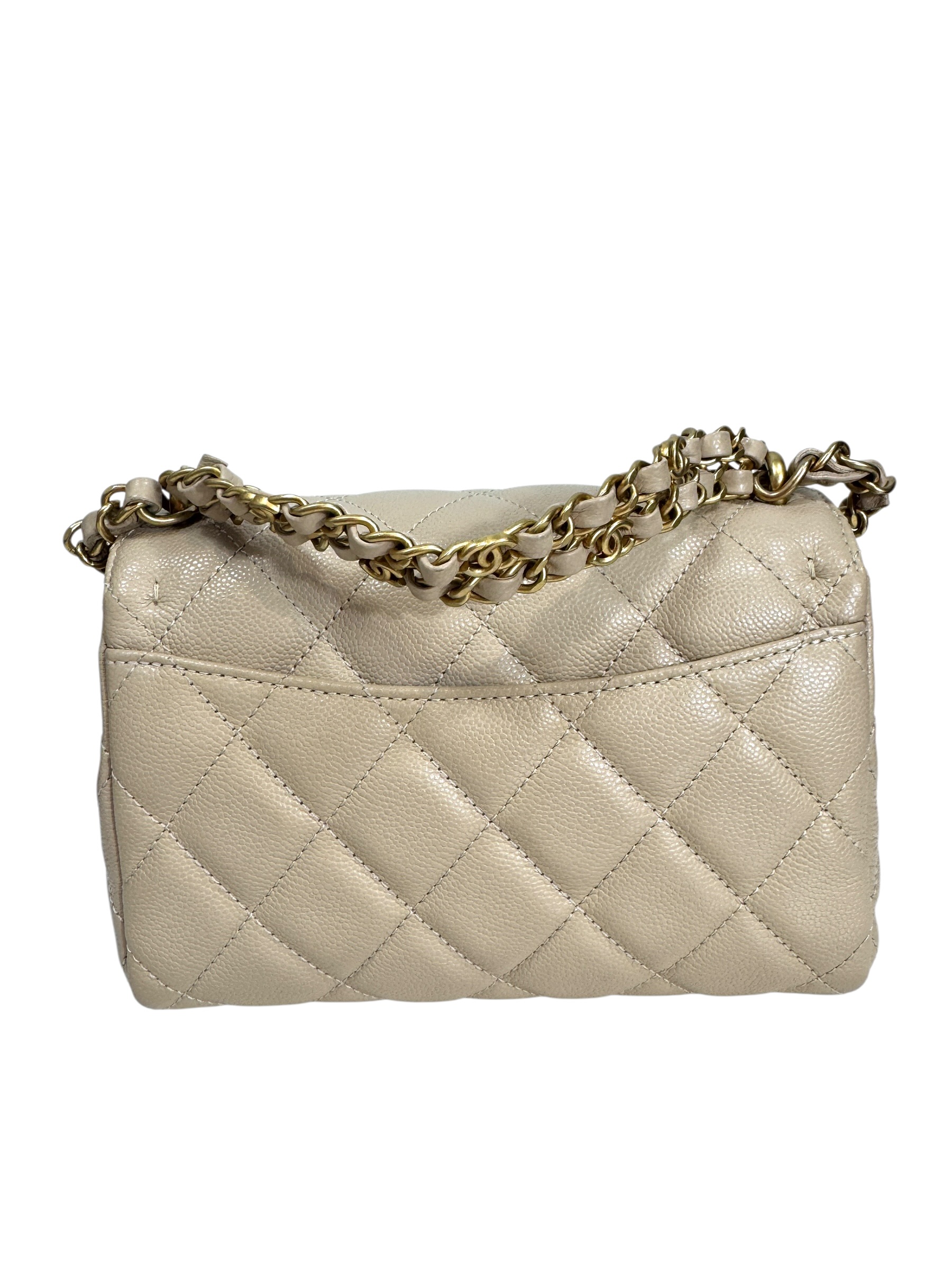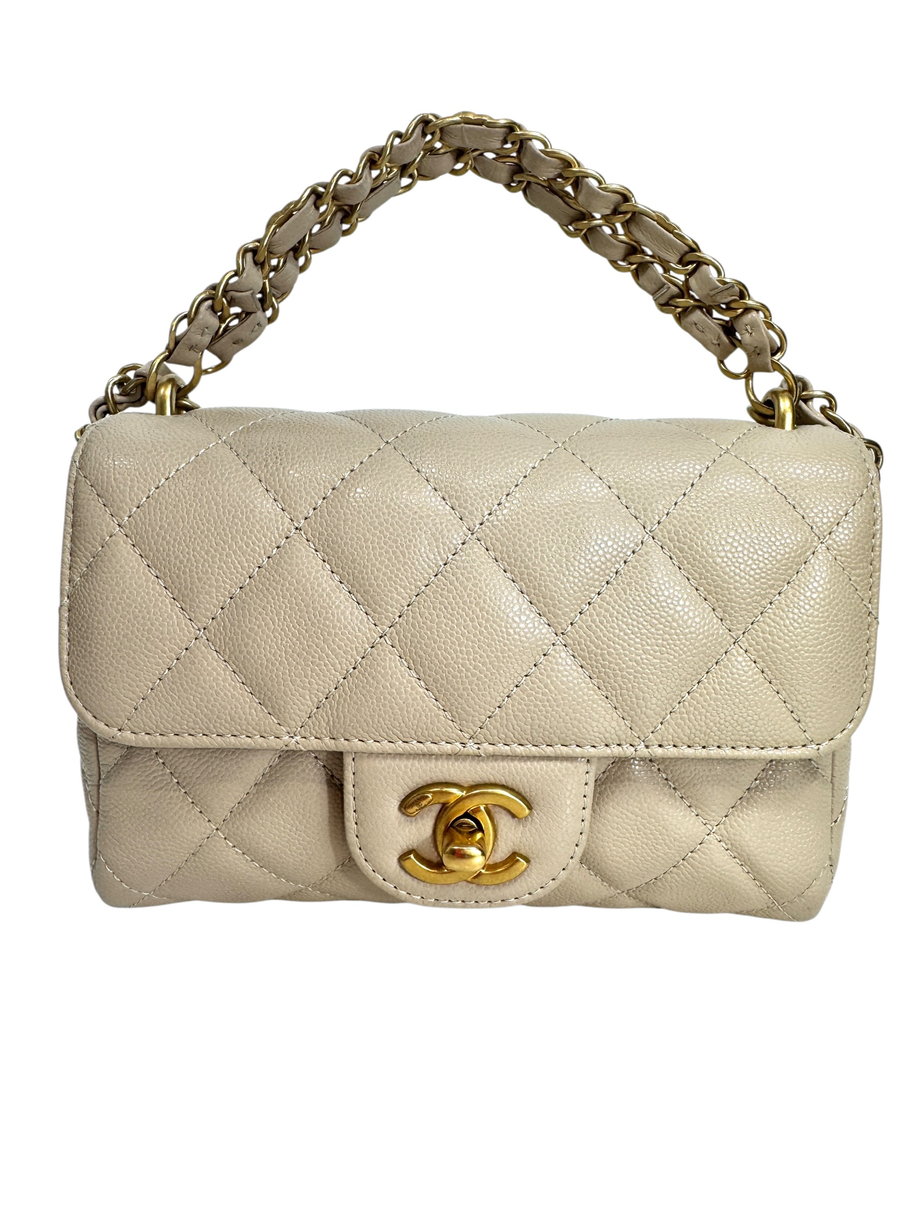 Sac en veau caviar matelassé nude, fermoir « CC » en métal doré vieilli sur rabat, anse bandoulière chaîne entrelacée de cuir en coordonné, double poignée. Puce RFID.