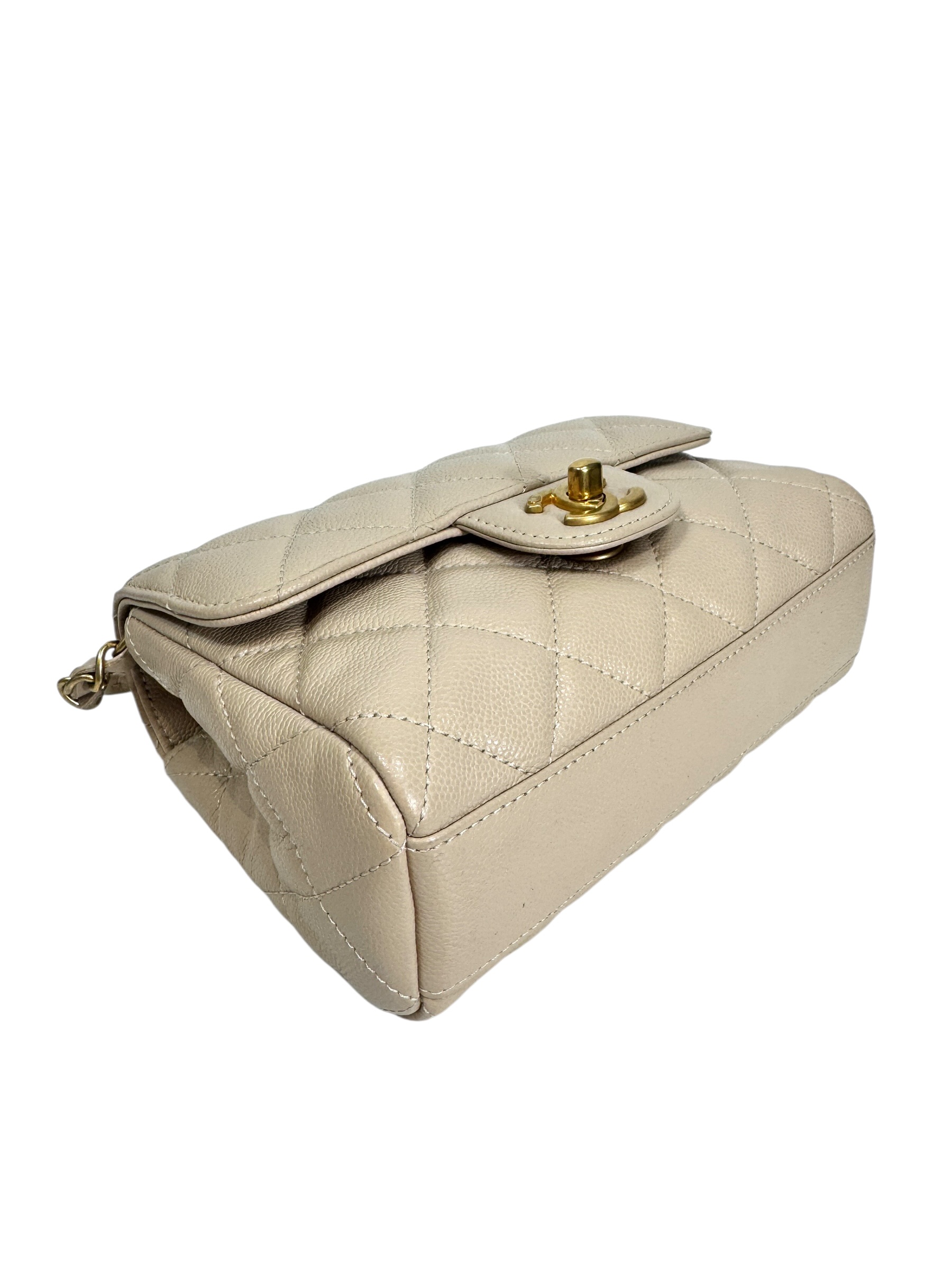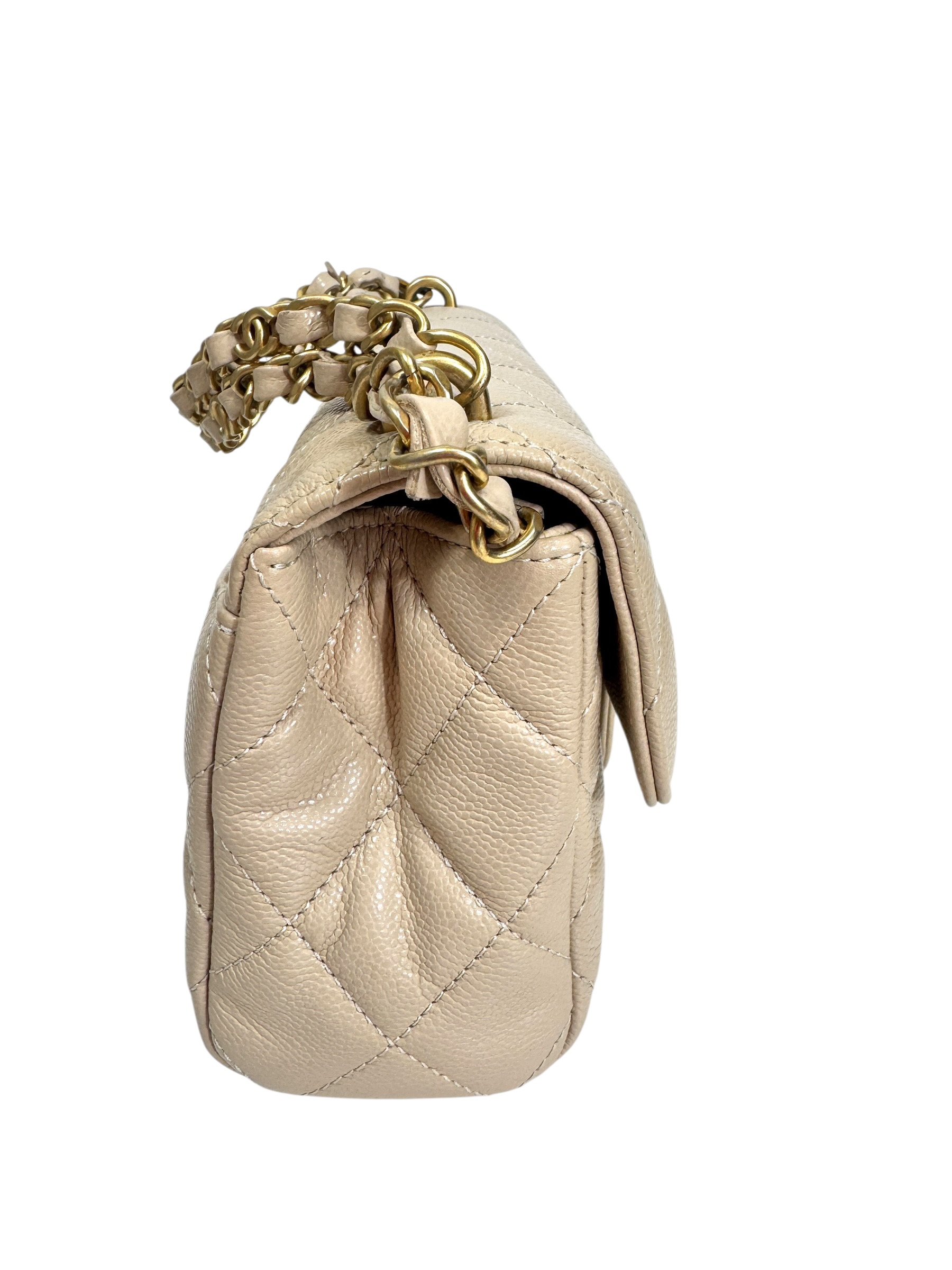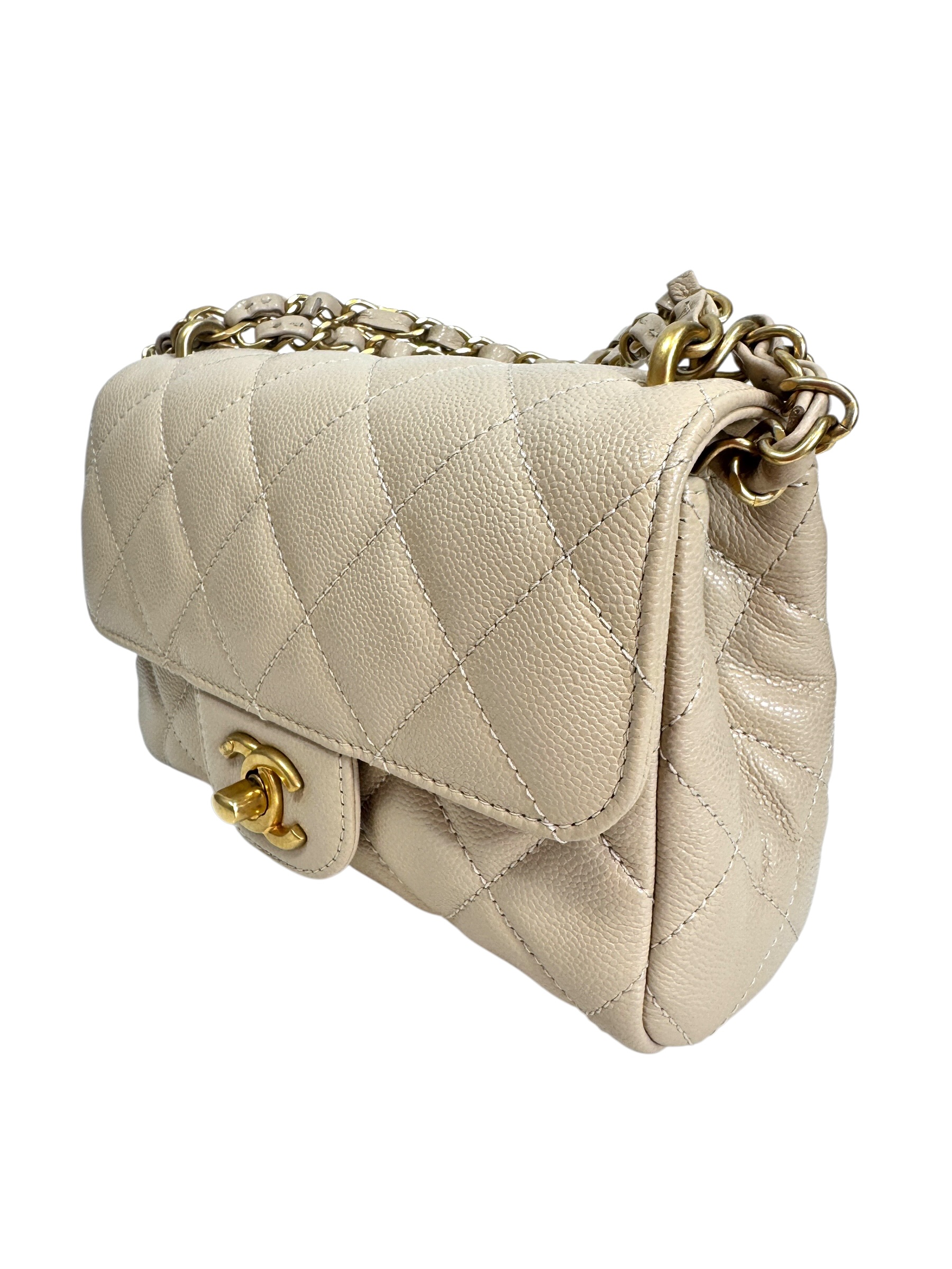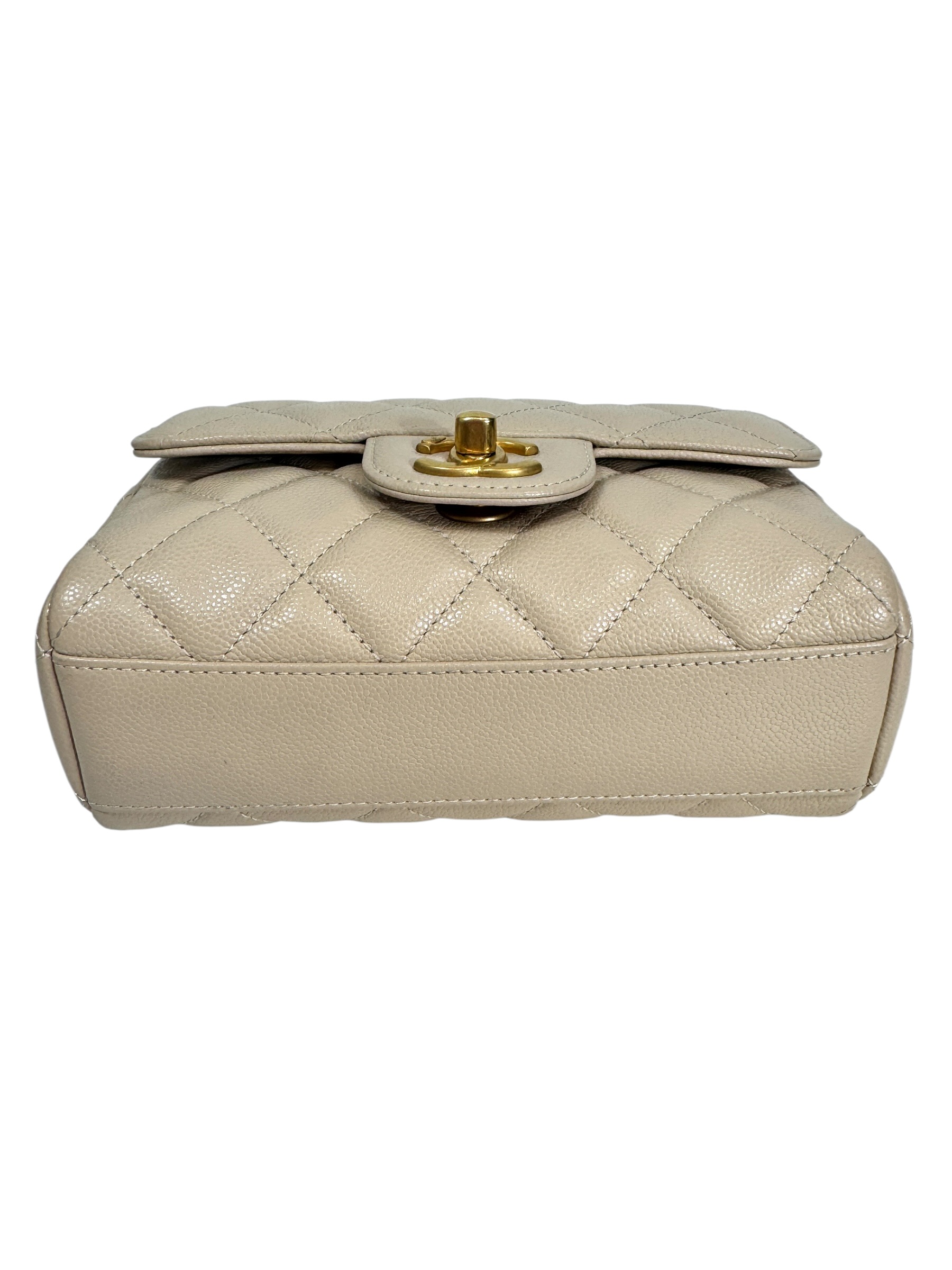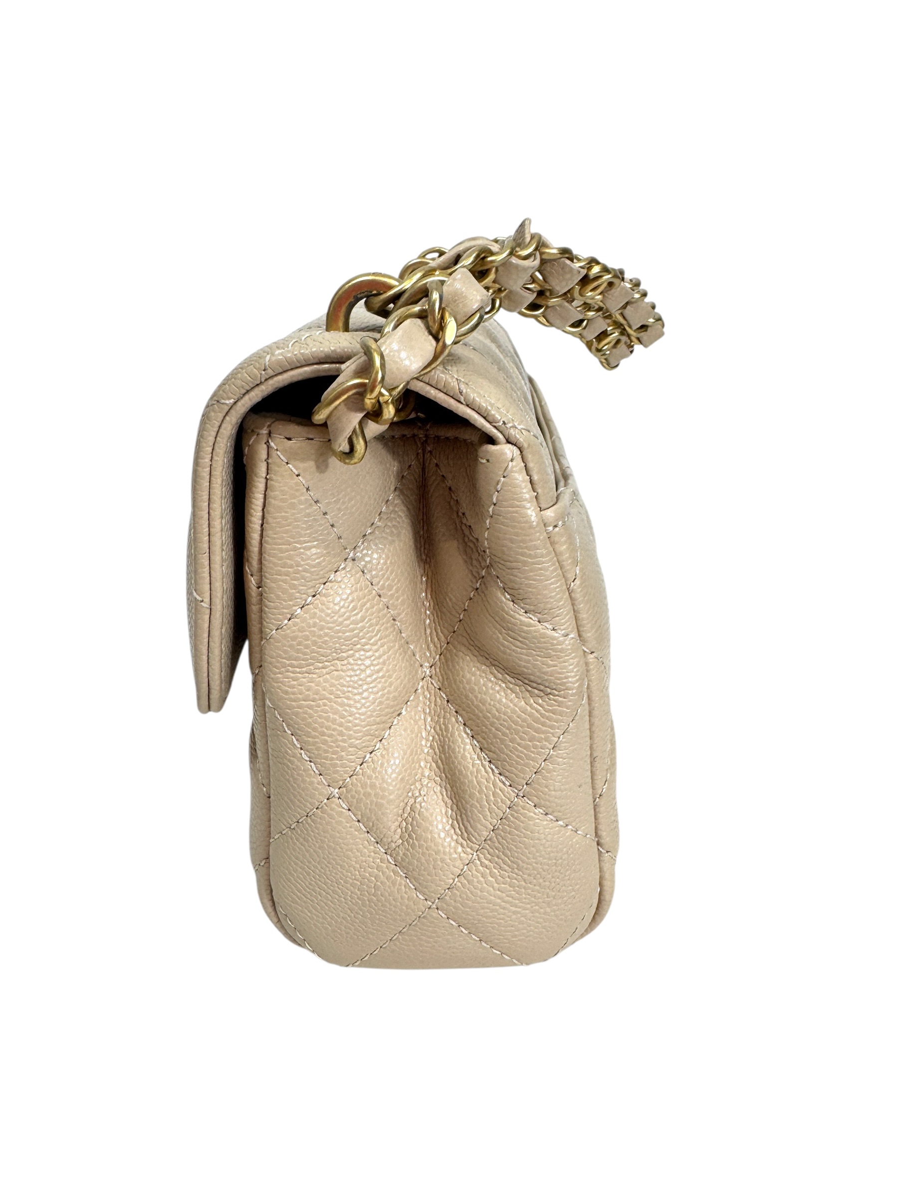 Sac en veau caviar matelassé nude, fermoir « CC » en métal doré vieilli sur rabat, anse bandoulière chaîne entrelacée de cuir en coordonné, double poignée. Puce RFID.