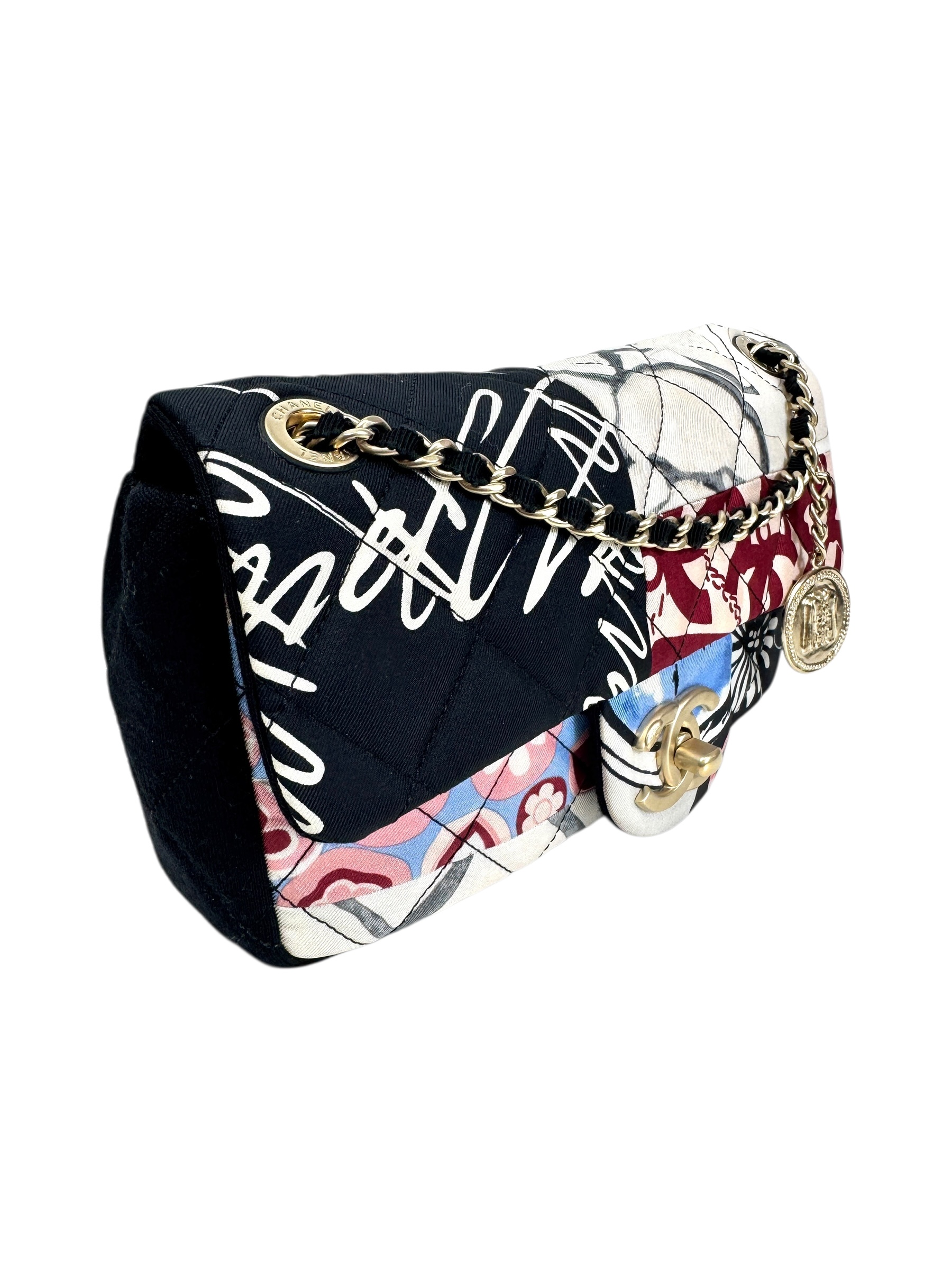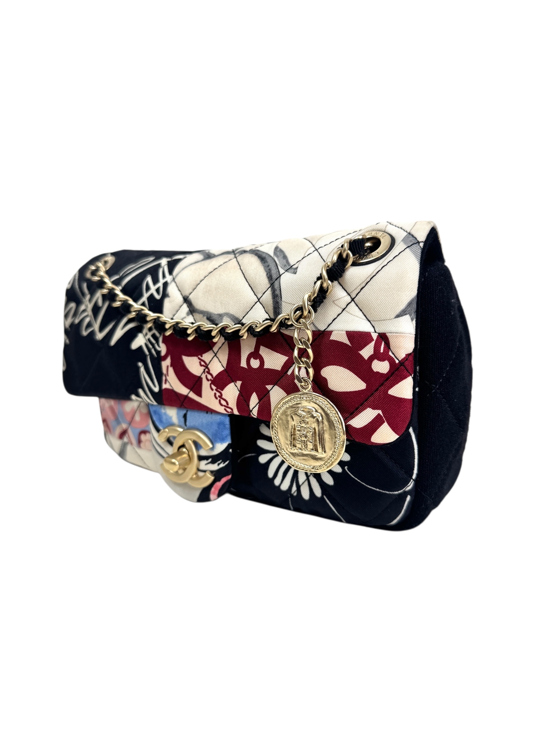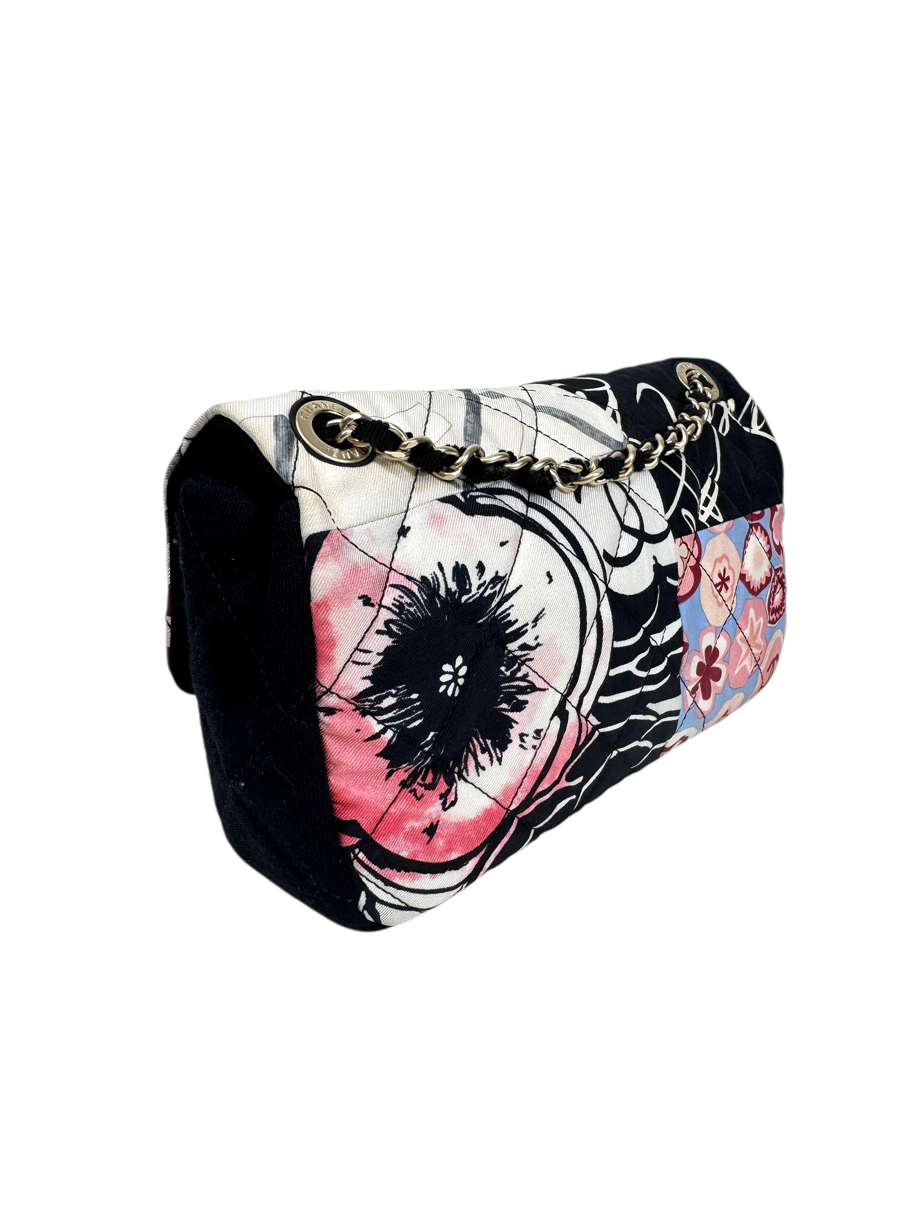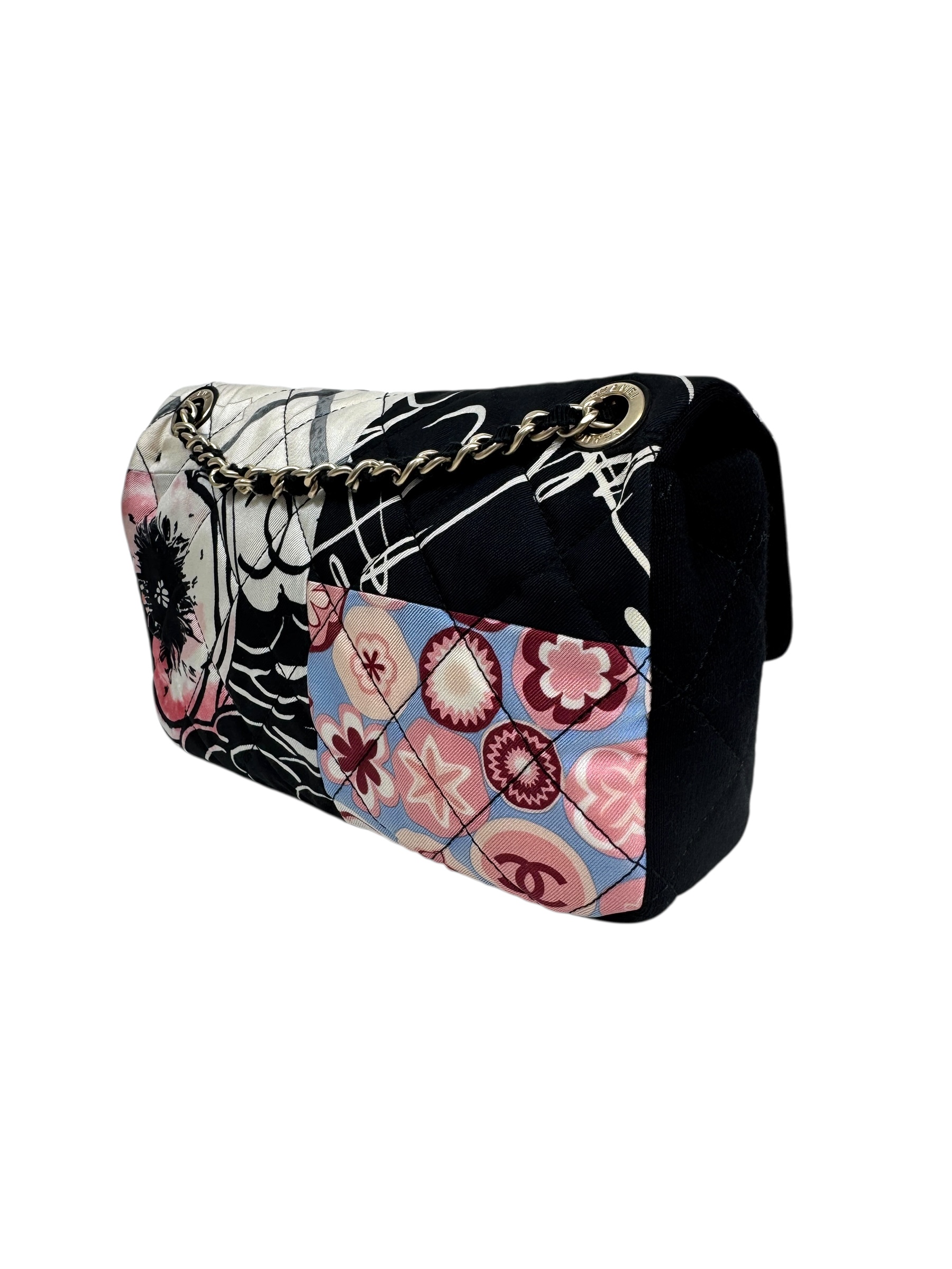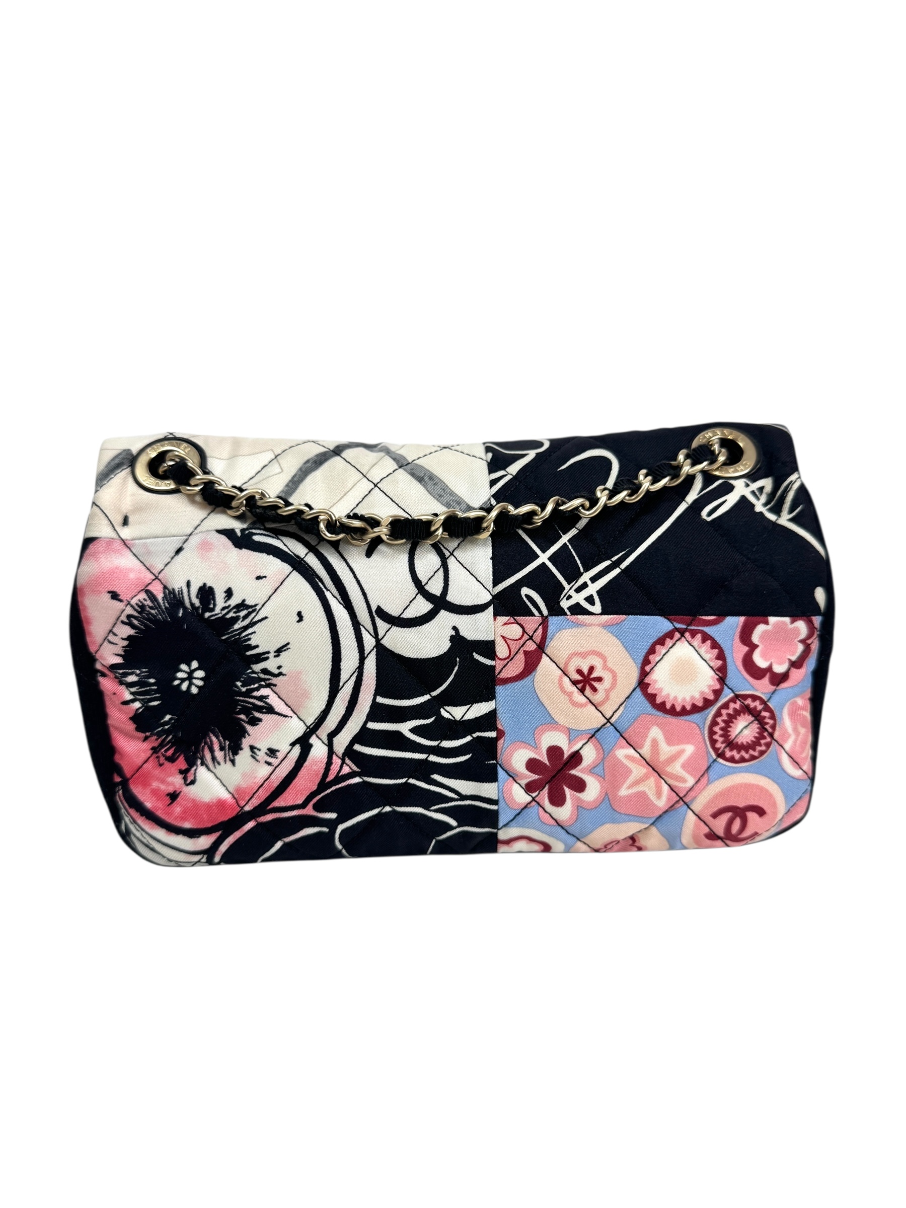 Sac en soie imprimée matelassée multicolore façon patchwork, fermoir « CC » en métal doré amati sur rabat, anse chaîne entrelacée de gros grain noir. Hologramme. (Provenance des ventes privées).