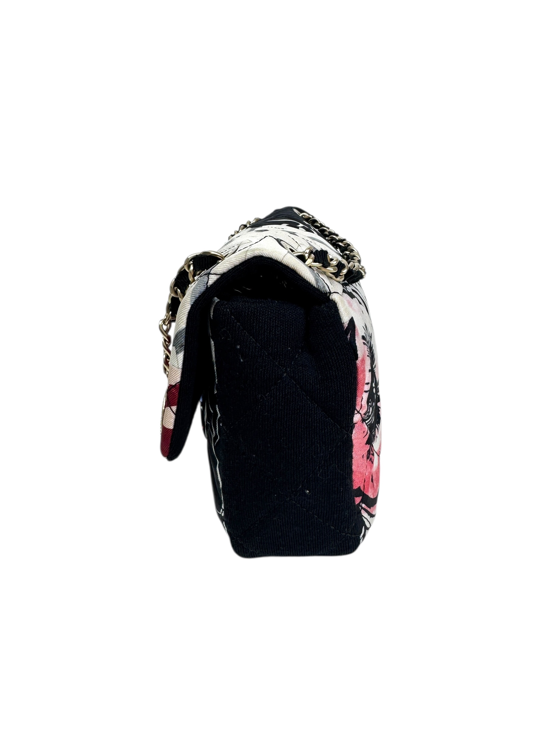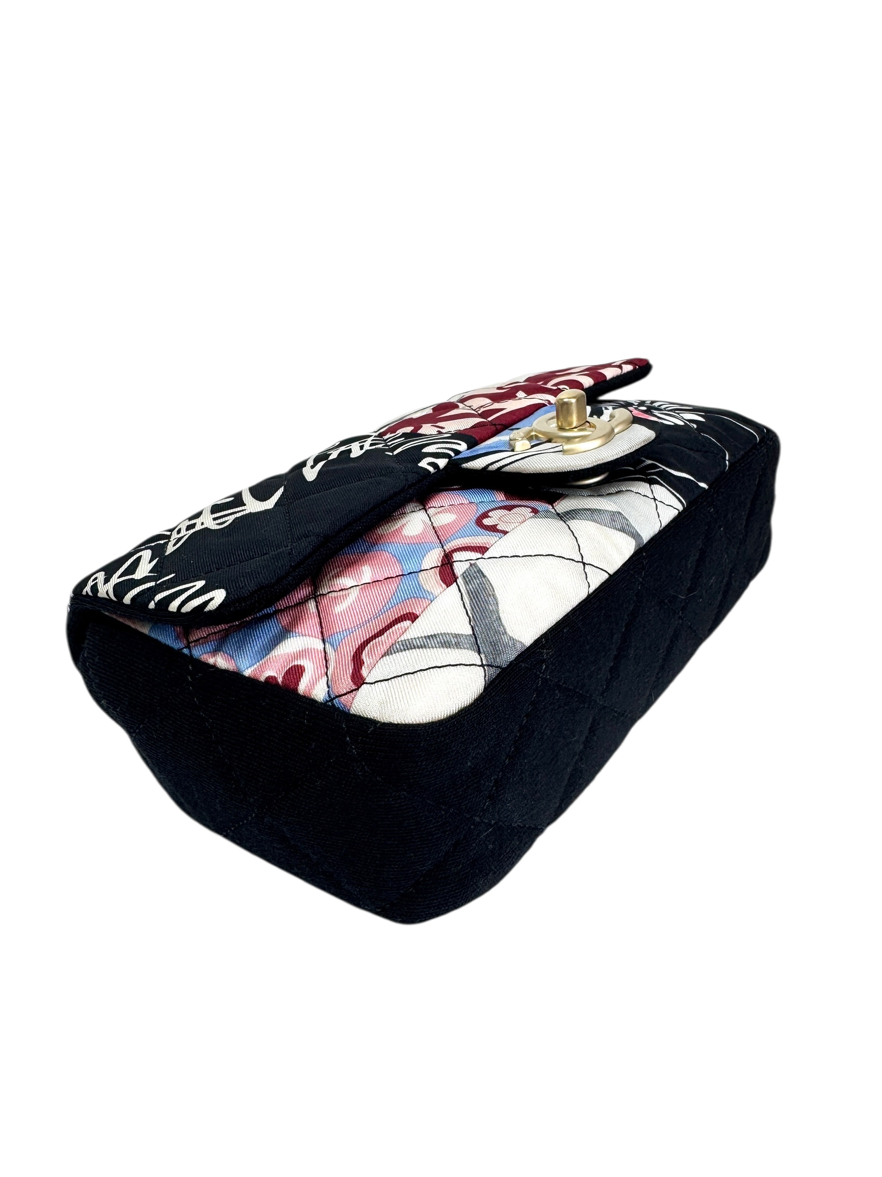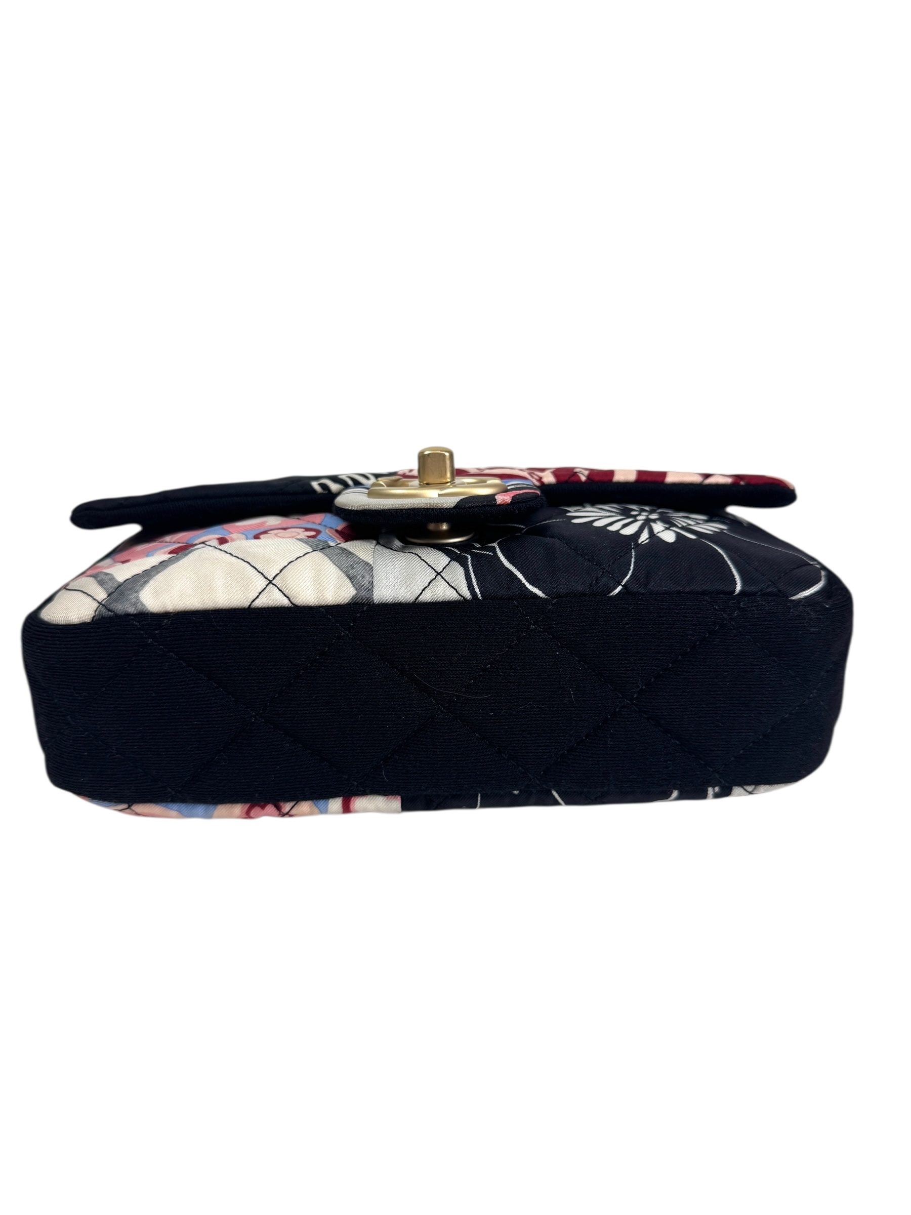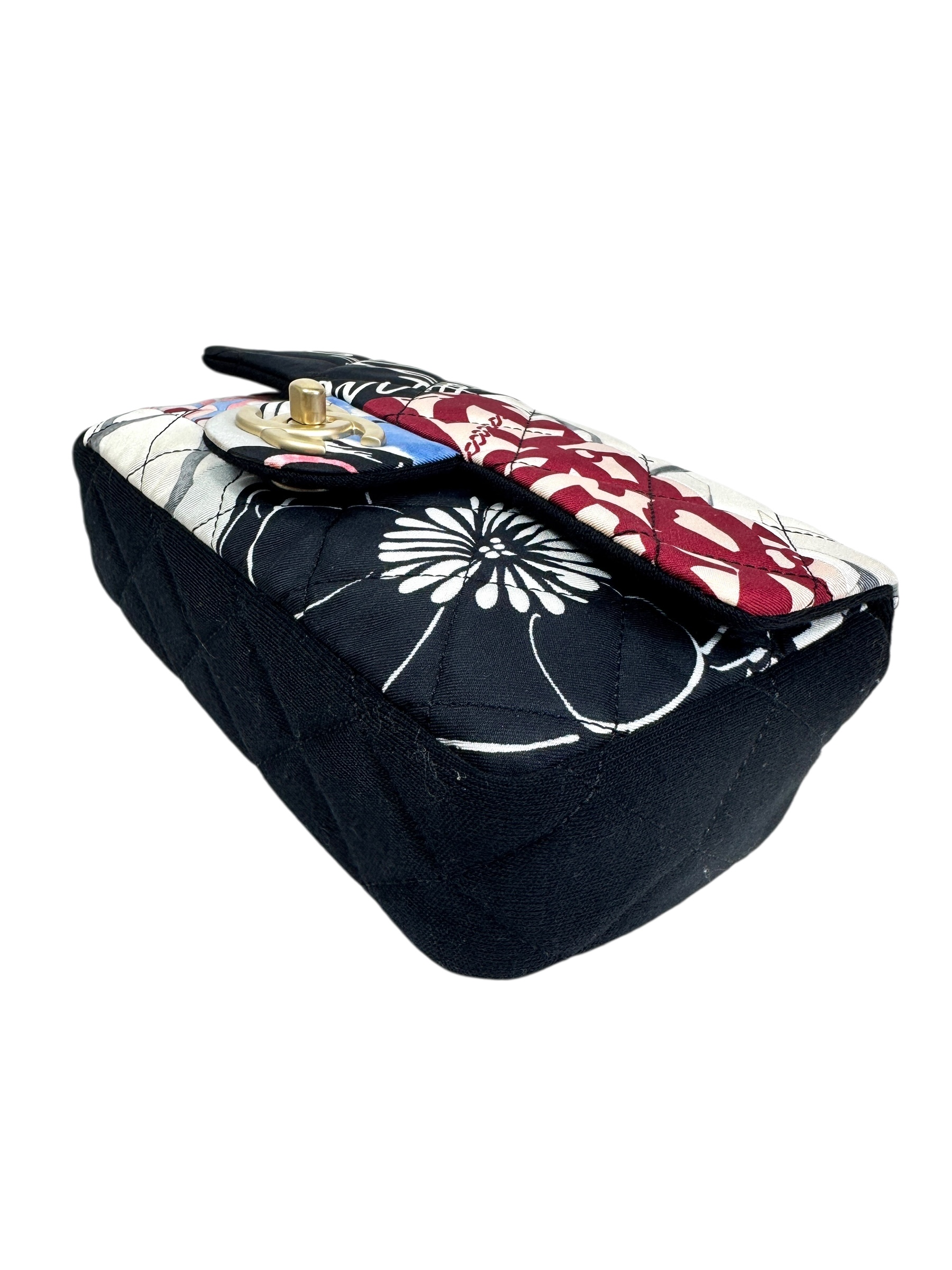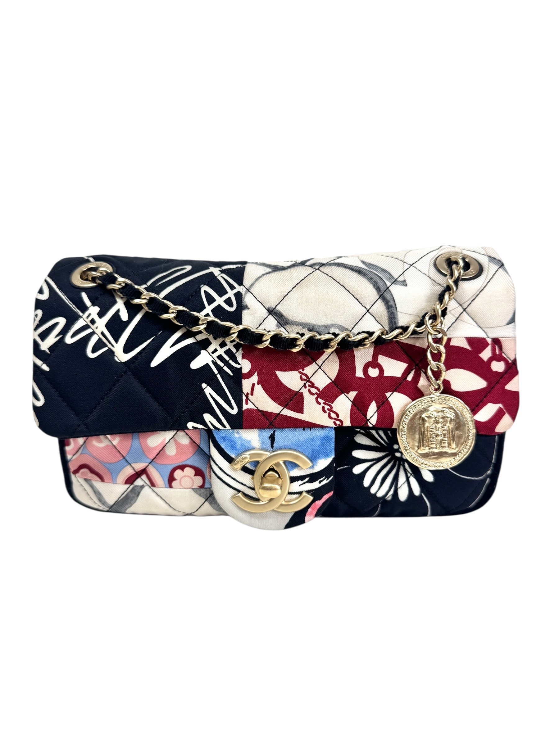 Sac en soie imprimée matelassée multicolore façon patchwork, fermoir « CC » en métal doré amati sur rabat, anse chaîne entrelacée de gros grain noir. Hologramme. (Provenance des ventes privées).