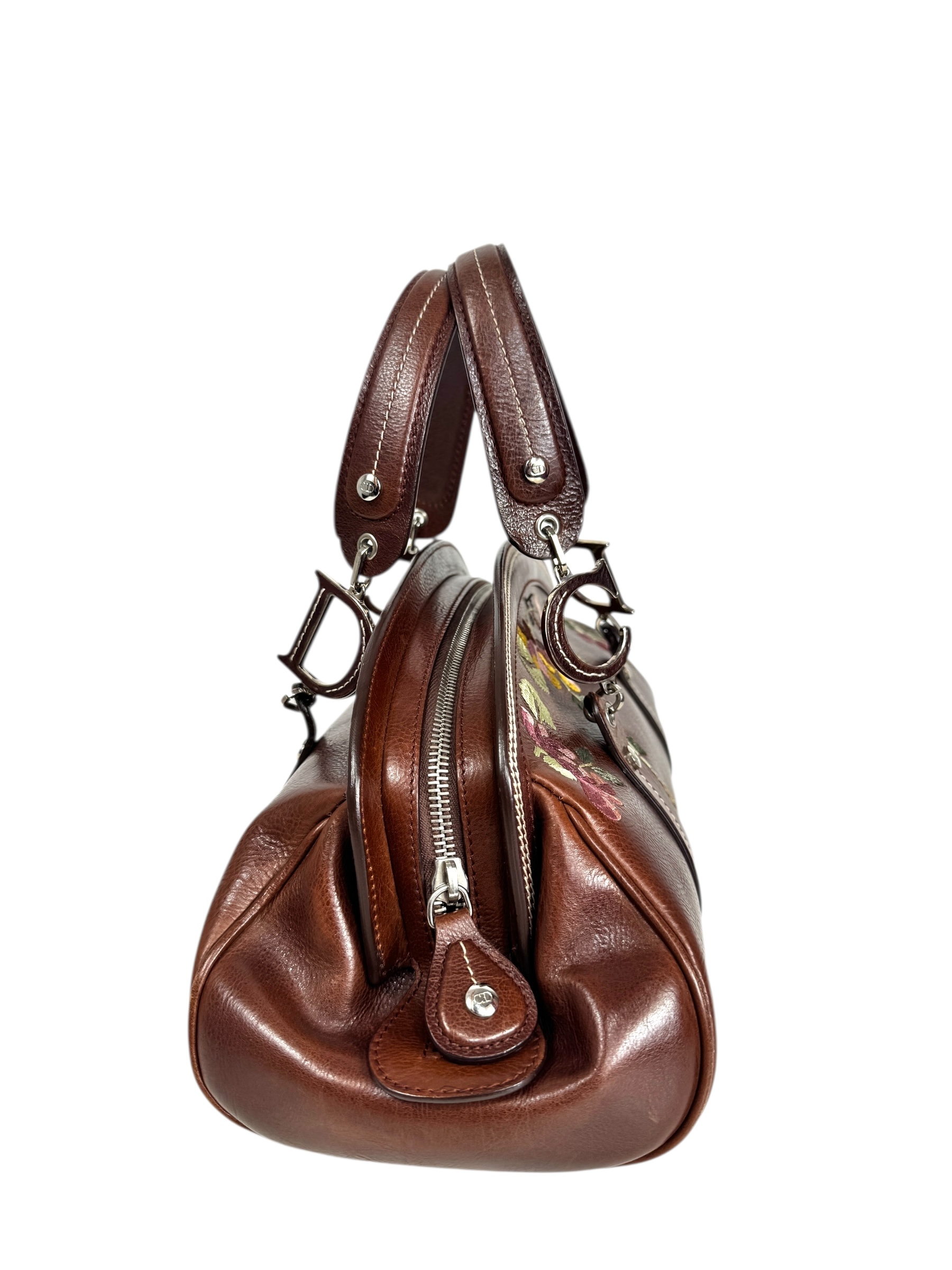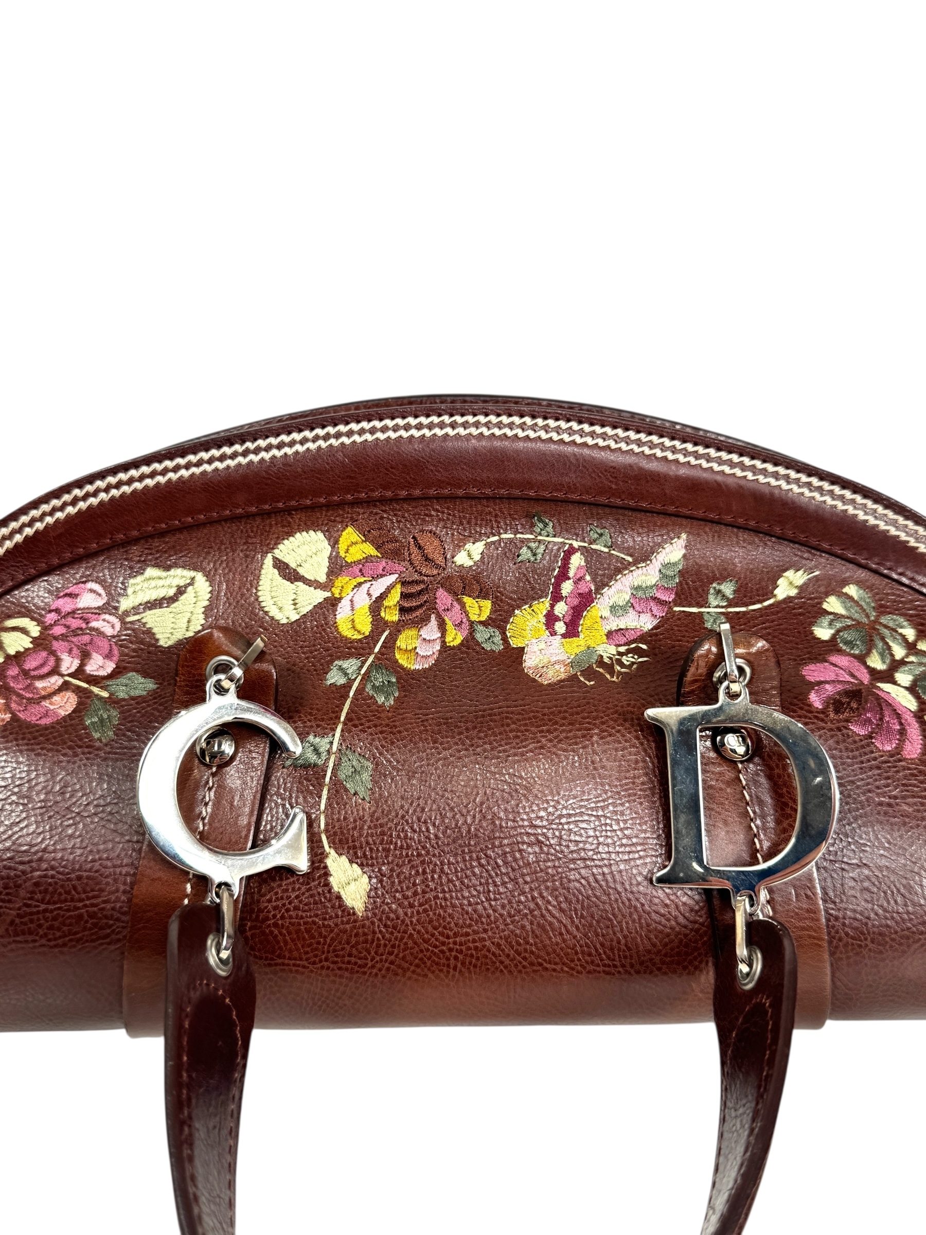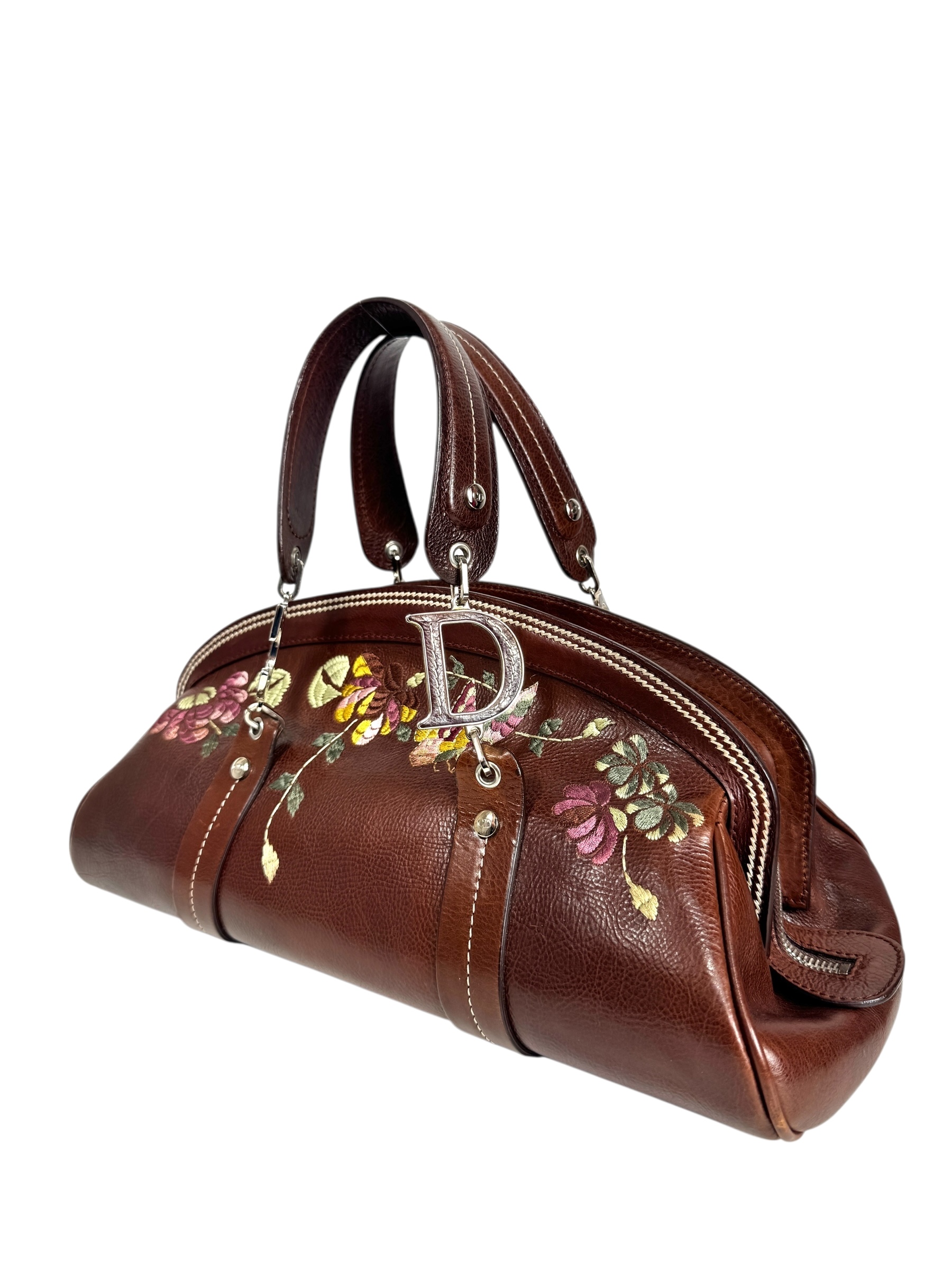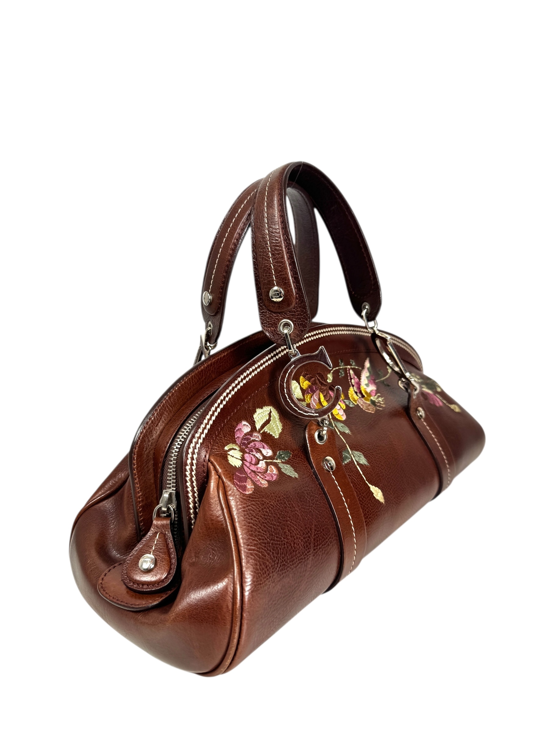 Sac « Détective » en veau café rebrodé de fleurs, fermeture éclair, double anse initiales.