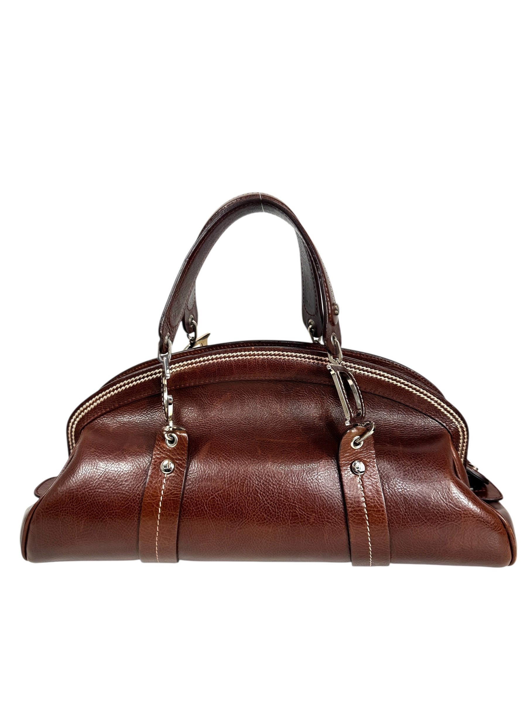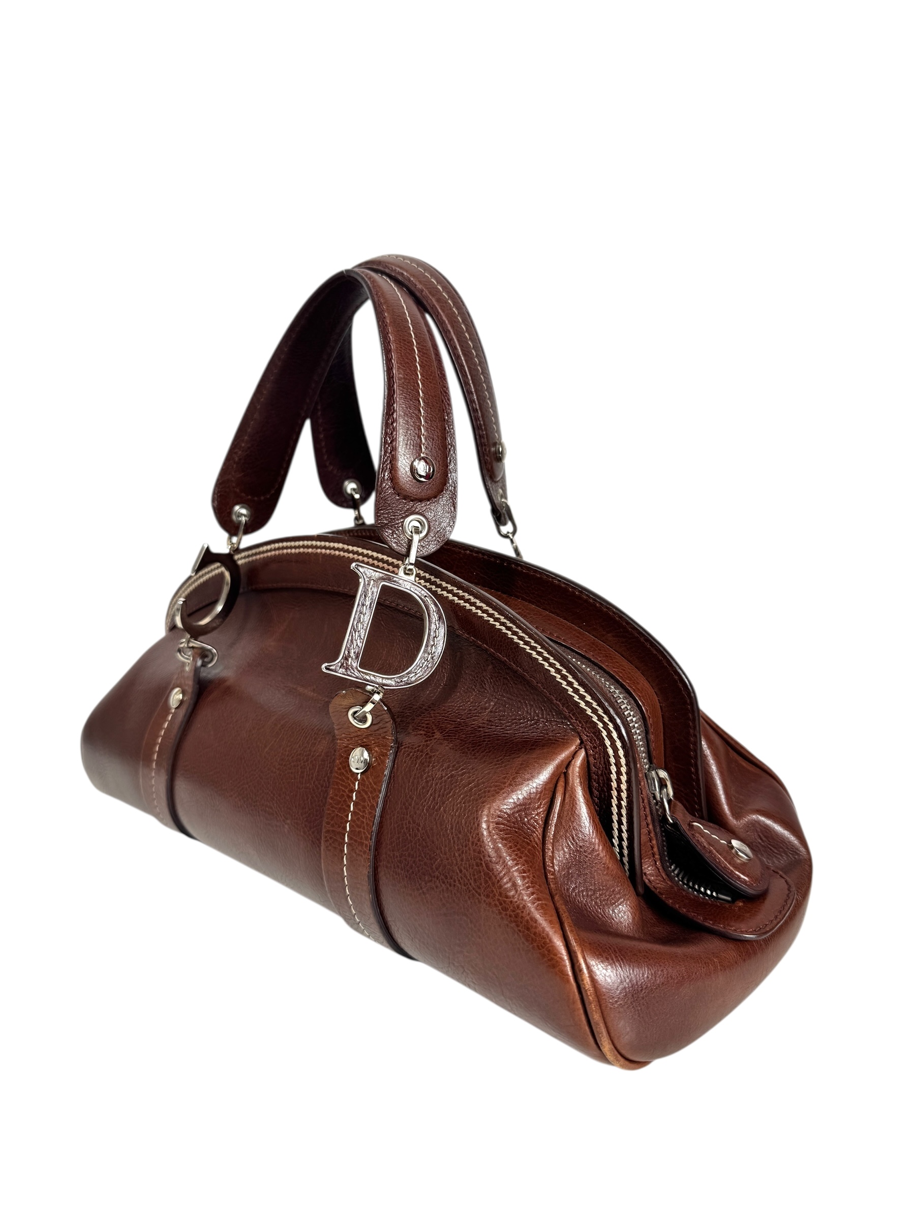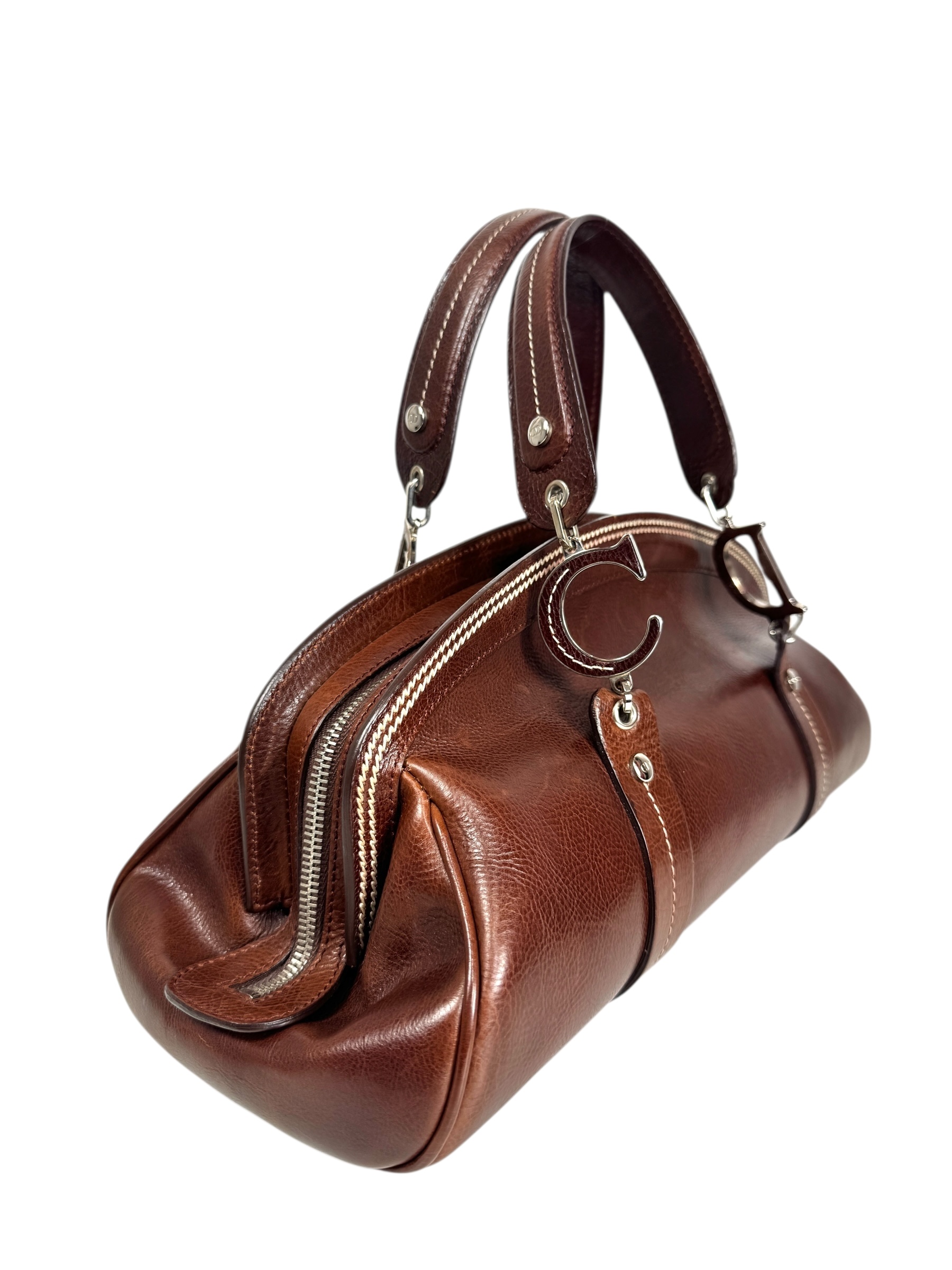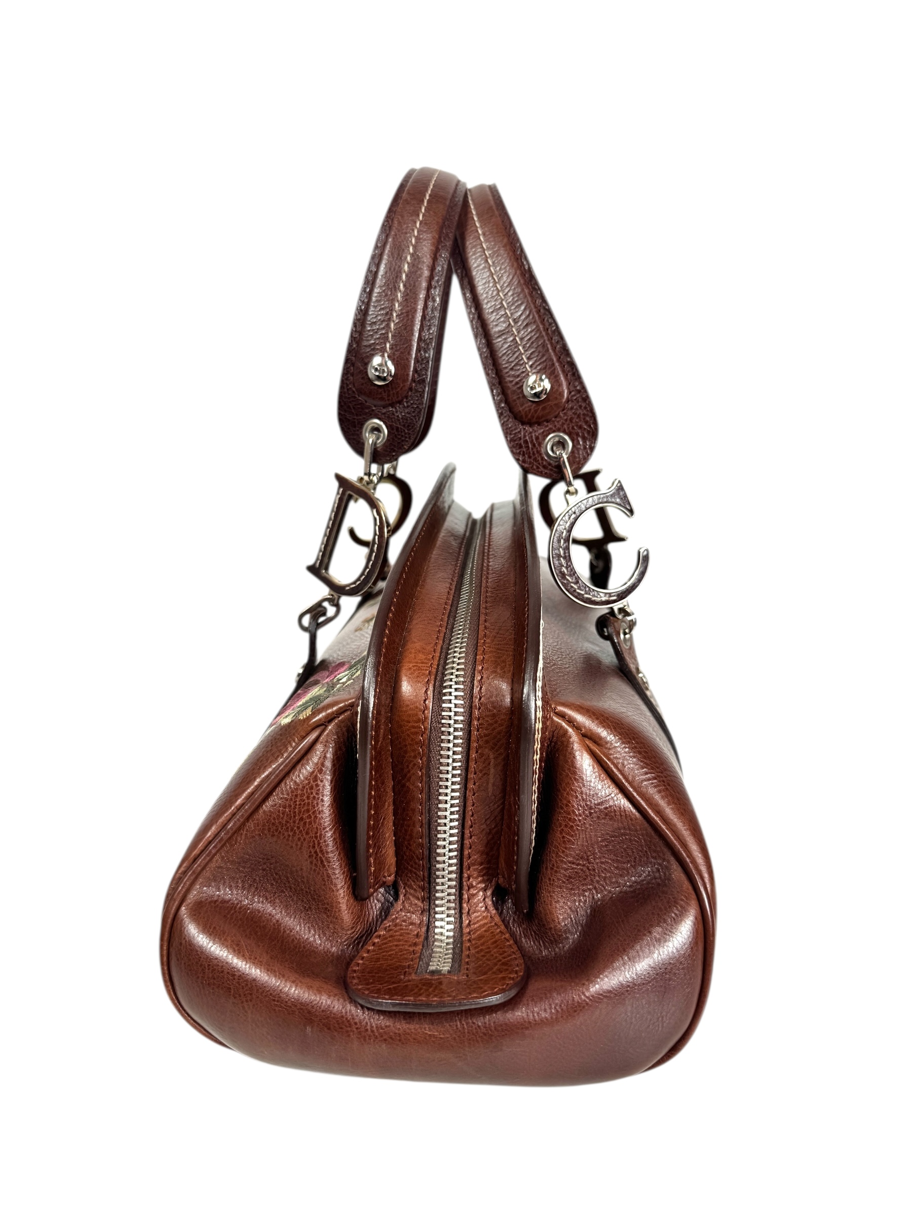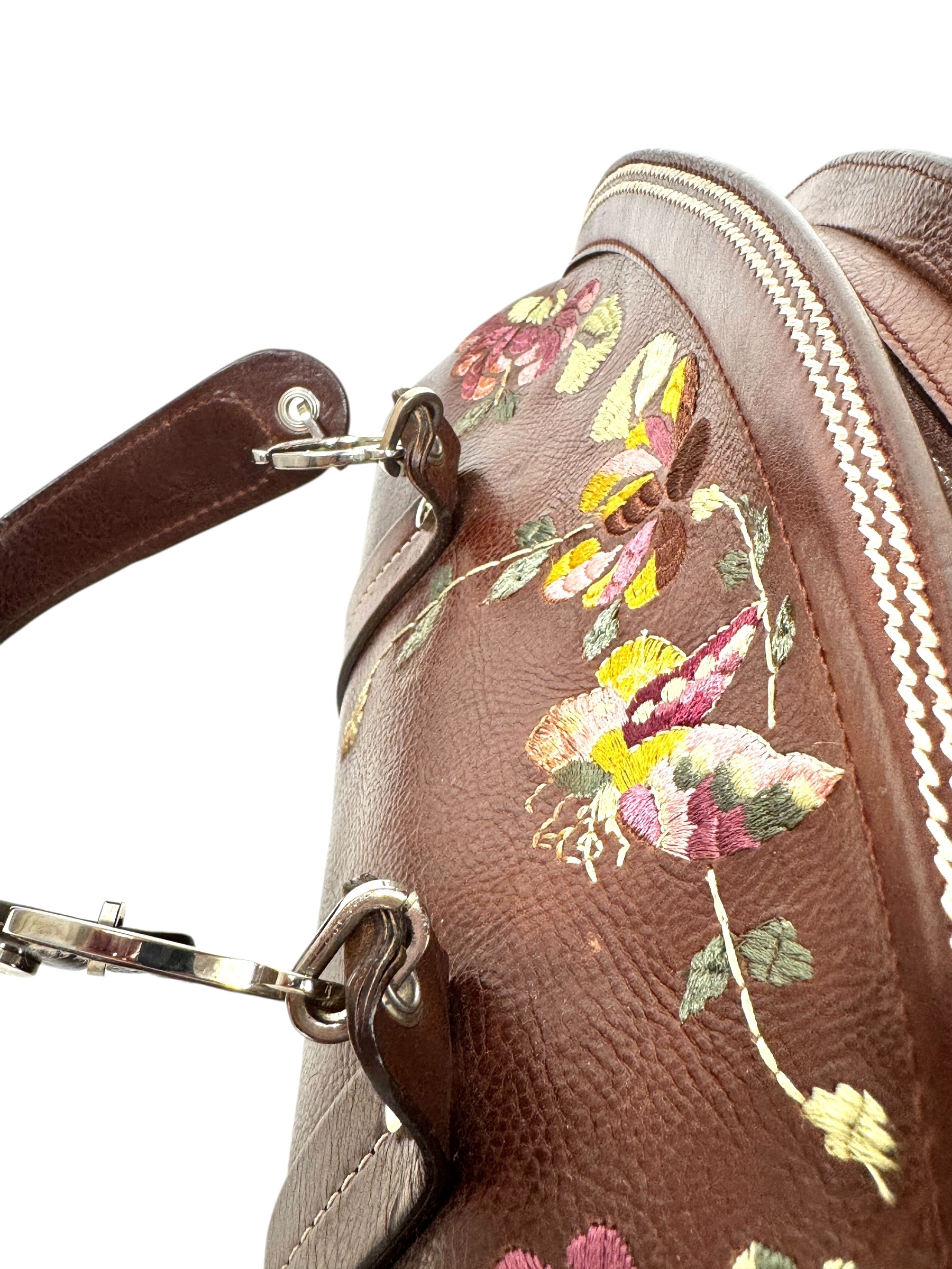 Sac « Détective » en veau café rebrodé de fleurs, fermeture éclair, double anse initiales.
