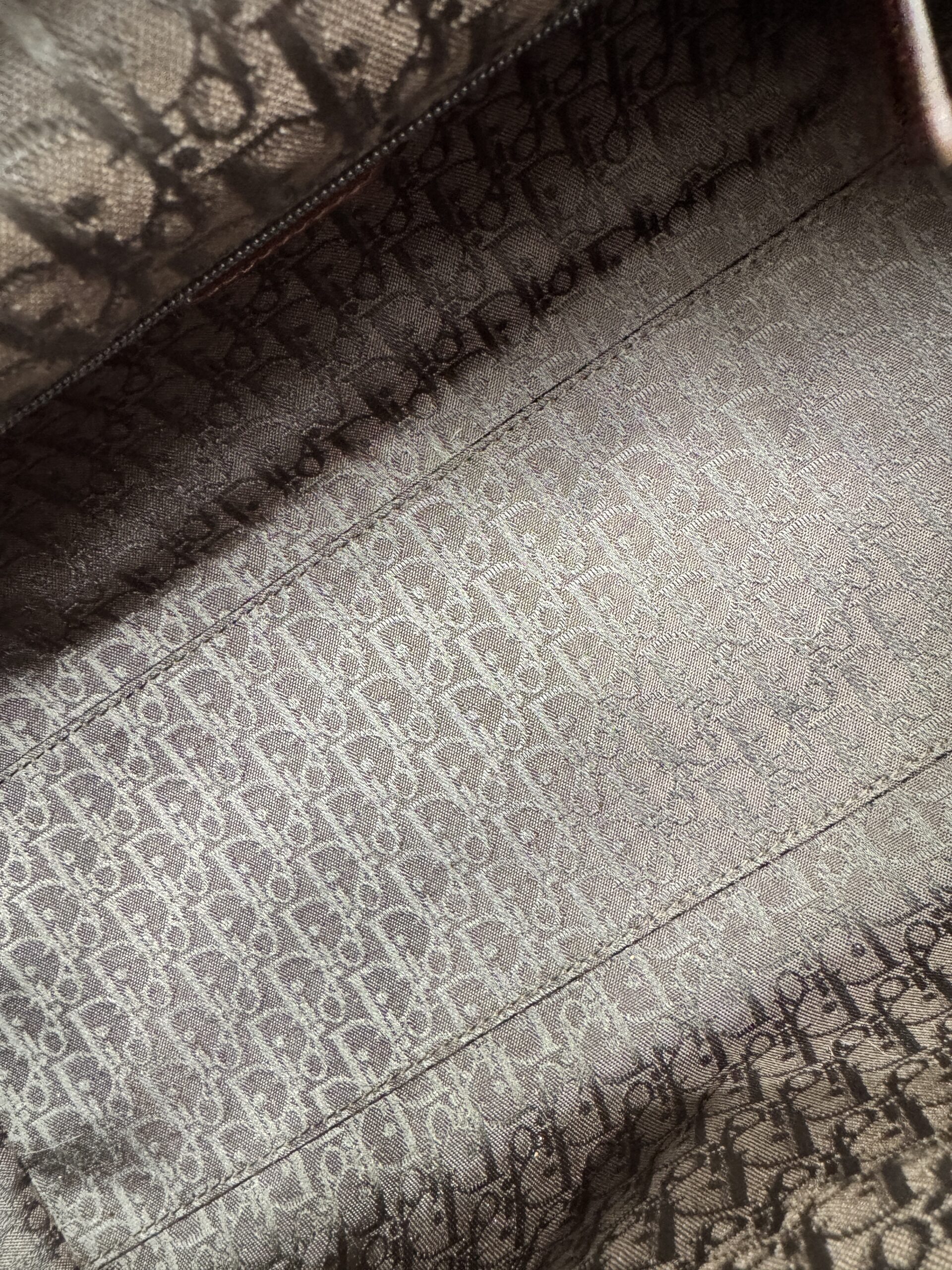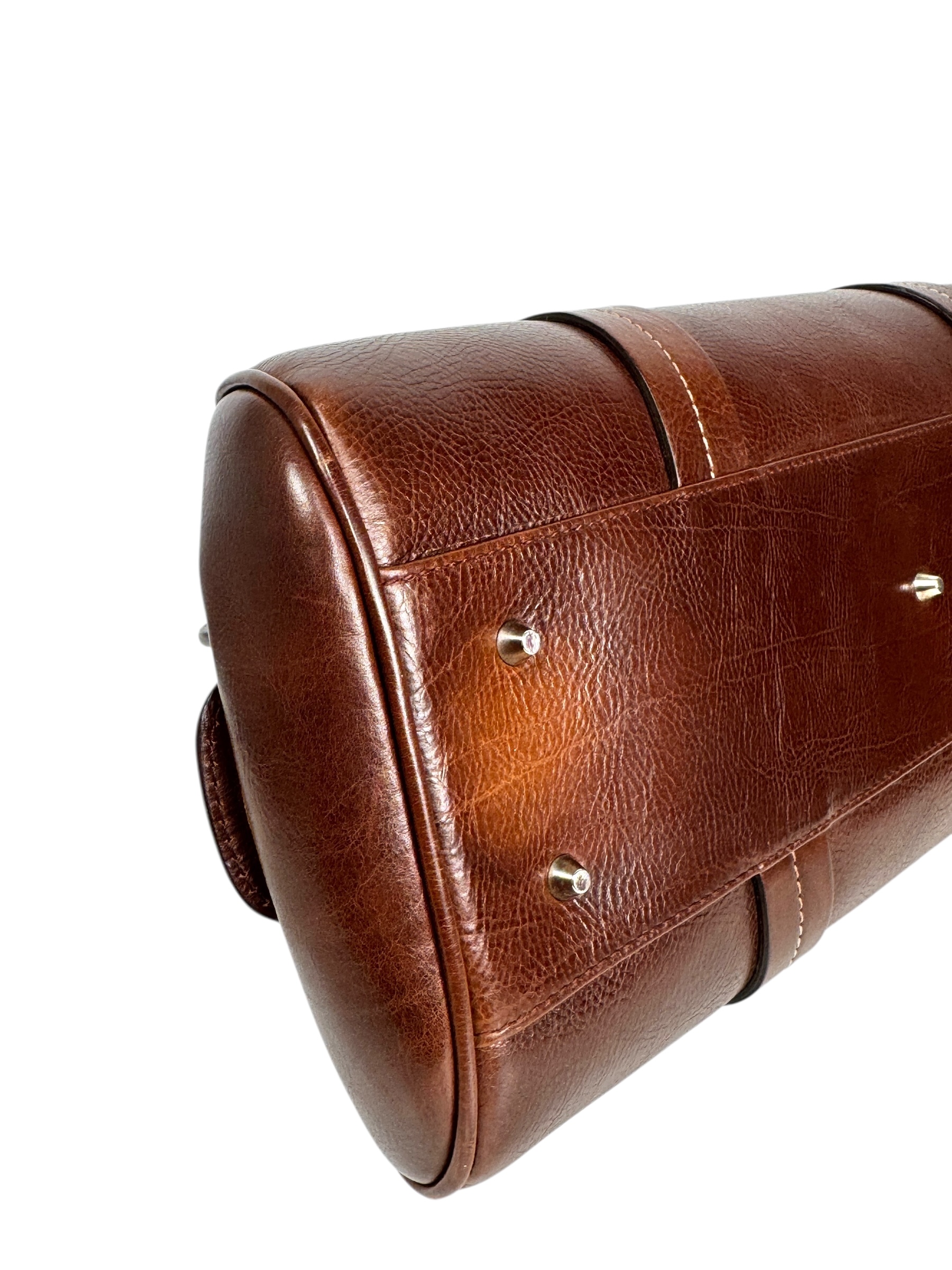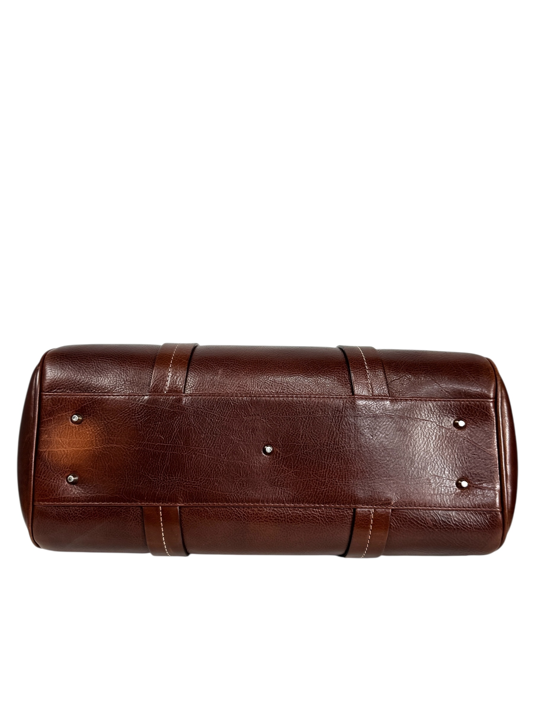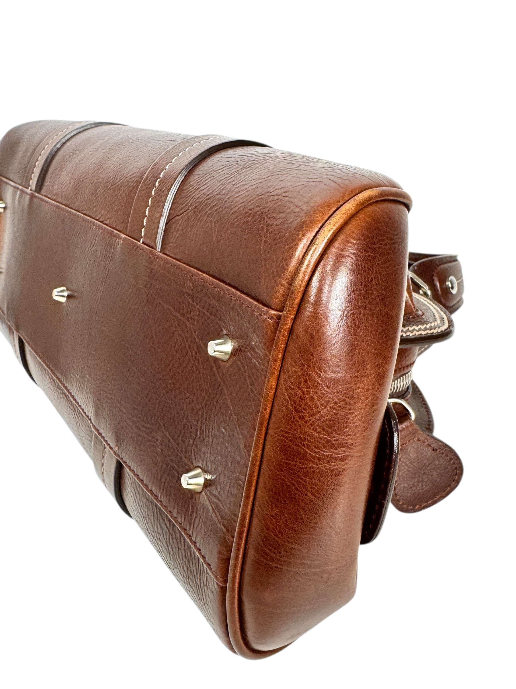 Sac « Détective » en veau café rebrodé de fleurs, fermeture éclair, double anse initiales.