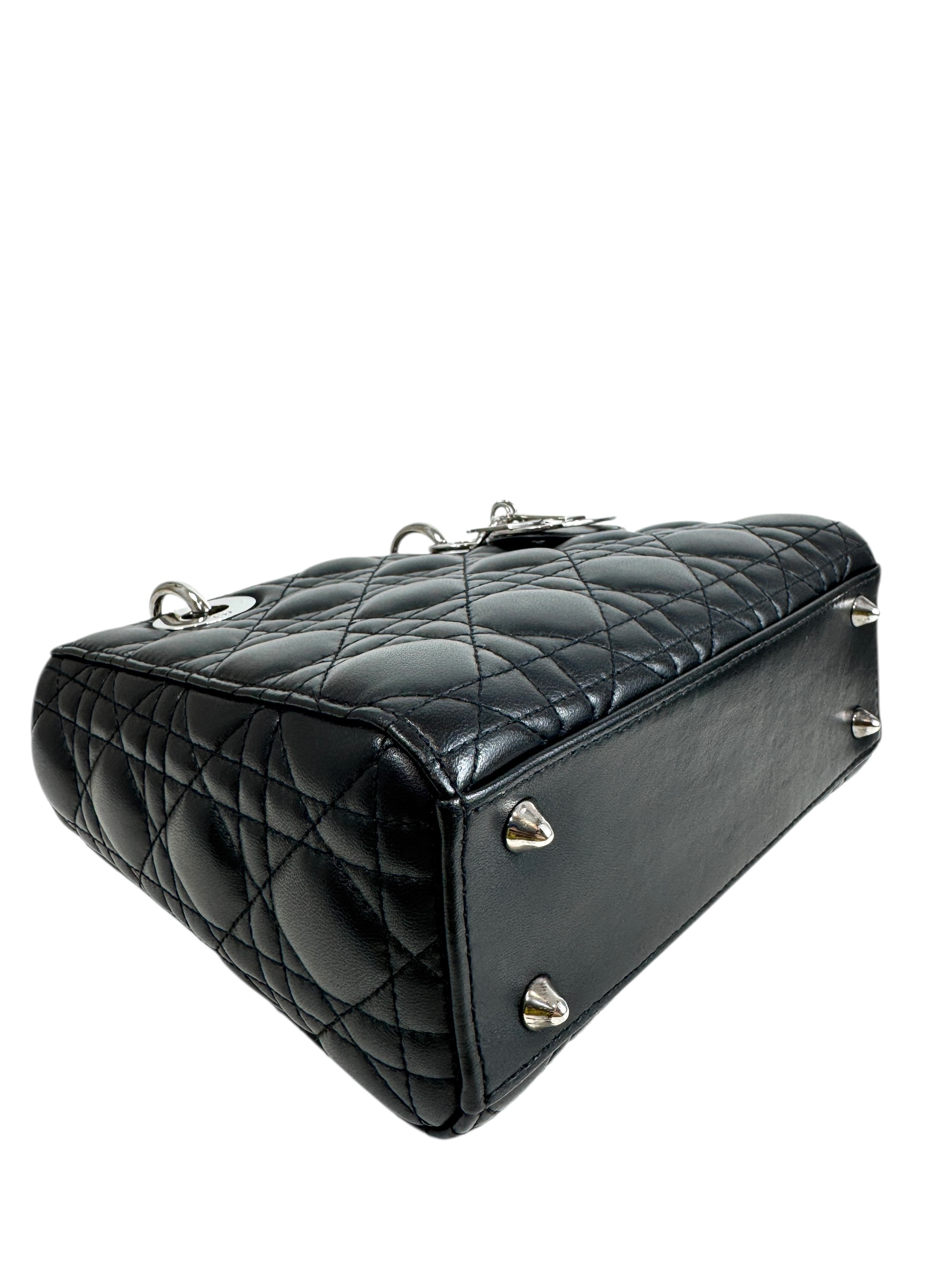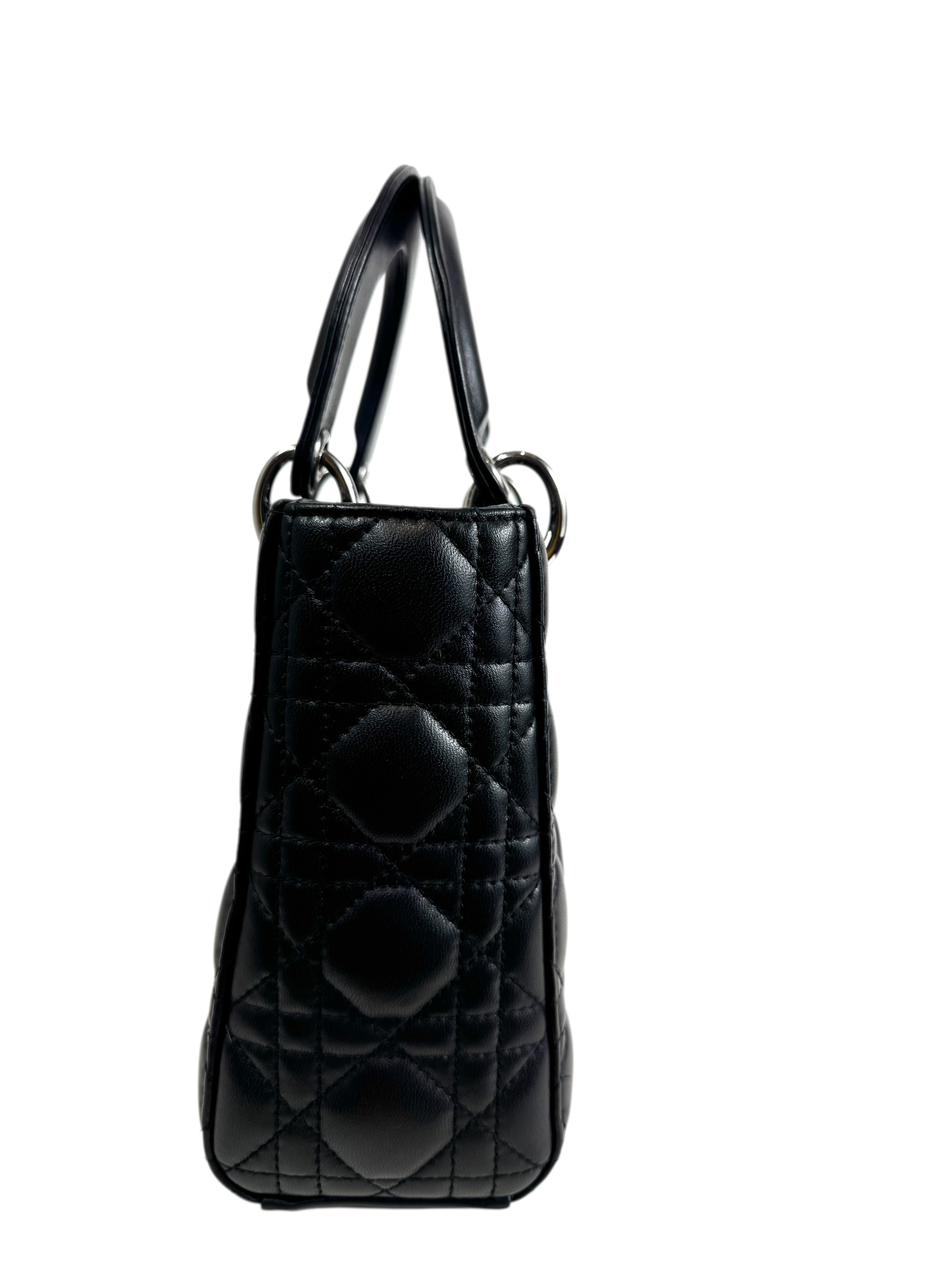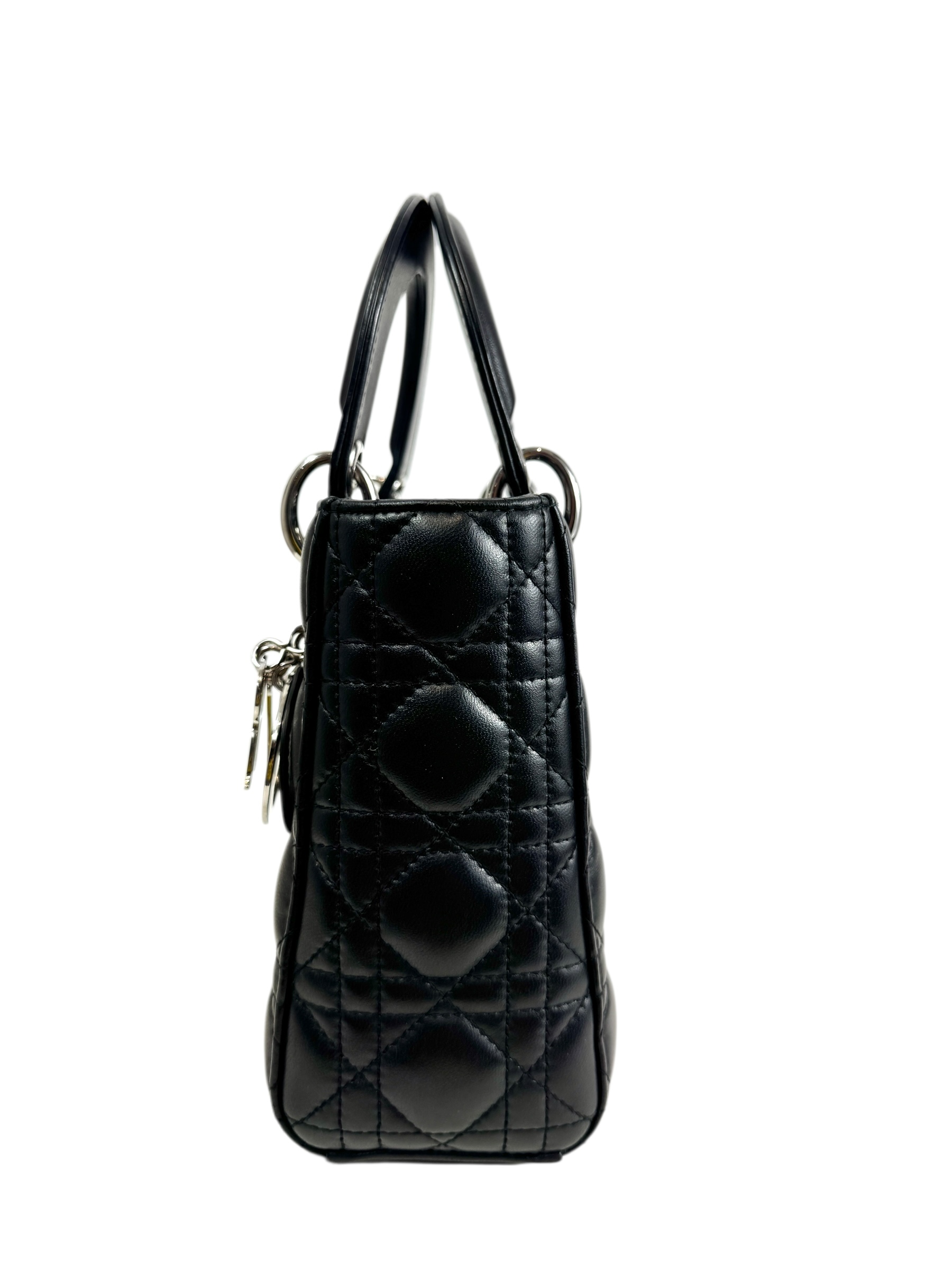 Sac « Lady Dior » Small en cuir agneau noir à surpiqures cannage, rabat, rabat, double poignée dont une retenant des breloques abécédaires, anse bandoulière « ABCDior ».