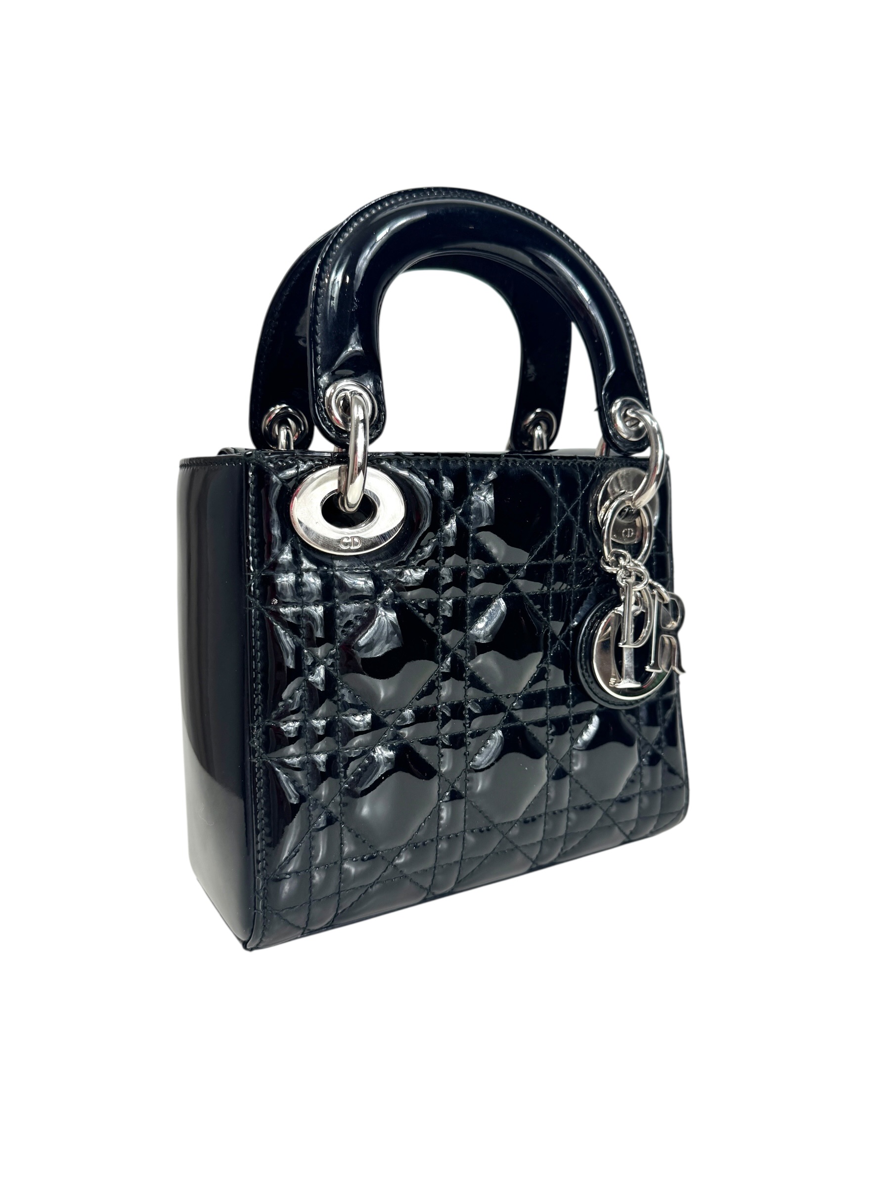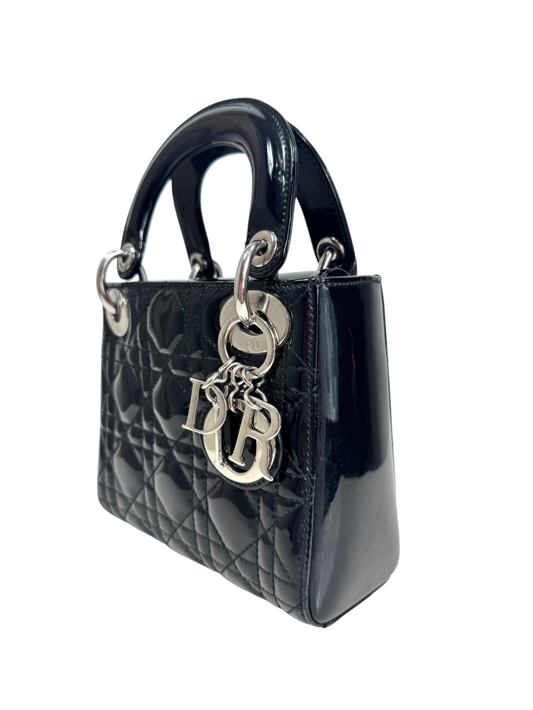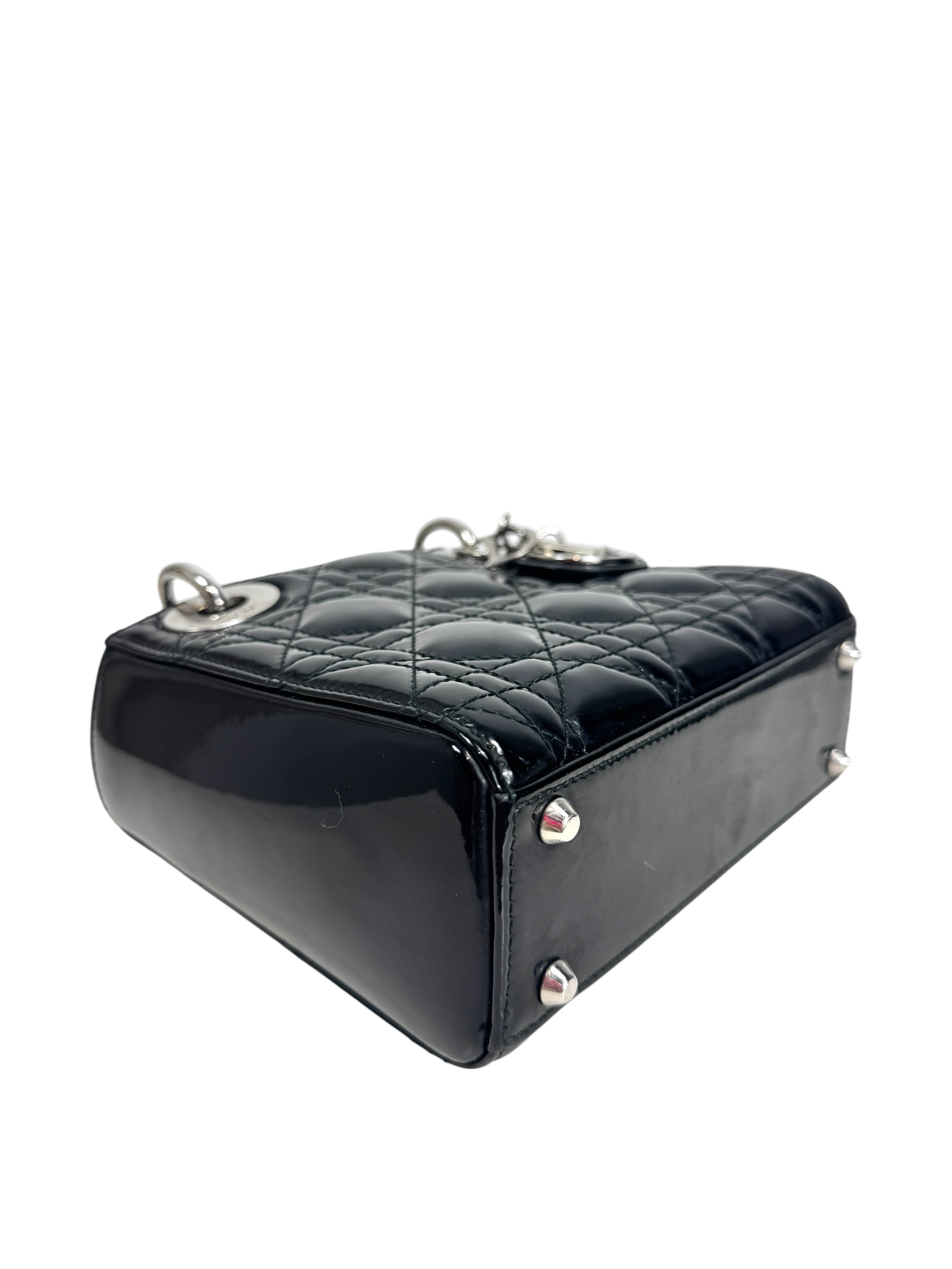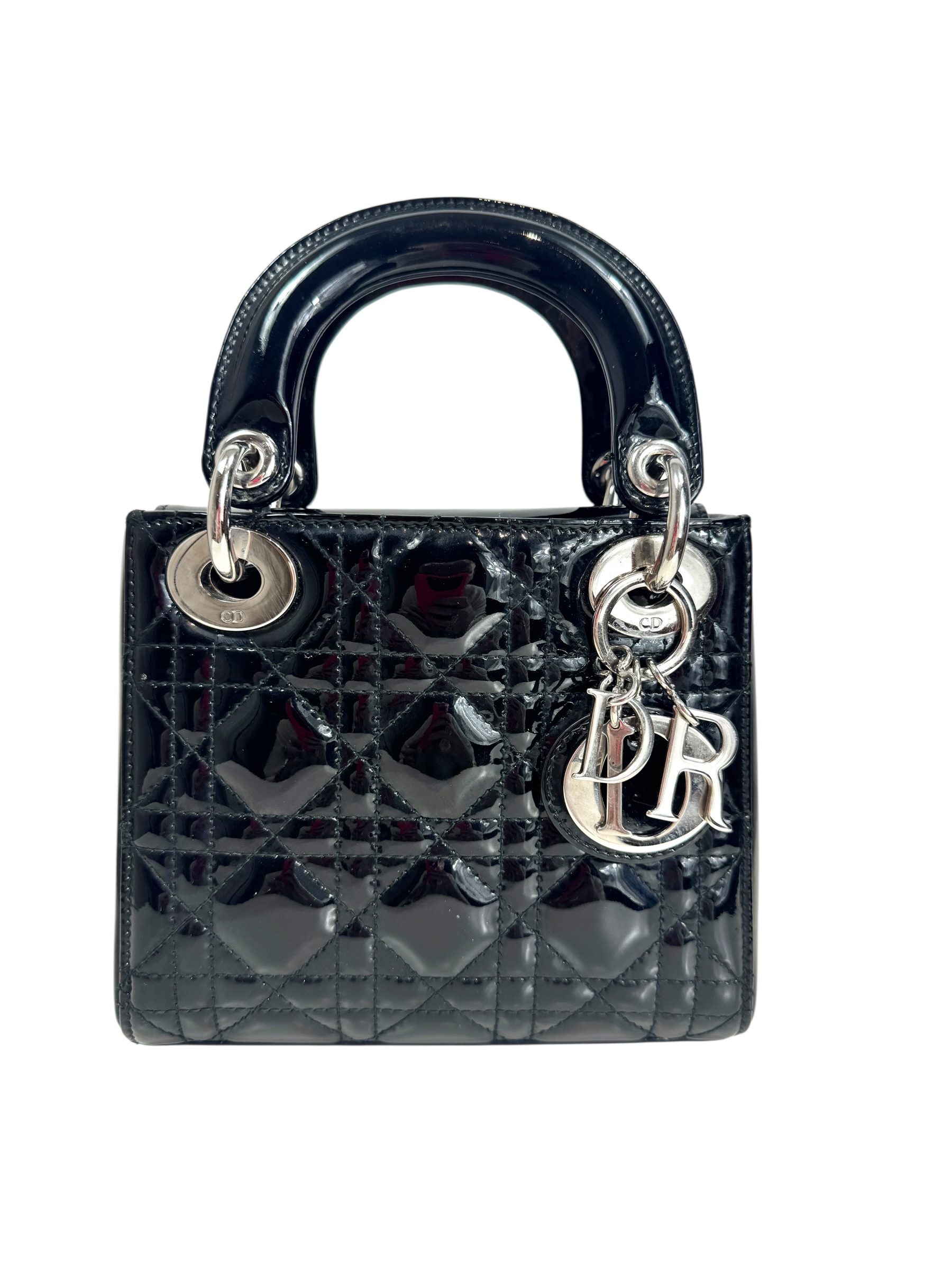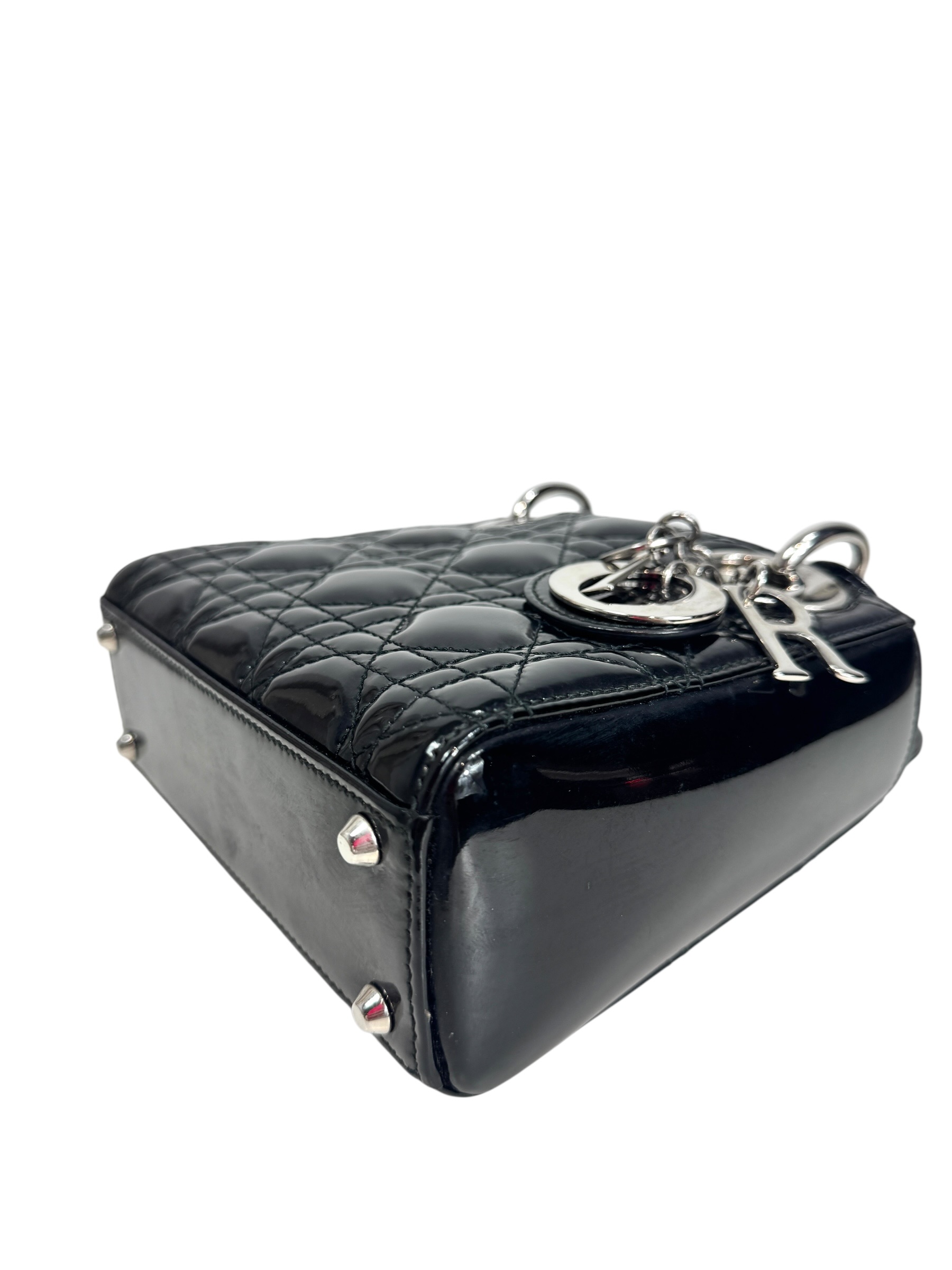 Sac « Lady Dior » mini en cuir verni noir à surpiqures cannages, rabat, double poignée dont une retenant des breloques abécédaires au nom de la Maison, anse bandoulière amovible.