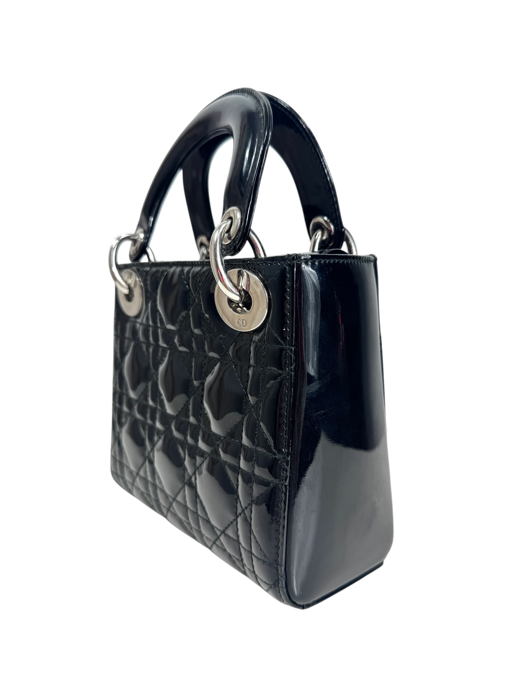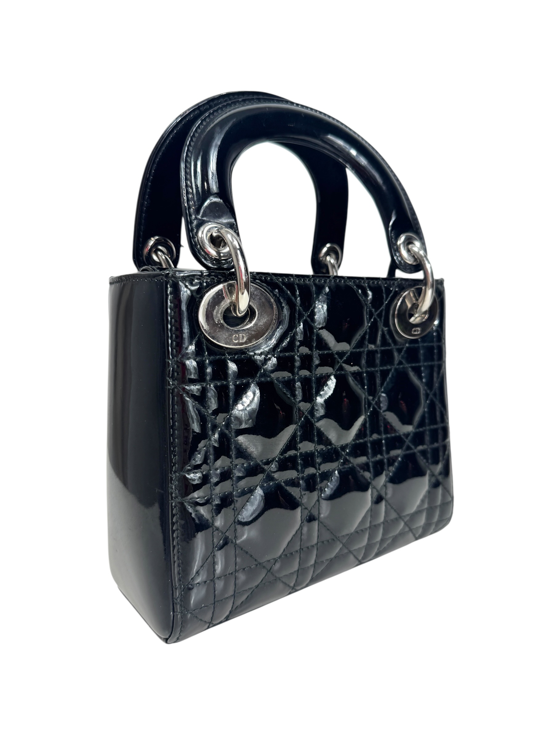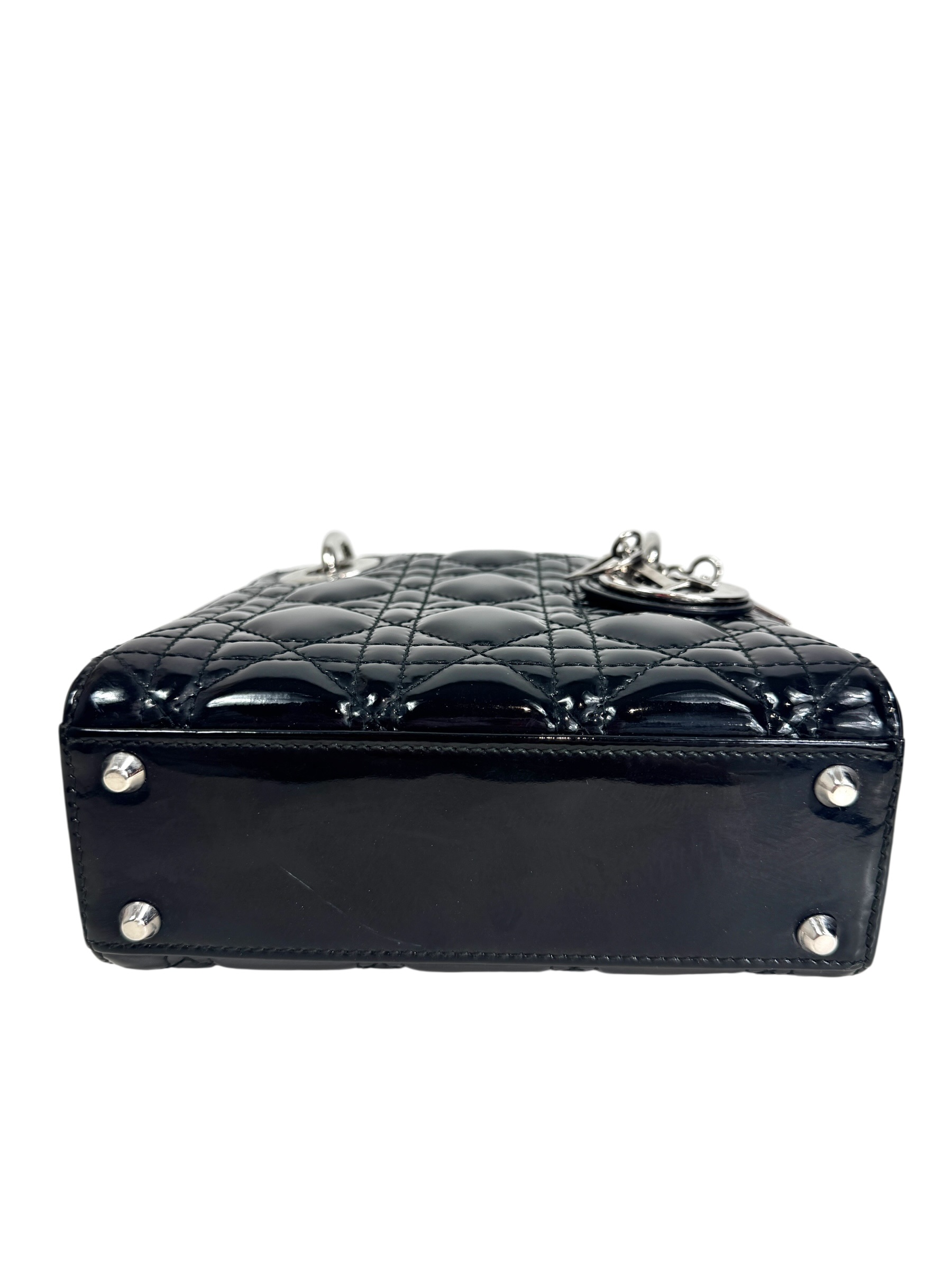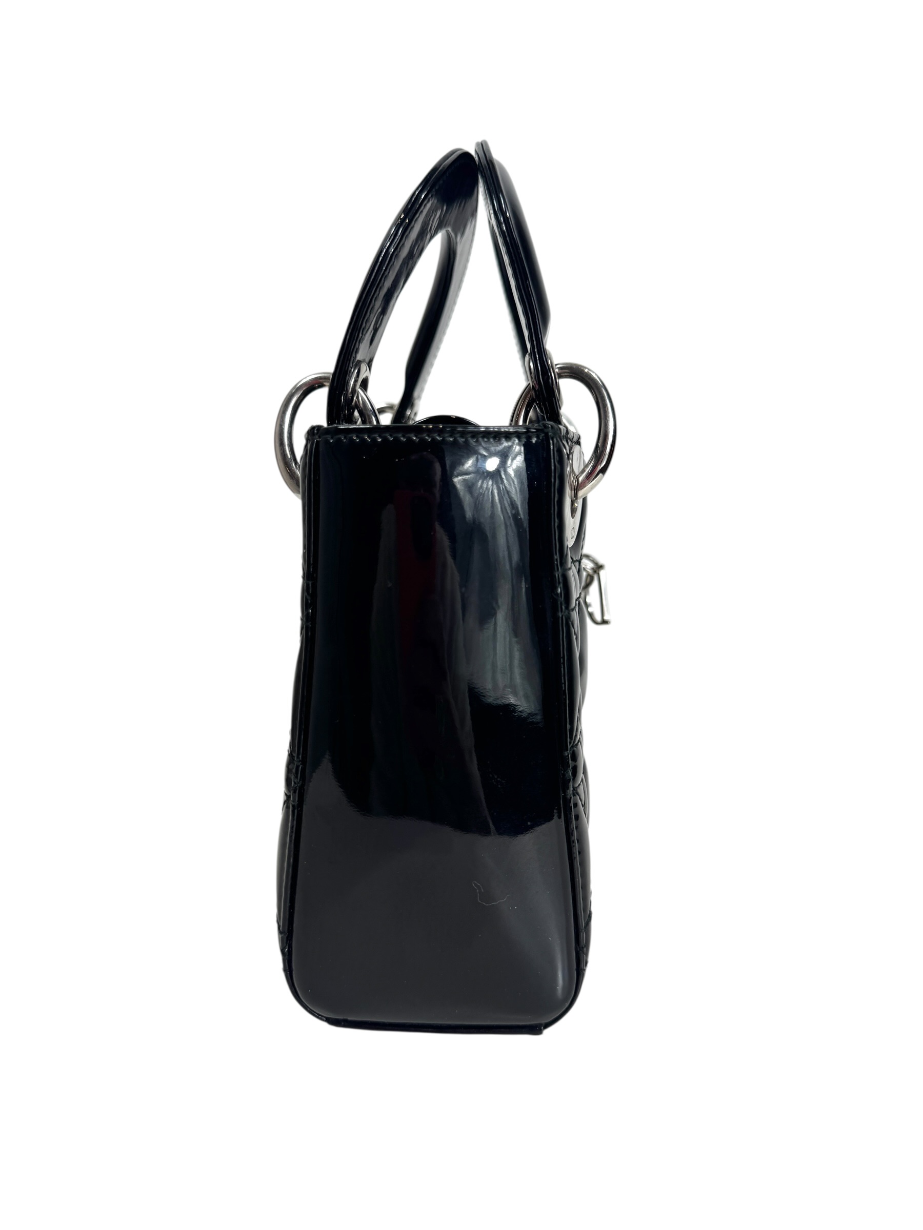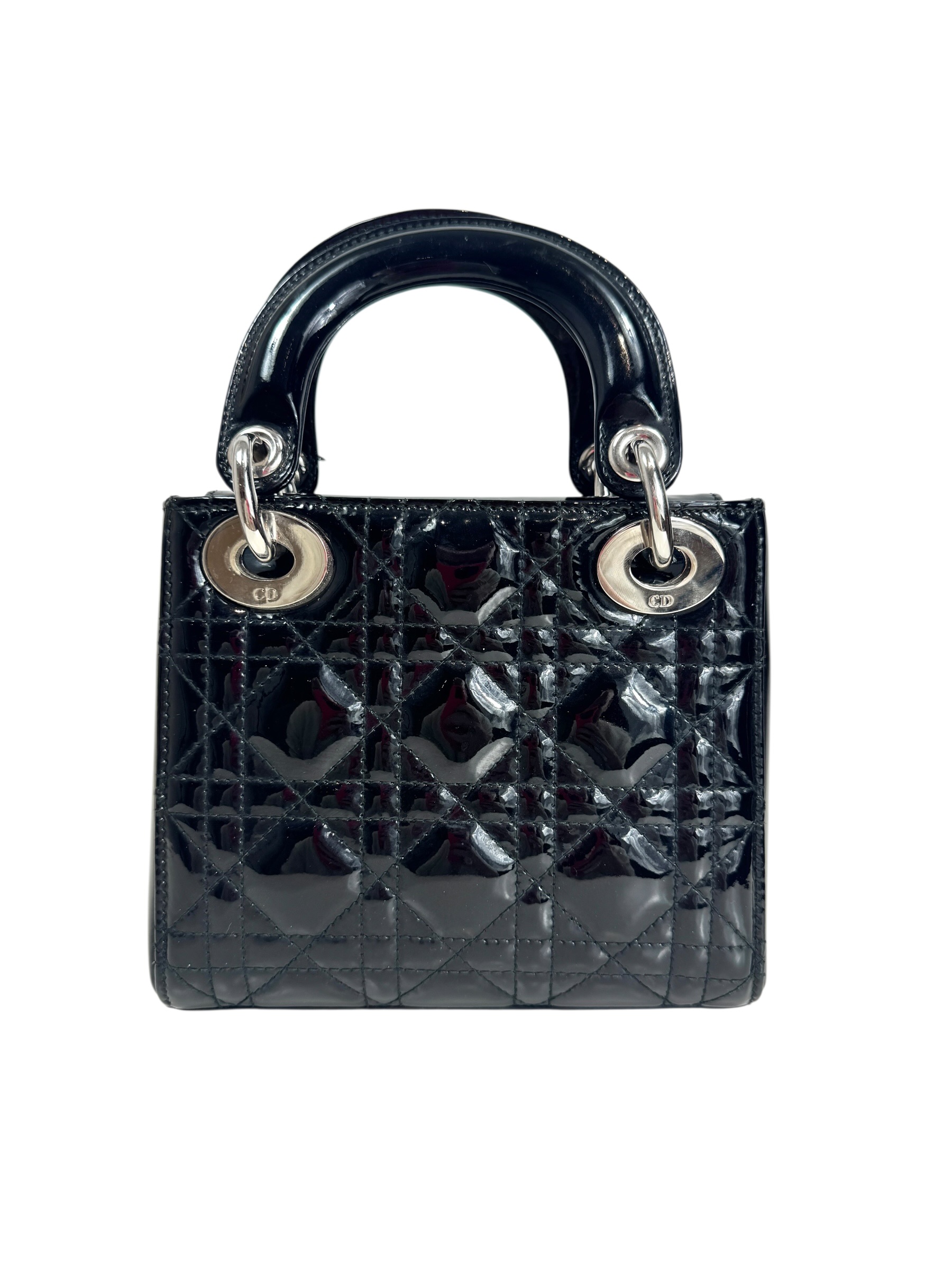 Sac « Lady Dior » mini en cuir verni noir à surpiqures cannages, rabat, double poignée dont une retenant des breloques abécédaires au nom de la Maison, anse bandoulière amovible.