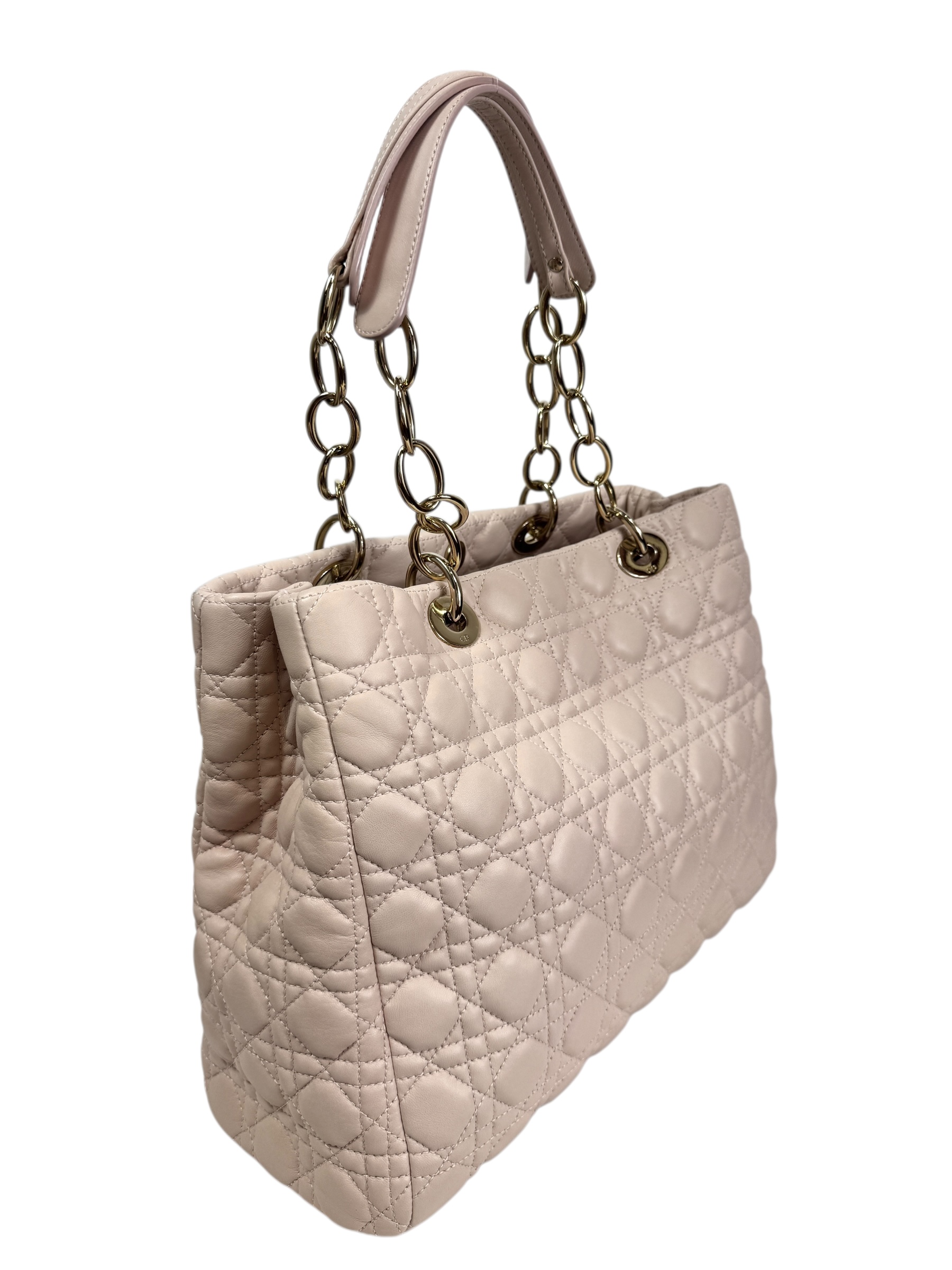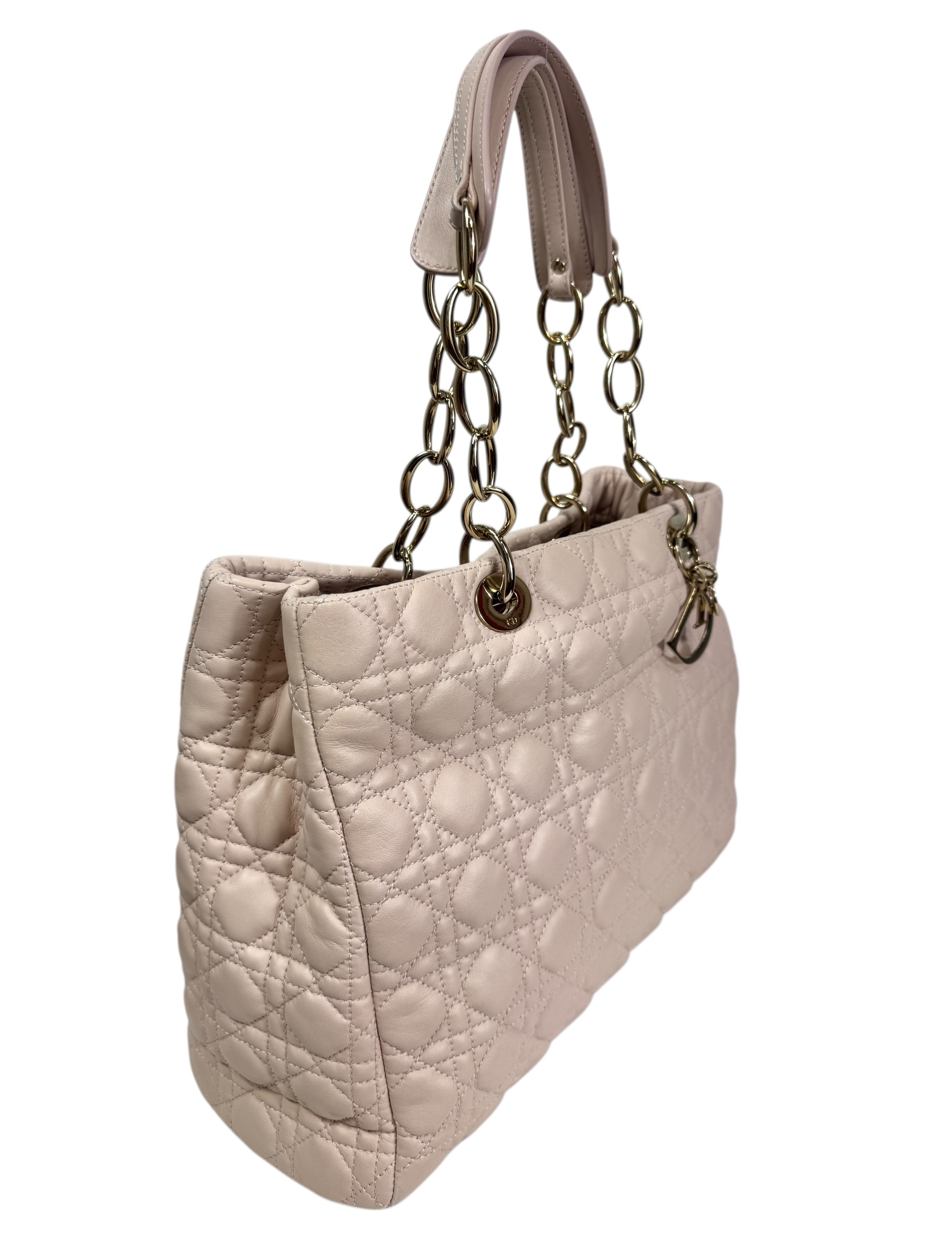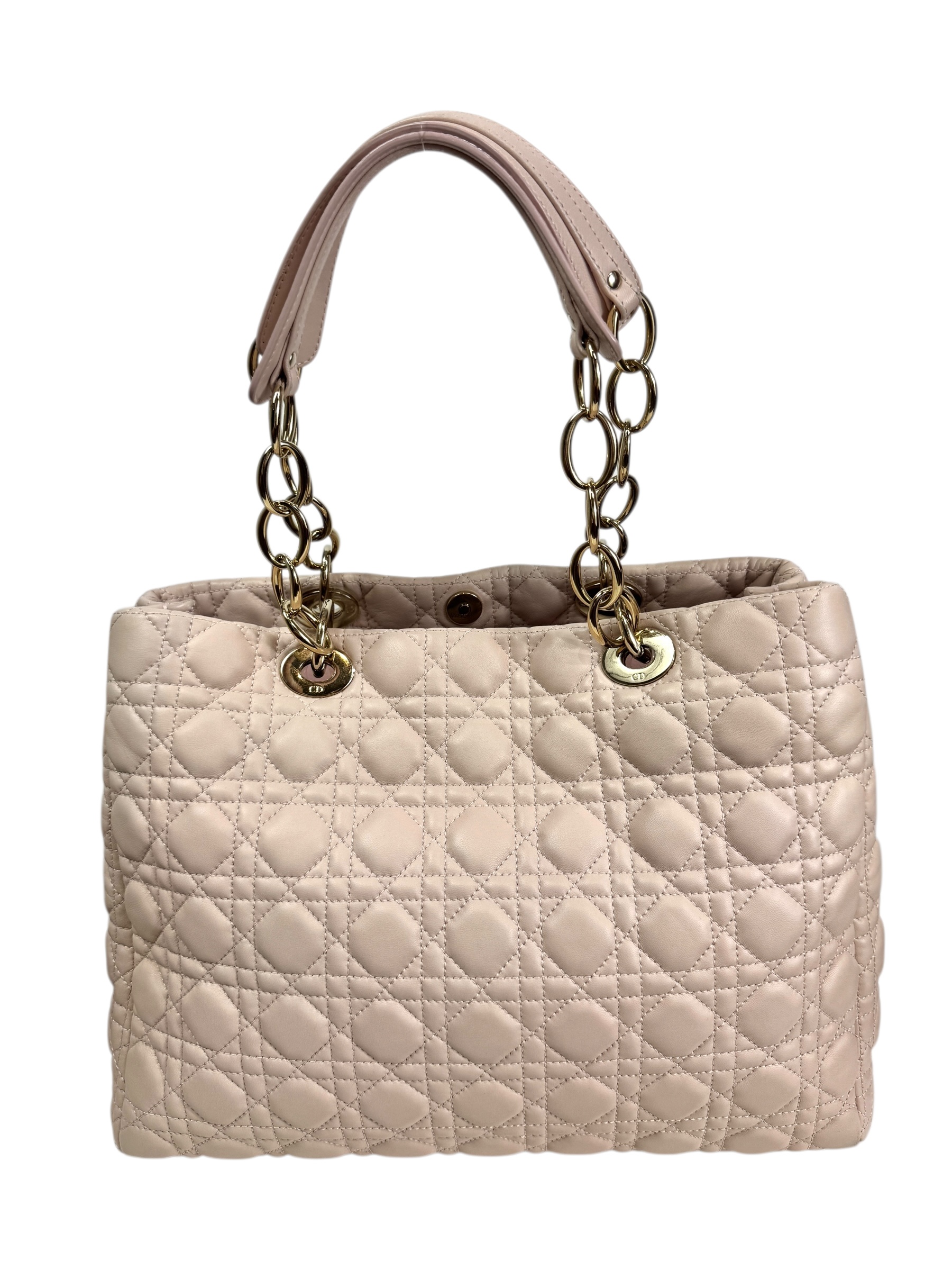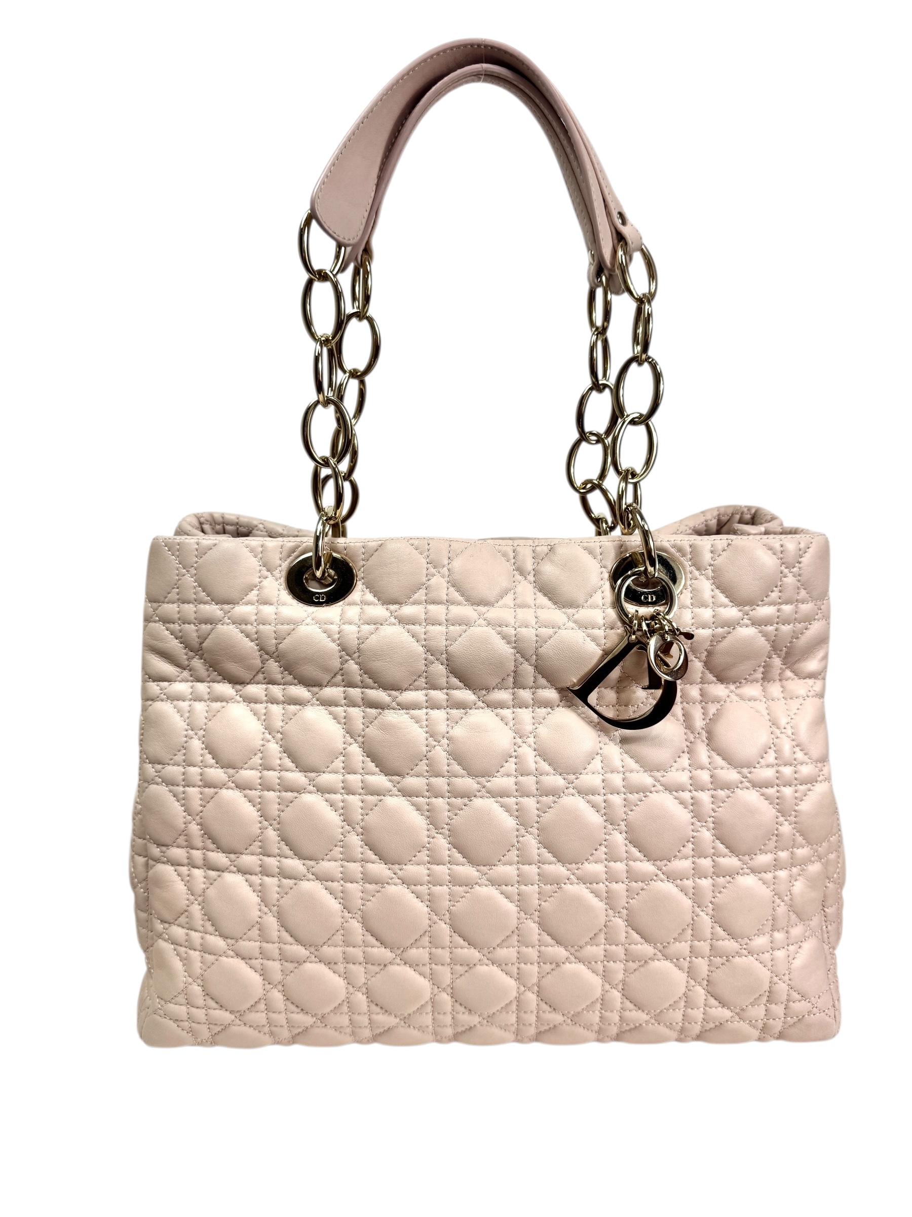 Sac « Soft Shopping » en cuir agneau blush à surpiqures cannage, fermeture pression aimantée, double anse d’épaule chaîne retenant une patte d’épaule, l’une agrémentée de charms abécédaires au nom de la Maison.