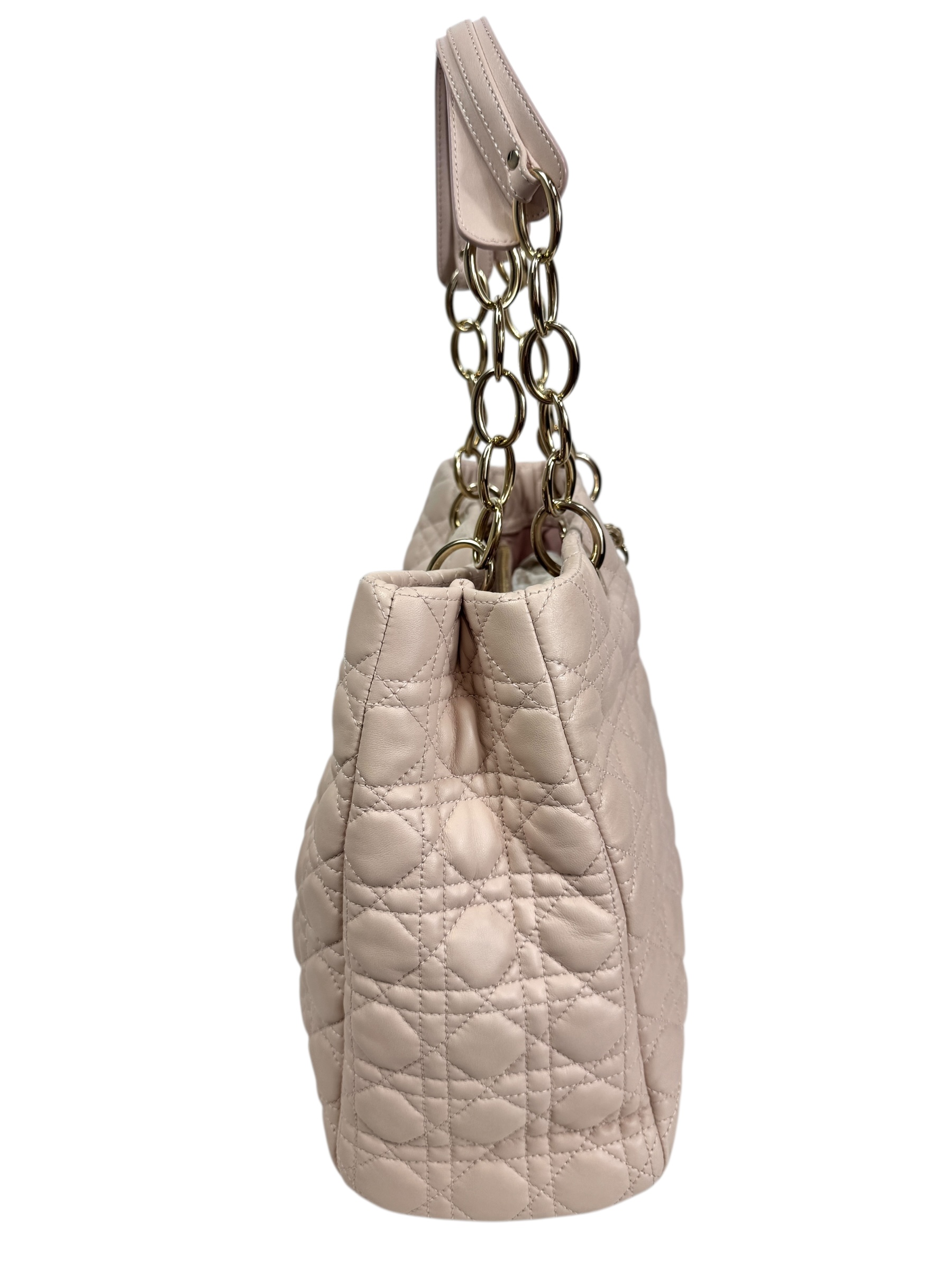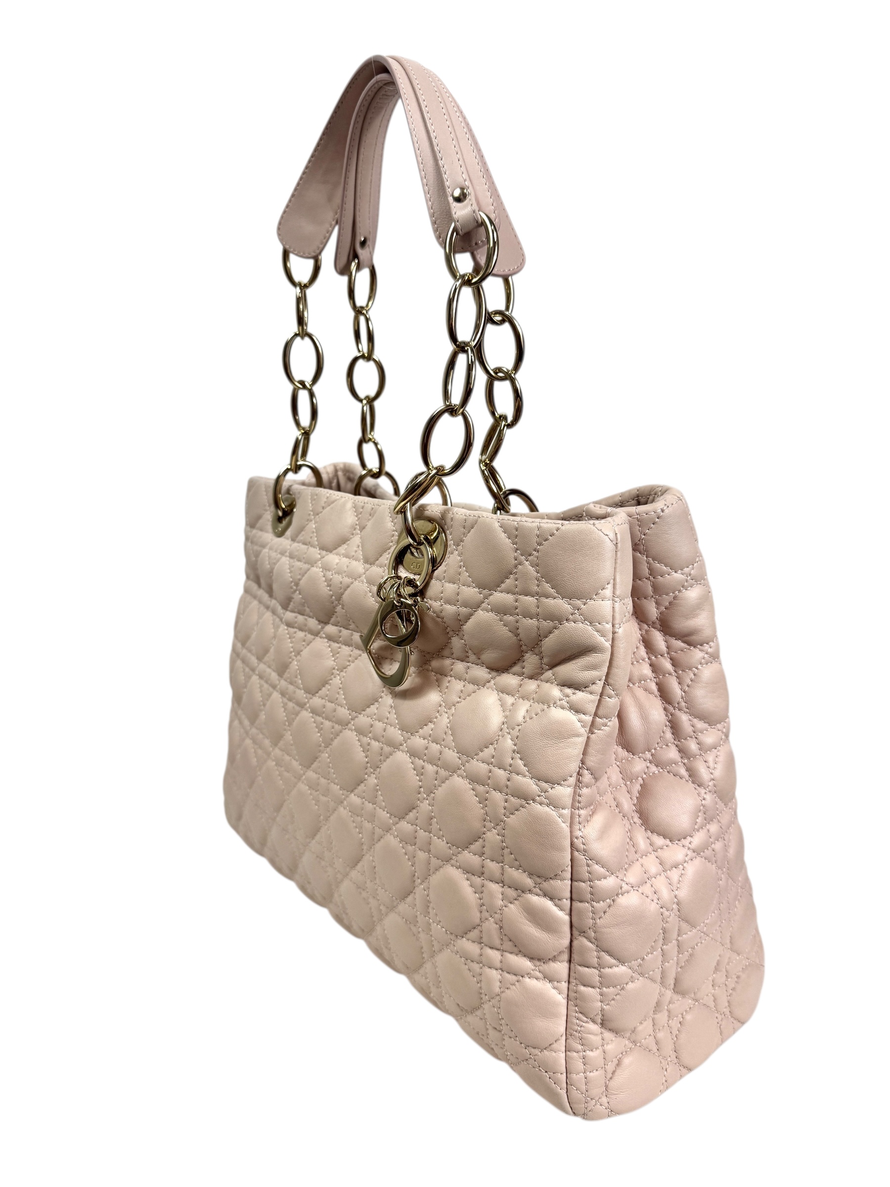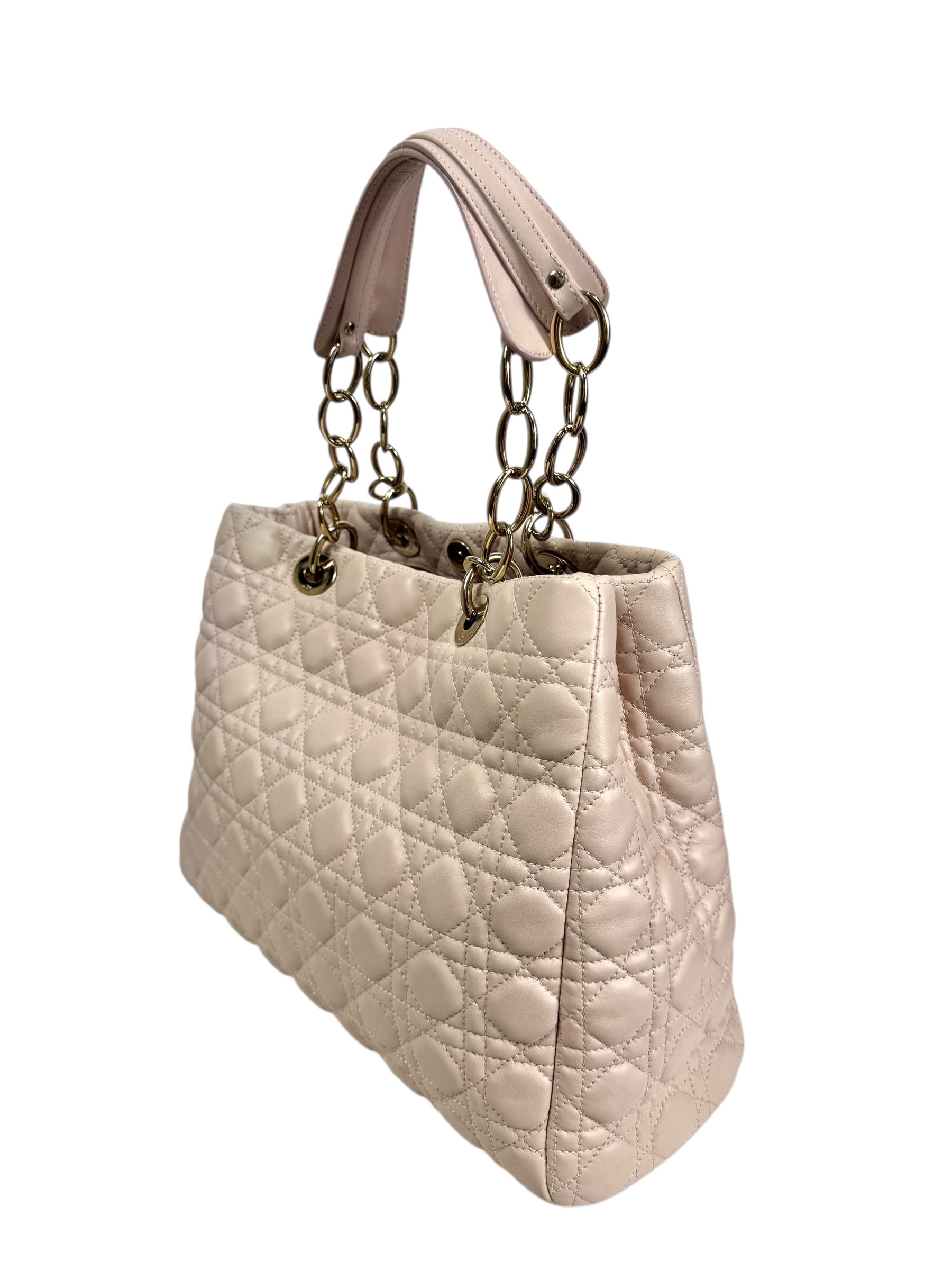 Sac « Soft Shopping » en cuir agneau blush à surpiqures cannage, fermeture pression aimantée, double anse d’épaule chaîne retenant une patte d’épaule, l’une agrémentée de charms abécédaires au nom de la Maison.