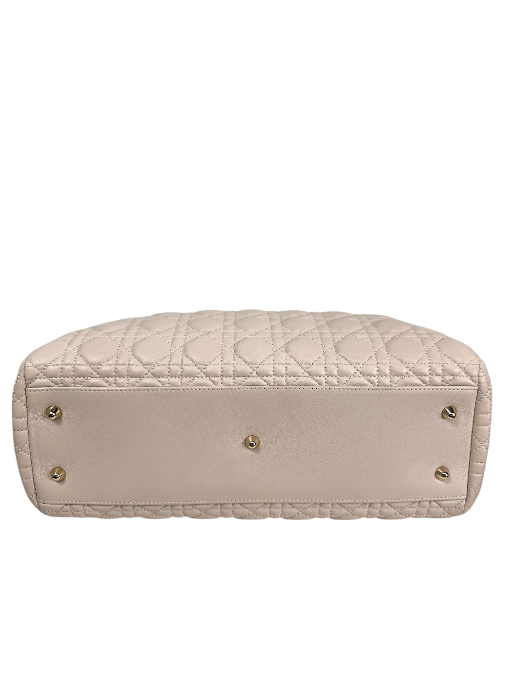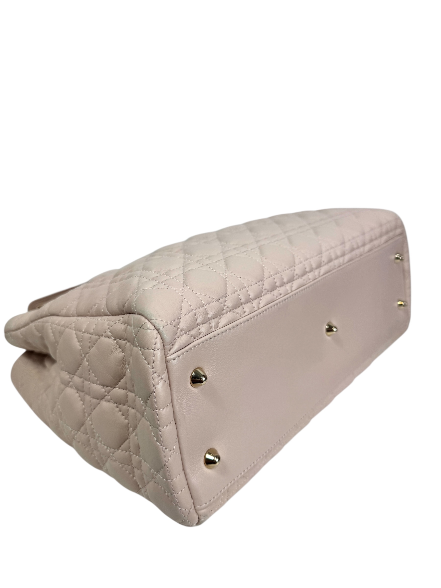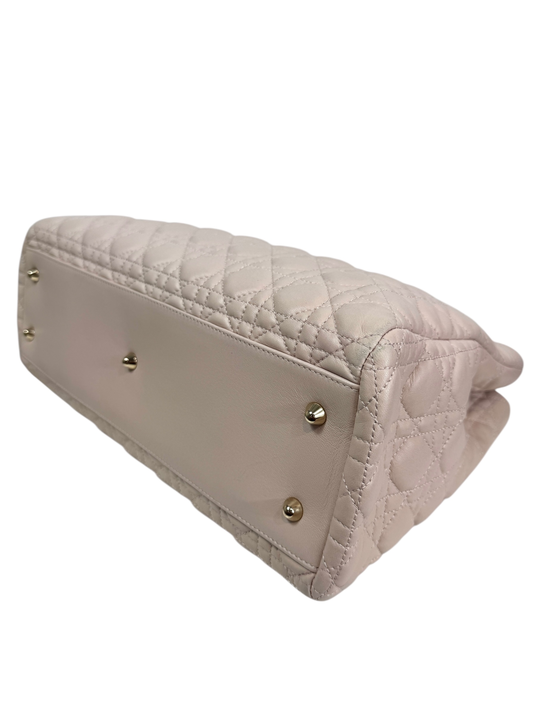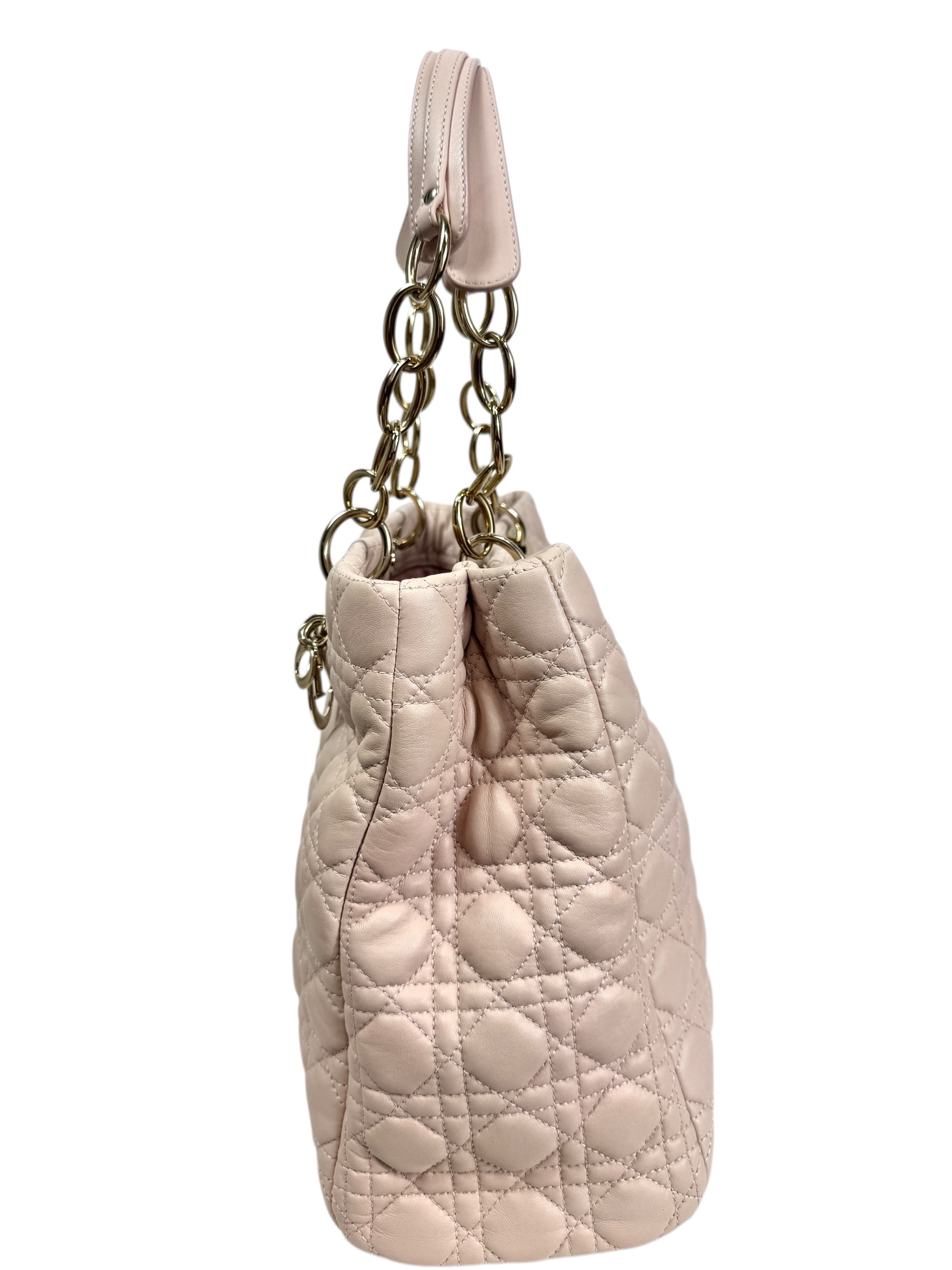 Sac « Soft Shopping » en cuir agneau blush à surpiqures cannage, fermeture pression aimantée, double anse d’épaule chaîne retenant une patte d’épaule, l’une agrémentée de charms abécédaires au nom de la Maison.
