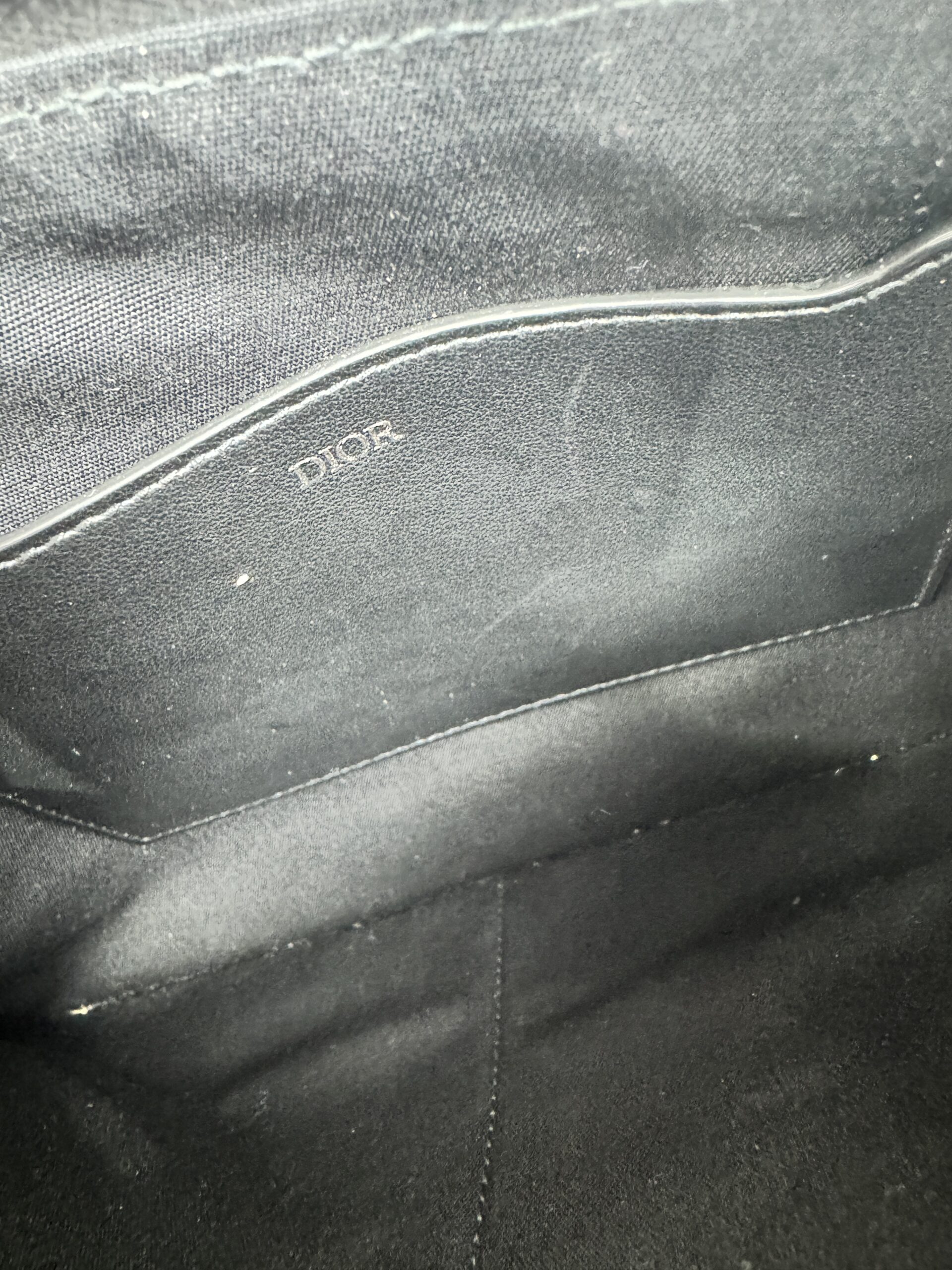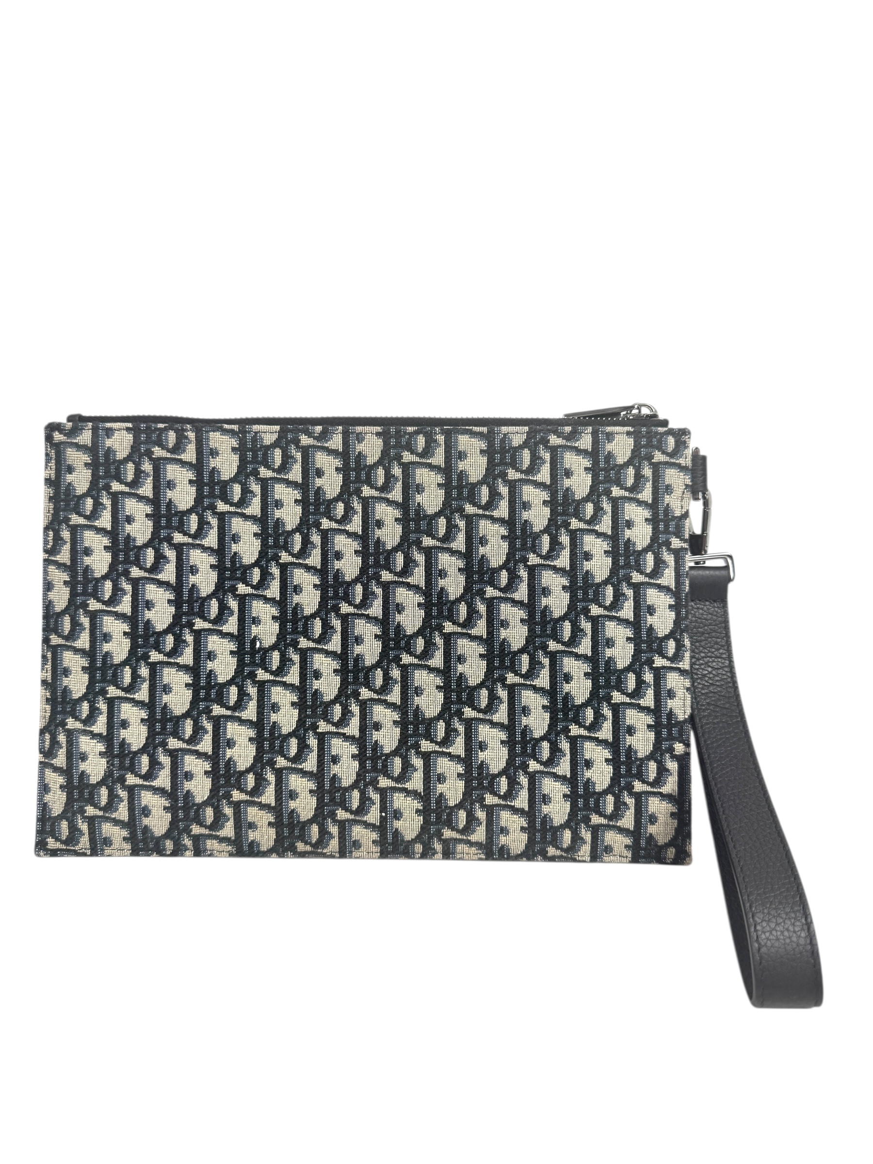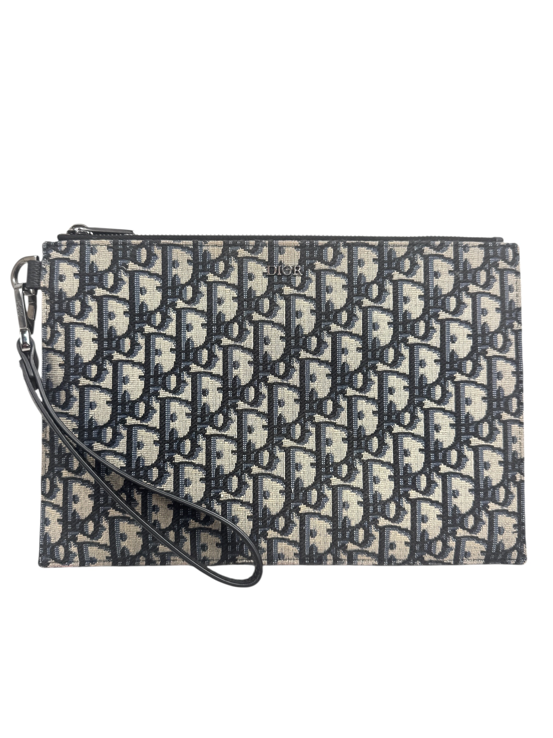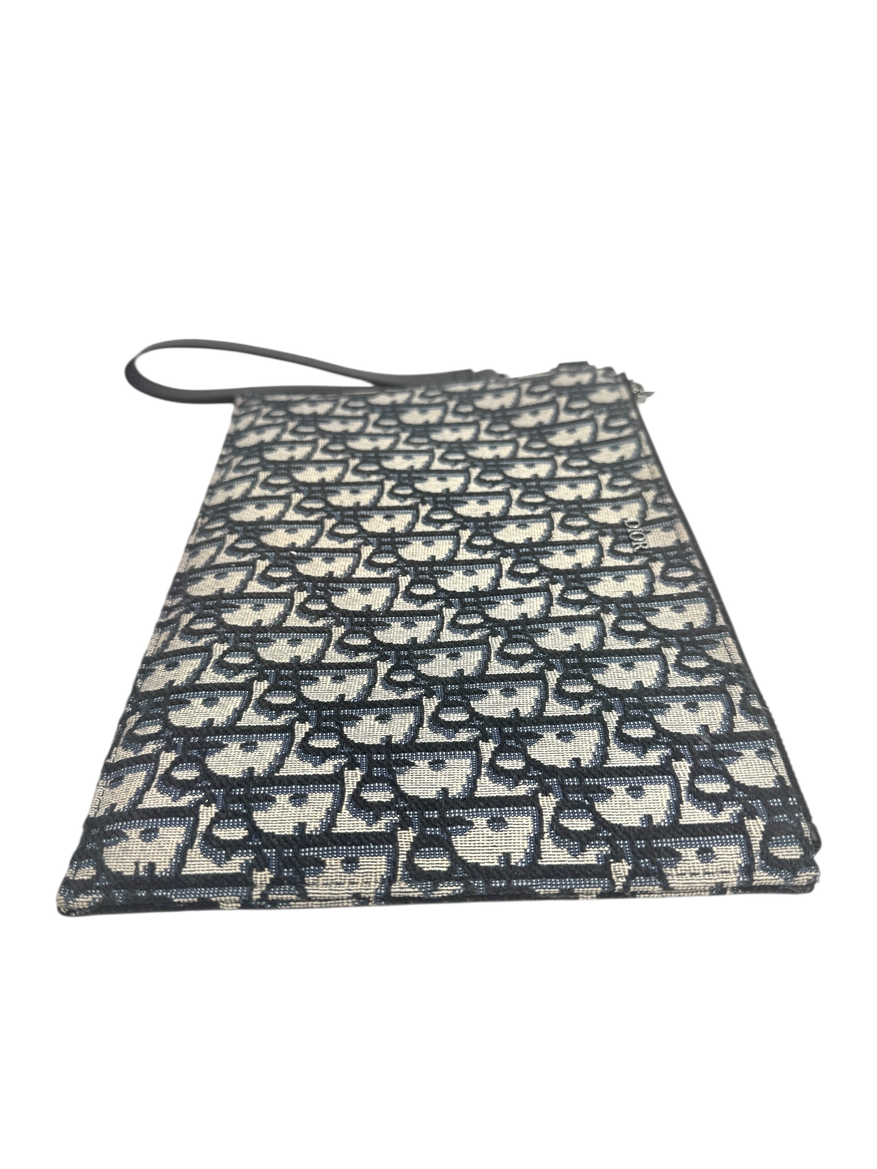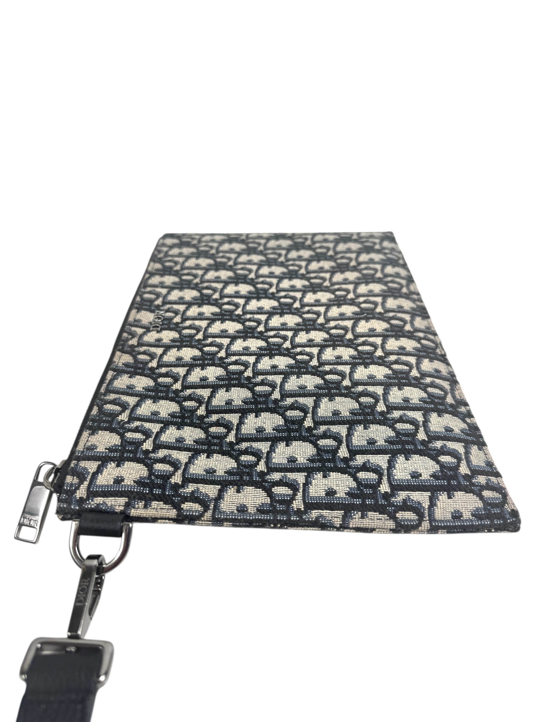 Pochette A5 en toile jacquard Dior oblique beige et noir, dragonne amovible, poches plaquées à l’intérieur, Signature Dior embossée à l’intérieur, signature en laiton finition ruthénium à l’avant.