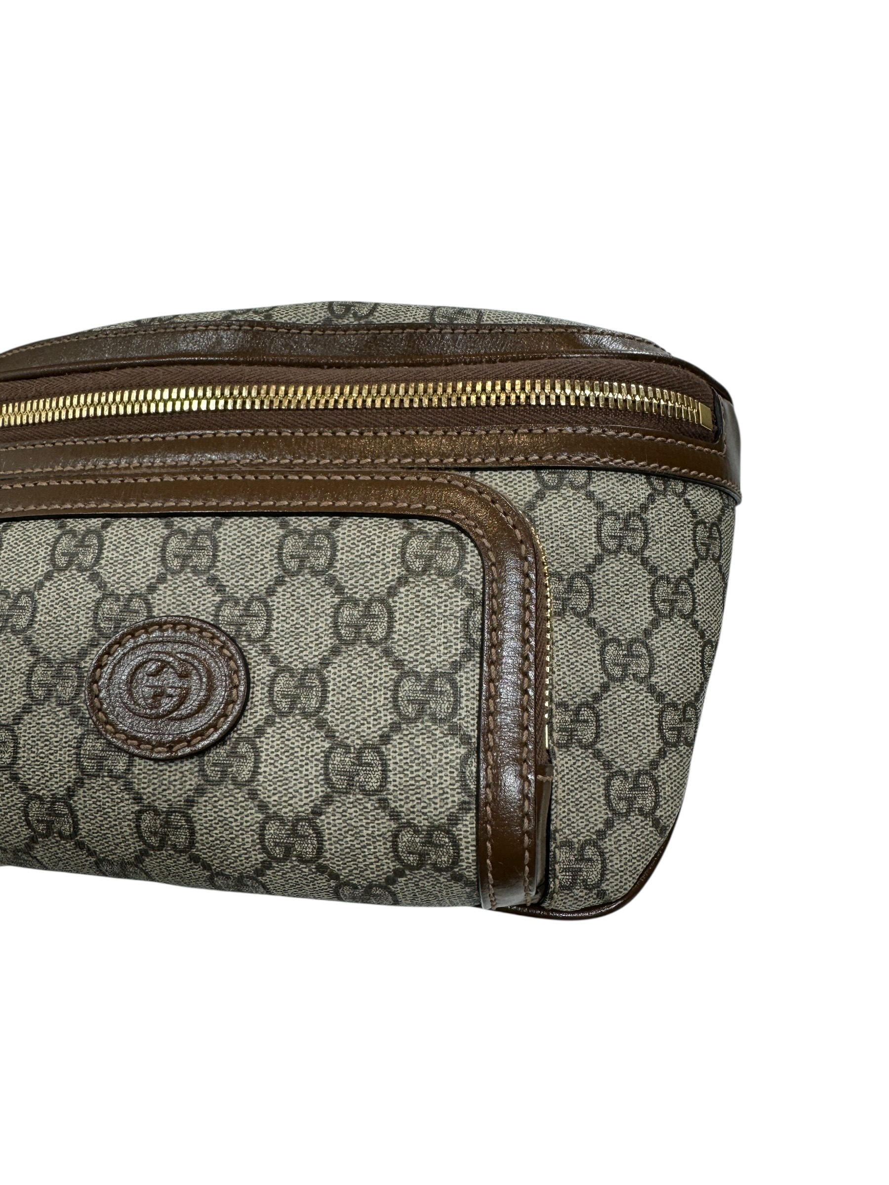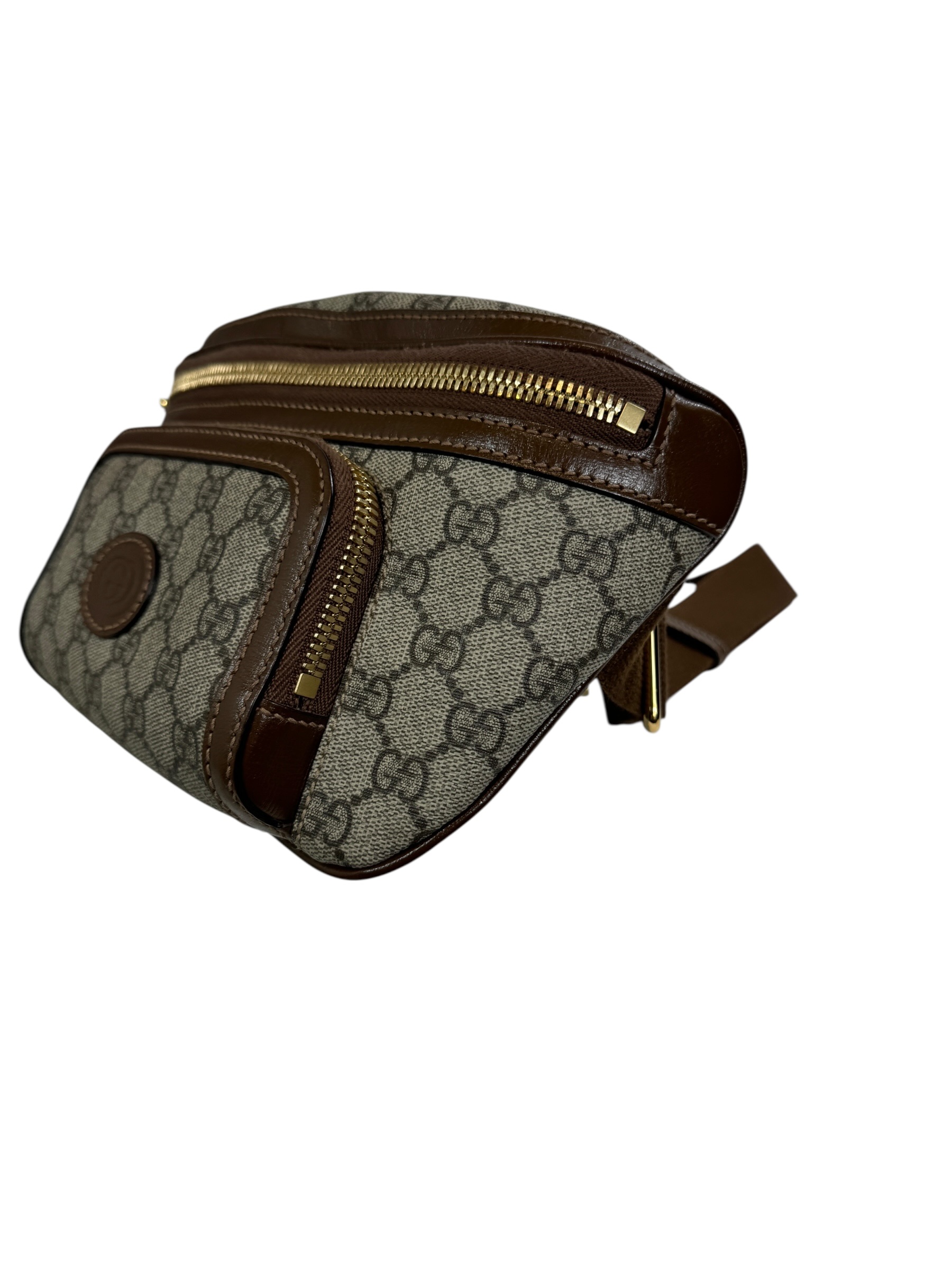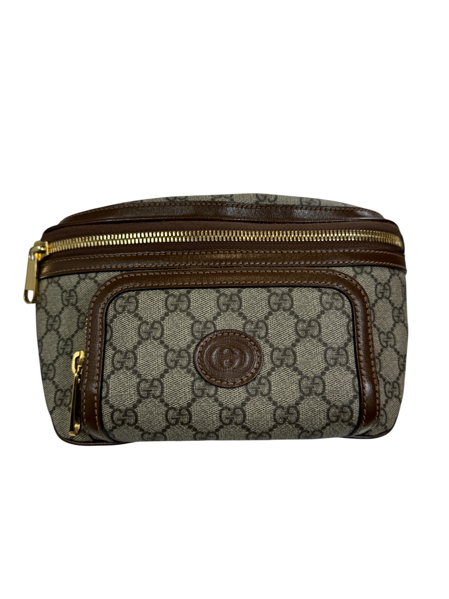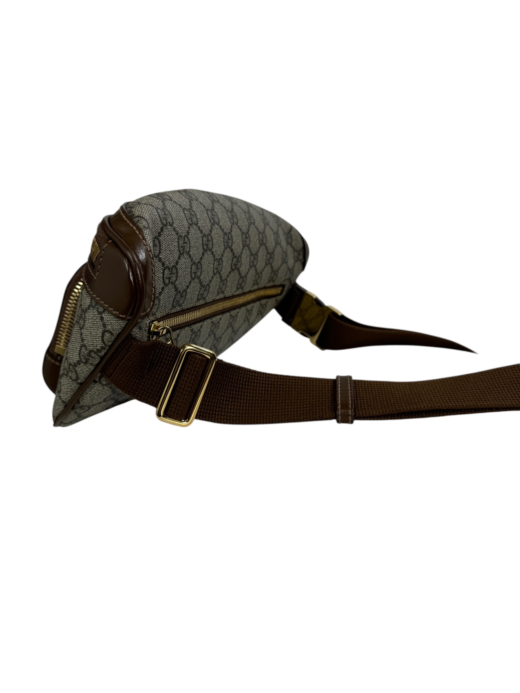 Pochette ceinture en toile enduite GG Suprême et cuir noisette, fermeture éclair, ceinture sangle.