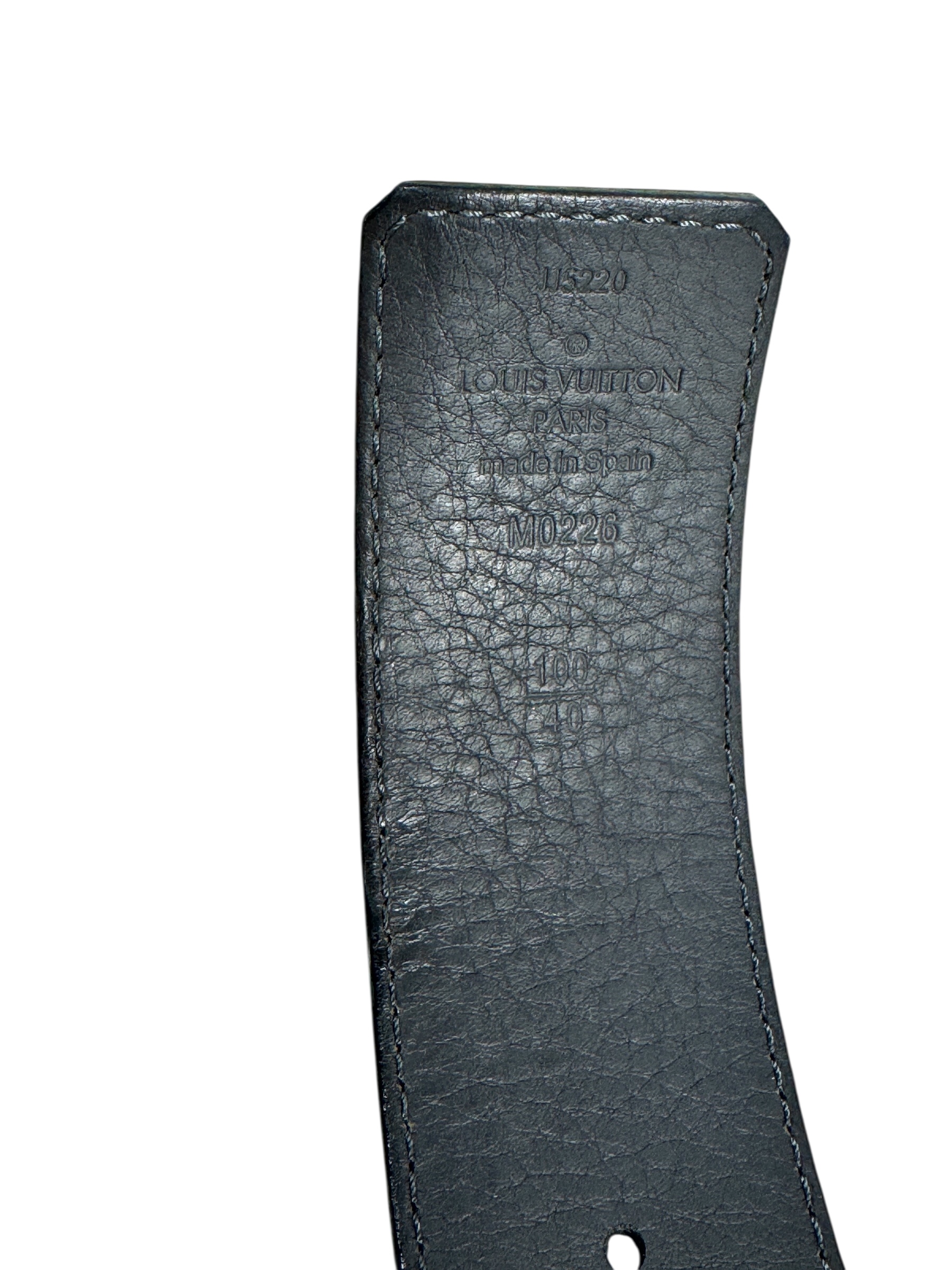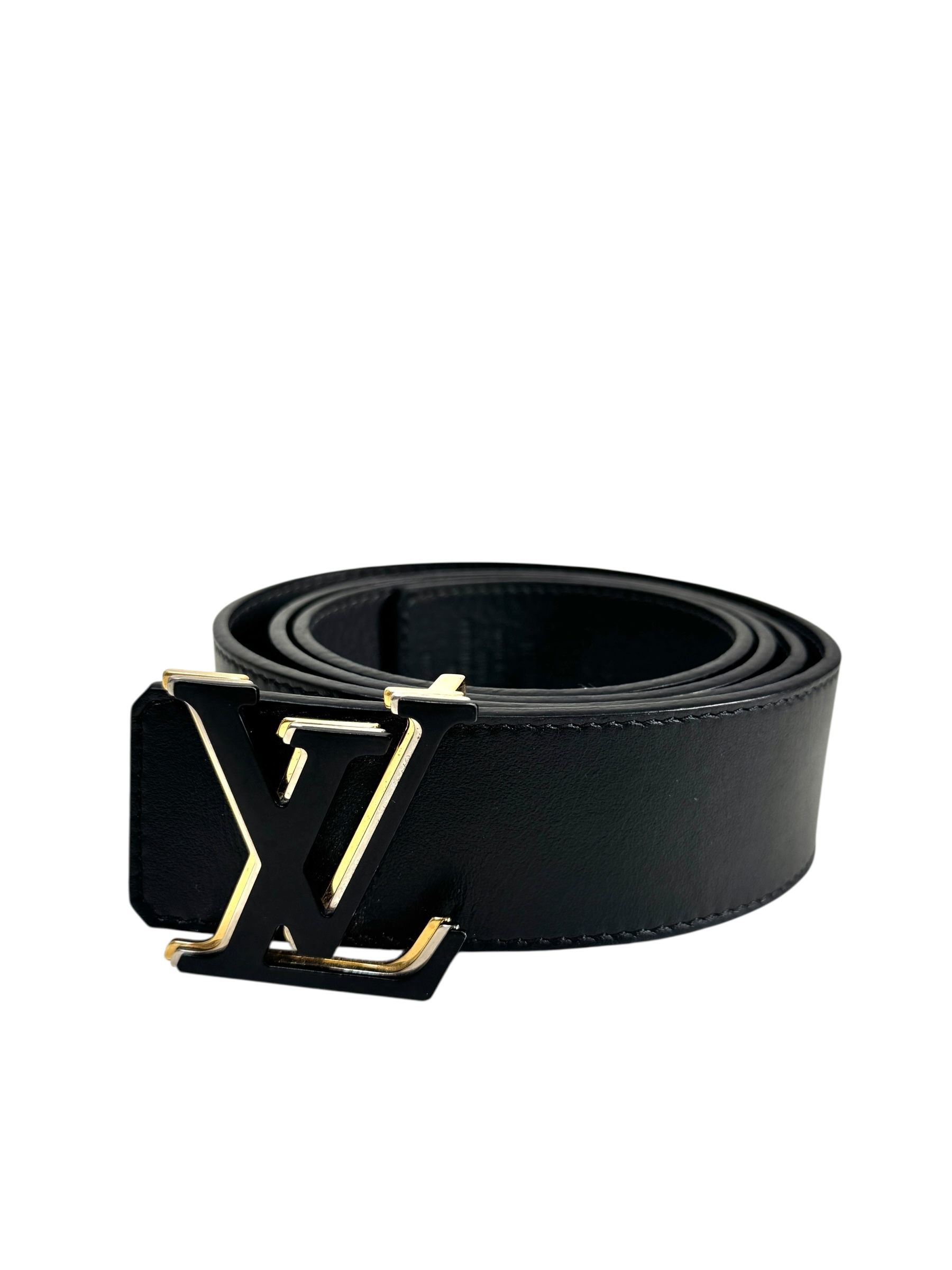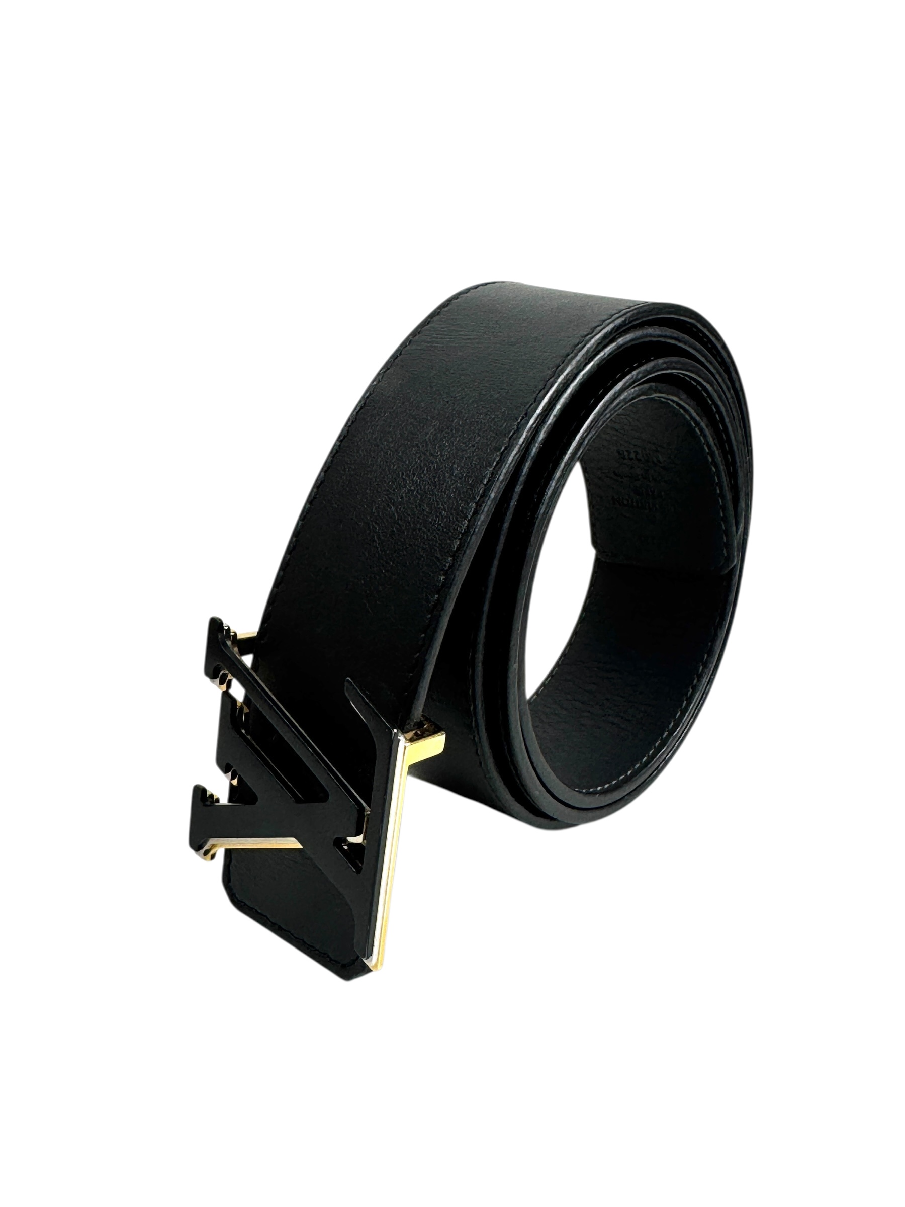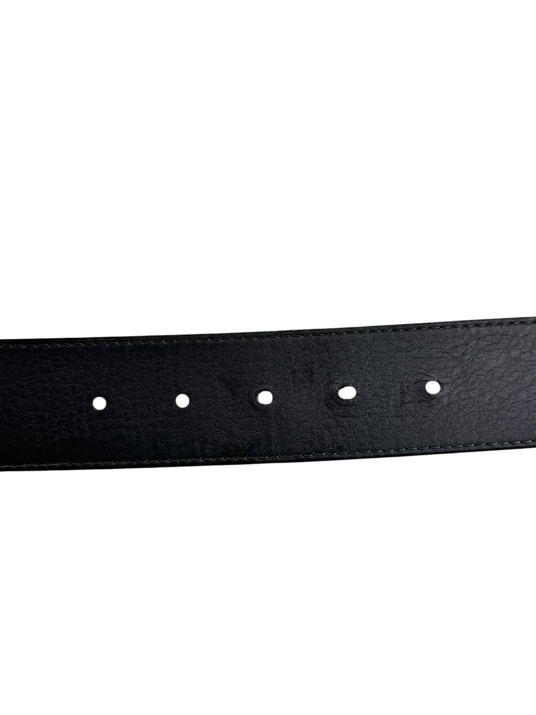 Ceinture en cuir noir avec boucle ornée du sigle de la Maison noire, dorée et argentée, taille 100 cm.