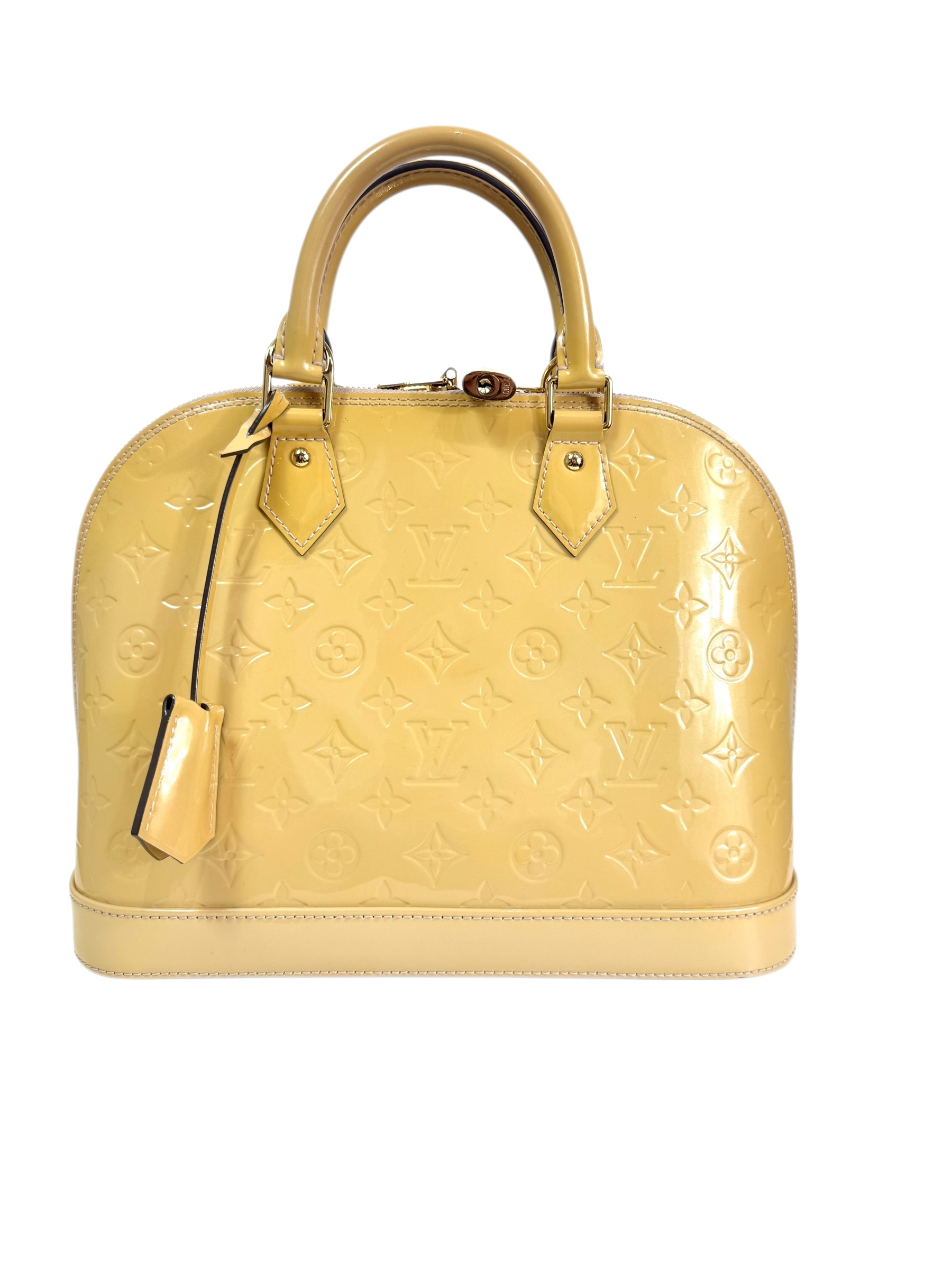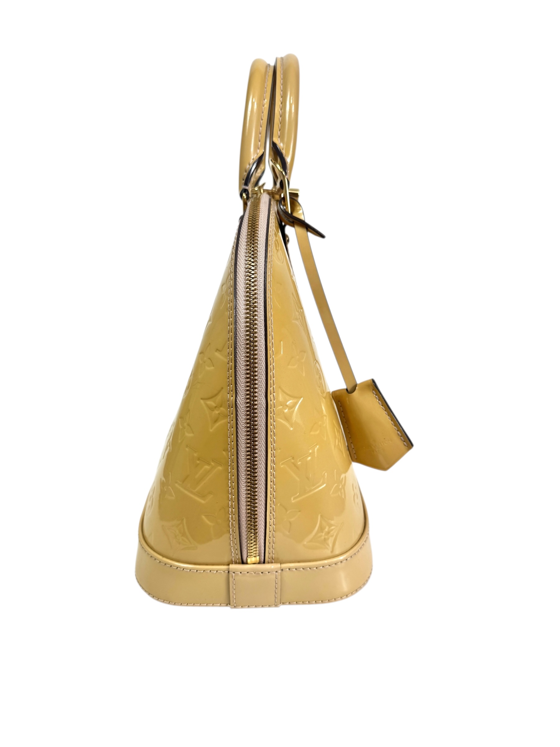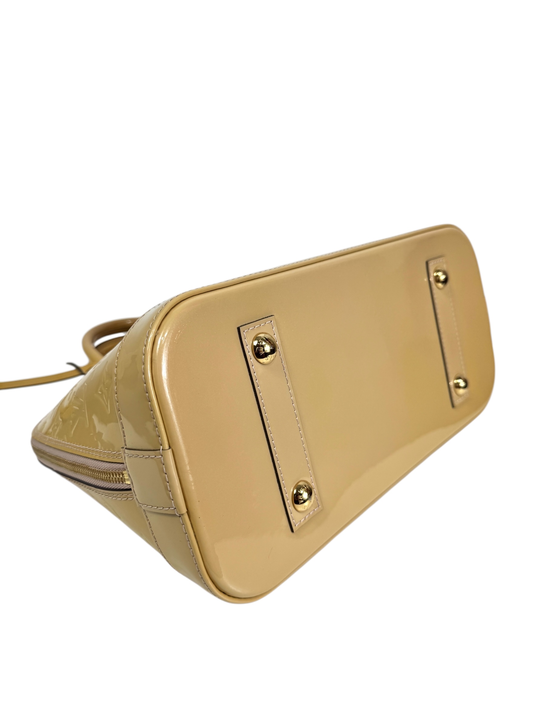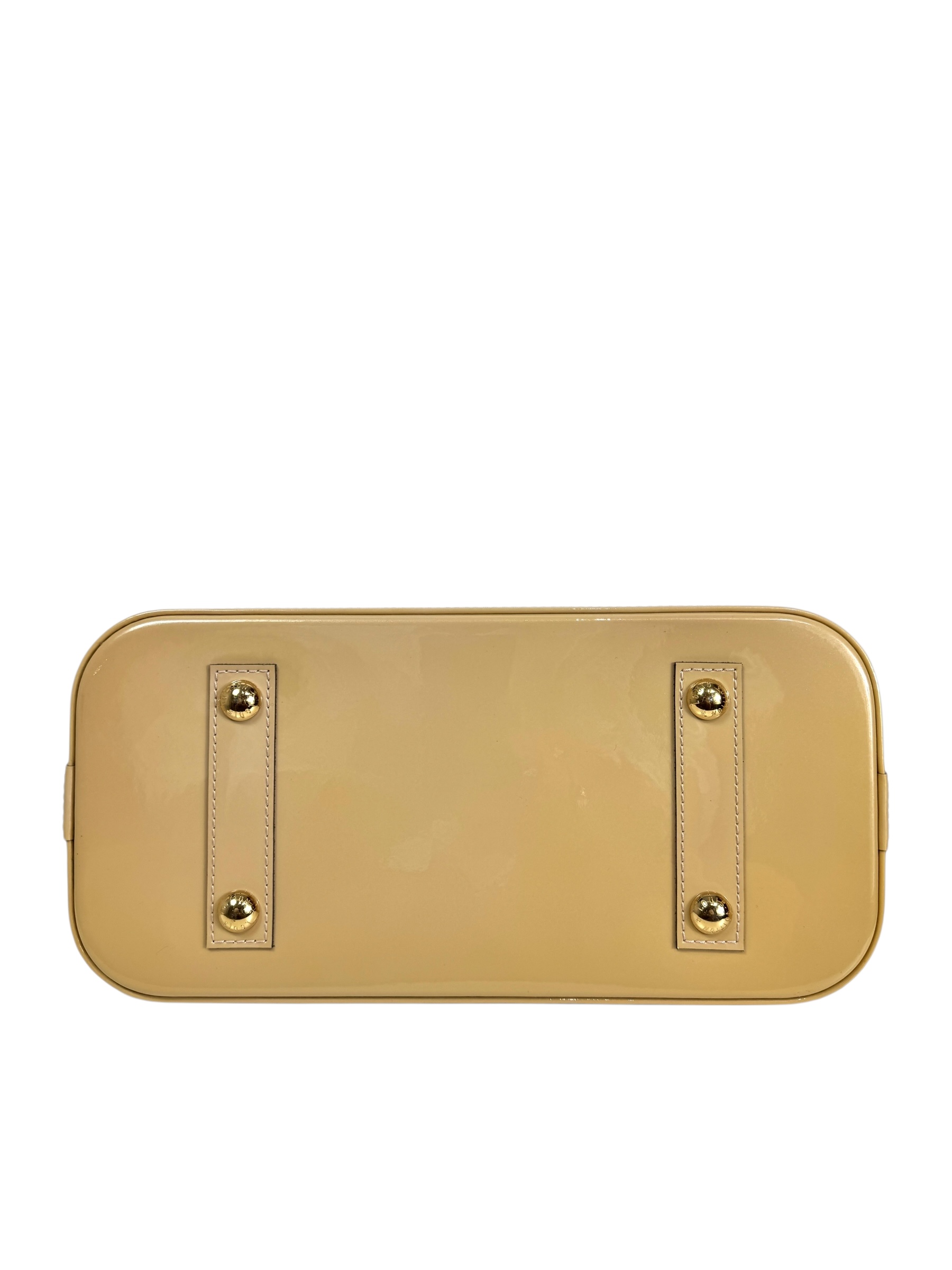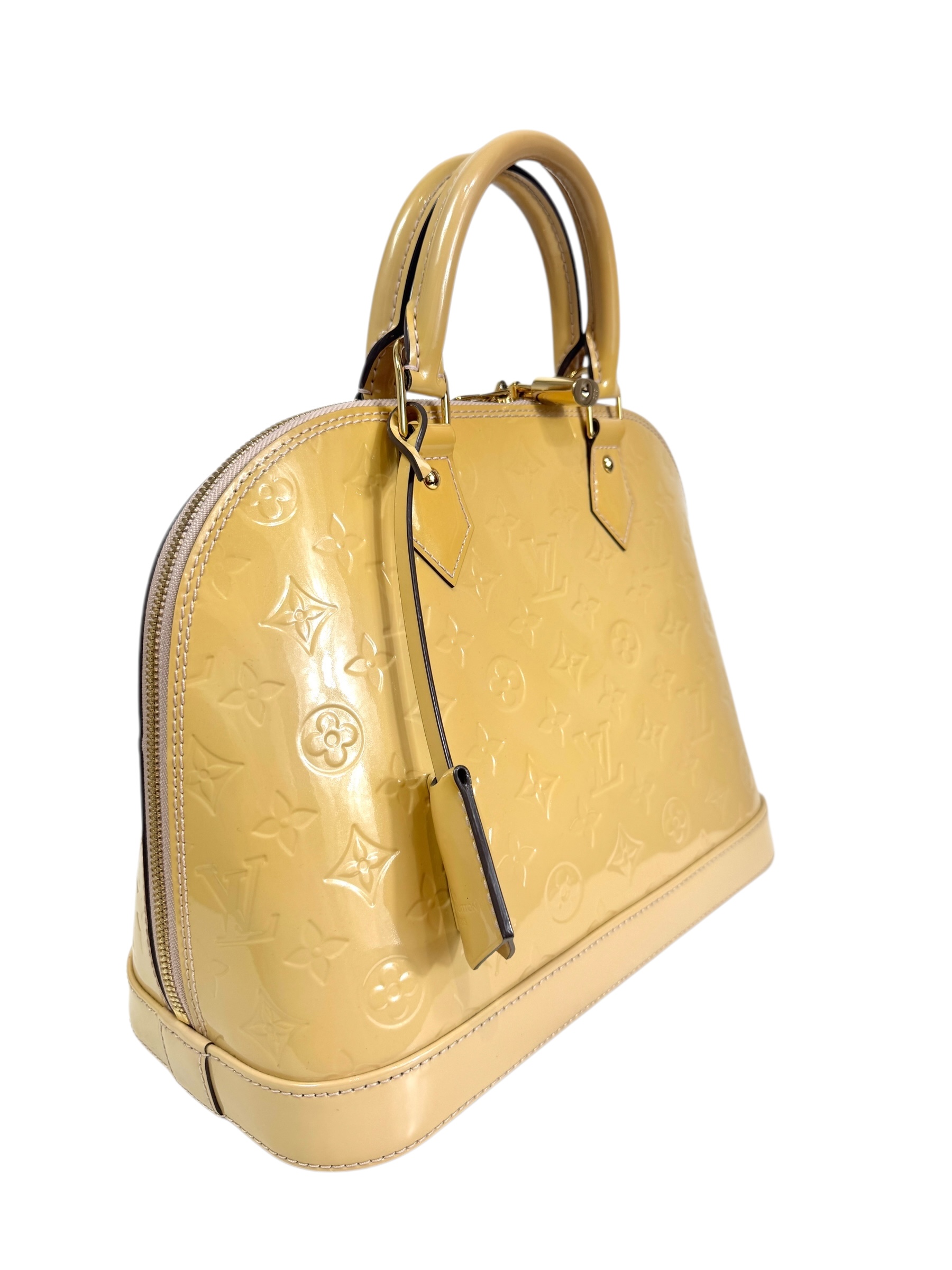 Sac « Alma » en cuir verni Monogram beige, fermeture éclair à double curseur, double poignée, clefs sous clochette, cadenas.