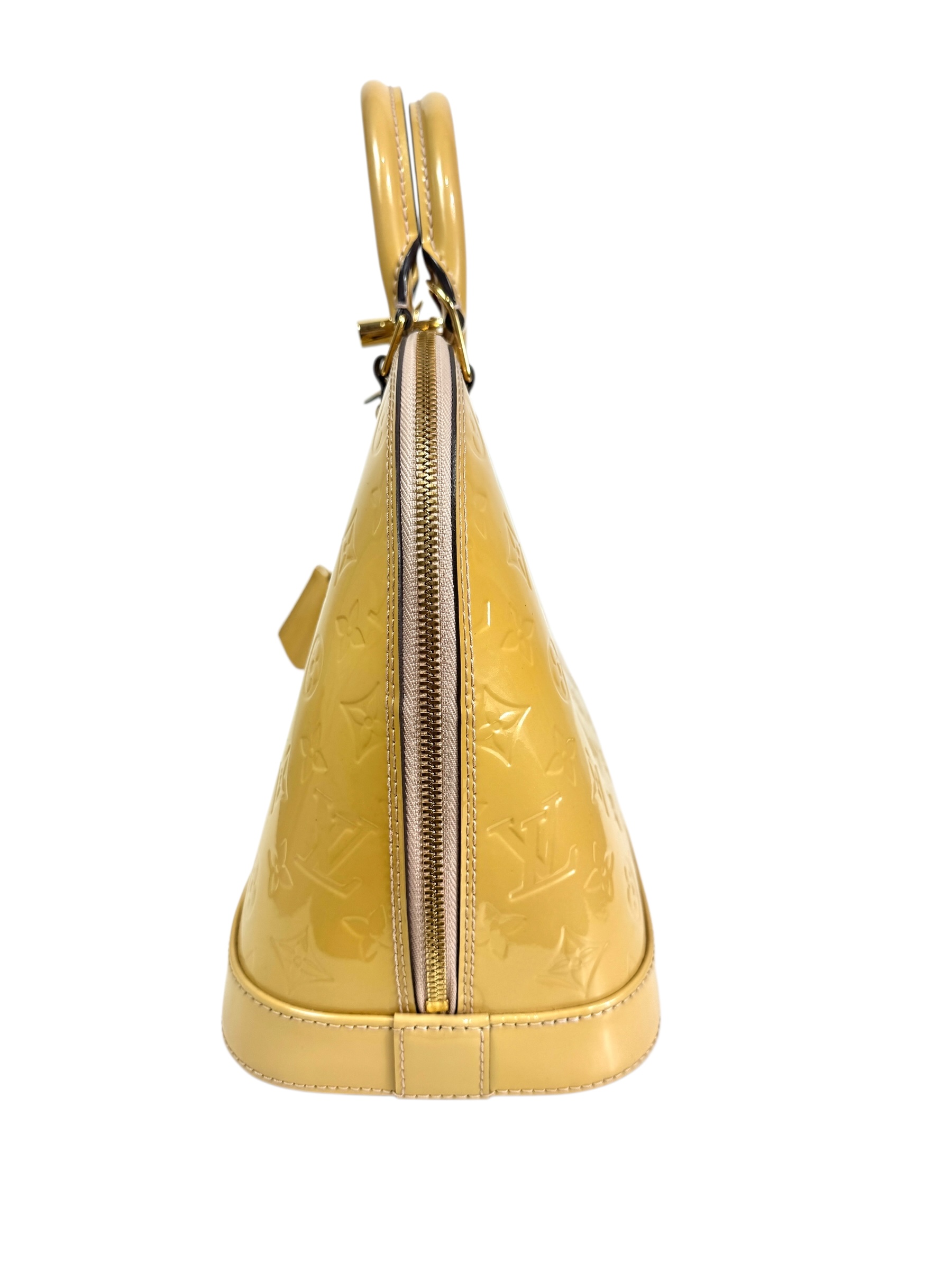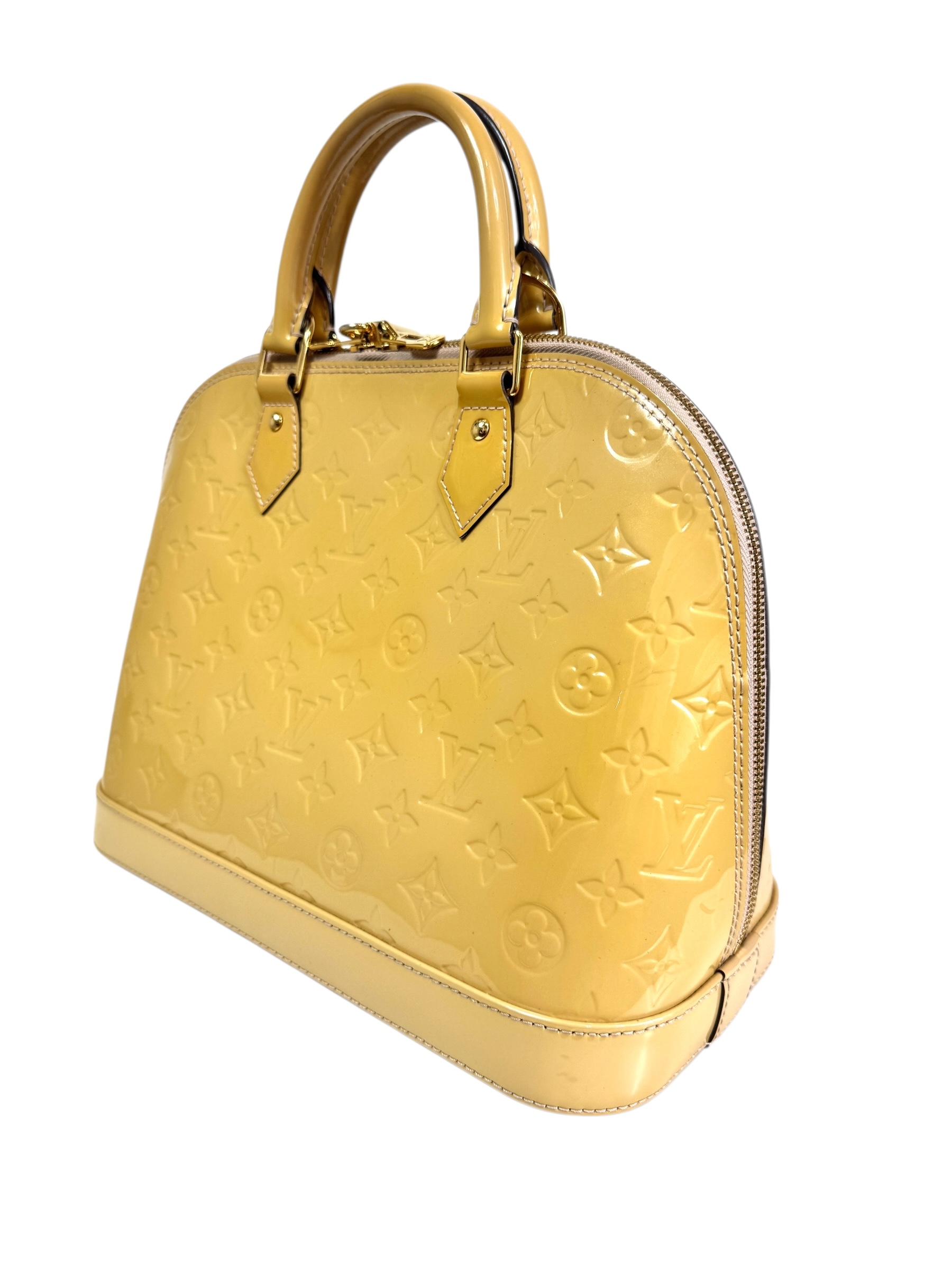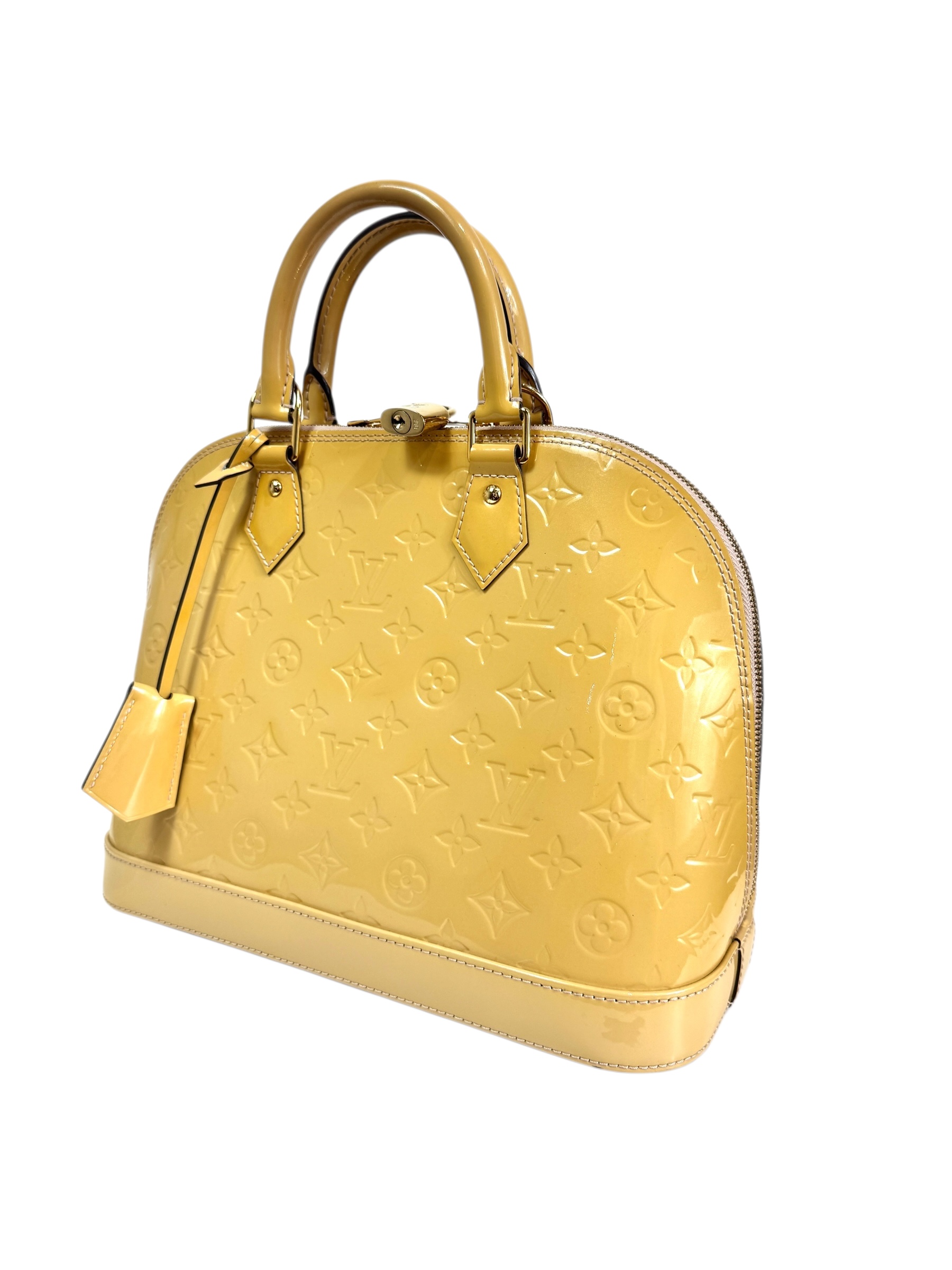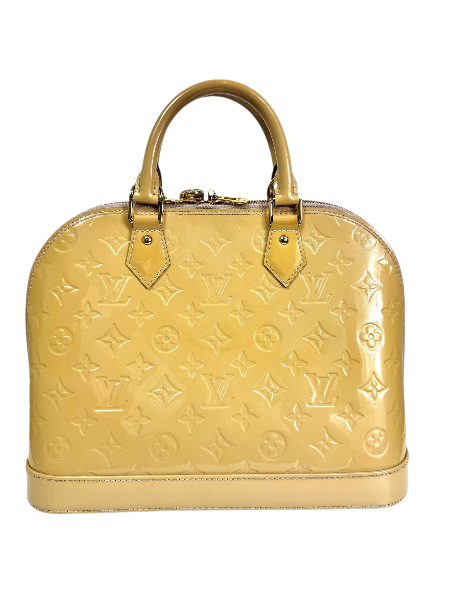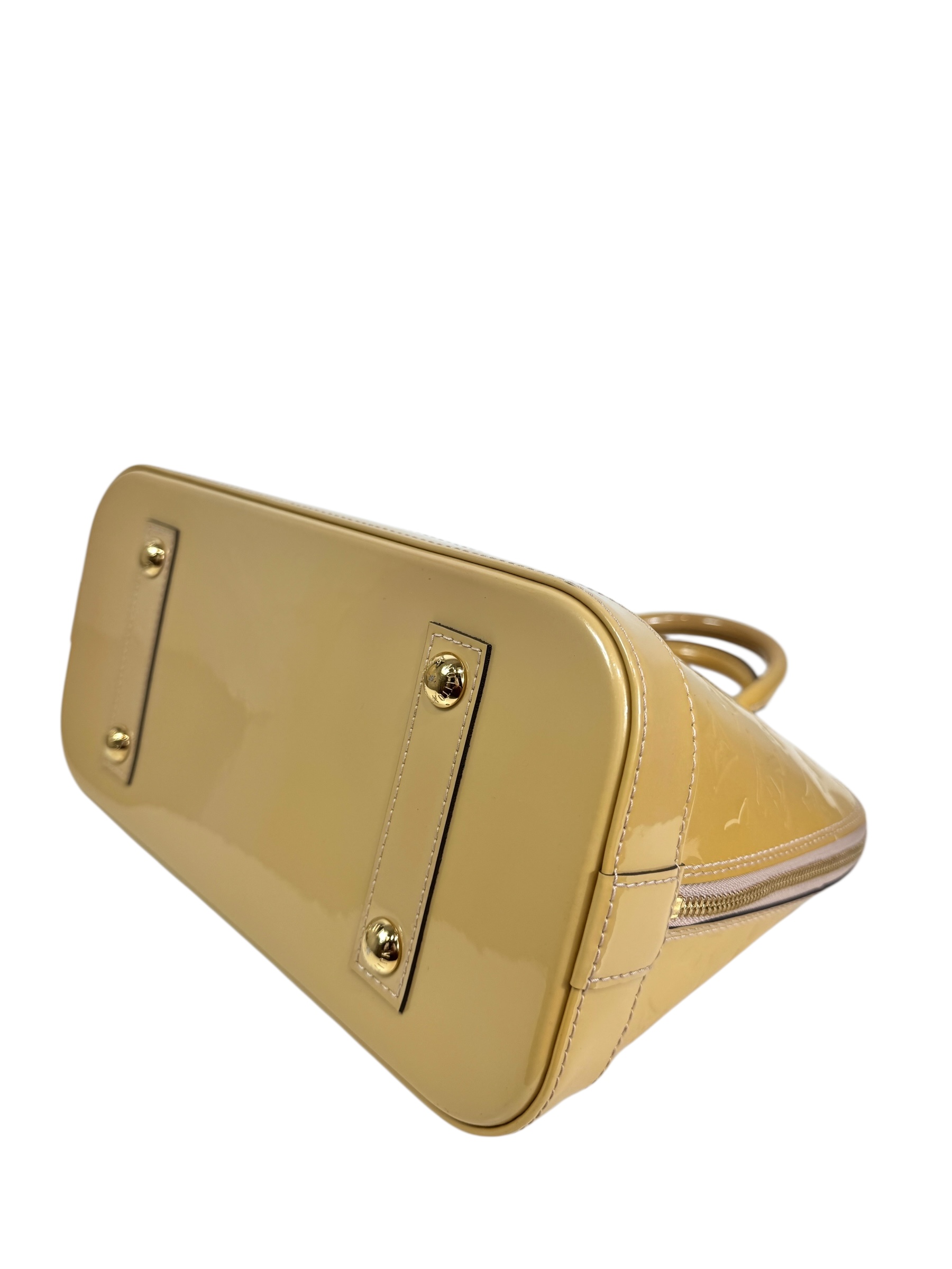 Sac « Alma » en cuir verni Monogram beige, fermeture éclair à double curseur, double poignée, clefs sous clochette, cadenas.
