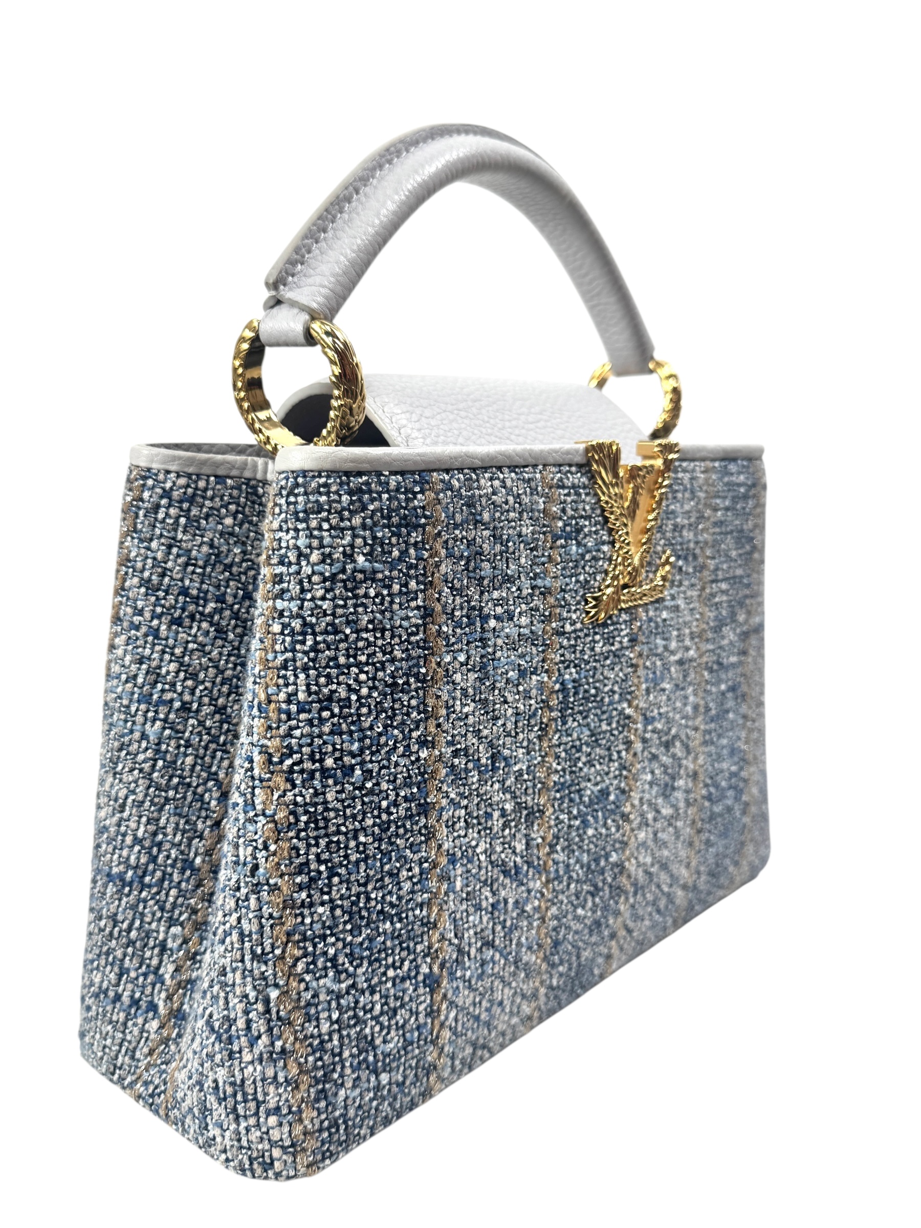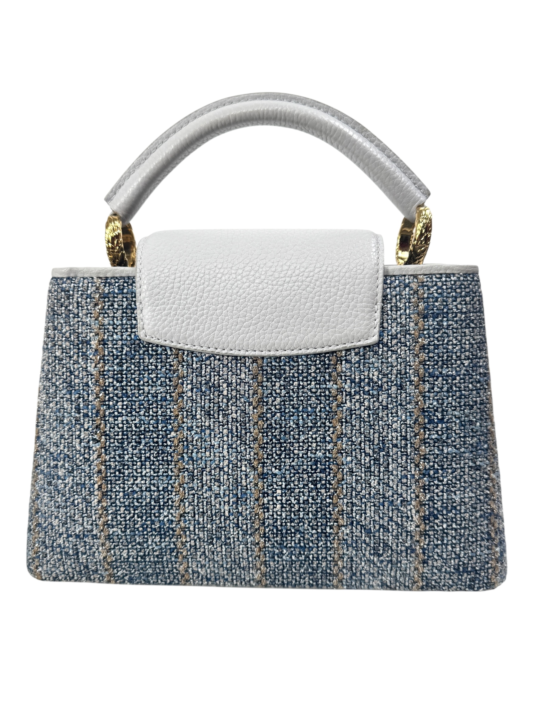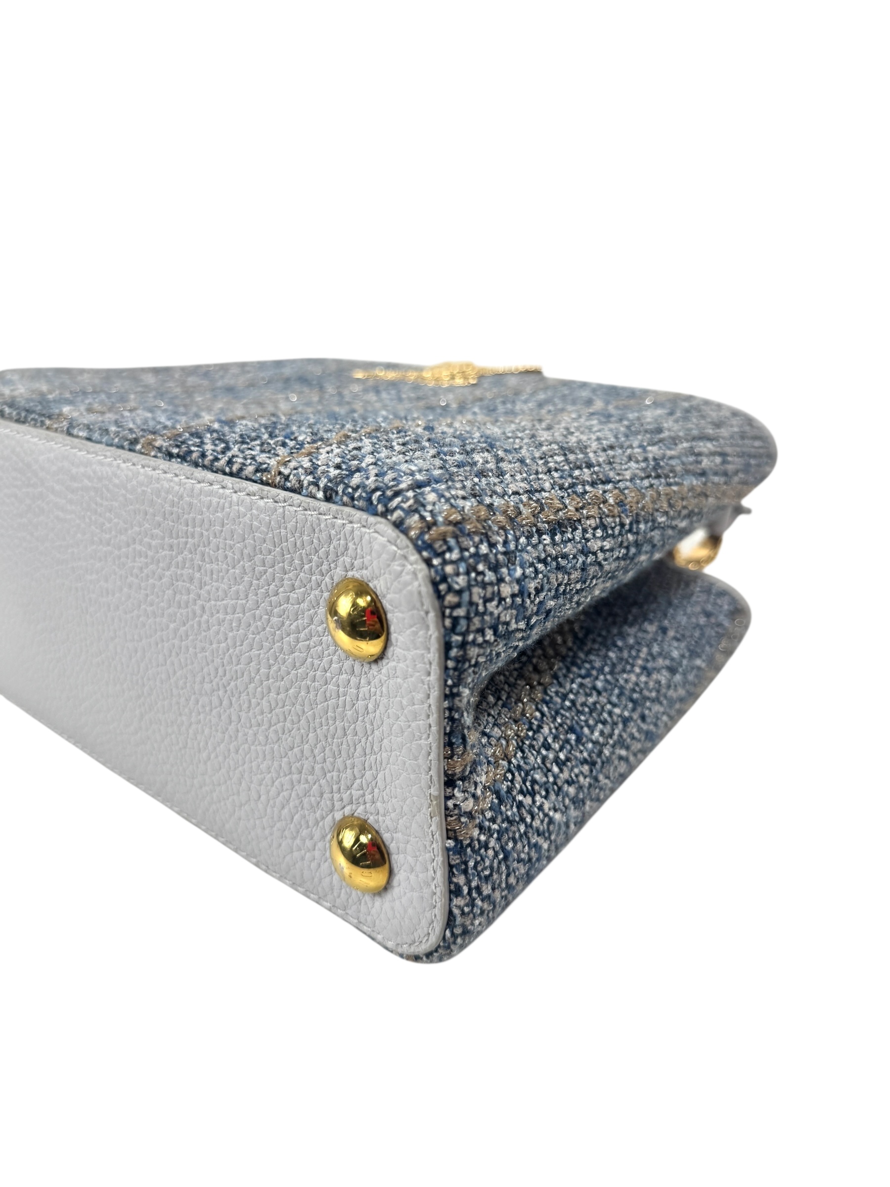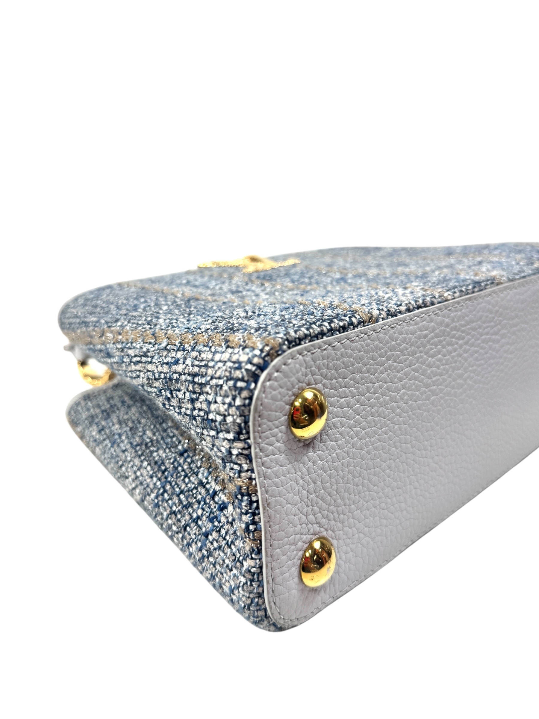 Sac « Capucine » en tweed dans les tons bleus, beige, et veau grainé gris, motifs en métal doré à motif d’ailes, rabat, poignée, anse bandoulière amovible réglable.