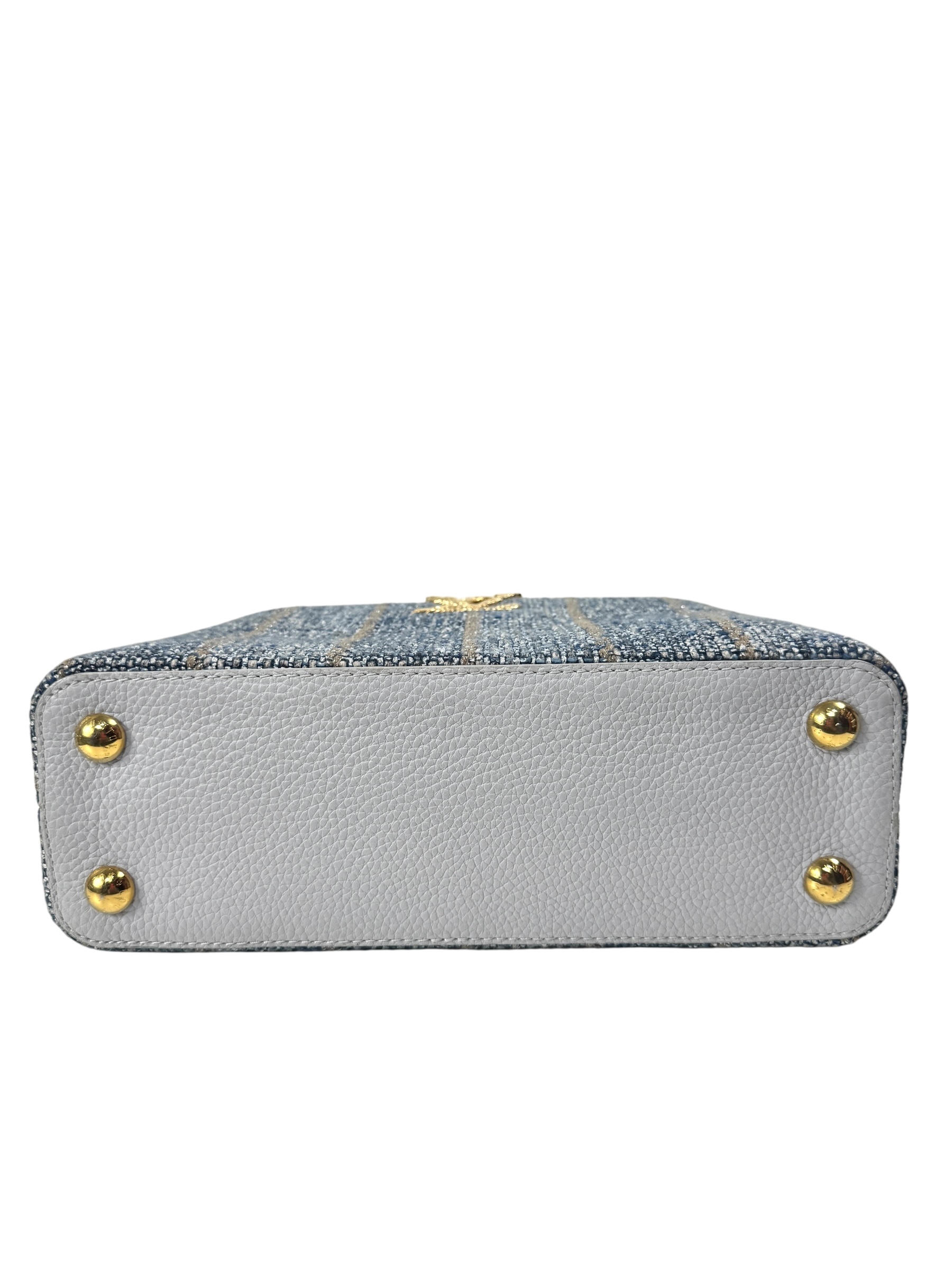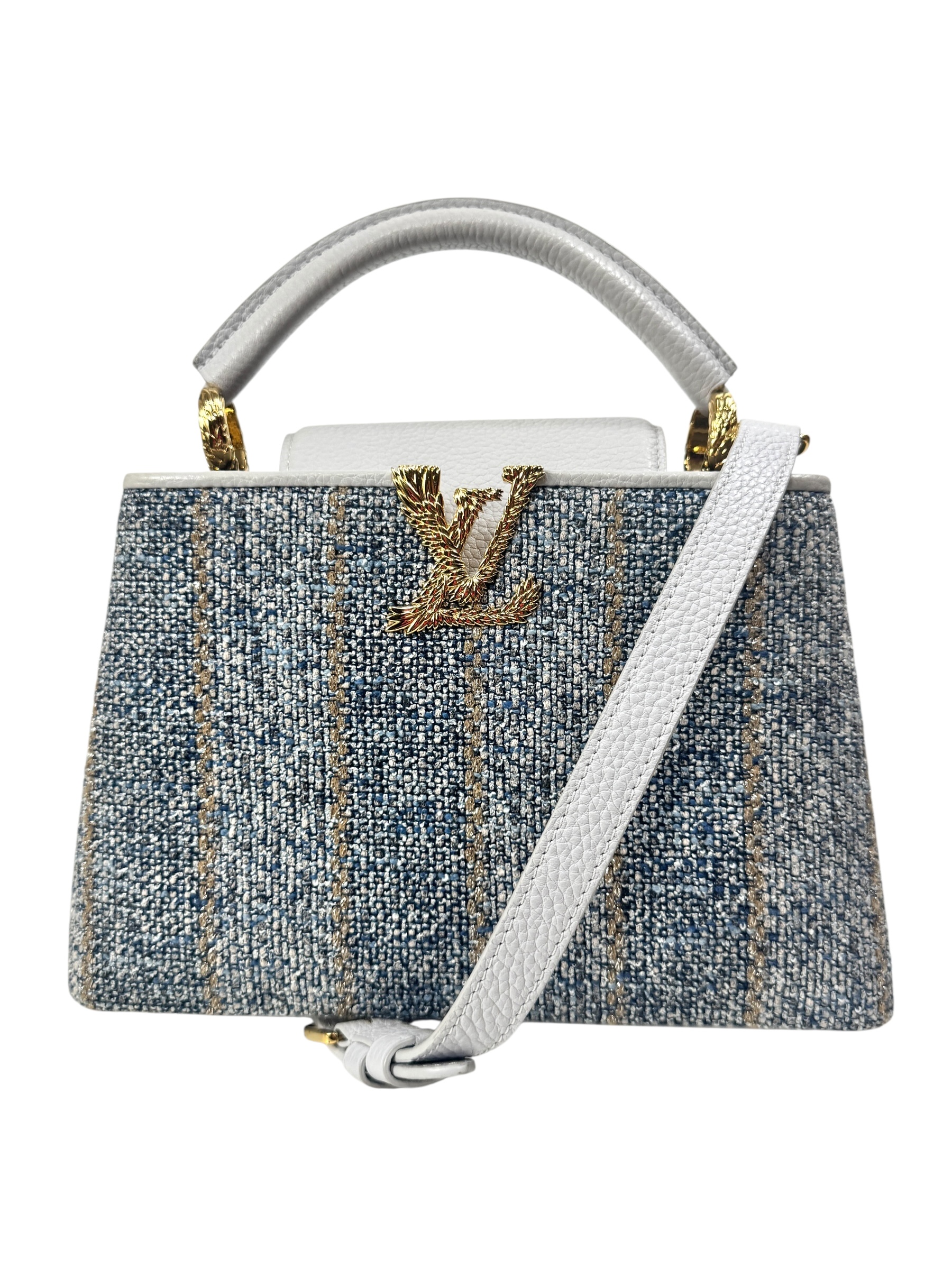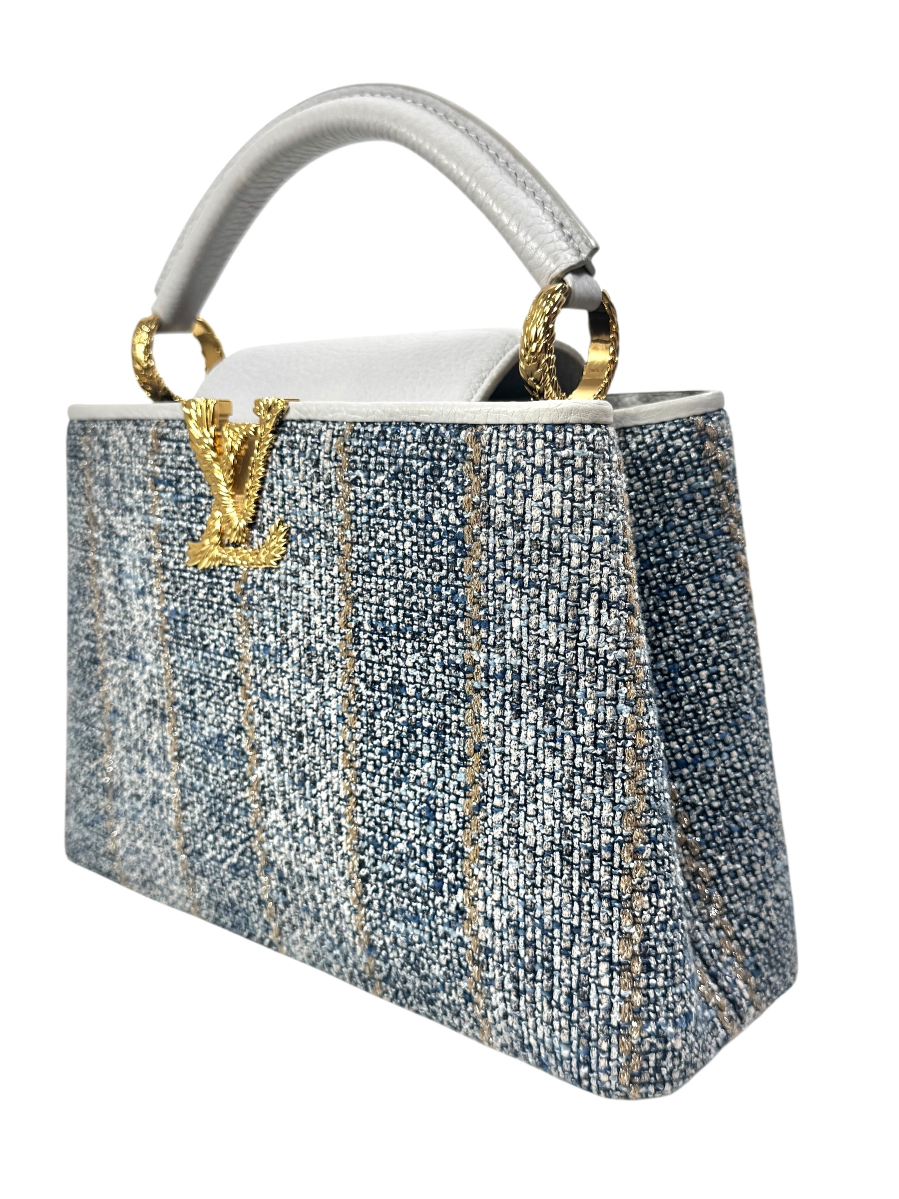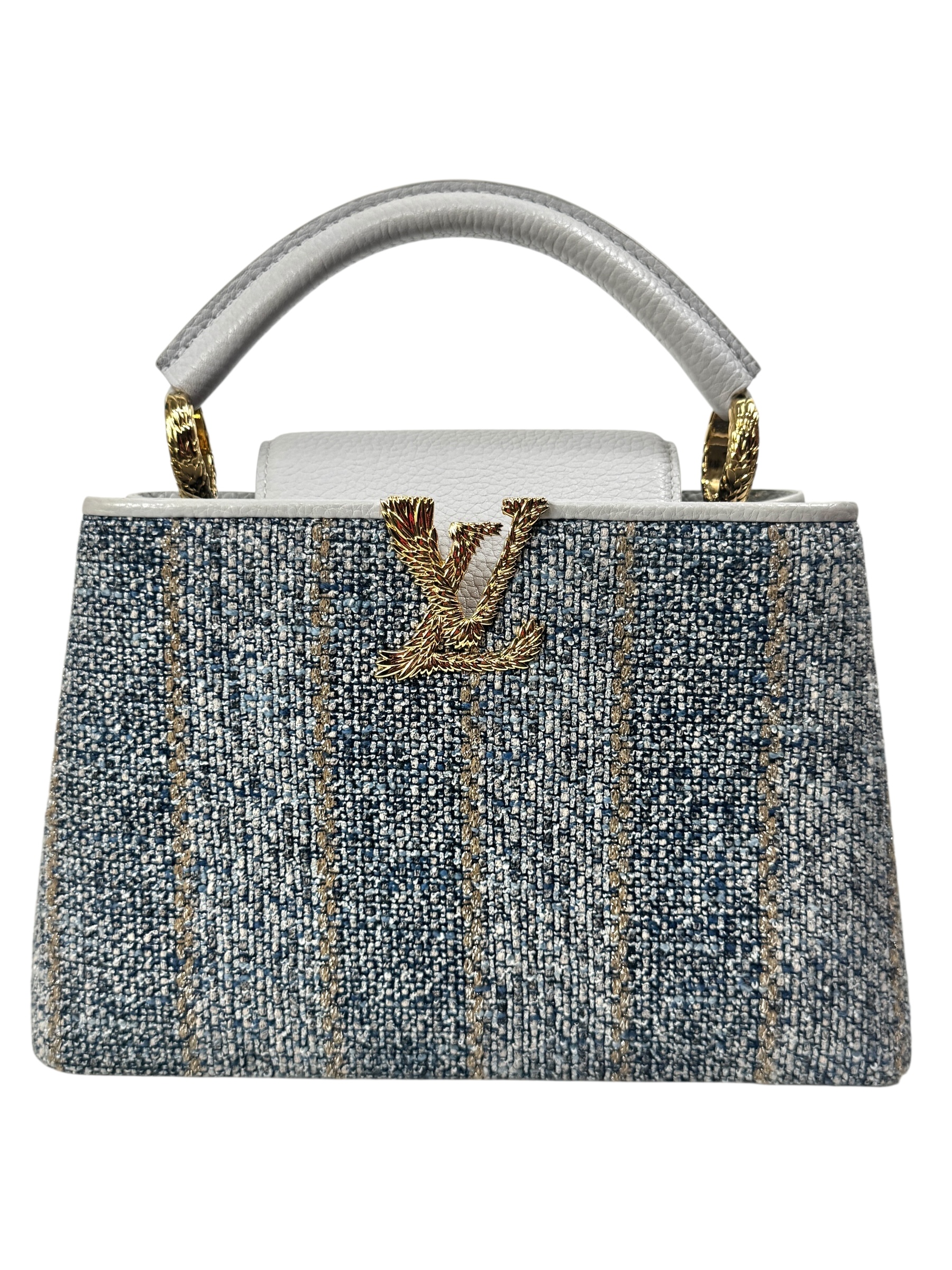 Sac « Capucine » en tweed dans les tons bleus, beige, et veau grainé gris, motifs en métal doré à motif d’ailes, rabat, poignée, anse bandoulière amovible réglable.