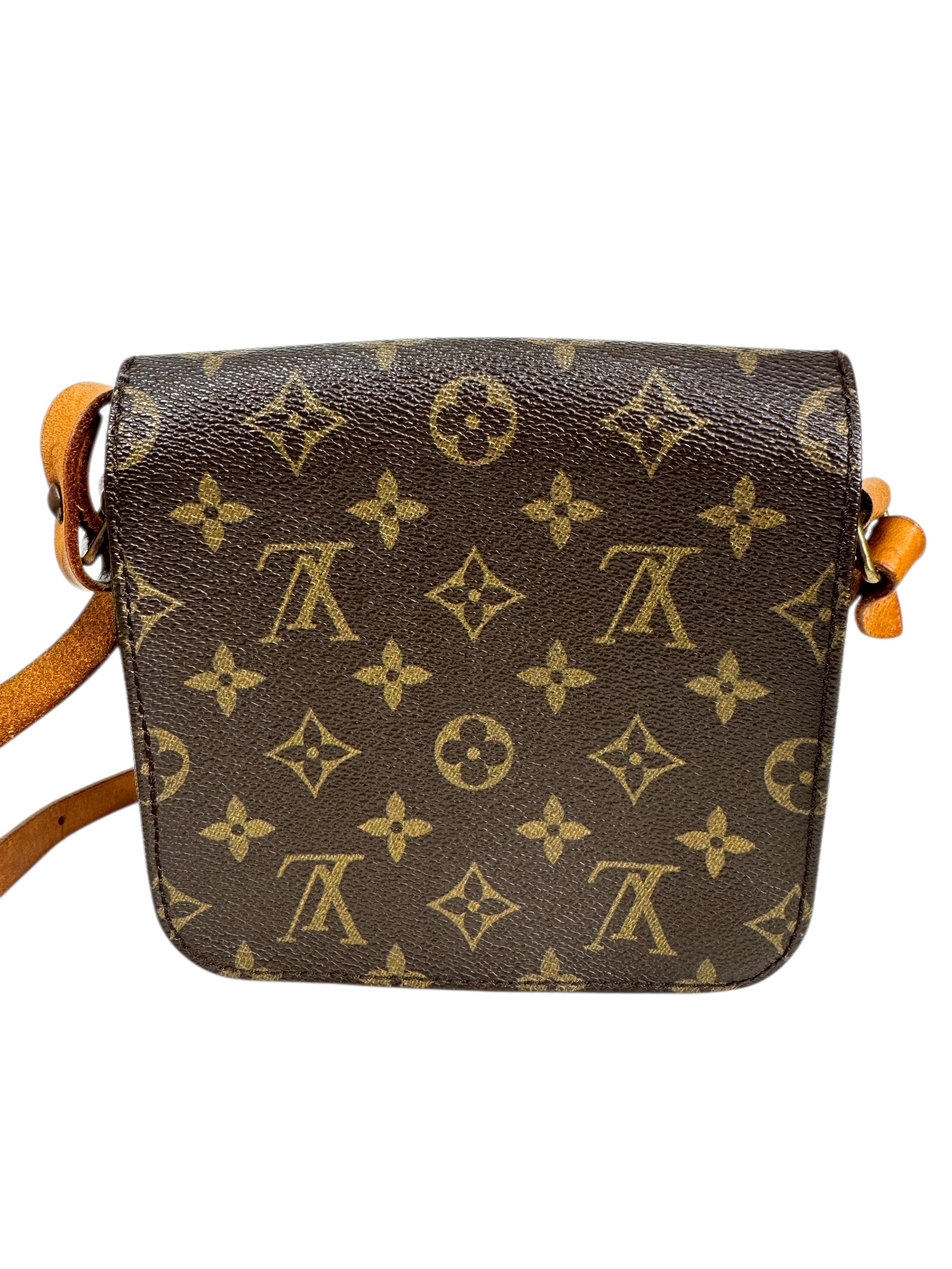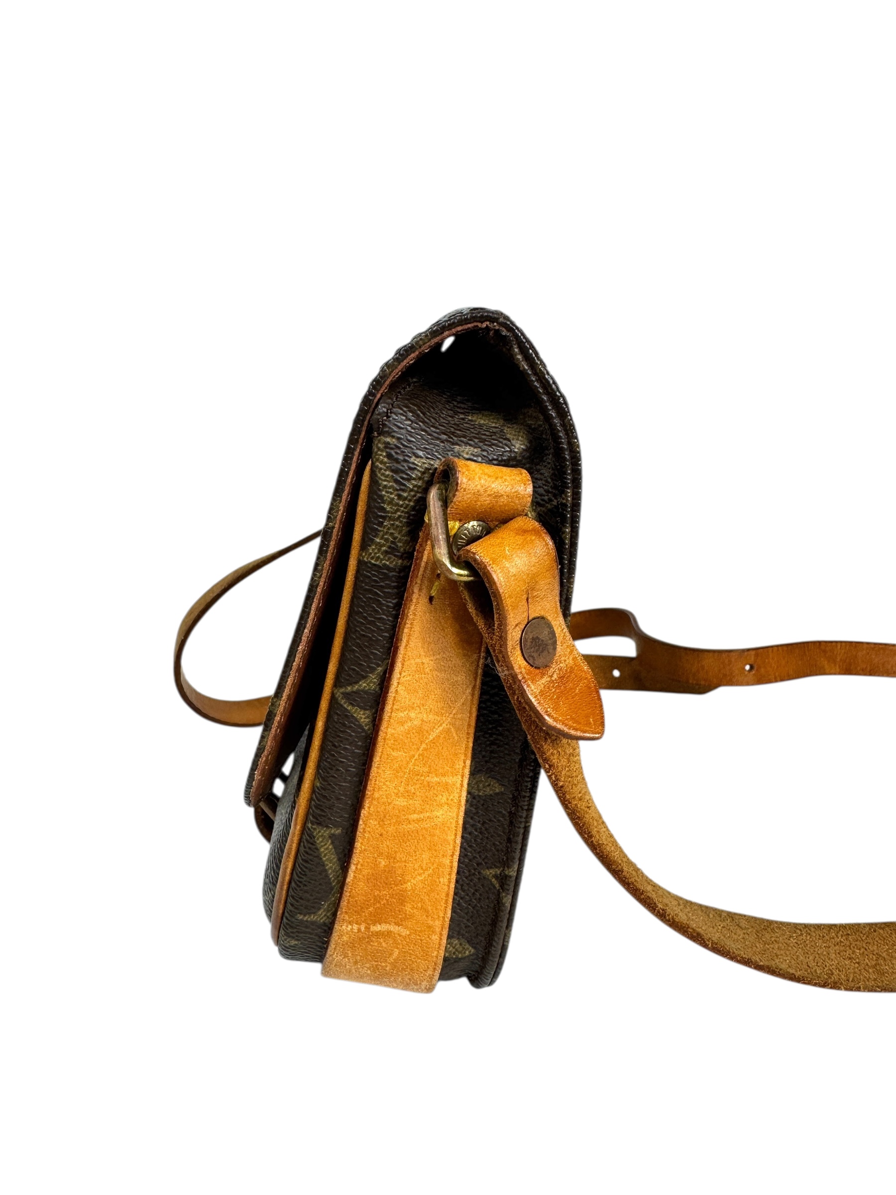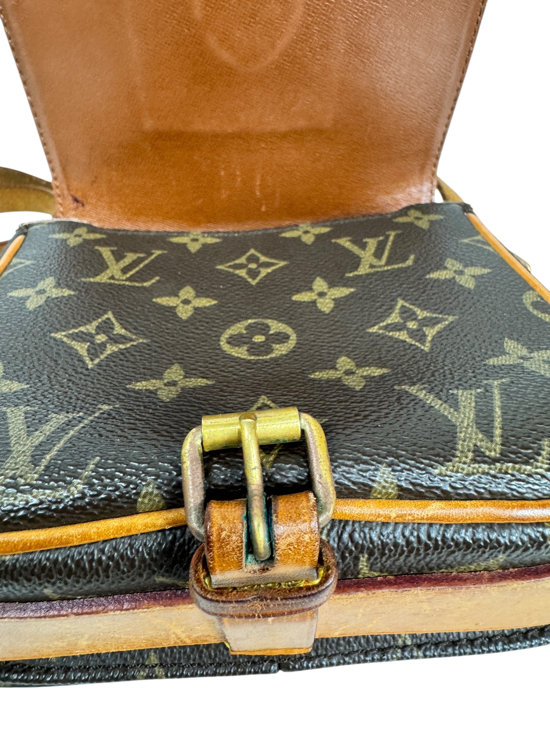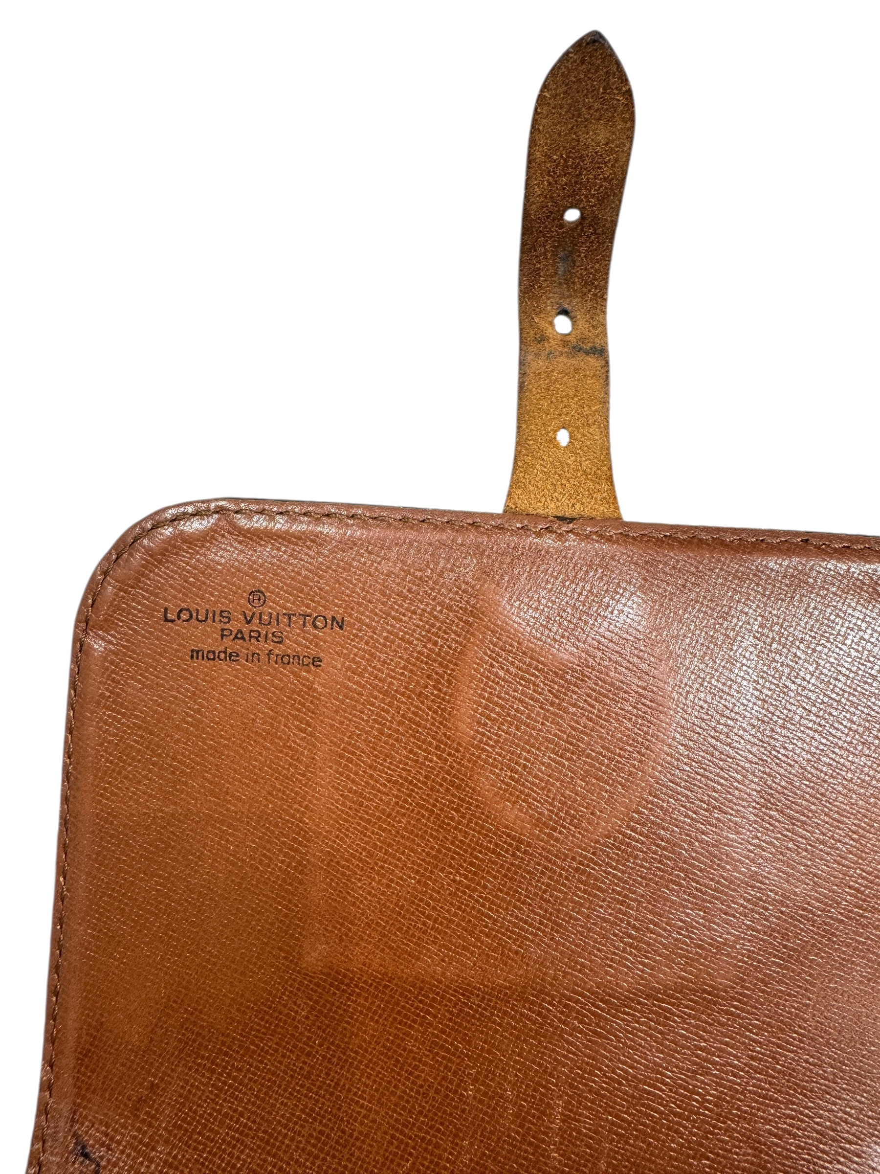Sac « Cartouchière » en toile Monogram et cuir naturel, fermeture sangle sur rabat, anse bandoulière.