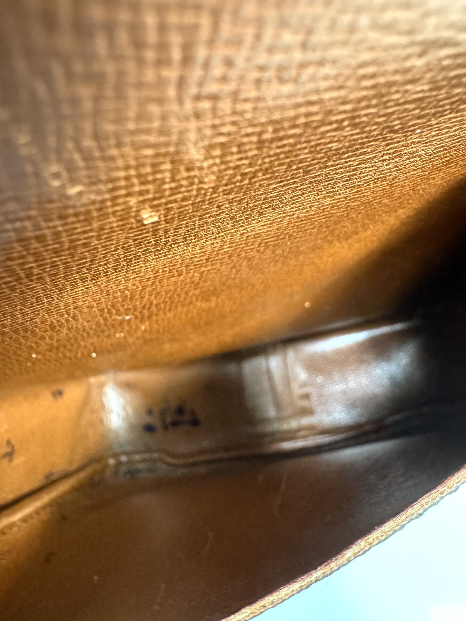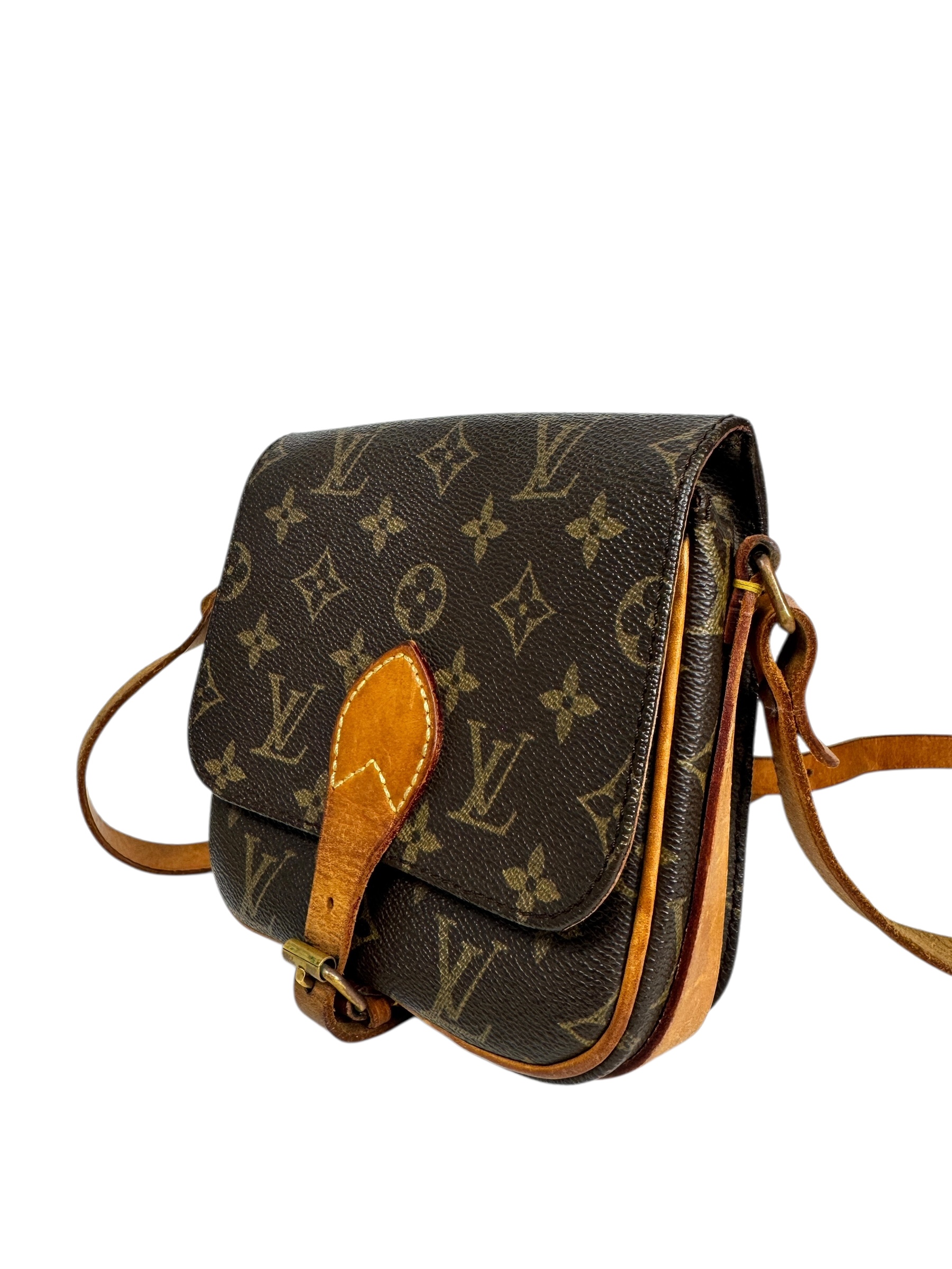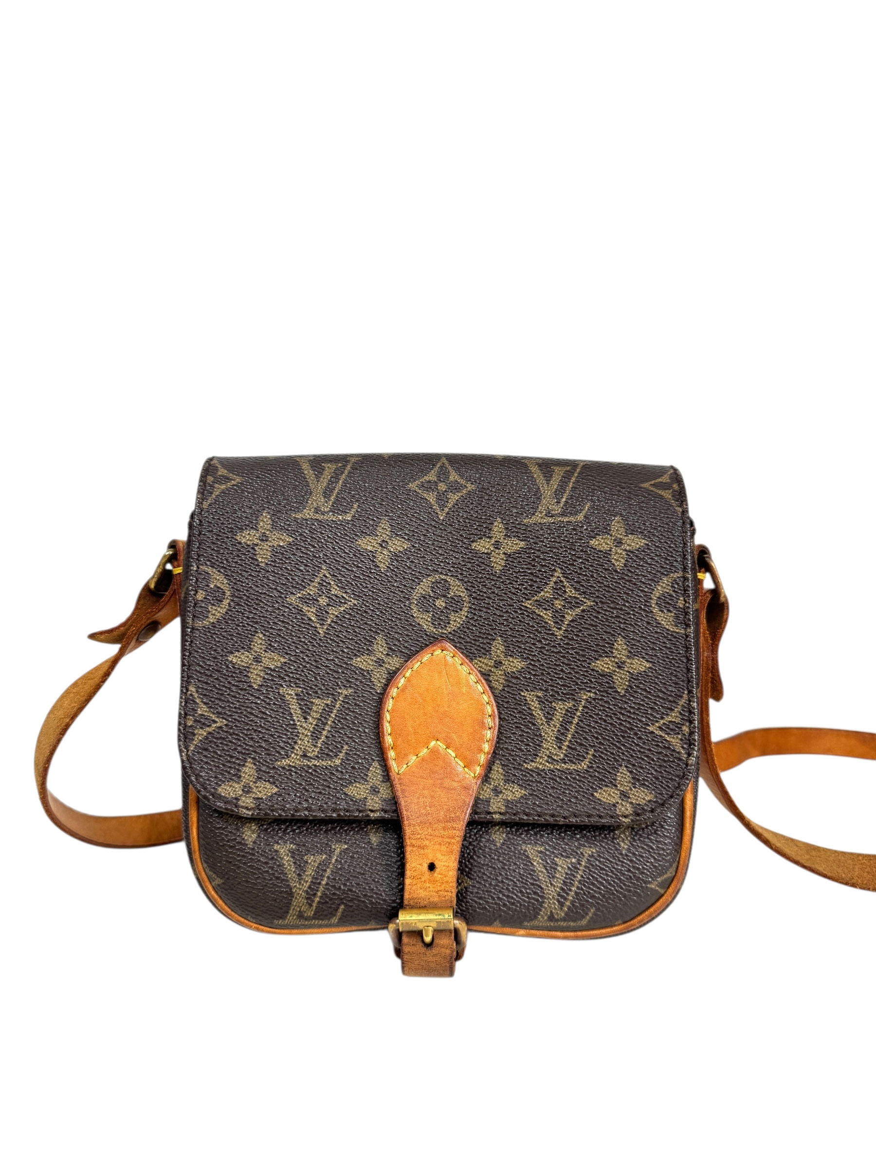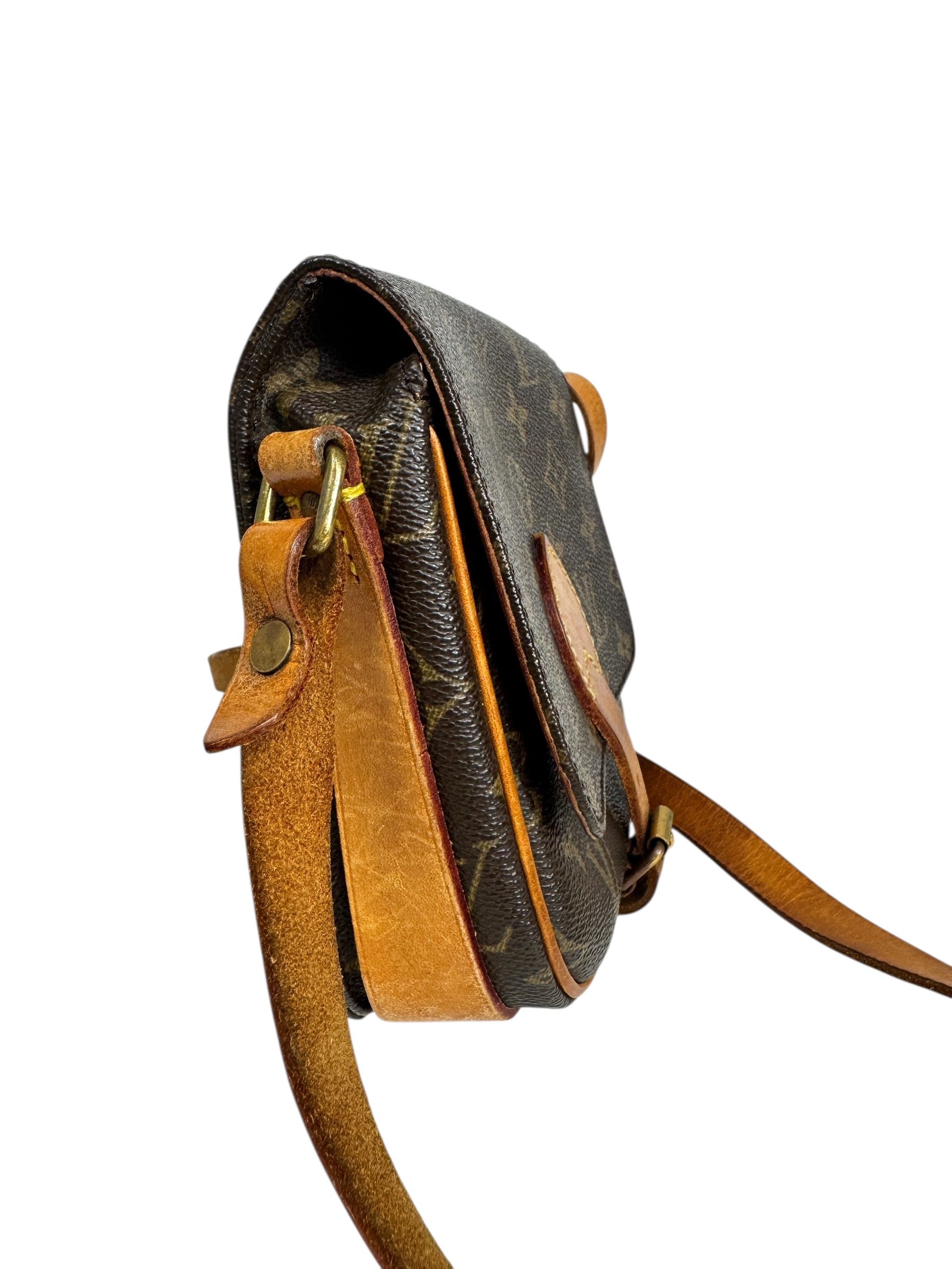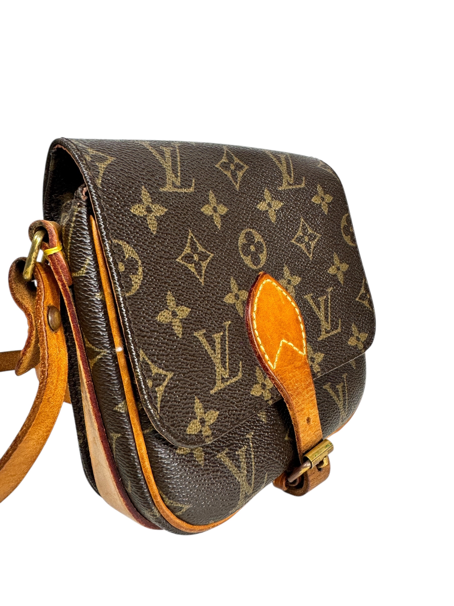 Sac « Cartouchière » en toile Monogram et cuir naturel, fermeture sangle sur rabat, anse bandoulière.