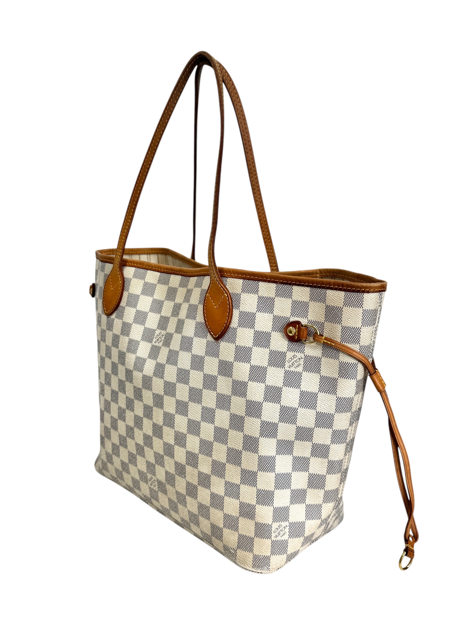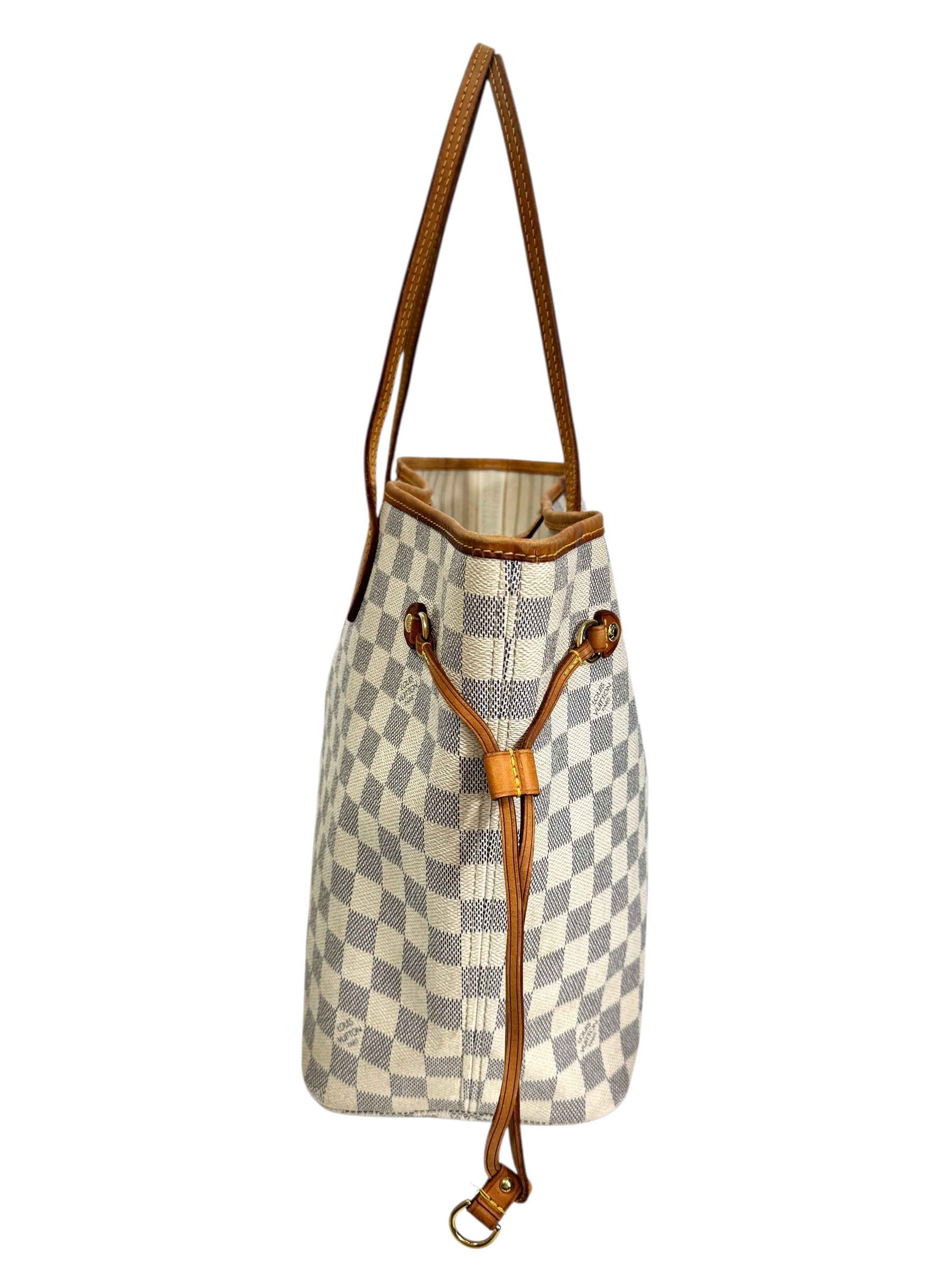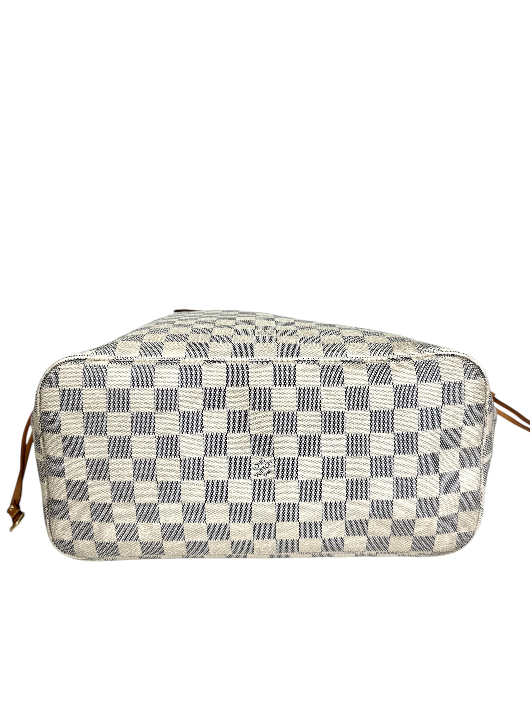 Sac « Neverfull » MM en toile damier azur et cuir naturel, fermoir mousqueton, double anse, pattes de serrage latérales.