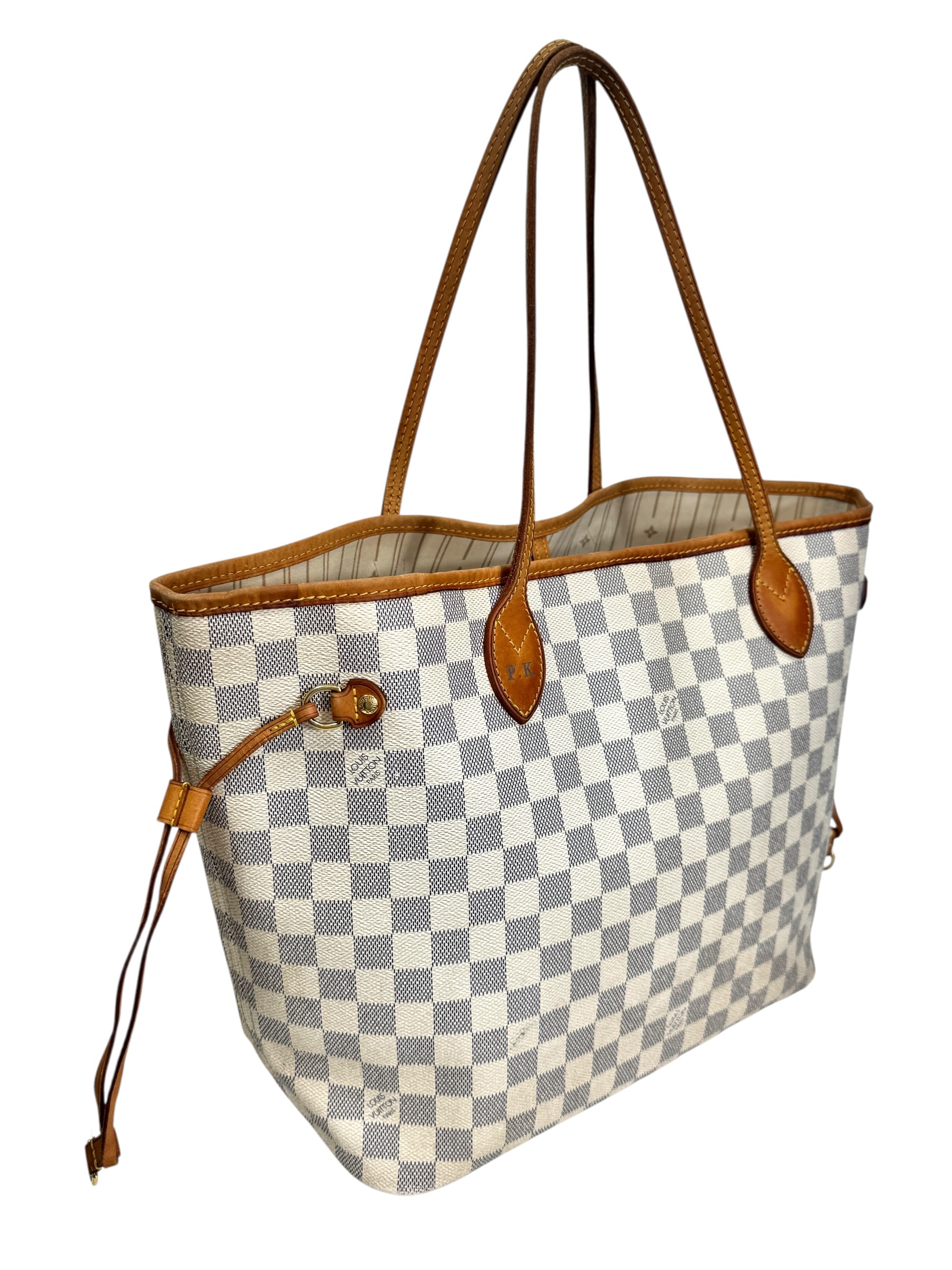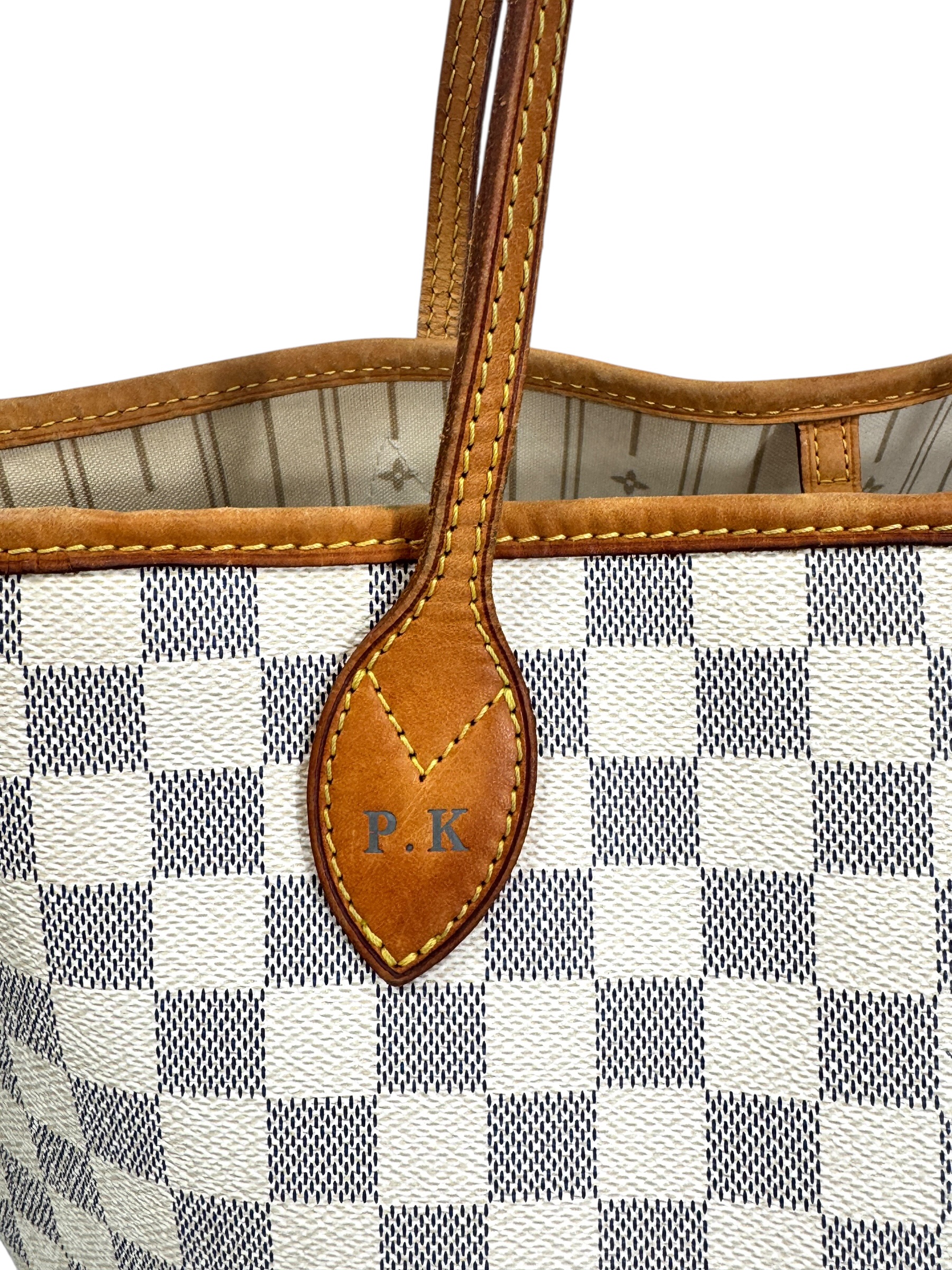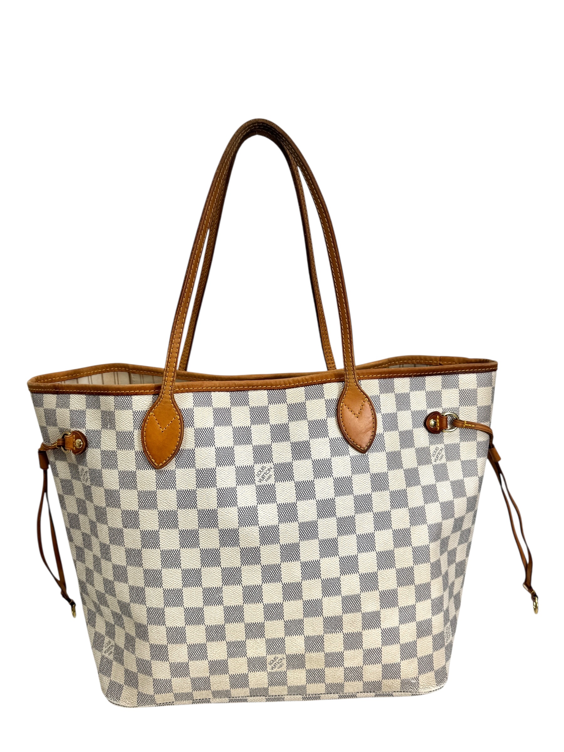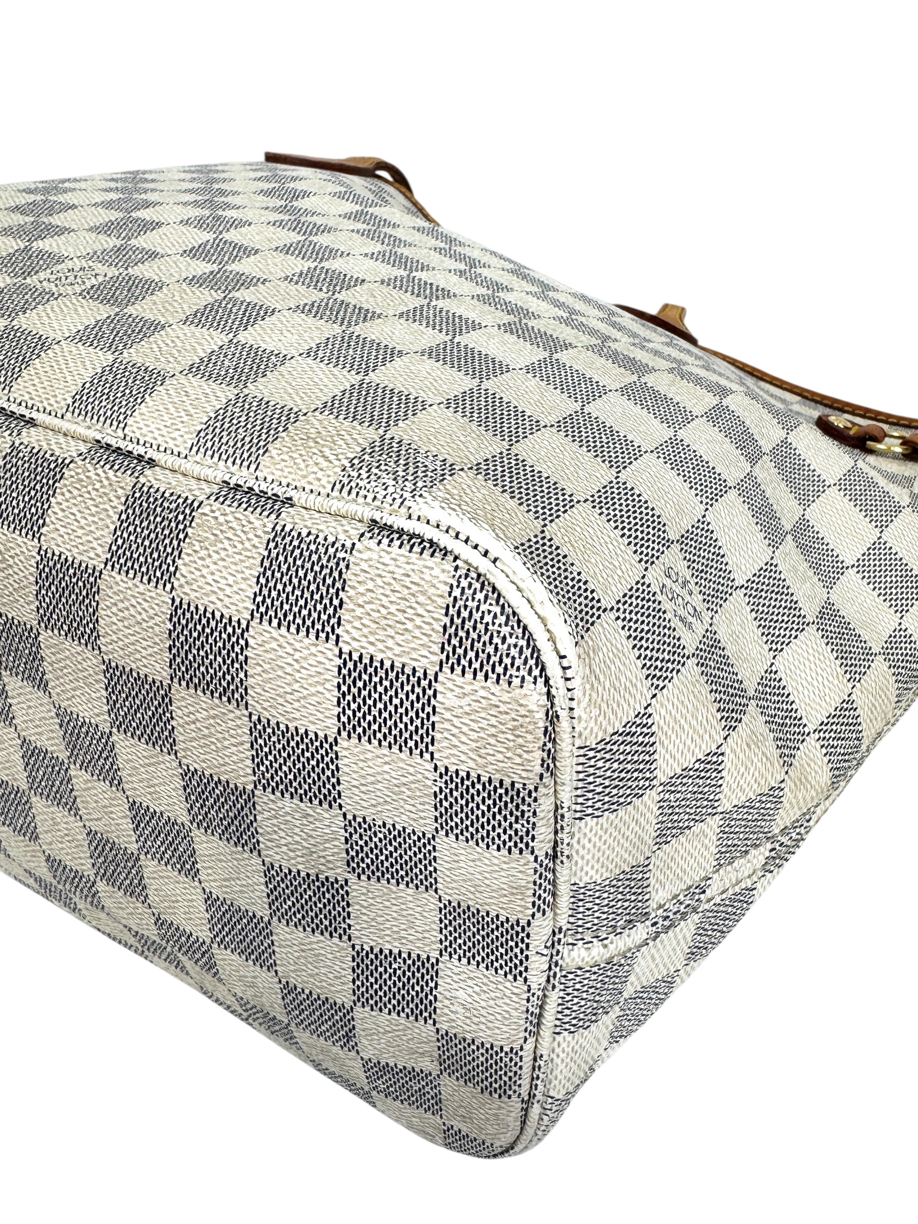 Sac « Neverfull » MM en toile damier azur et cuir naturel, fermoir mousqueton, double anse, pattes de serrage latérales.