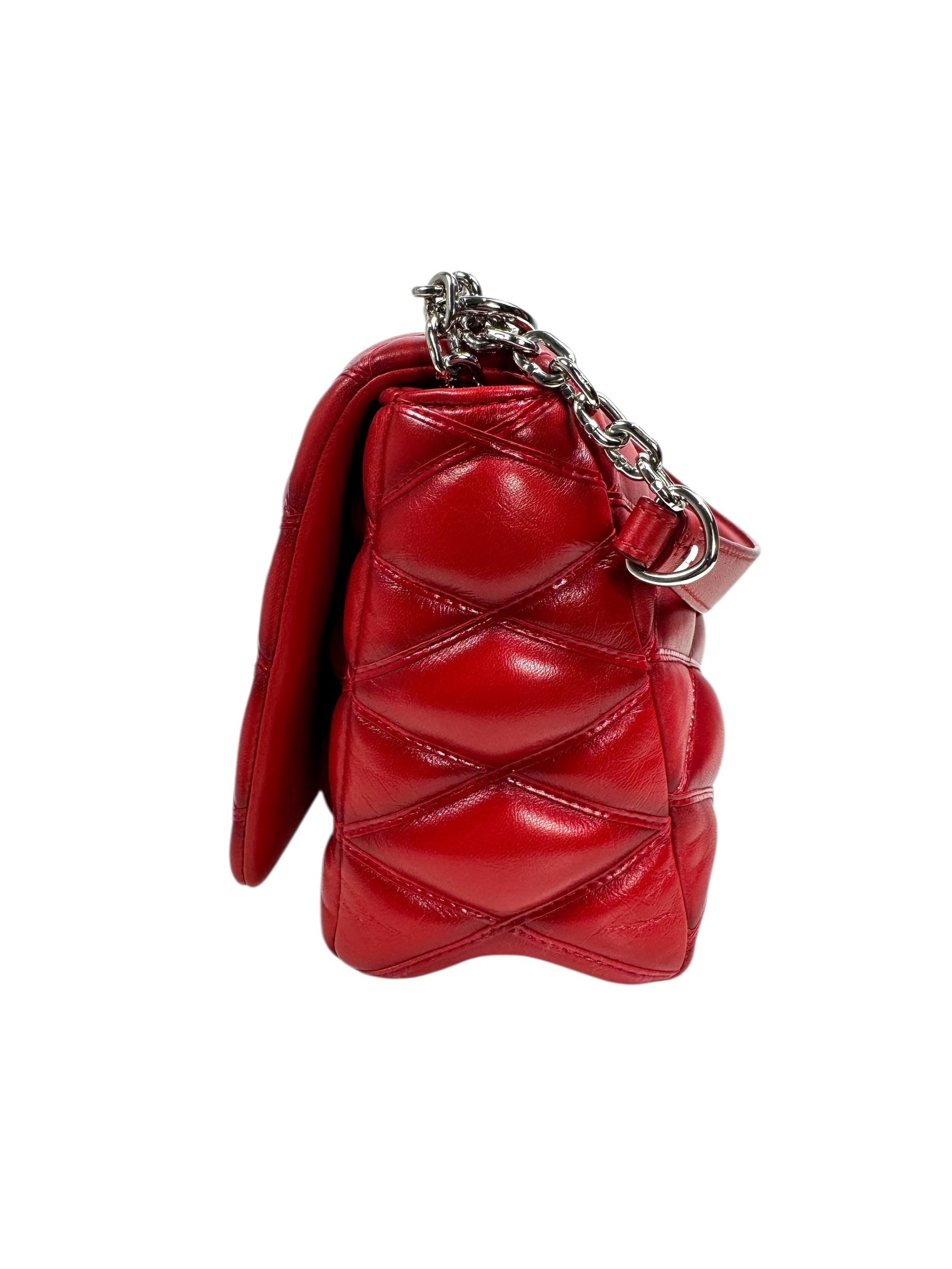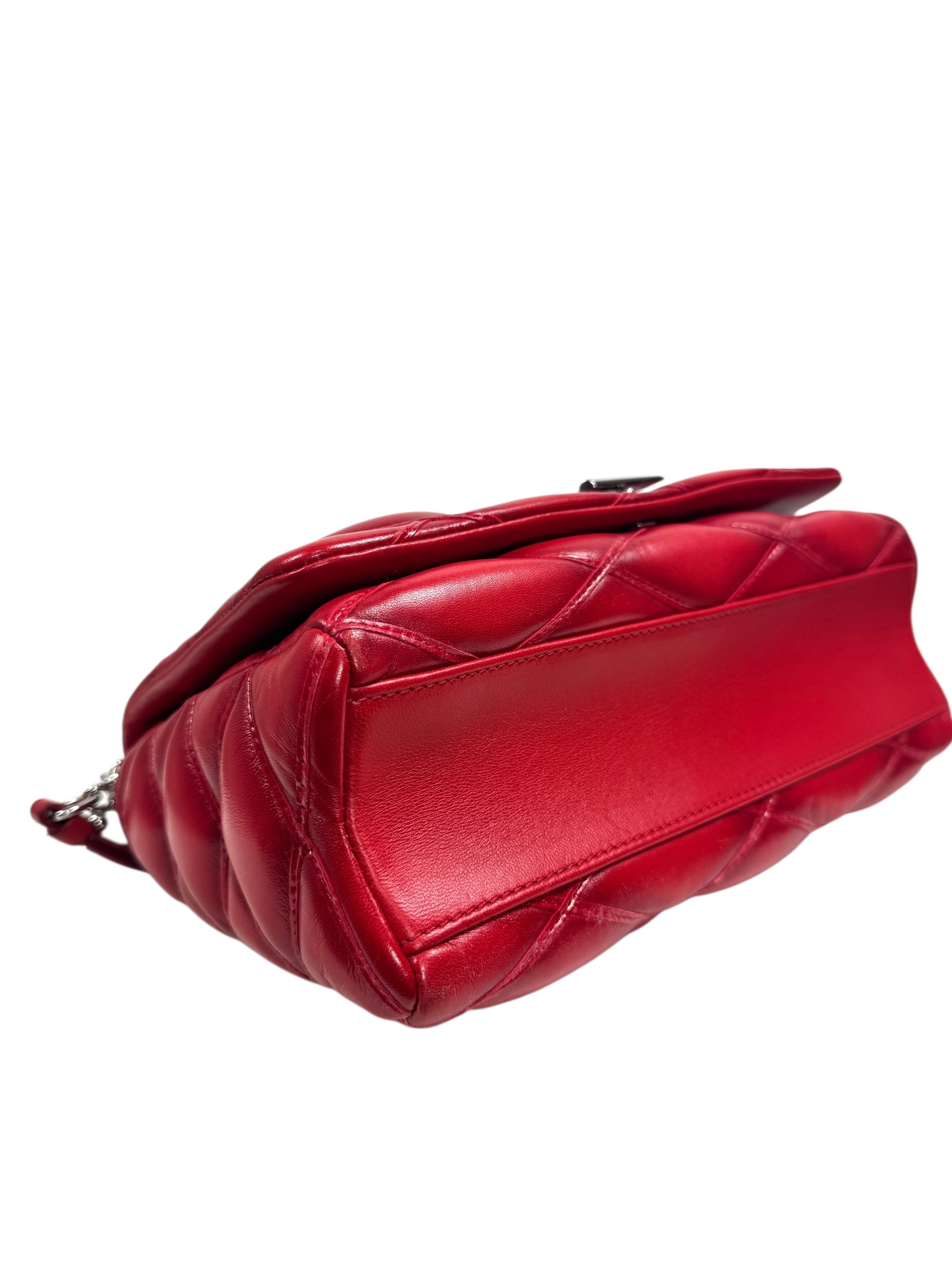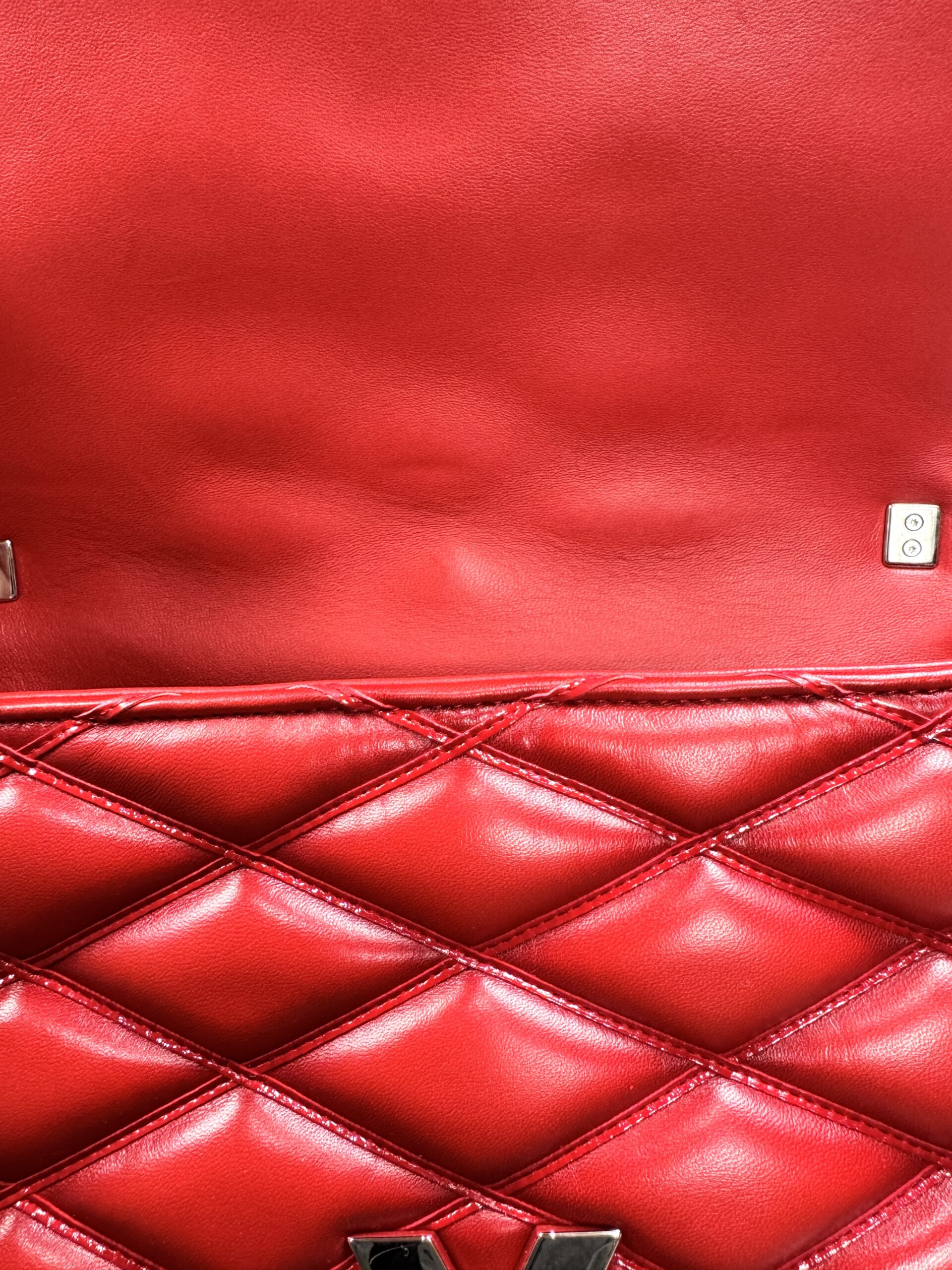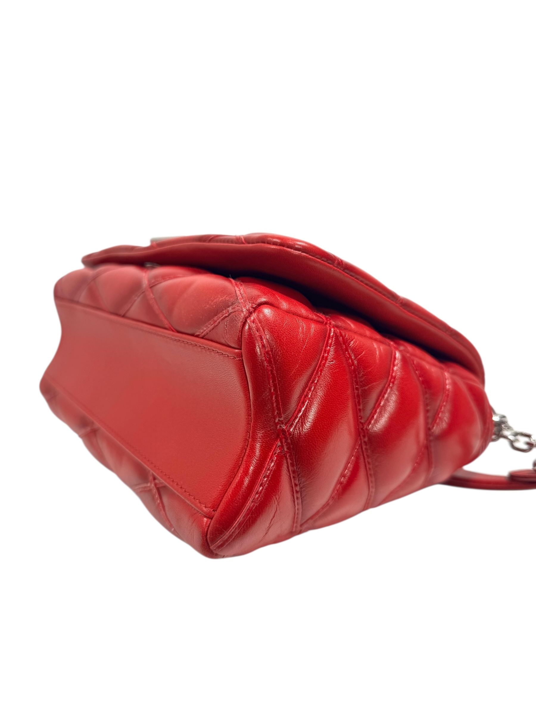 Sac « Twist » en cuir agneau Malletage rouge, fermoir pivotant en métal argenté sur rabat, anse chaîne réglable, patte d’épaule.