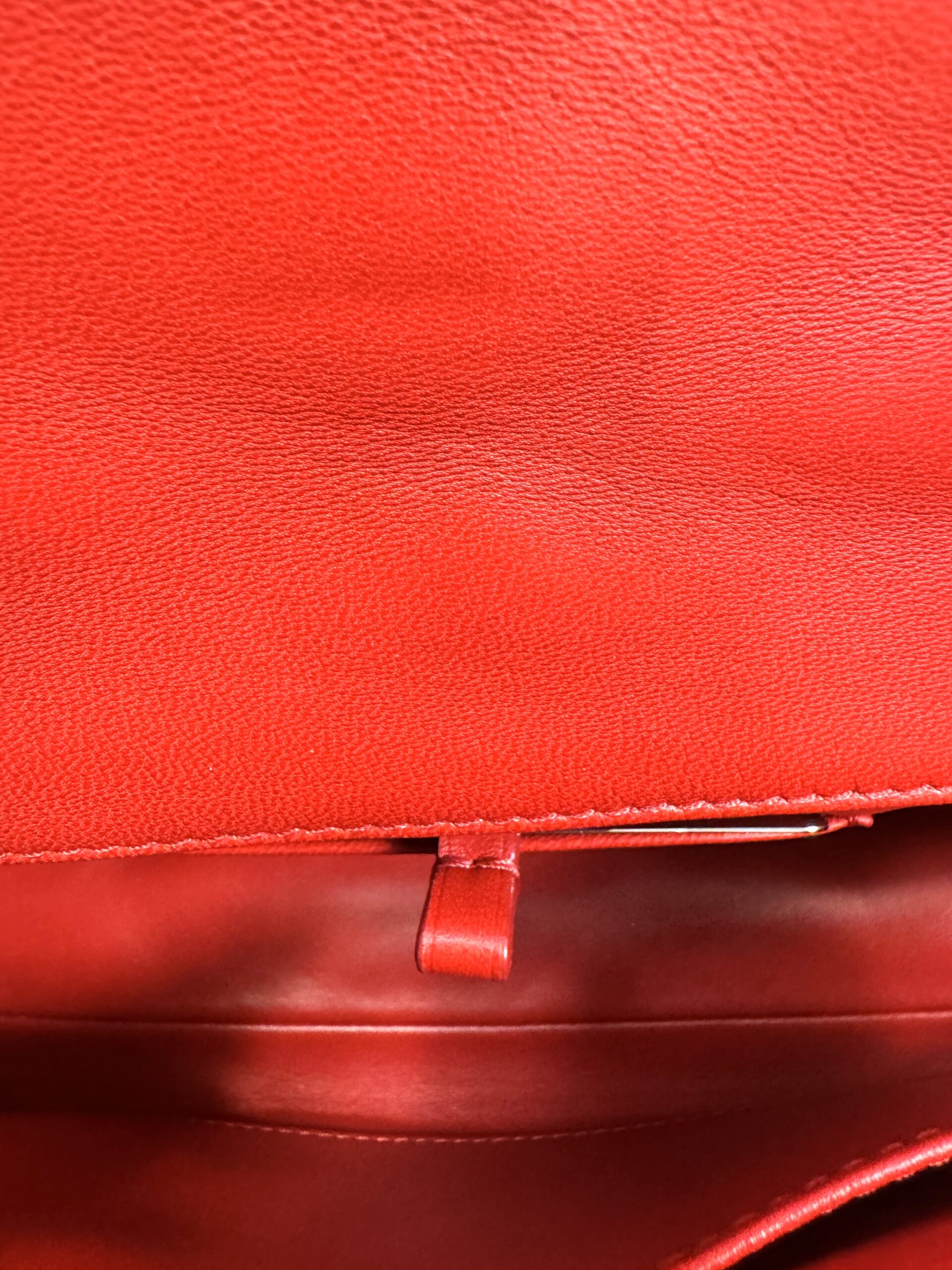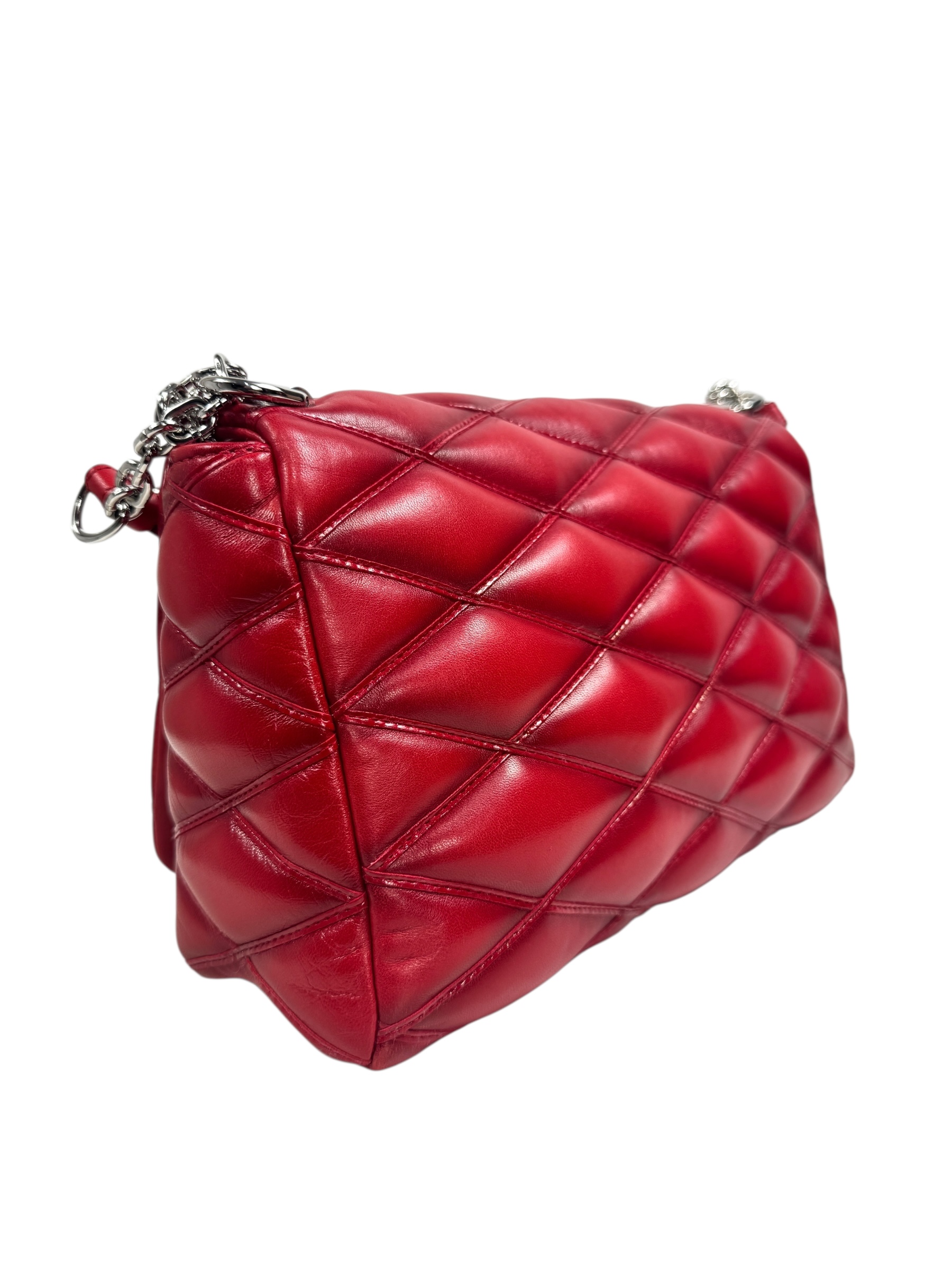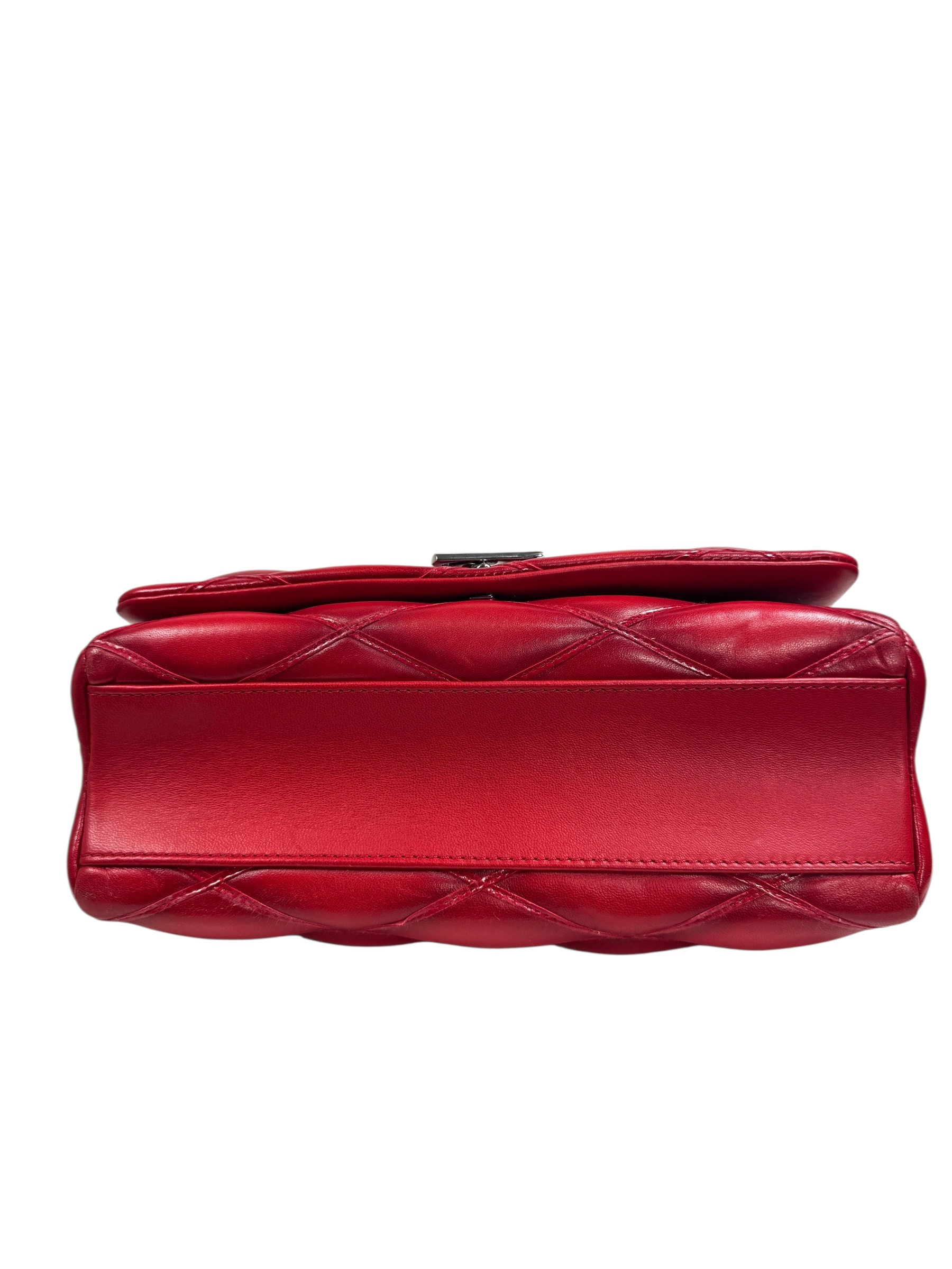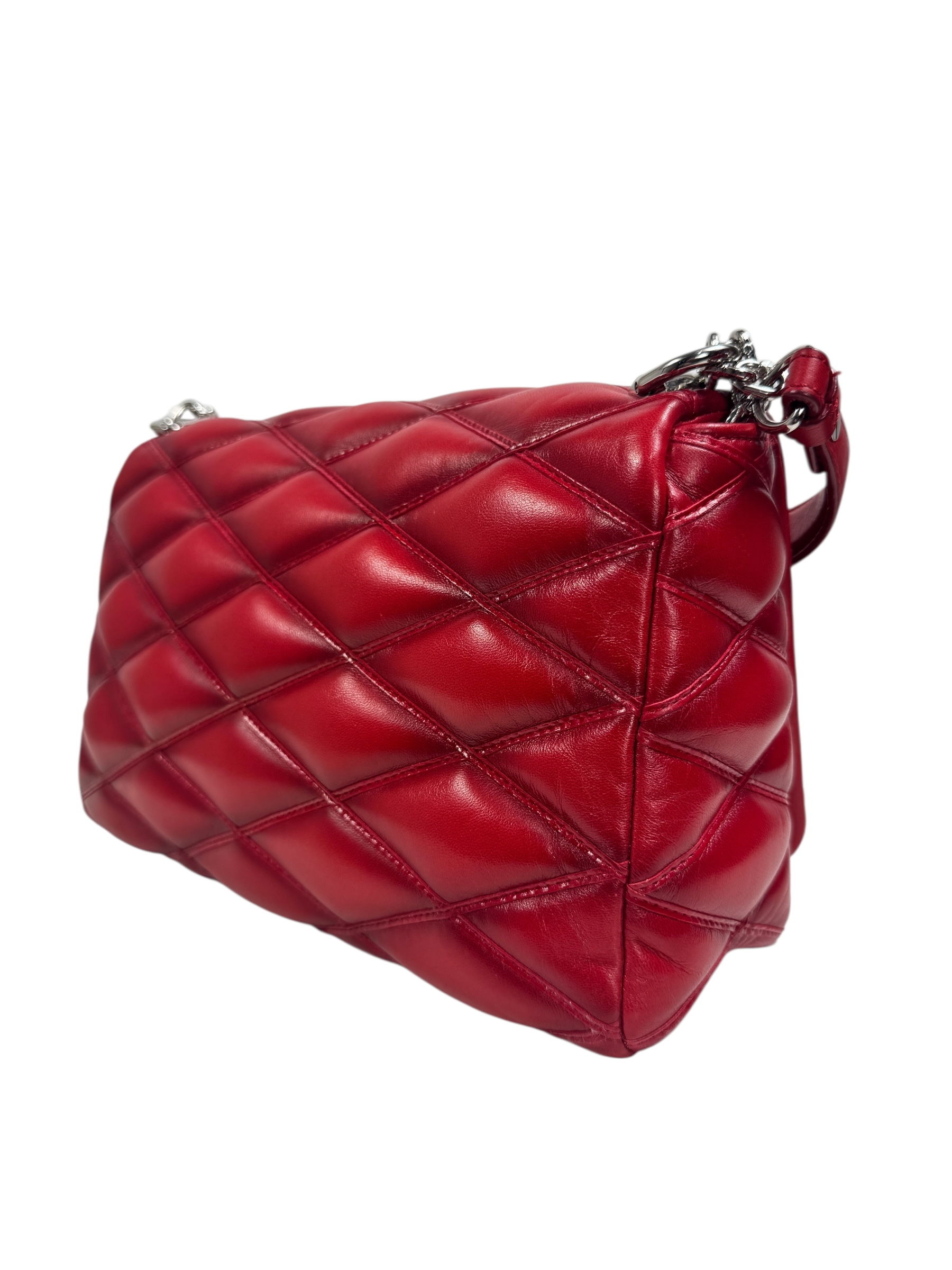 Sac « Twist » en cuir agneau Malletage rouge, fermoir pivotant en métal argenté sur rabat, anse chaîne réglable, patte d’épaule.