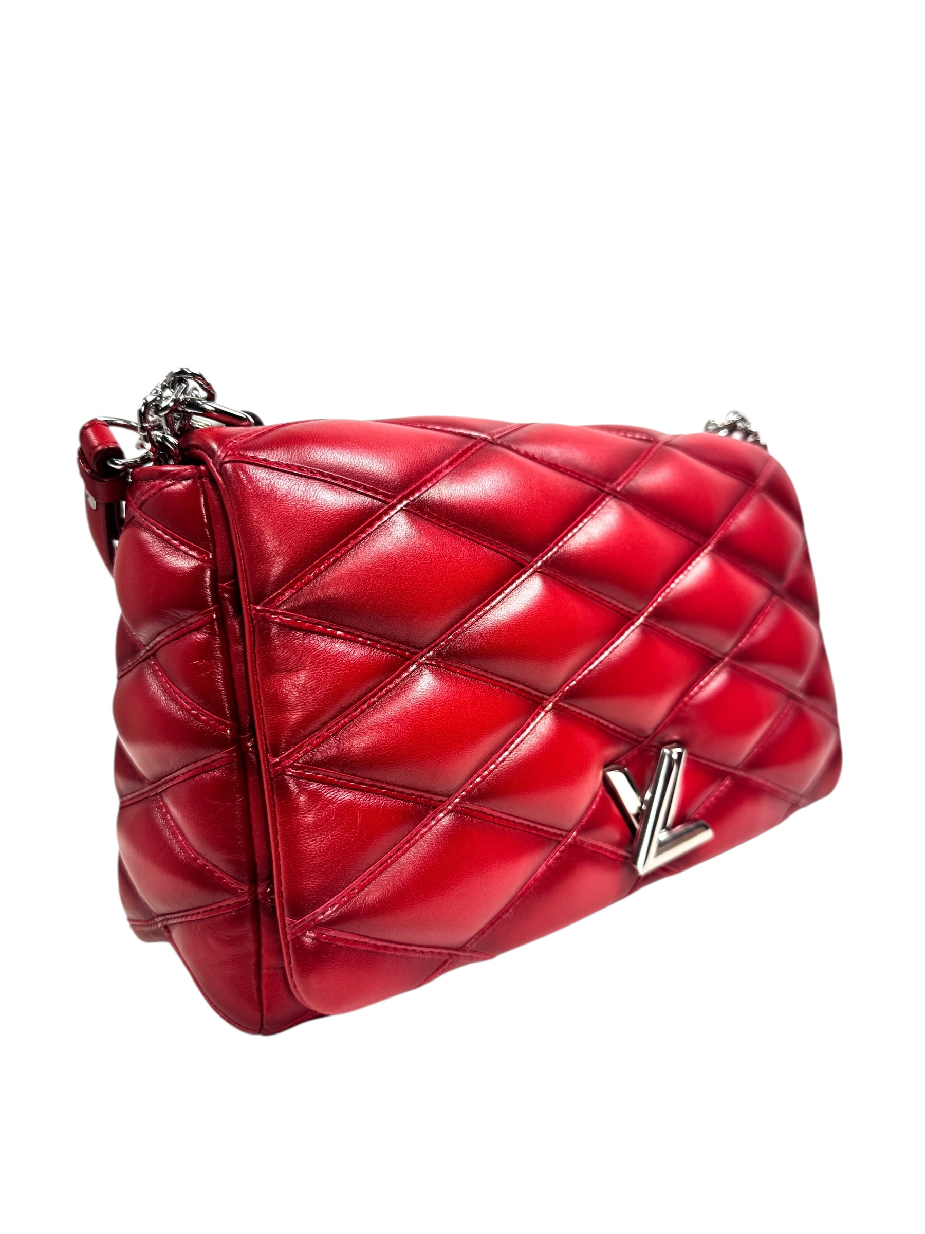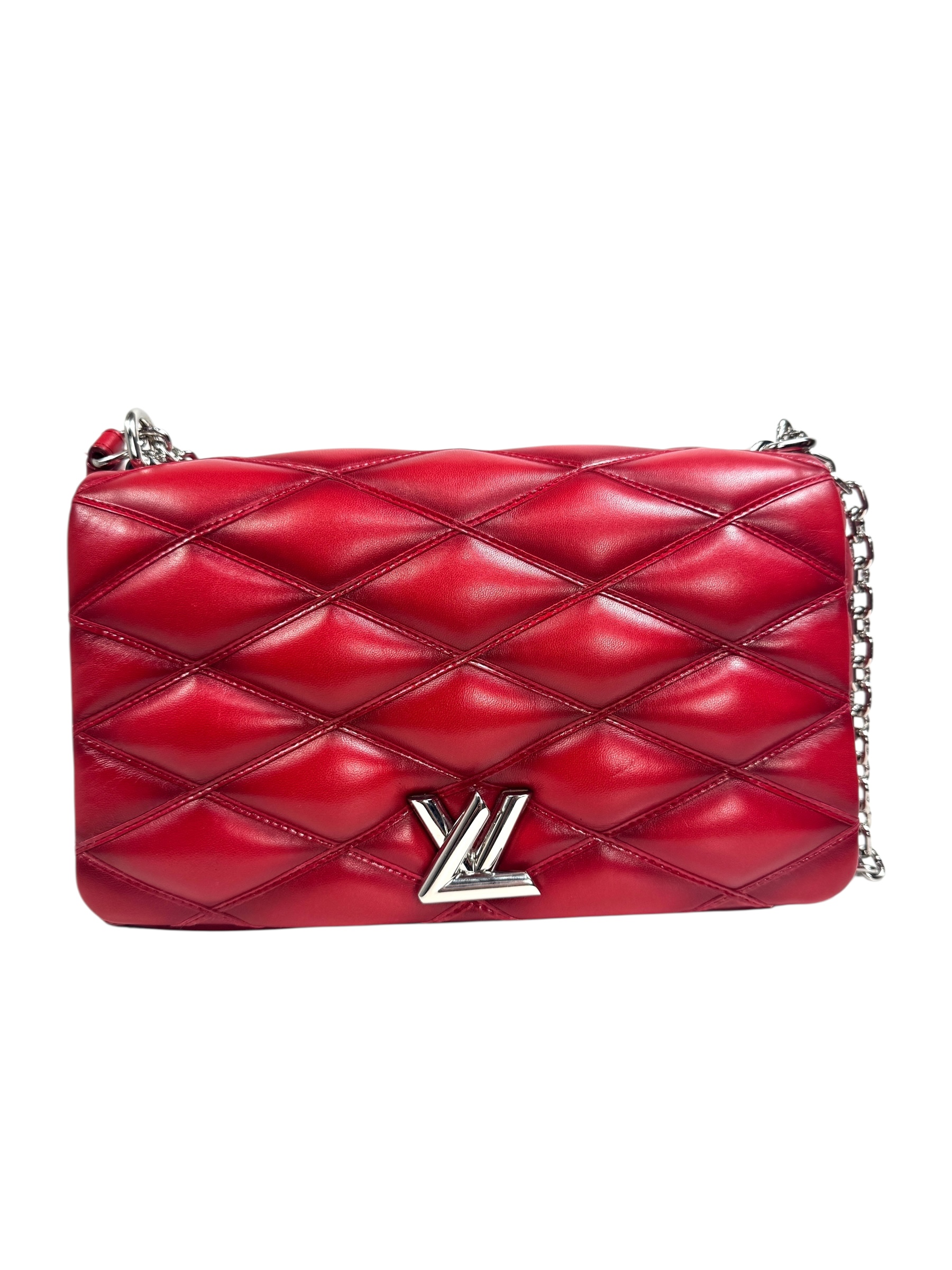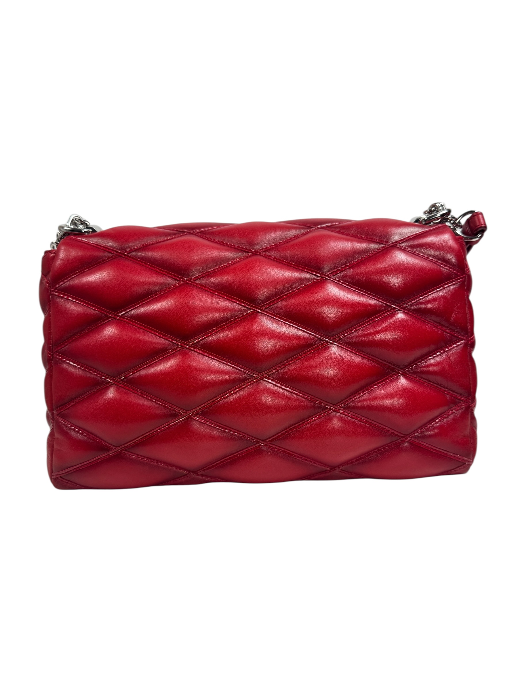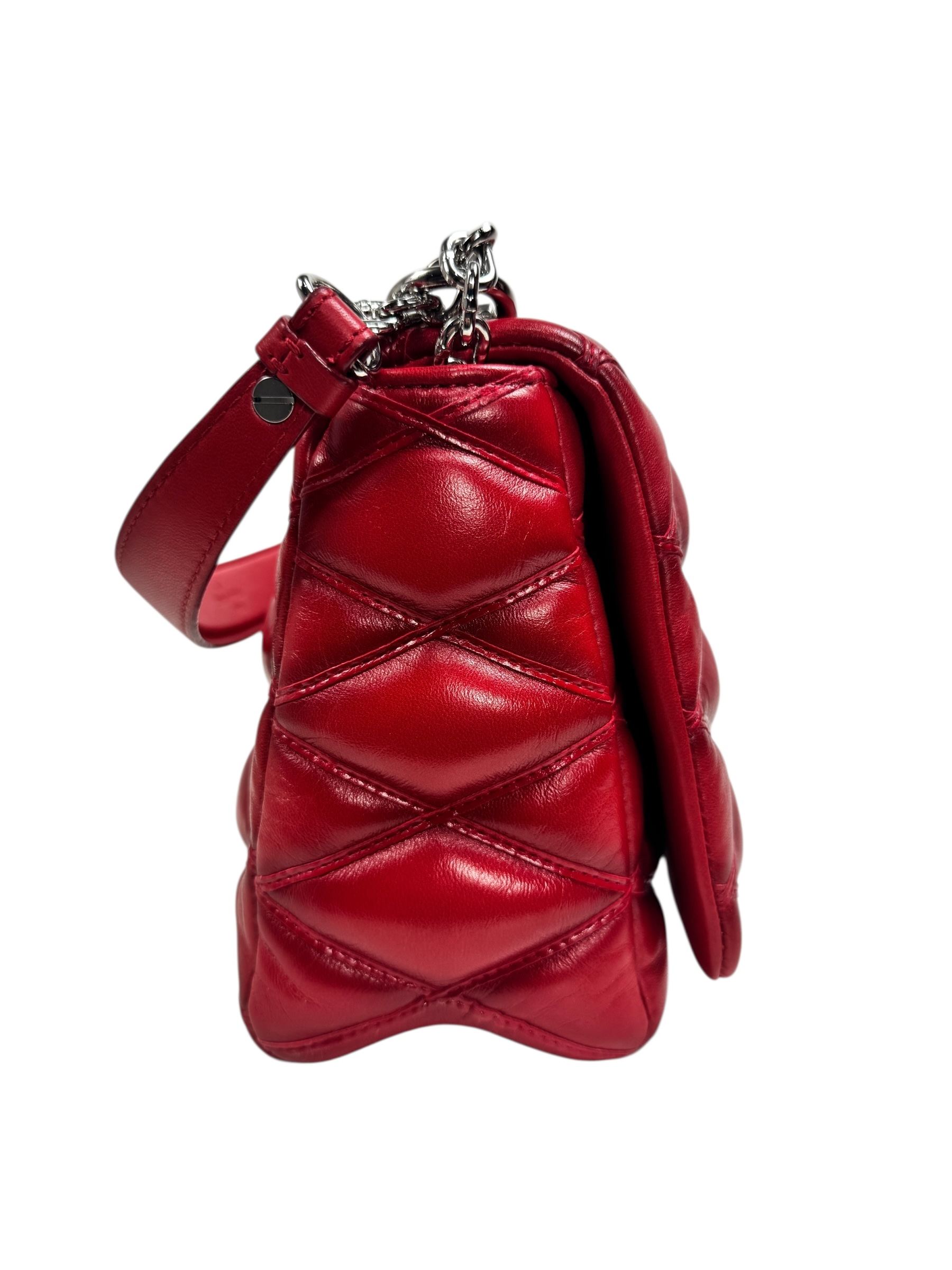 Sac « Twist » en cuir agneau Malletage rouge, fermoir pivotant en métal argenté sur rabat, anse chaîne réglable, patte d’épaule.