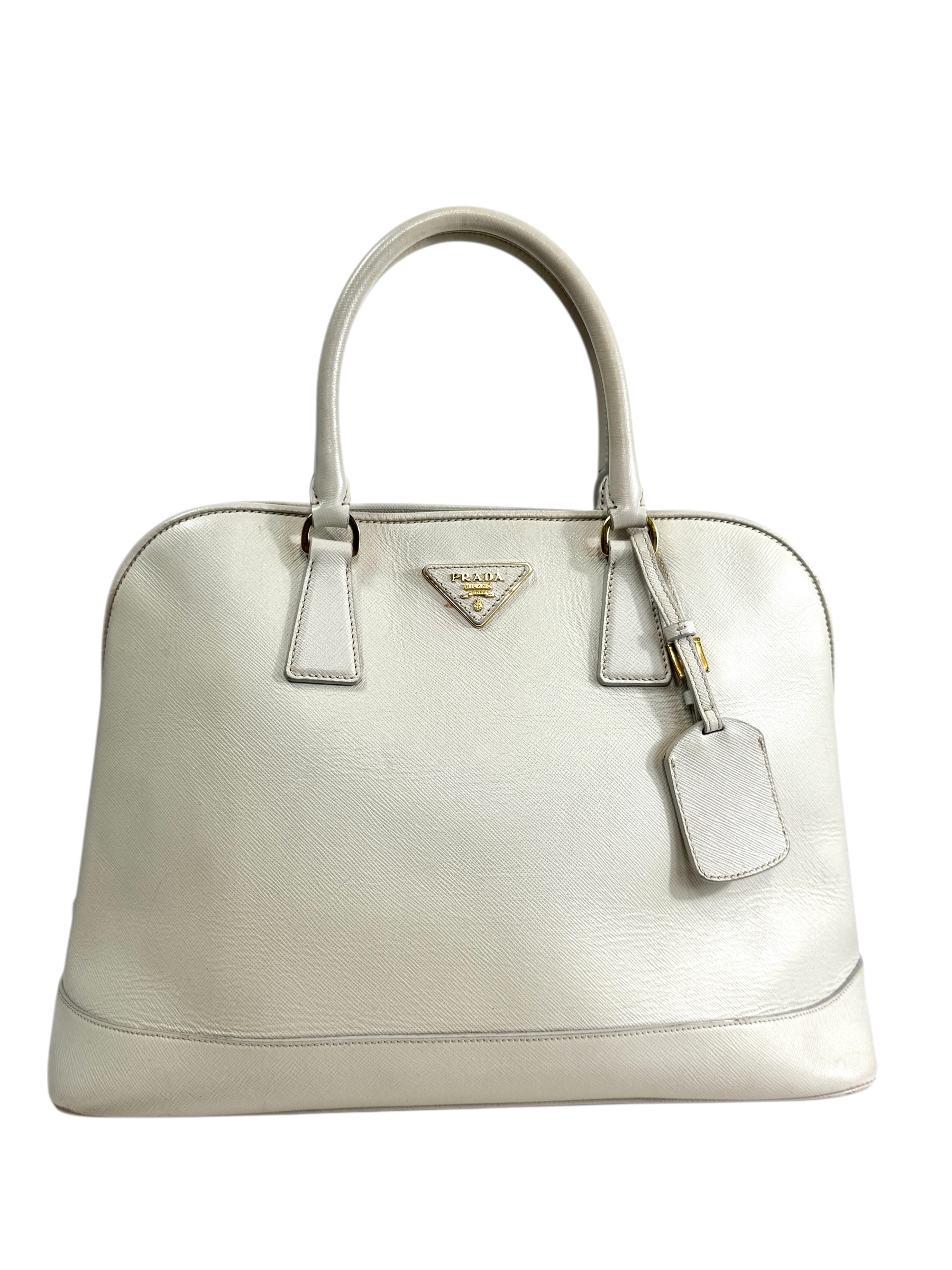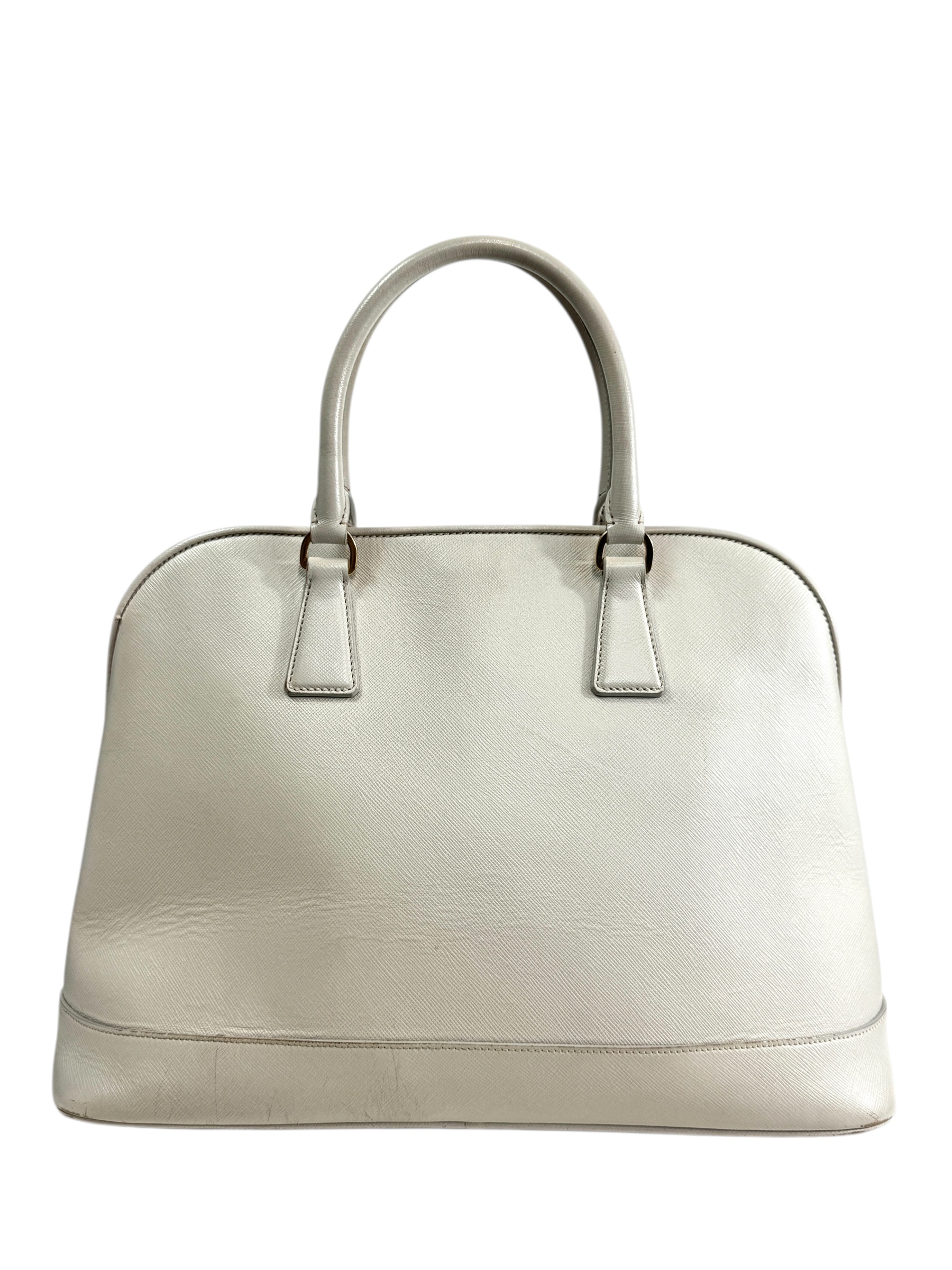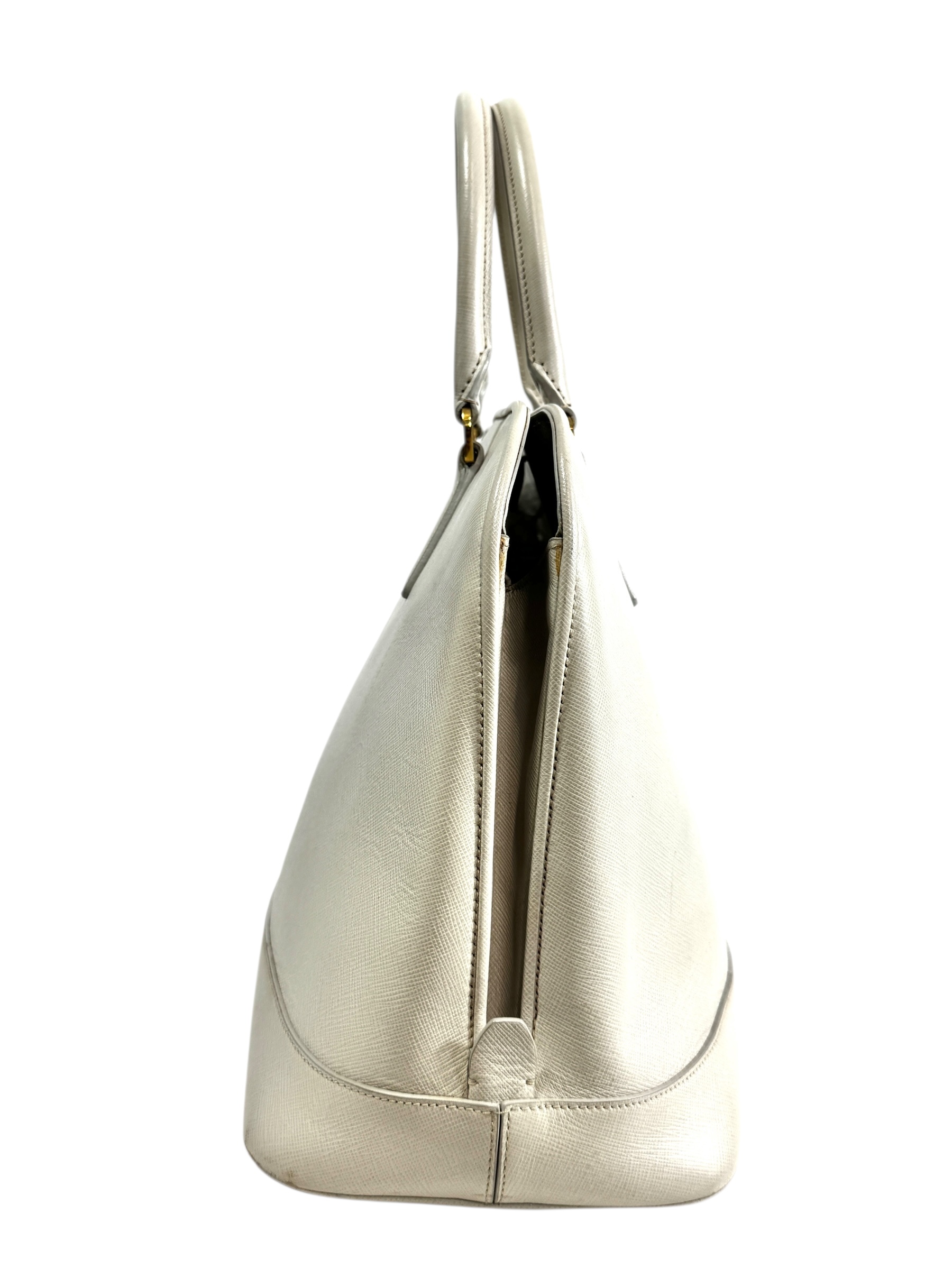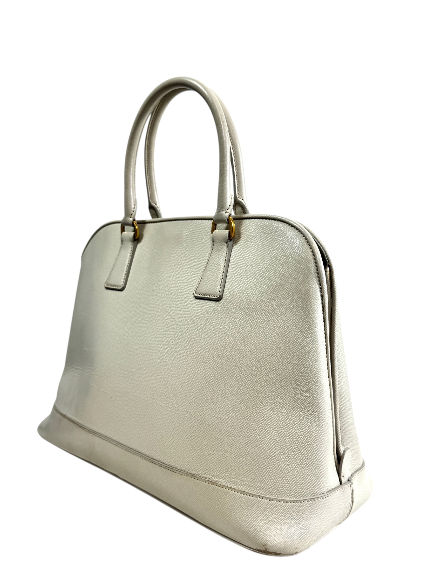Sac « Promenade » en veau Saffiano écru, fermeture pression aimantée, double poignée, porte-nom.