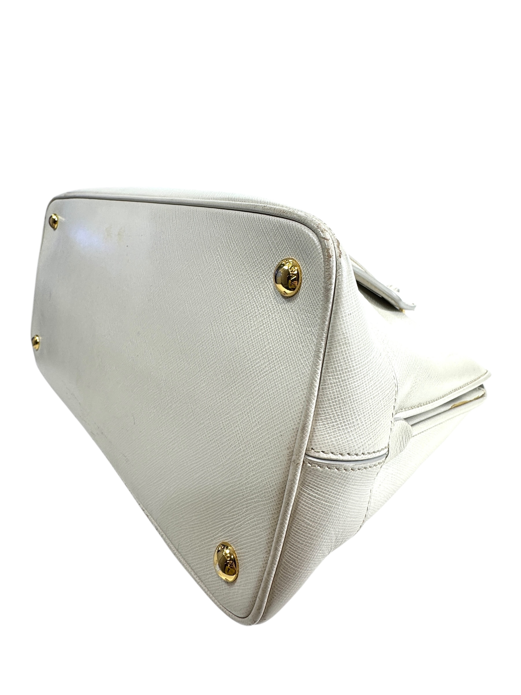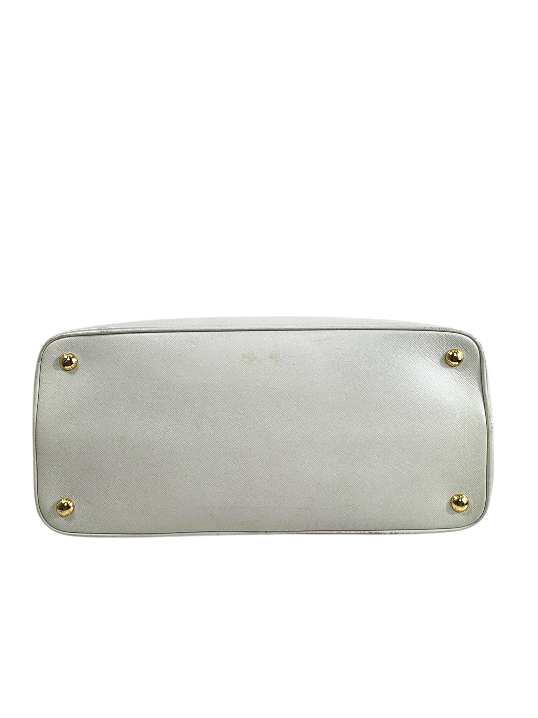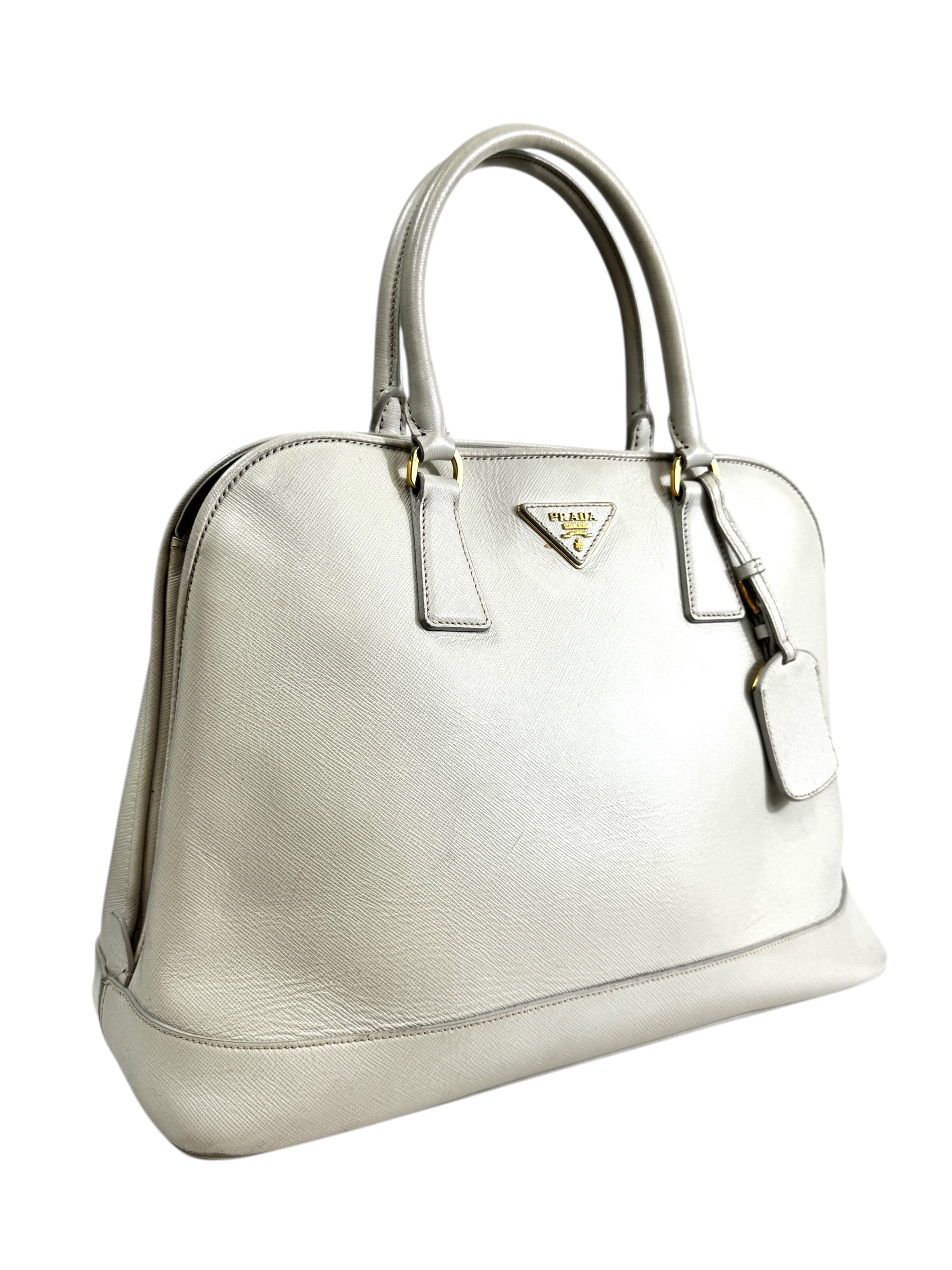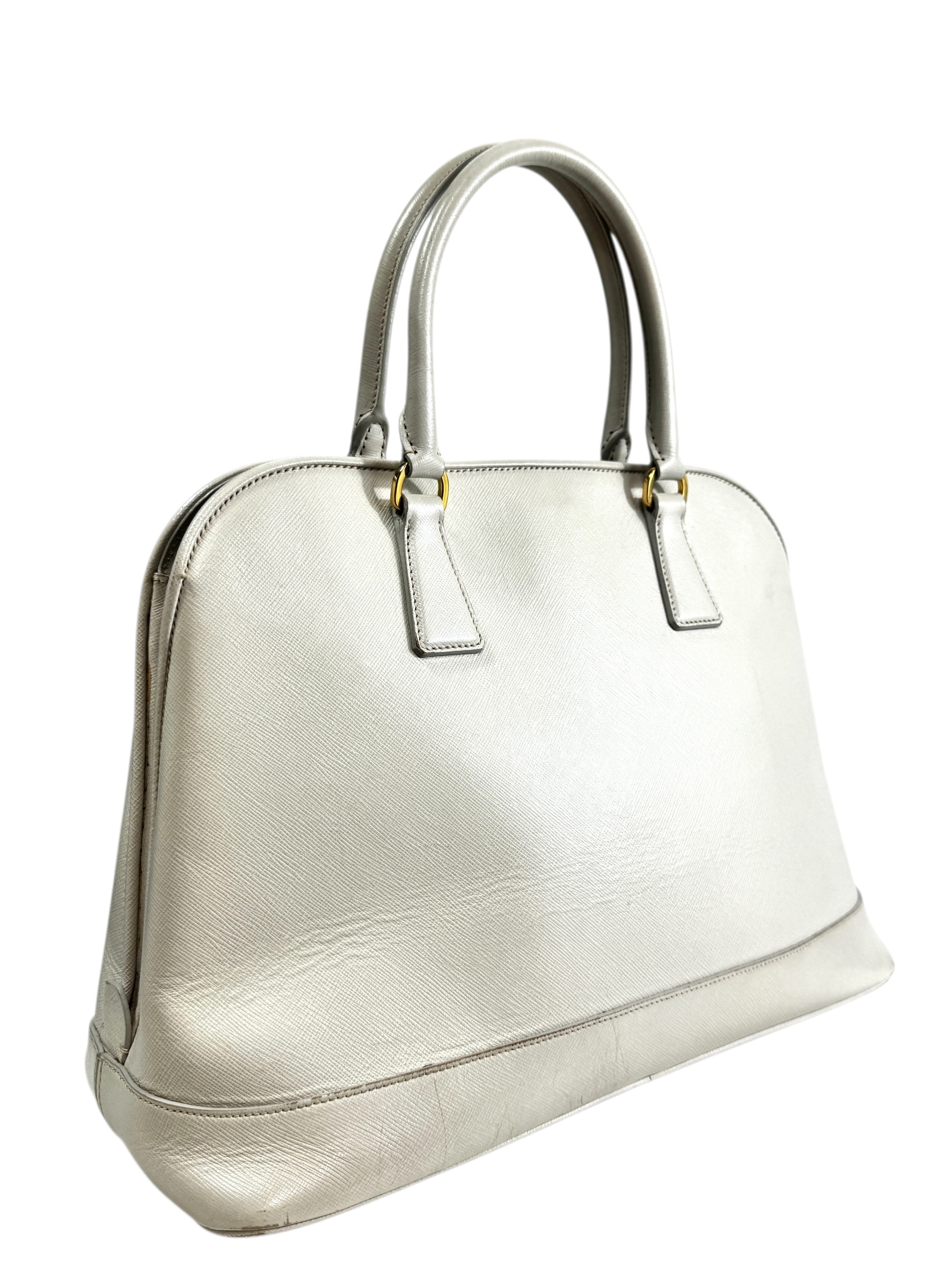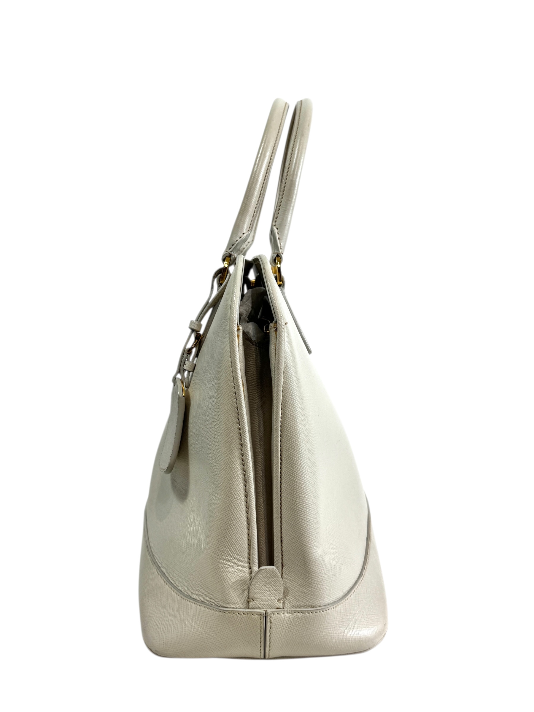 Sac « Promenade » en veau Saffiano écru, fermeture pression aimantée, double poignée, porte-nom.